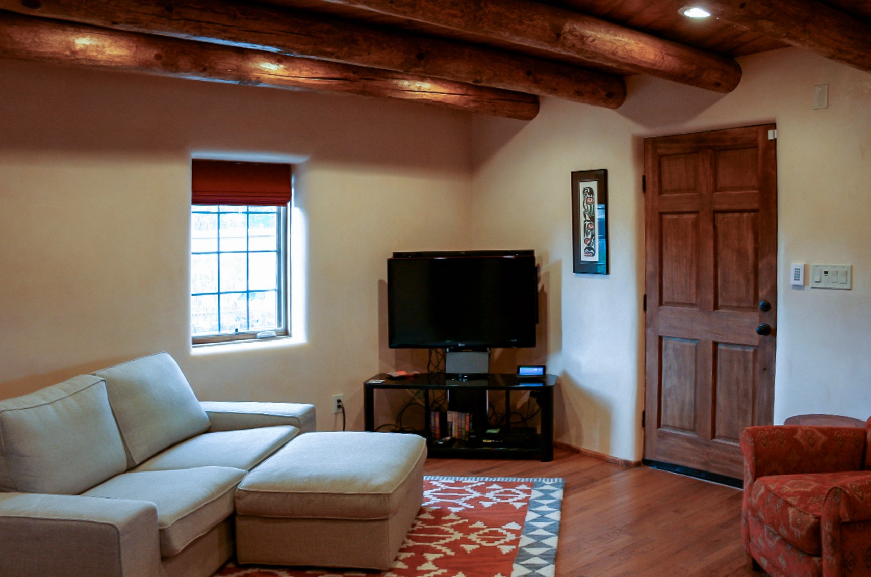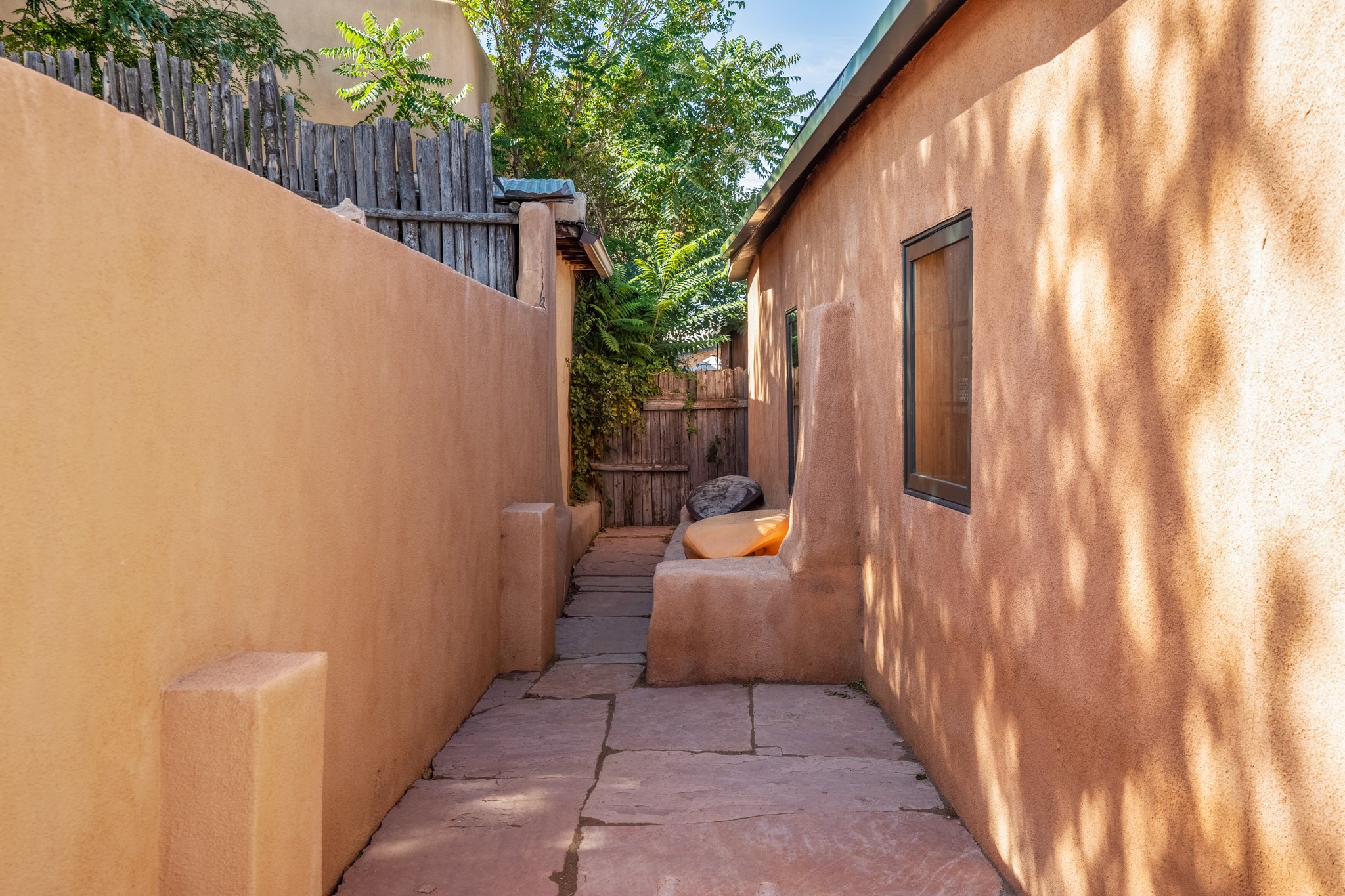 Predominantly Adobe with abundant charm! 3 Bedrooms and 2 baths (third bedroom is a flex space with an exterior door) with updates throughout. Kitchen has stainless steel appliances, including a wine refrigerator, and granite countertops. Outdoor spaces with mature aspen trees are cozy and inviting, while requiring minimal maintenance. Highly prized off-street parking for two vehicles. Superb location - close to the Plaza, shopping, entertainment and more than 20 restaurants. Currently a long-term rental, the home has a short-term rental history as well. This versatile property can serve as either a comfortable home or a source of supplementary income, depending on your vision.