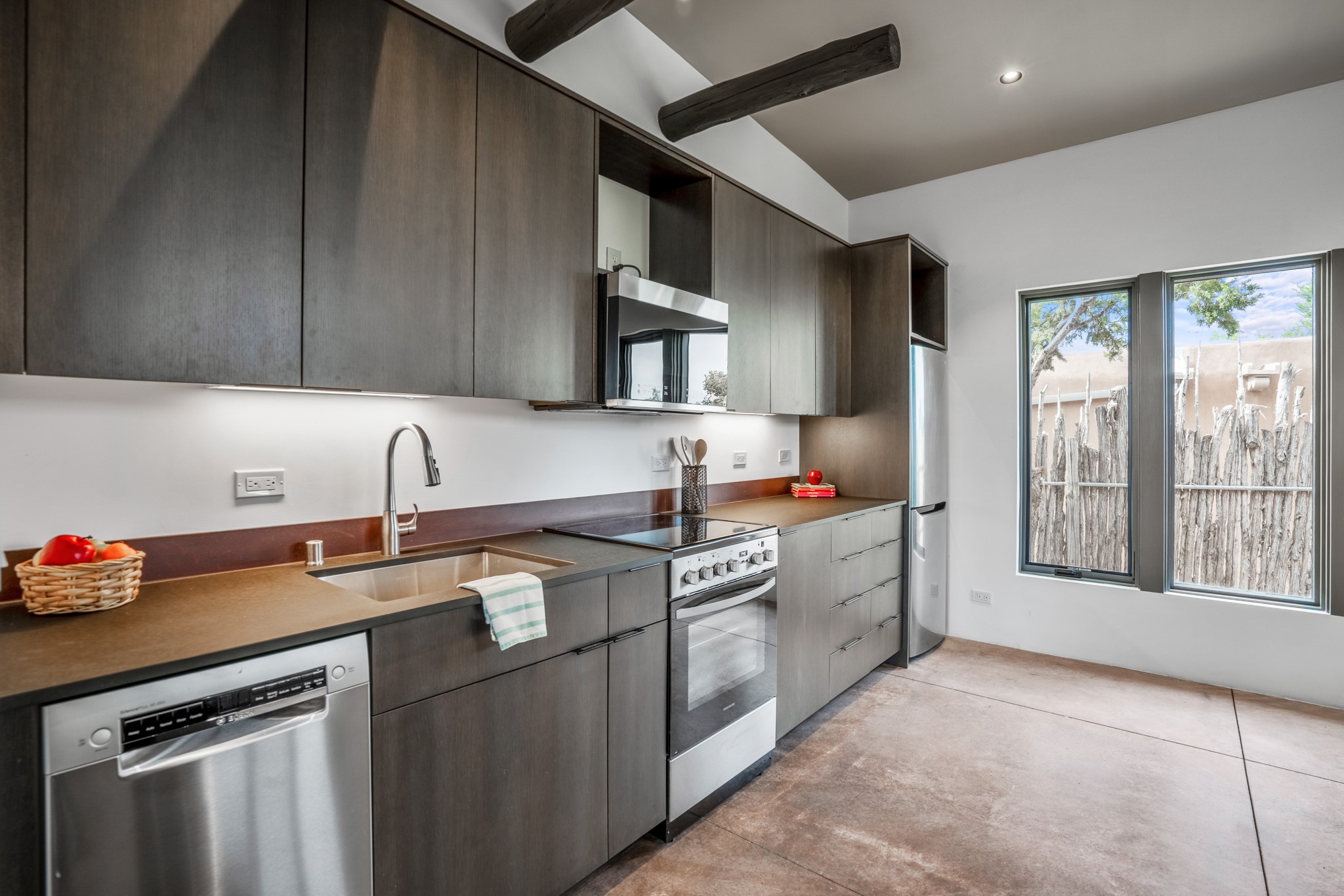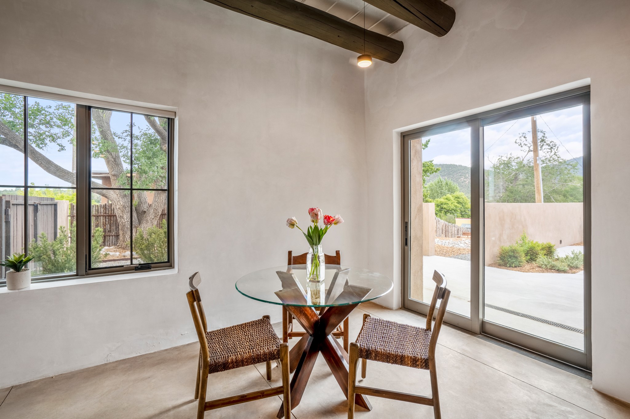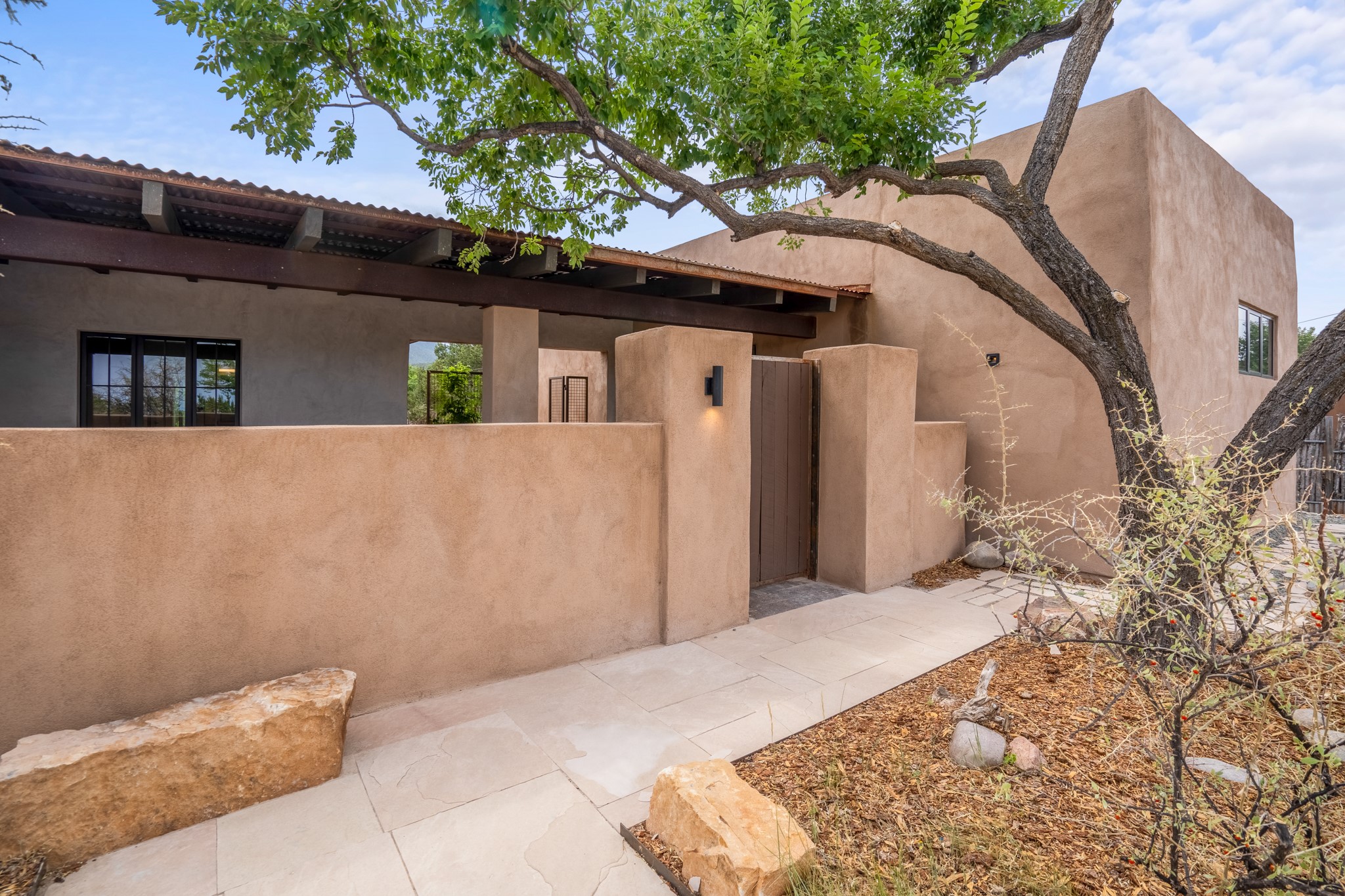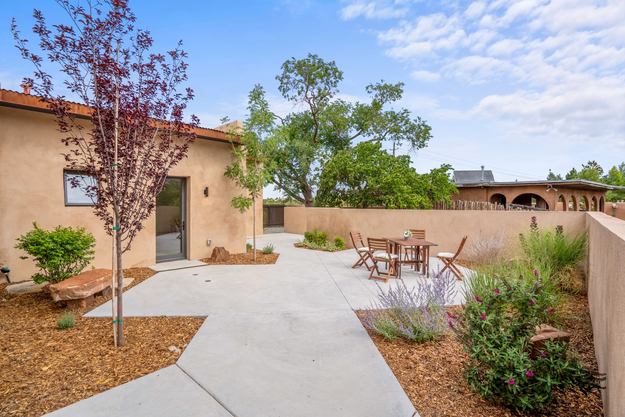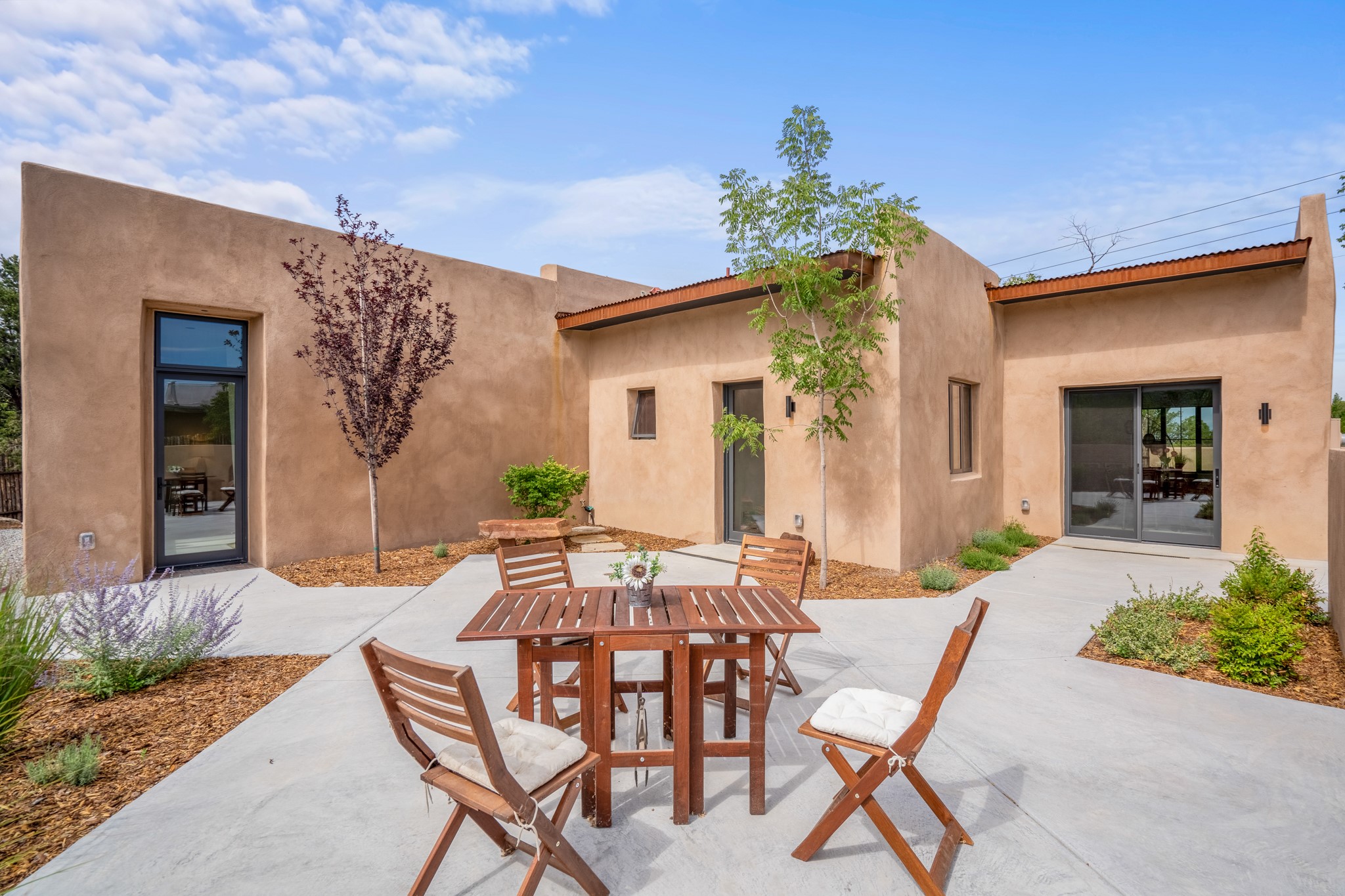 Sited a stone's throw from the Santa Fe River Trail, a virtually brand new adobe home with newly built guest house offers the ideal multi-dwelling retreat for those exploring and enjoying the City Different. The extensive renovation gracefully merges form & function, with new electric, plumbing, and appliances, roof, stucco, and landscaping augmenting the polished contemporary interiors with enticing views of the city below. This thoughtful design has tastefully incorporated elements of the original Southwestern style, like the restored beams and kiva fireplace, into the move-in ready jewel it is now. Clean lines, high ceilings, skylights, and new windows allow an abundance of natural light to fill the interiors. The nearly 2000 square foot floor plan offers an open flow for the kitchen, dining and living spaces, while providing excellent separation for the 2 bedroom suites and additional office. Features of the main house include radiant heated floors, stone countertops, stainless steel appliances, built-in shelving, plaster finishes, spa-like owner's suite, and multiple outdoor patios to enjoy fabulous sunsets. Separated by a front portal and breezeway, the detached 1 bed/1bath casita is a well-appointed haven for visitors. Features of the casita include a Swedish fireplace, full kitchen, high ceilings, built in cabinets and shelving. This rare offering is a short distance from the Plaza, Canyon Road, the ski basin, and Fort Marcy Park complex and an incredible value with immeasurable peace of mind for years to come.