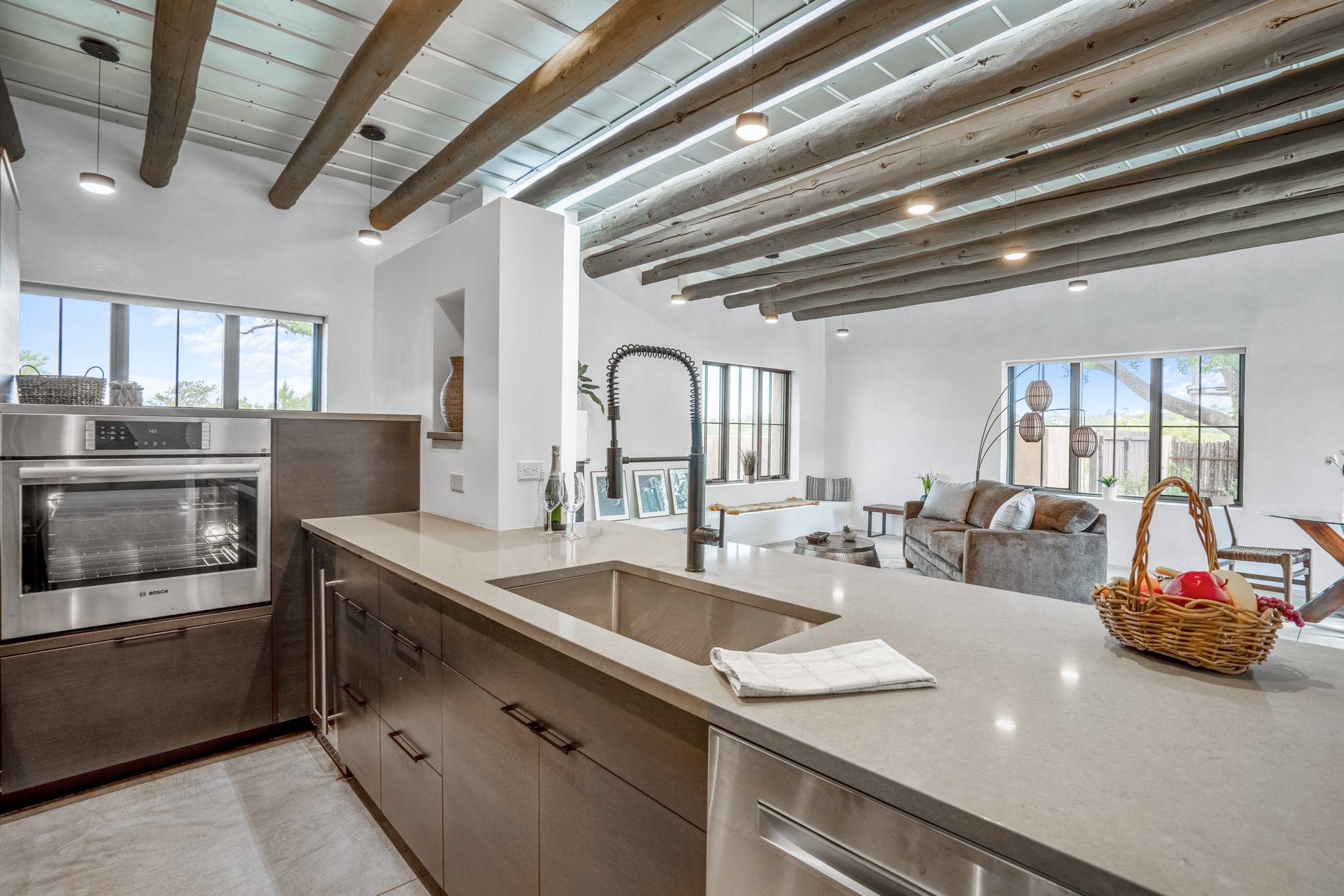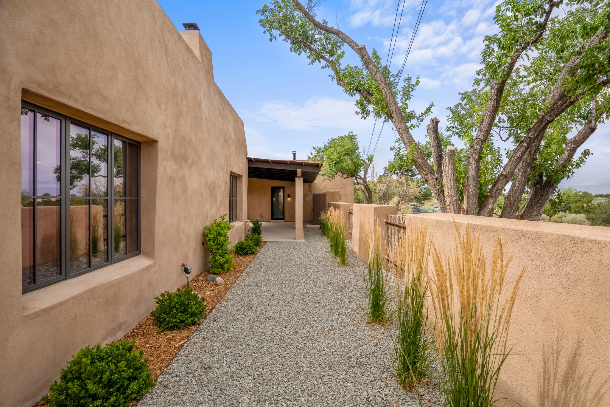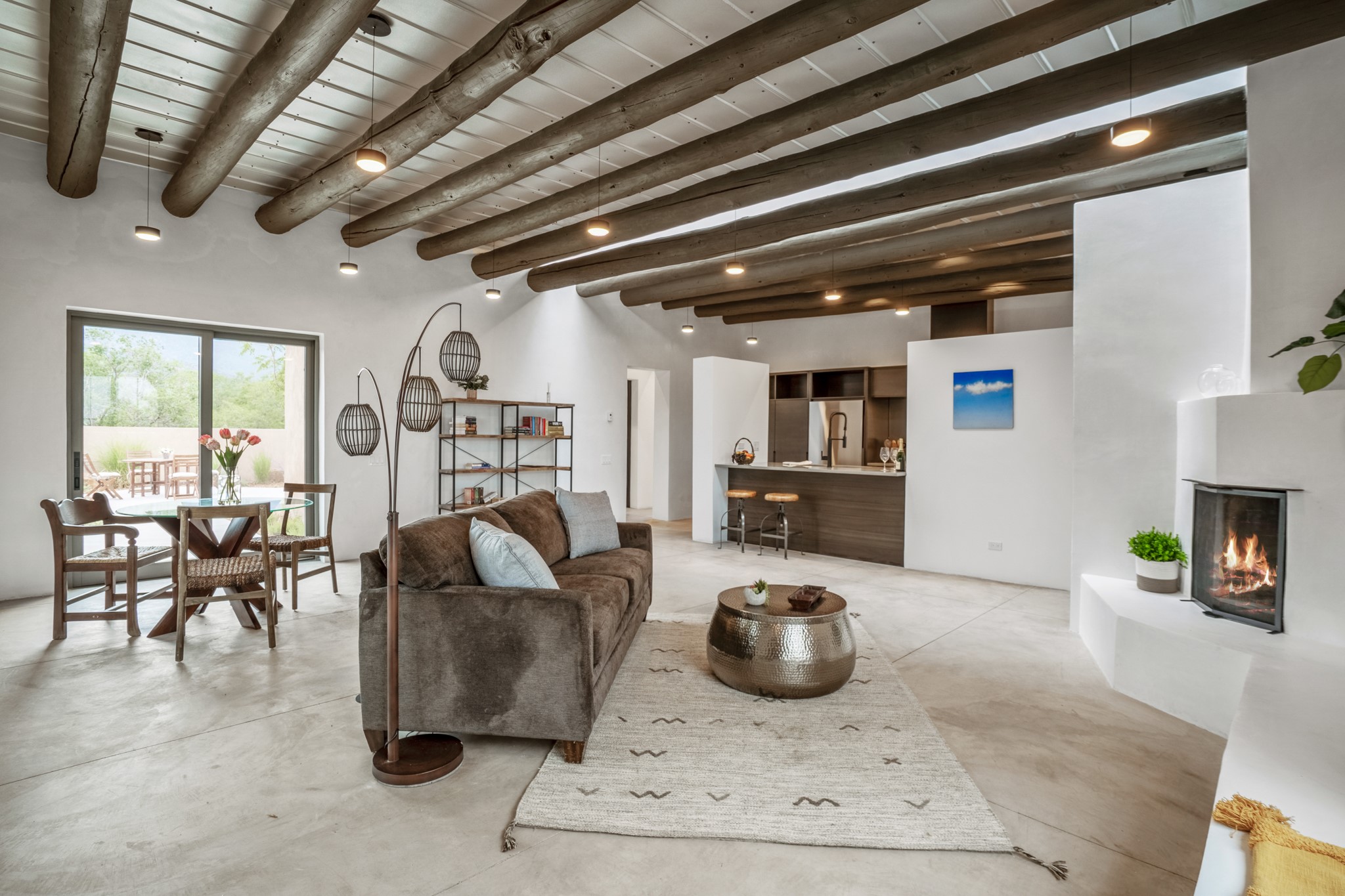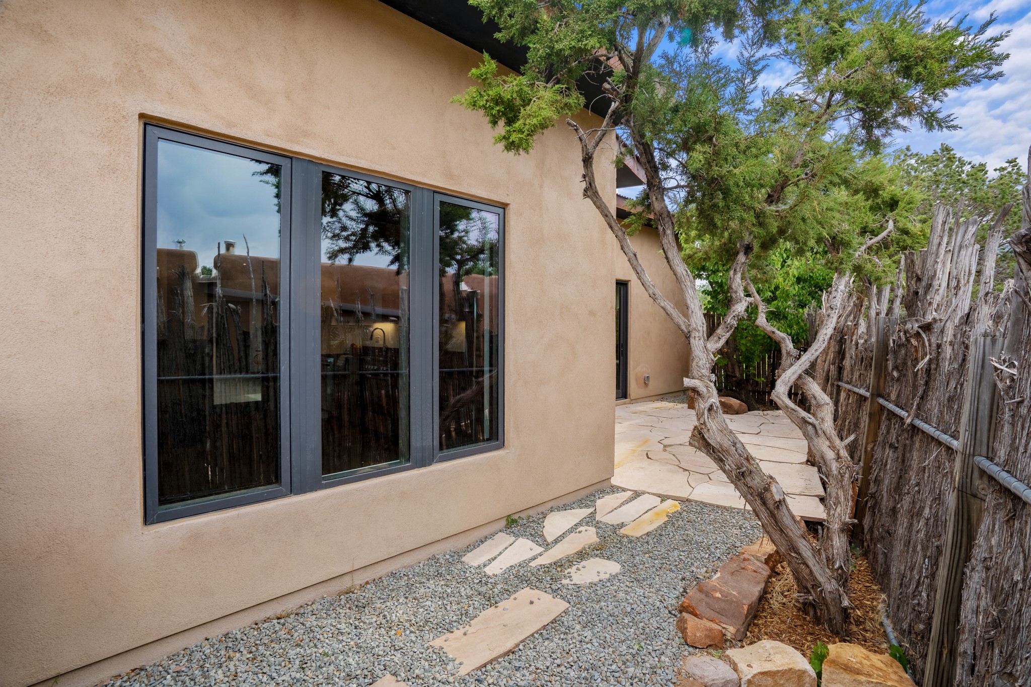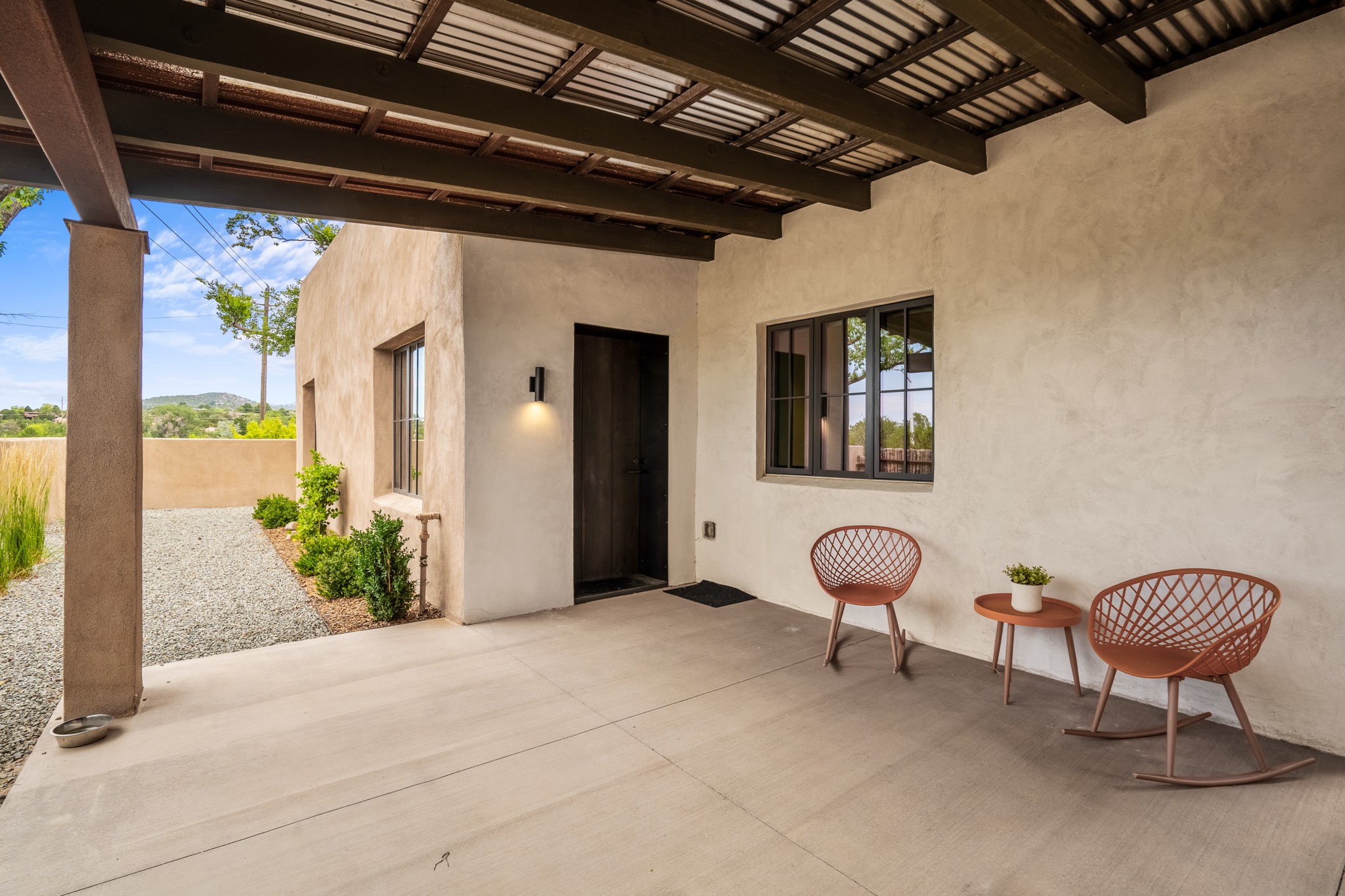 Sited a stone's throw from the Santa Fe River Trail, a virtually brand new adobe home with newly built guest house offers the ideal multi-dwelling retreat for those exploring and enjoying the City Different. The extensive renovation gracefully merges form & function, with new electric, plumbing, and appliances, roof, stucco, and landscaping augmenting the polished contemporary interiors with enticing views of the city below. This thoughtful design has tastefully incorporated elements of the original Southwestern style, like the restored beams and kiva fireplace, into the move-in ready jewel it is now. Clean lines, high ceilings, skylights, and new windows allow an abundance of natural light to fill the interiors. The nearly 2000 square foot floor plan offers an open flow for the kitchen, dining and living spaces, while providing excellent separation for the 2 bedroom suites and additional office. Features of the main house include radiant heated floors, stone countertops, stainless steel appliances, built-in shelving, plaster finishes, spa-like owner's suite, and multiple outdoor patios to enjoy fabulous sunsets. Separated by a front portal and breezeway, the detached 1 bed/1bath casita is a well-appointed haven for visitors. Features of the casita include a Swedish fireplace, full kitchen, high ceilings, built in cabinets and shelving. This rare offering is a short distance from the Plaza, Canyon Road, the ski basin, and Fort Marcy Park complex and an incredible value with immeasurable peace of mind for years to come.