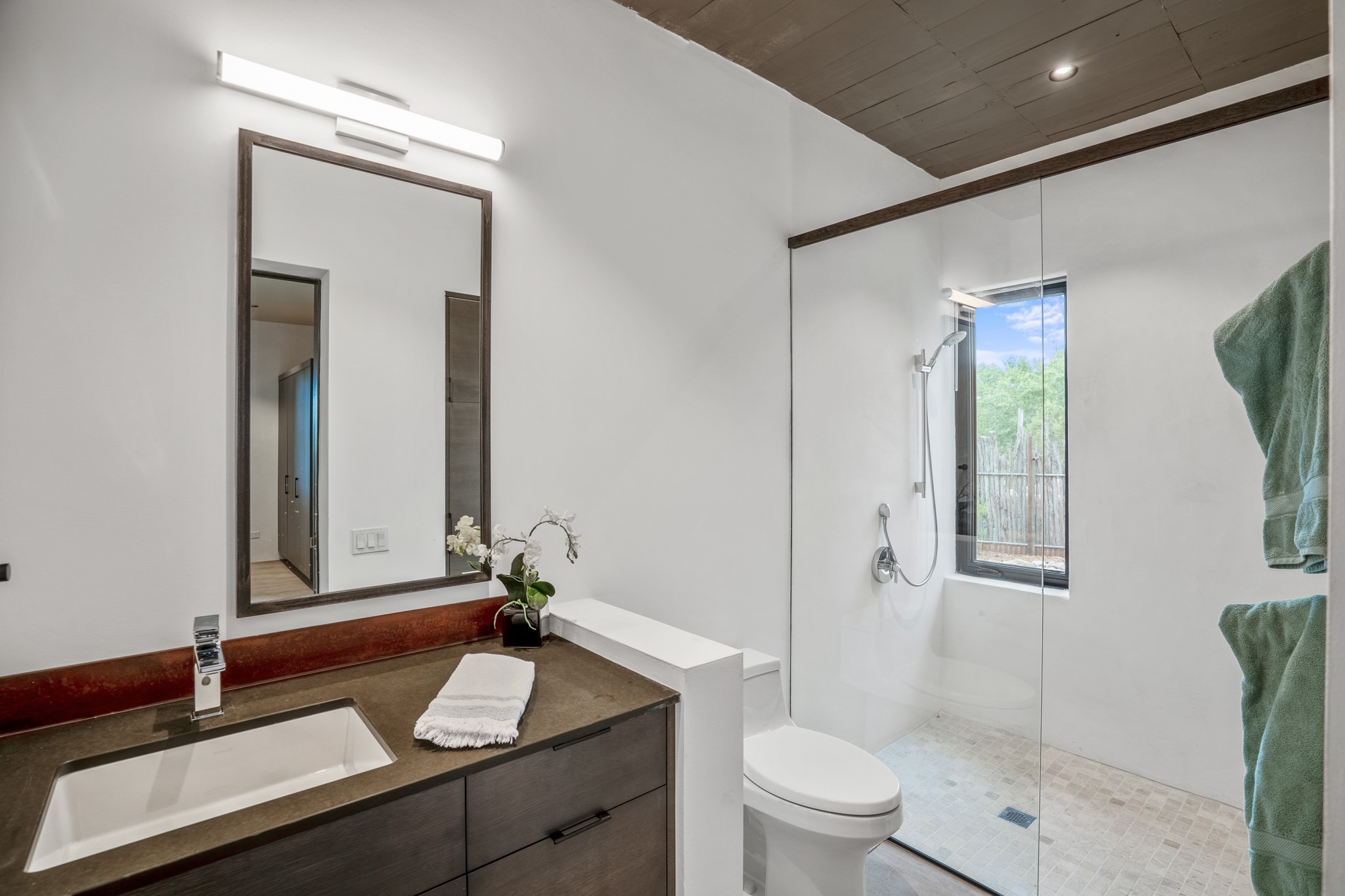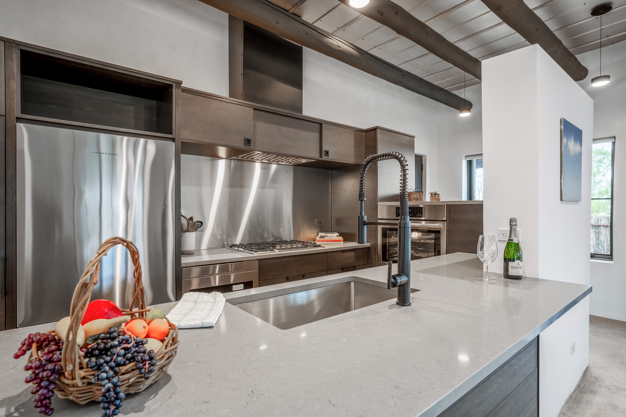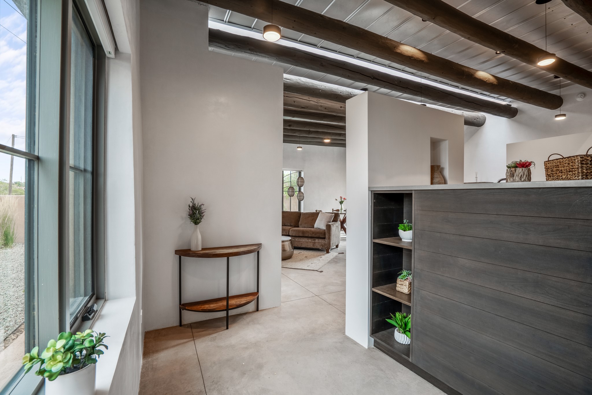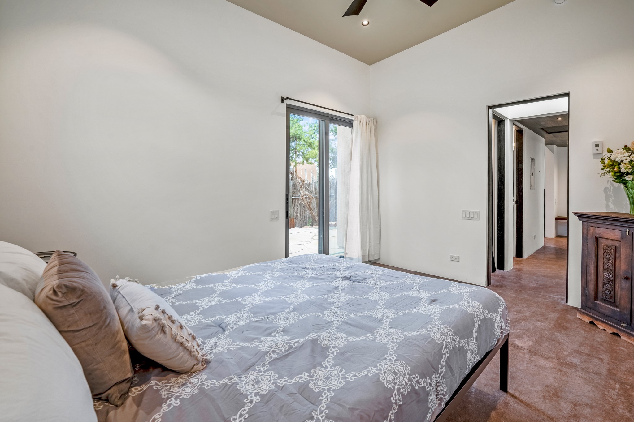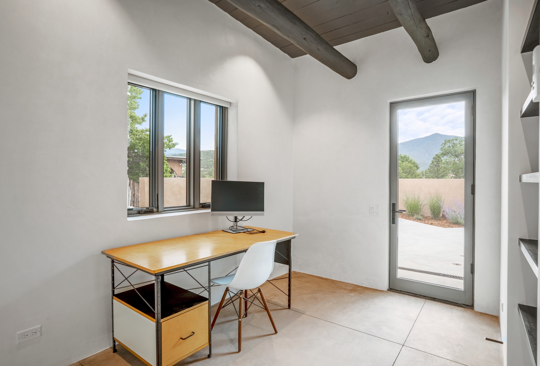 Sited a stone's throw from the Santa Fe River Trail, a virtually brand new adobe home with newly built guest house offers the ideal multi-dwelling retreat for those exploring and enjoying the City Different. The extensive renovation gracefully merges form & function, with new electric, plumbing, and appliances, roof, stucco, and landscaping augmenting the polished contemporary interiors with enticing views of the city below. This thoughtful design has tastefully incorporated elements of the original Southwestern style, like the restored beams and kiva fireplace, into the move-in ready jewel it is now. Clean lines, high ceilings, skylights, and new windows allow an abundance of natural light to fill the interiors. The nearly 2000 square foot floor plan offers an open flow for the kitchen, dining and living spaces, while providing excellent separation for the 2 bedroom suites and additional office. Features of the main house include radiant heated floors, stone countertops, stainless steel appliances, built-in shelving, plaster finishes, spa-like owner's suite, and multiple outdoor patios to enjoy fabulous sunsets. Separated by a front portal and breezeway, the detached 1 bed/1bath casita is a well-appointed haven for visitors. Features of the casita include a Swedish fireplace, full kitchen, high ceilings, built in cabinets and shelving. This rare offering is a short distance from the Plaza, Canyon Road, the ski basin, and Fort Marcy Park complex and an incredible value with immeasurable peace of mind for years to come.