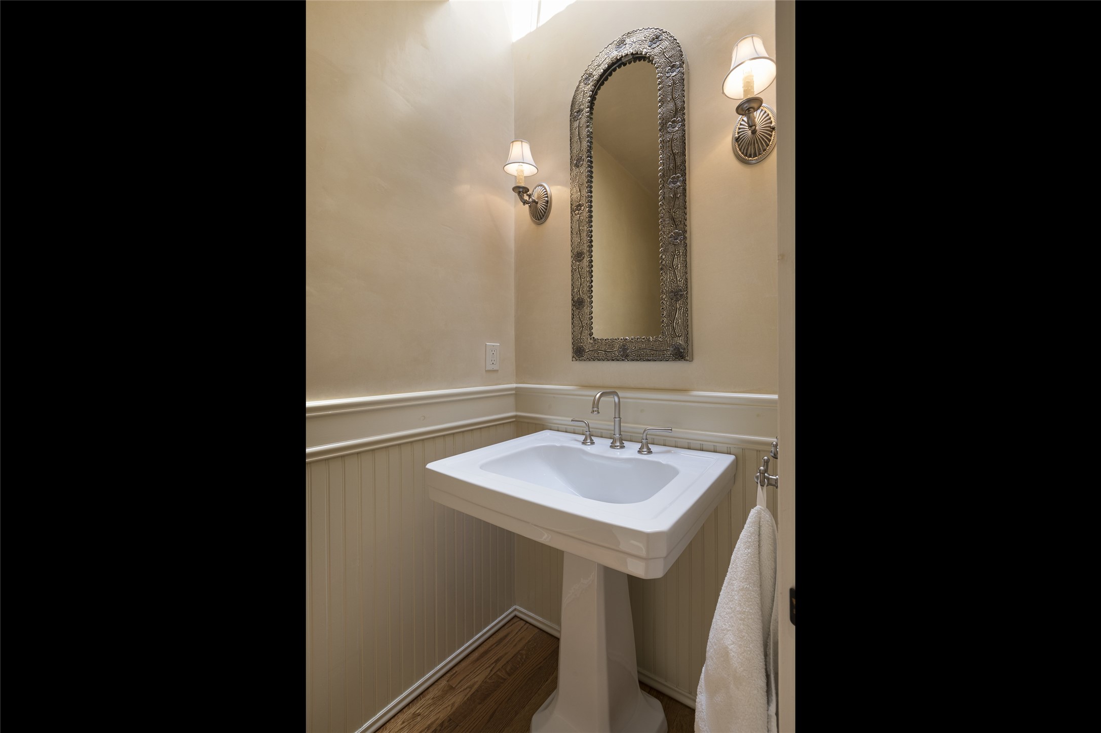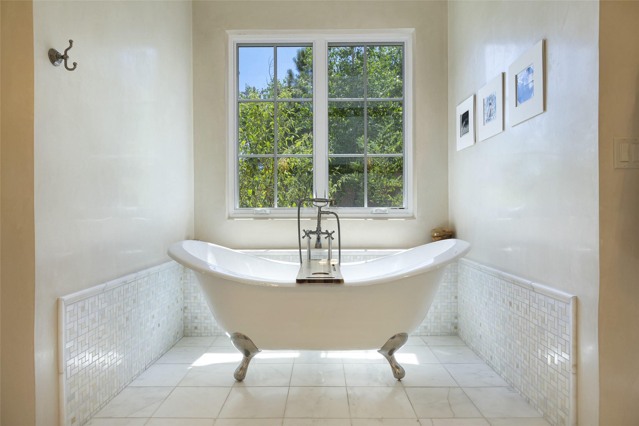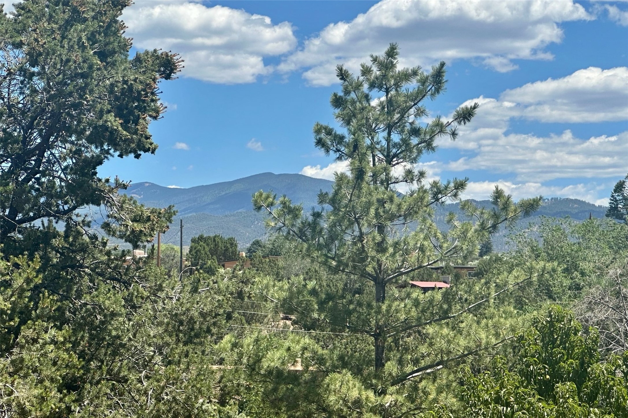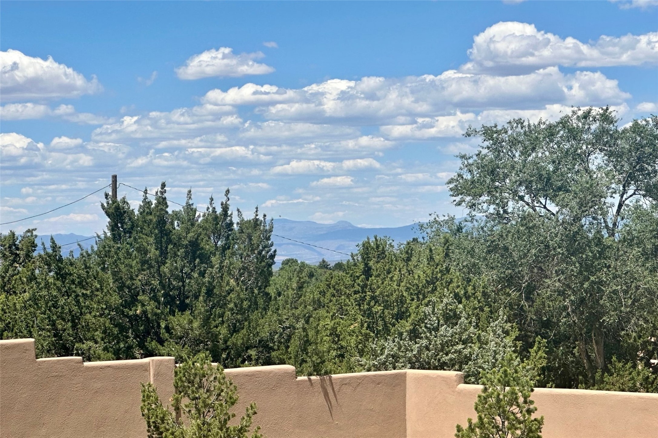 One of the most extraordinary estates in all of Santa Fe, this exquisite, beautifully renovated gated residence by Woods Design Builders, sited on a one-acre view lot, within the ultimate park-like setting, excites and captivates with powerful architecture and exceptional Sangre de Cristo and Jemez Mountain views. Located on one of most secluded and highly sought after streets in Santa Fe, within close proximity to the Plaza and Canyon Road, this quality 4-bedroom home with 3.5 baths, two living rooms and an office area, exemplifies the unique blend of modern design with inherent warmth and sophistication. Ideal for entertaining, this Parade of Homes, award-winning home, offers the ultimate state of the art kitchen complete with luxury appliances, Calacatta Amber marble counters, wine cooler, and dual breakfast bars with expansive seating, which opens to the spacious living room, dining area, and casual living room or breakfast dining area, all with portal access and dual fireplaces. The spacious owner's suite stuns with a grand fireplace, office niche, portal access and the newly expanded and renovated, luxurious spa-like bath with a soaking tub, walk-in shower and large dual closets. Separate from the owner's suite is a fully independent guest wing with an ensuite bedroom, two well-appointed guest bedrooms which share a full bath, a secondary living room, office area, and a cozy built-in daybed. The outdoor living areas are some of the finest in Santa Fe, with elevated outdoor seating which overlooks the mountain views and lush landscape, in addition to a private lounging area ideal for entertaining, complete with a tranquil water feature, surrounding gardens, and a basketball court. Additional features include a welcoming courtyard entrance with a water feature and privacy gate, wood flooring and natural stone counters, updated roof and stucco, and superior craftsmanship throughout.