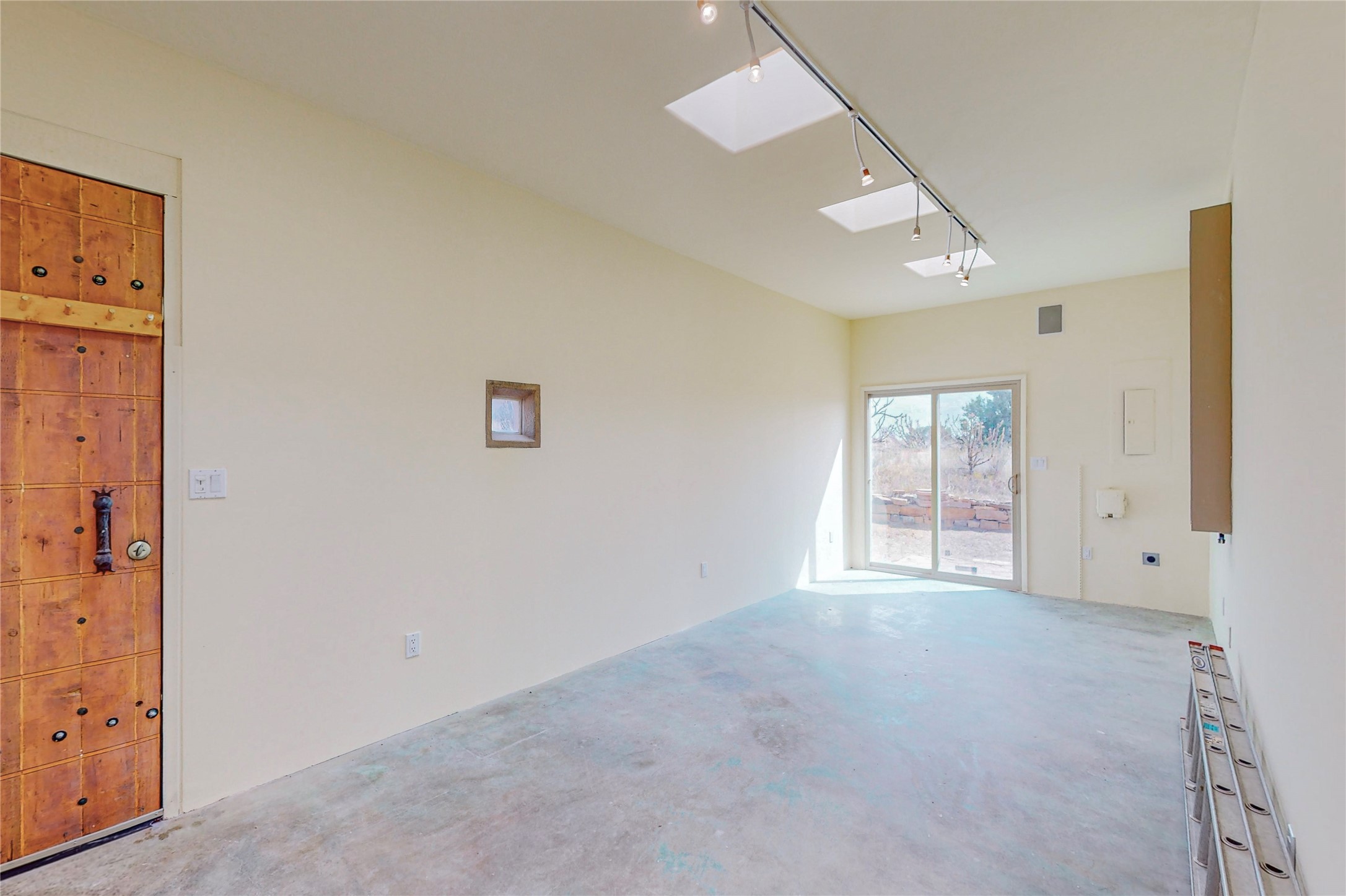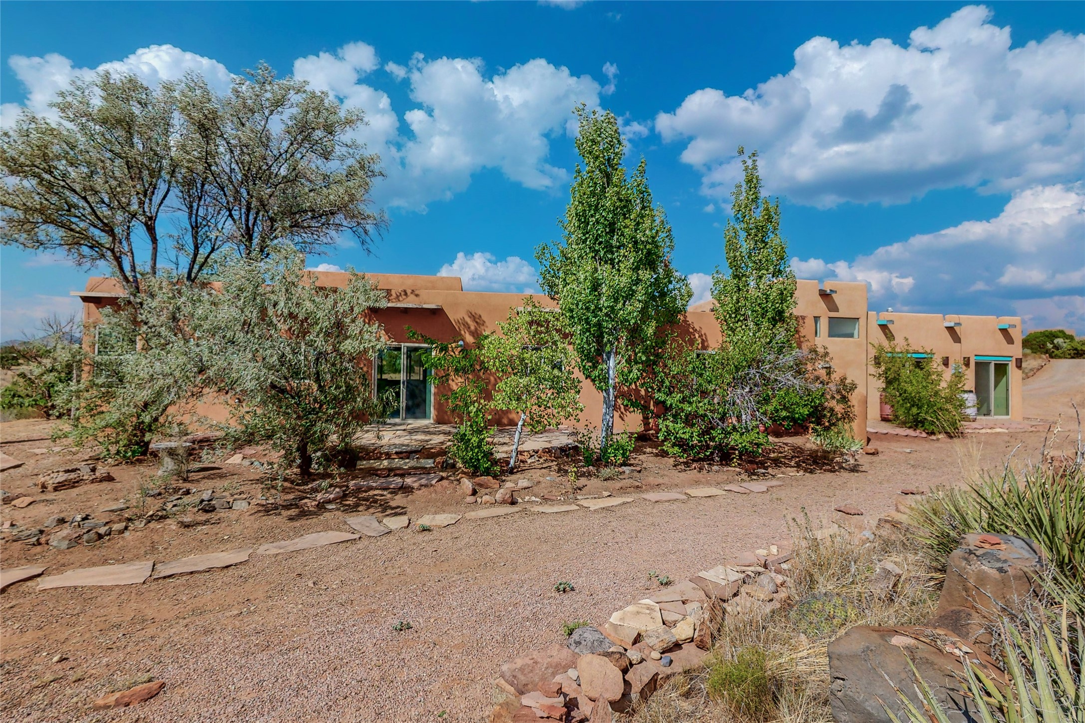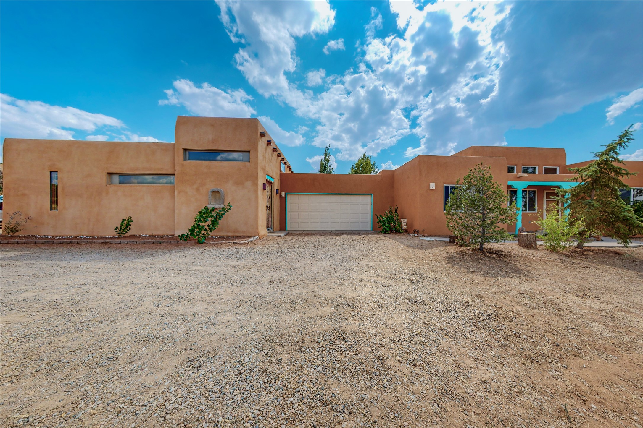 Open plan, split 3 bedroom, 2 bath home attached 800 sqft. 2 heated studios with huge high ceilings. Although small the high ceilings create a spacious feel. A sunburst design viga ceiling and corner living room fireplace opens to the kitchen and dining areas. The surrounding landscape is ready and invites your personal touches, and has sweeping mountain and sunset views. A large 2-car garage and plenty of guest parking adds convenience. Privately located on a cul de sac bordering a large greenbelt yet close to paved access roads leading to local shopping, restaurants, schools, senior center, and library. This home accesses all of Eldorado community activities and trails plus only minutes into Santa Fe.