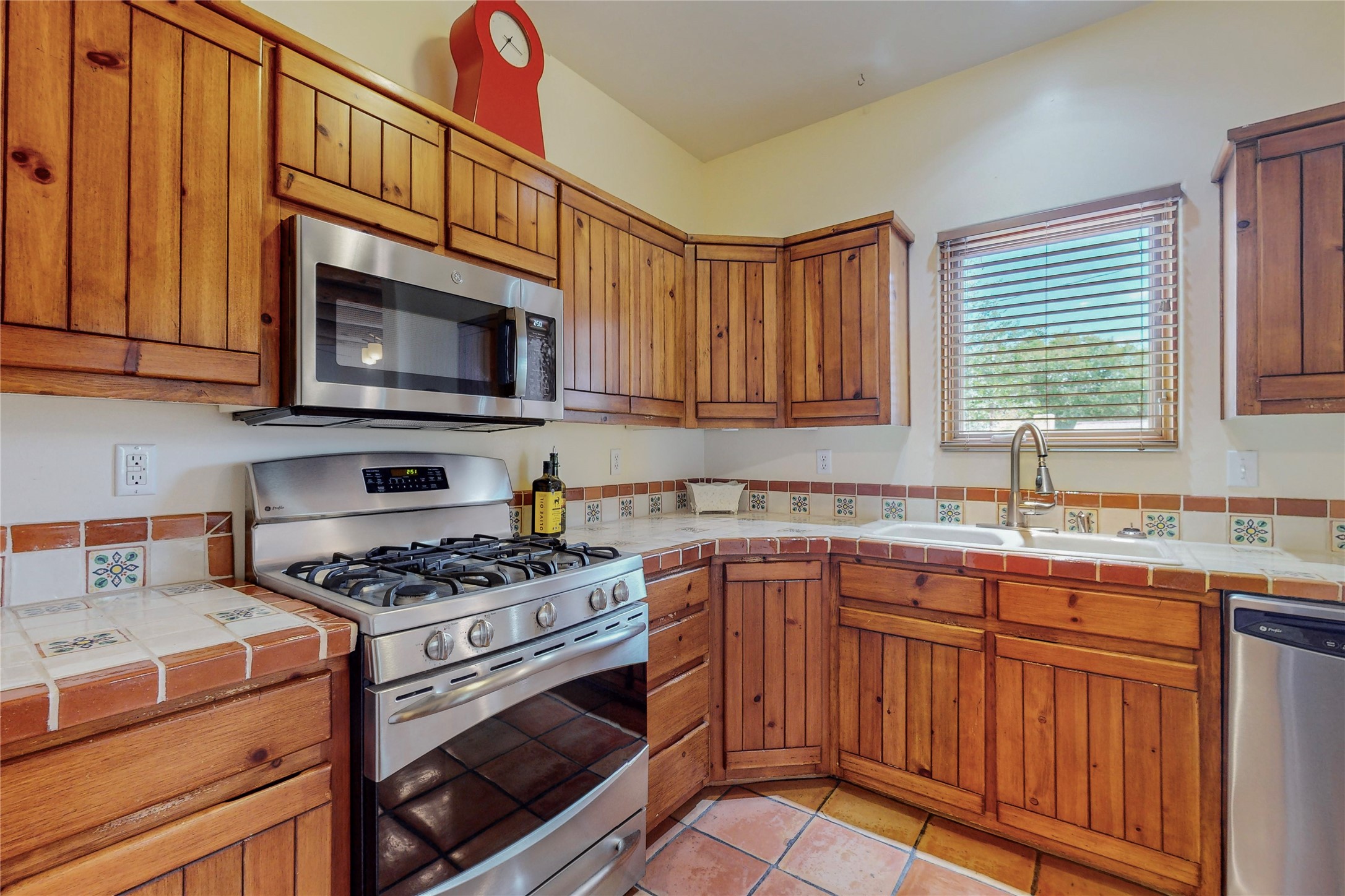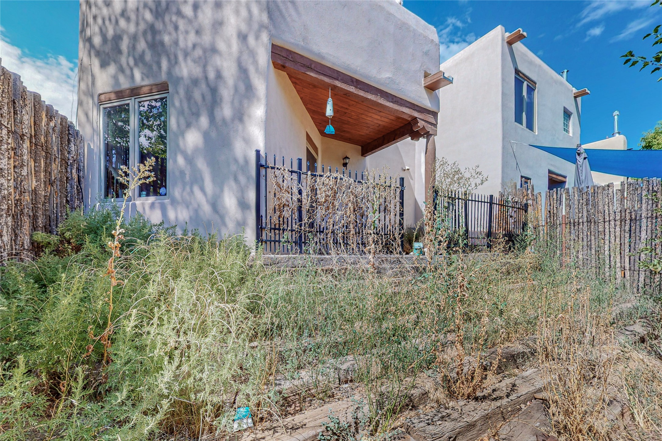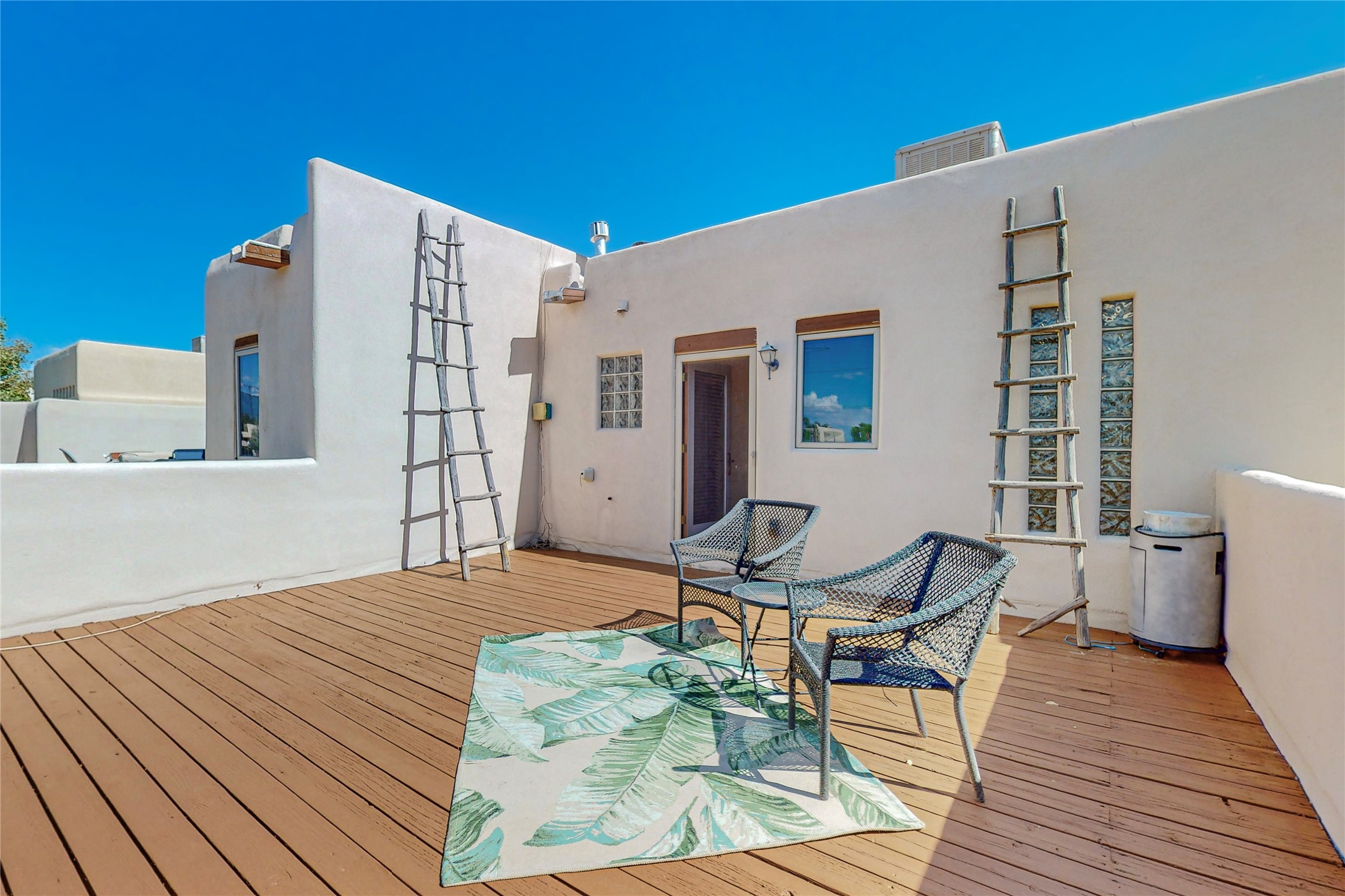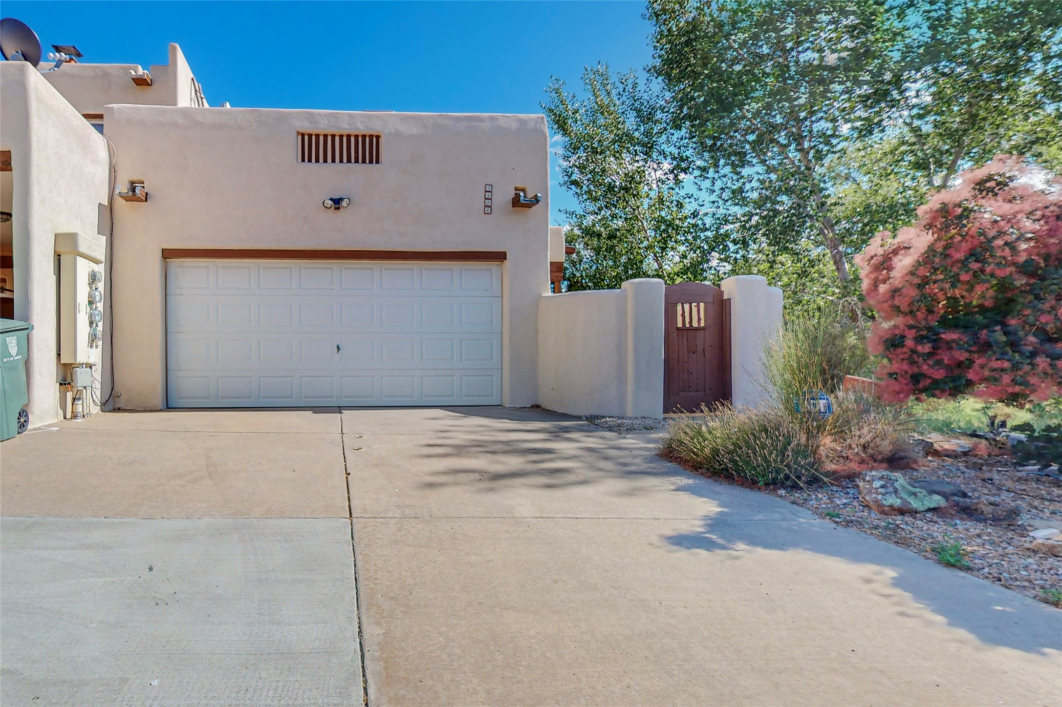 Don't miss the beautiful end unit, it overlooks green space with aspen. Full of Santa Fe Charm- Saltillo tile floors throughout the ground floor, kiva fireplaces and vigas. Bathrooms have beautiful traditional tile. Upstairs there are 2 decks, the larger one becomes an outdoor room in spring, summer and fall with beautiful views of the Sangre de Cristo and Jemez Mountains.2 car garage, with a small terraced garden off the living room.