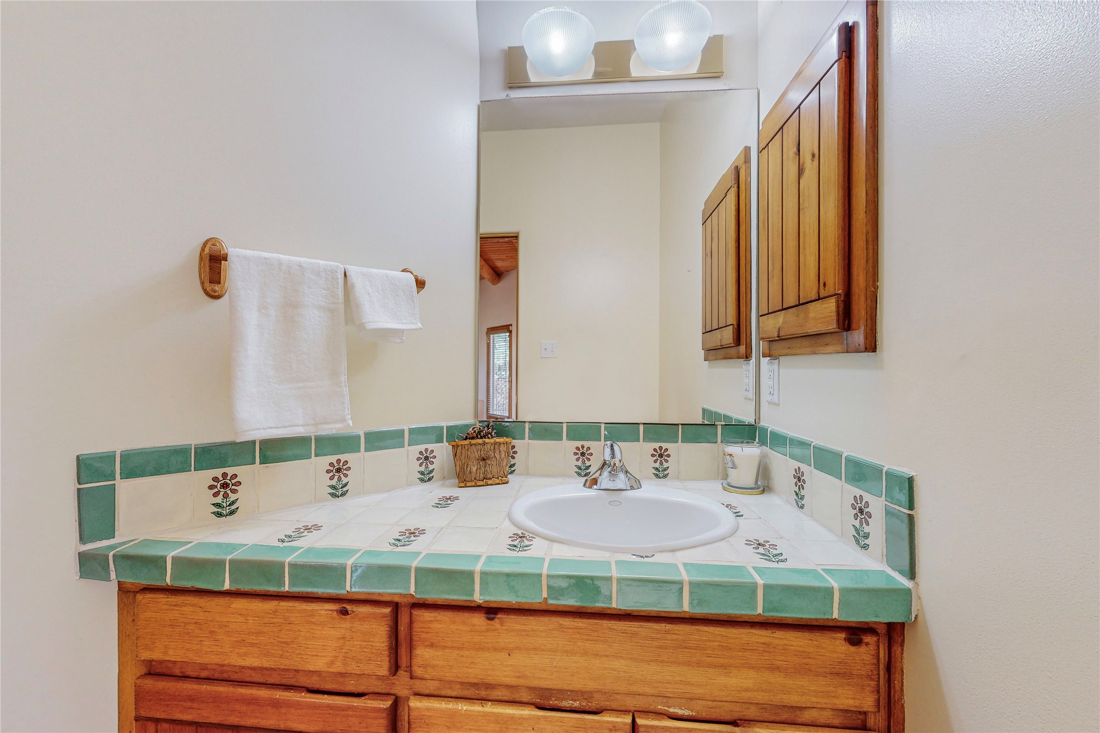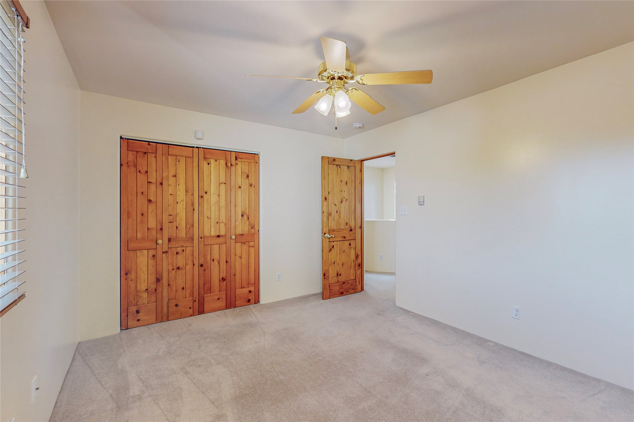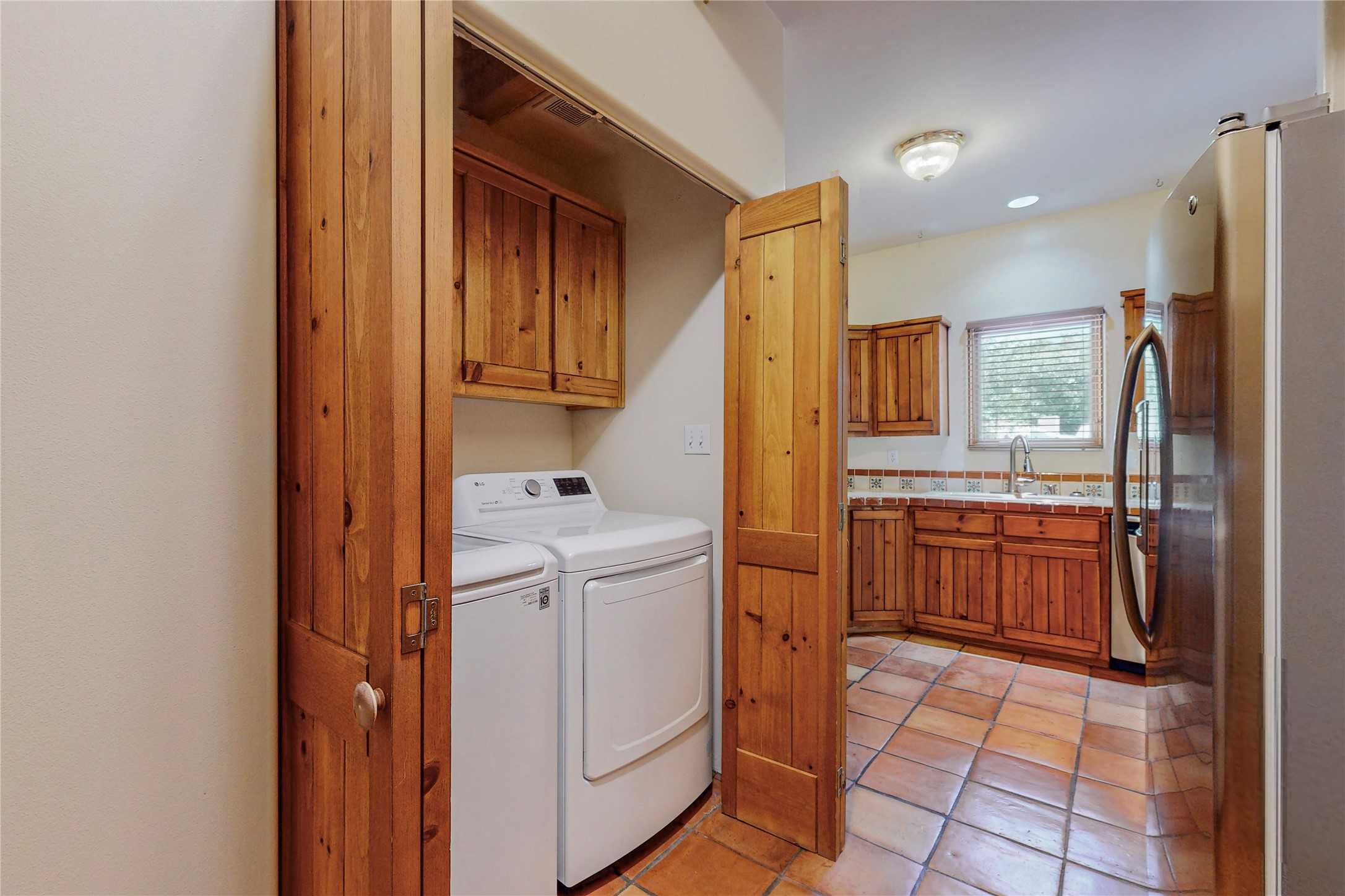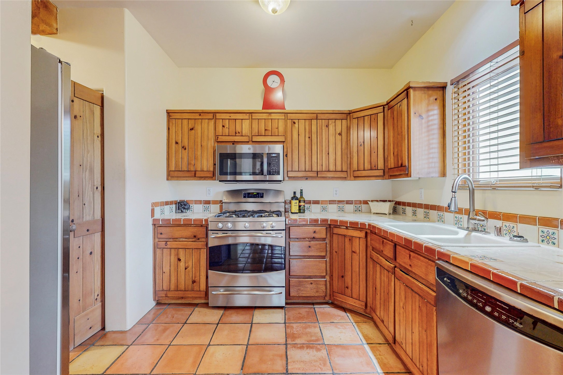Don't miss the beautiful end unit, it overlooks green space with aspen. Full of Santa Fe Charm- Saltillo tile floors throughout the ground floor, kiva fireplaces and vigas. Bathrooms have beautiful traditional tile. Upstairs there are 2 decks, the larger one becomes an outdoor room in spring, summer and fall with beautiful views of the Sangre de Cristo and Jemez Mountains.2 car garage, with a small terraced garden off the living room.