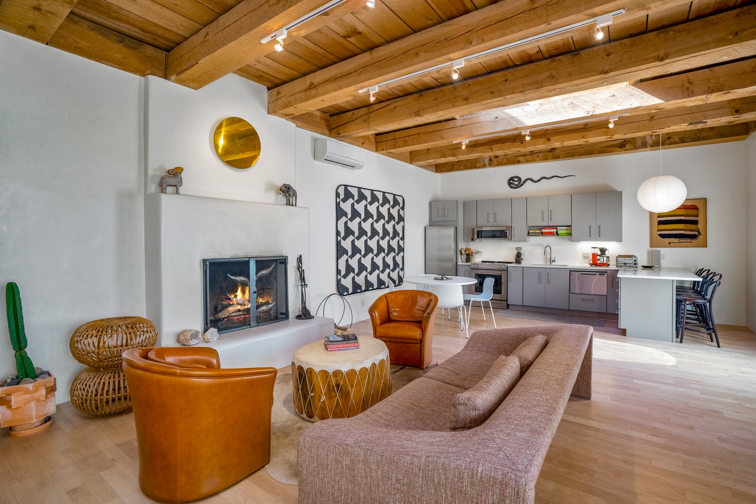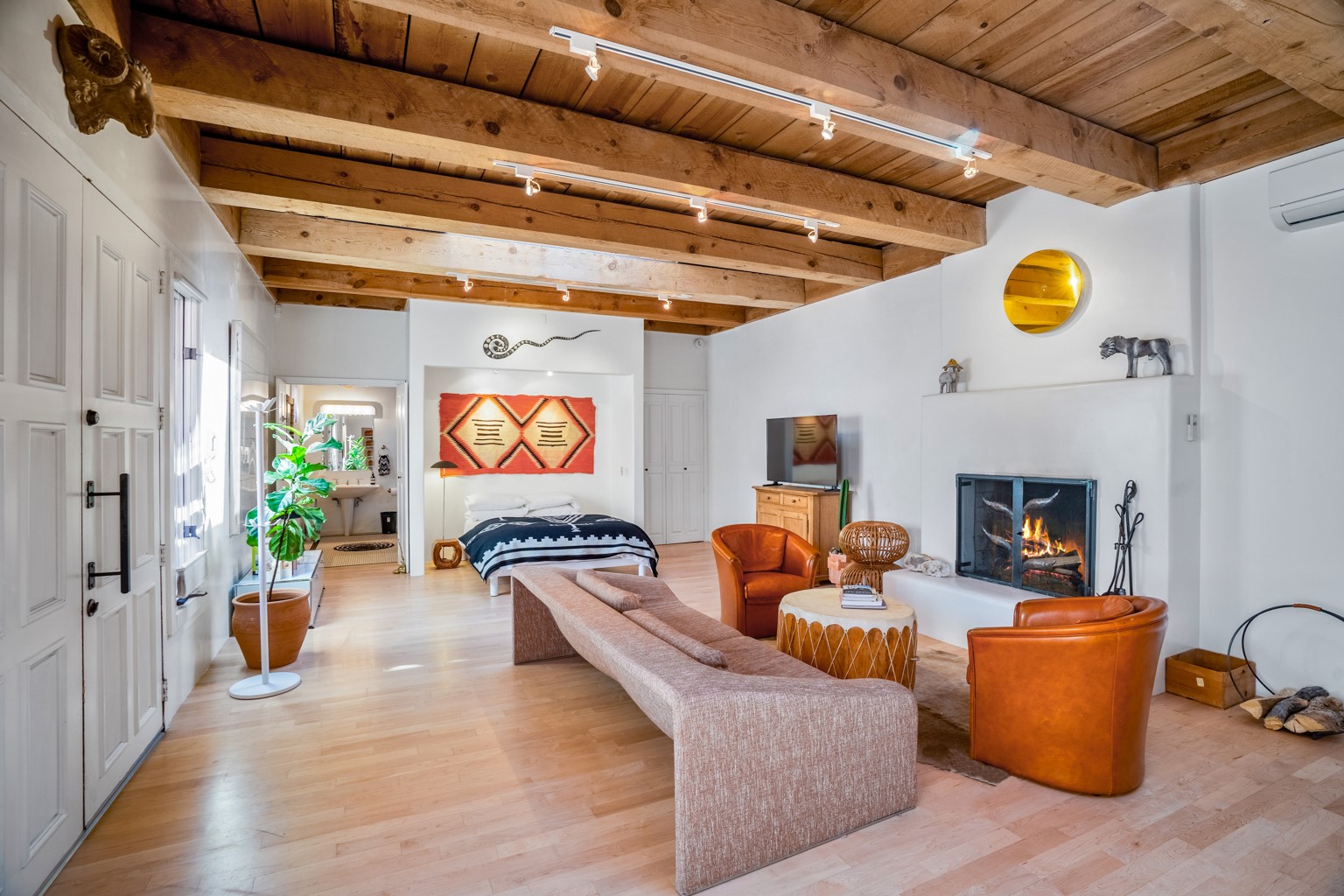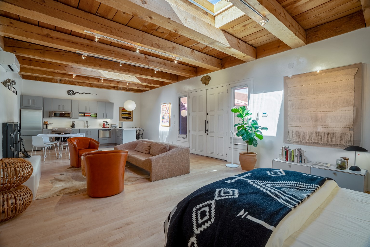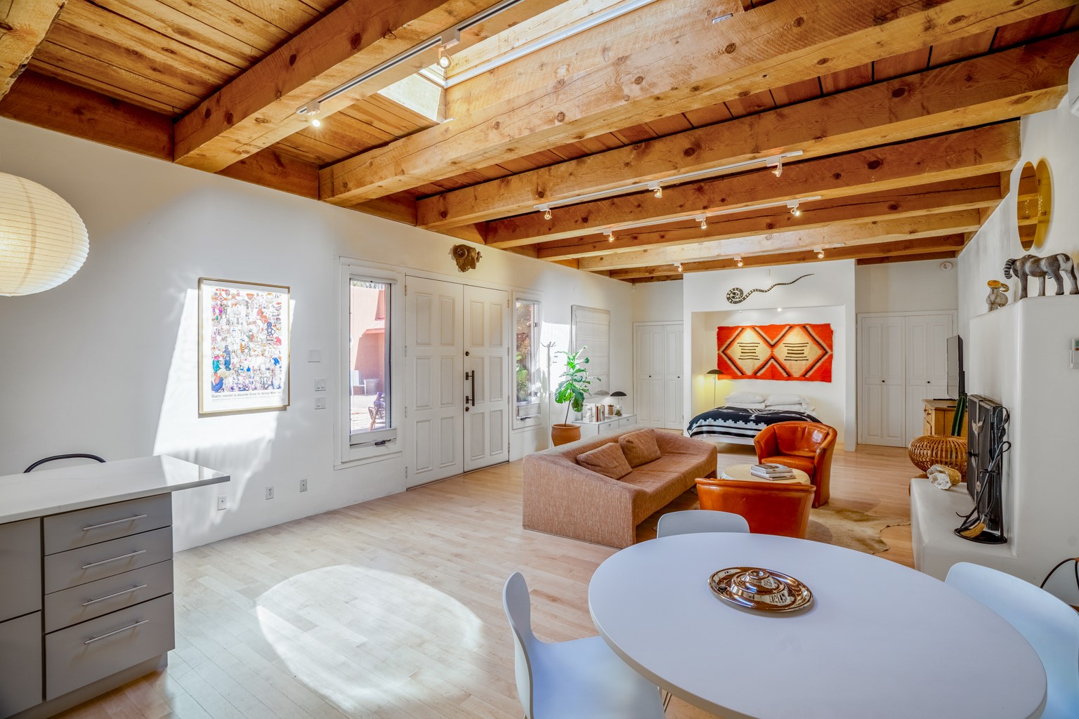 Nestled behind an impressive gated entrance, rests a remarkable compound comprising 4 architecturally unique units. Positioned alongside the Santa Fe river, this compound offers not only stunning aesthetics but also convenience, being a leisurely stroll away from both the Santa Fe Plaza and the lively Guadalupe Historic Railyard District.Meticulously renovated from the ground up, every facet of this condo has been transformed. The result is an exquisite living space featuring a modernized chef's kitchen, lofty ceiling adorned with wooded beams, and expansive skylights that flood the interior with natural light. Currently utilized as a short term rental property with consistently high occupancy rates, this pied-a-terre presents an exceptional opportunity for savvy investors looking to establish a foothold in Santa Fe's competitive rental and housing market. Furniture Package does not convey. It is handled at an additional price.