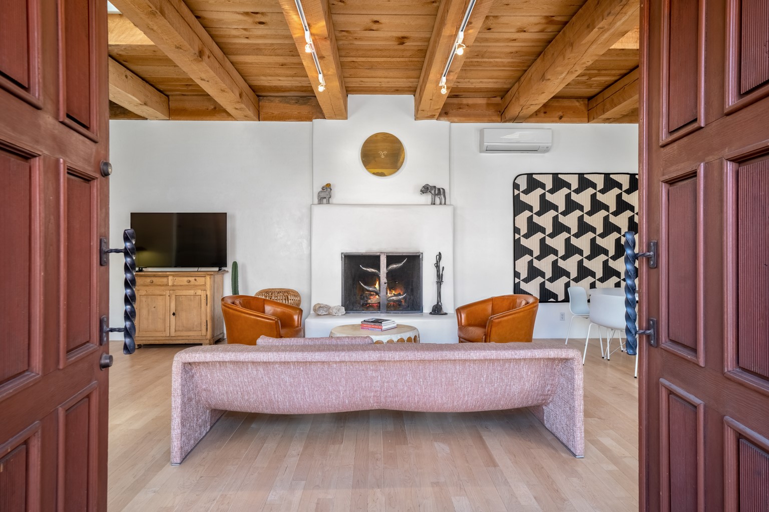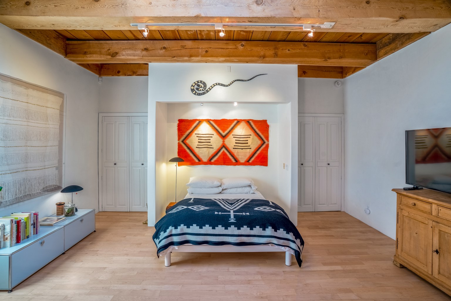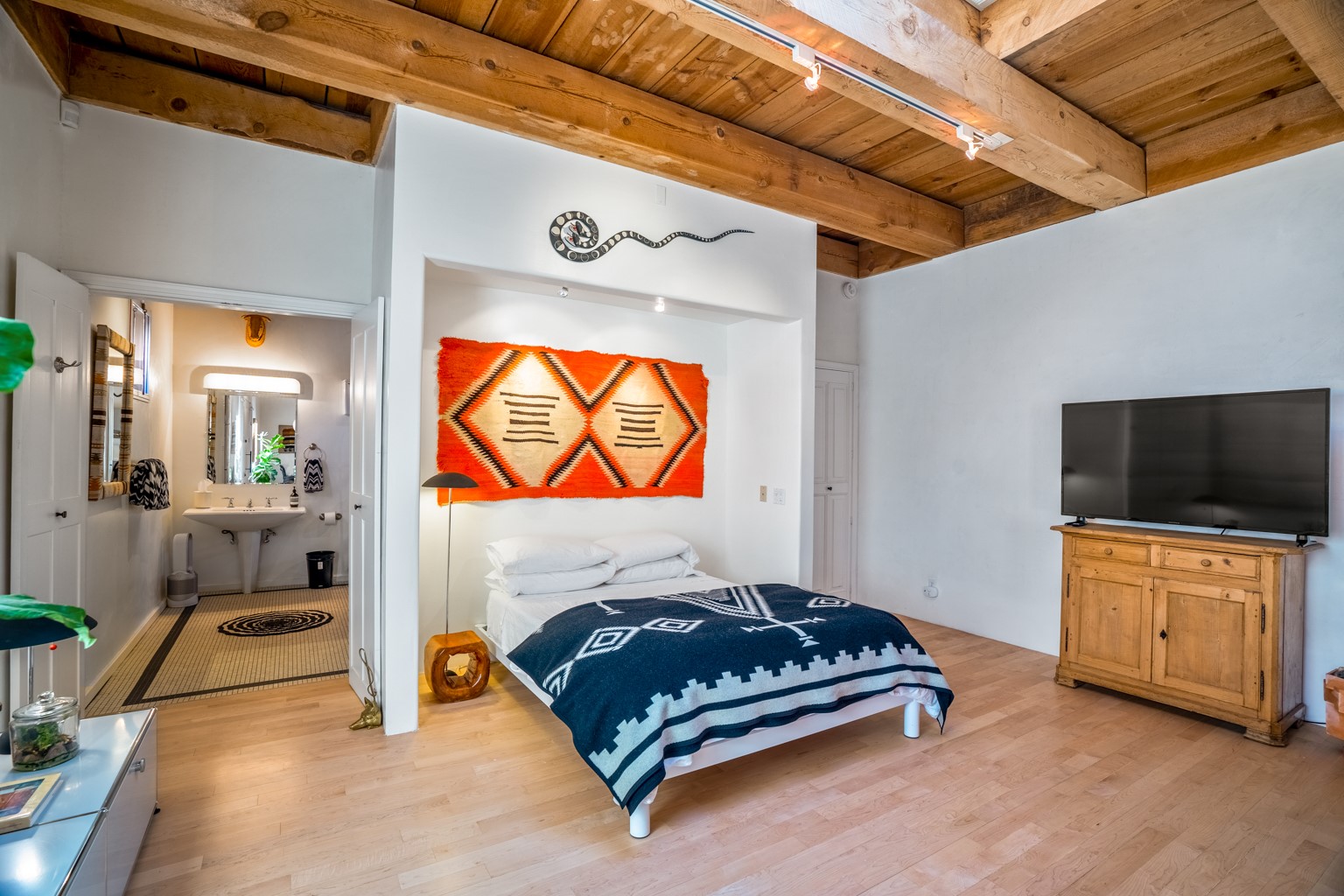 Nestled behind an impressive gated entrance, rests a remarkable compound comprising 4 architecturally unique units. Positioned alongside the Santa Fe river, this compound offers not only stunning aesthetics but also convenience, being a leisurely stroll away from both the Santa Fe Plaza and the lively Guadalupe Historic Railyard District.Meticulously renovated from the ground up, every facet of this condo has been transformed. The result is an exquisite living space featuring a modernized chef's kitchen, lofty ceiling adorned with wooded beams, and expansive skylights that flood the interior with natural light. Currently utilized as a short term rental property with consistently high occupancy rates, this pied-a-terre presents an exceptional opportunity for savvy investors looking to establish a foothold in Santa Fe's competitive rental and housing market. Furniture Package does not convey. It is handled at an additional price.