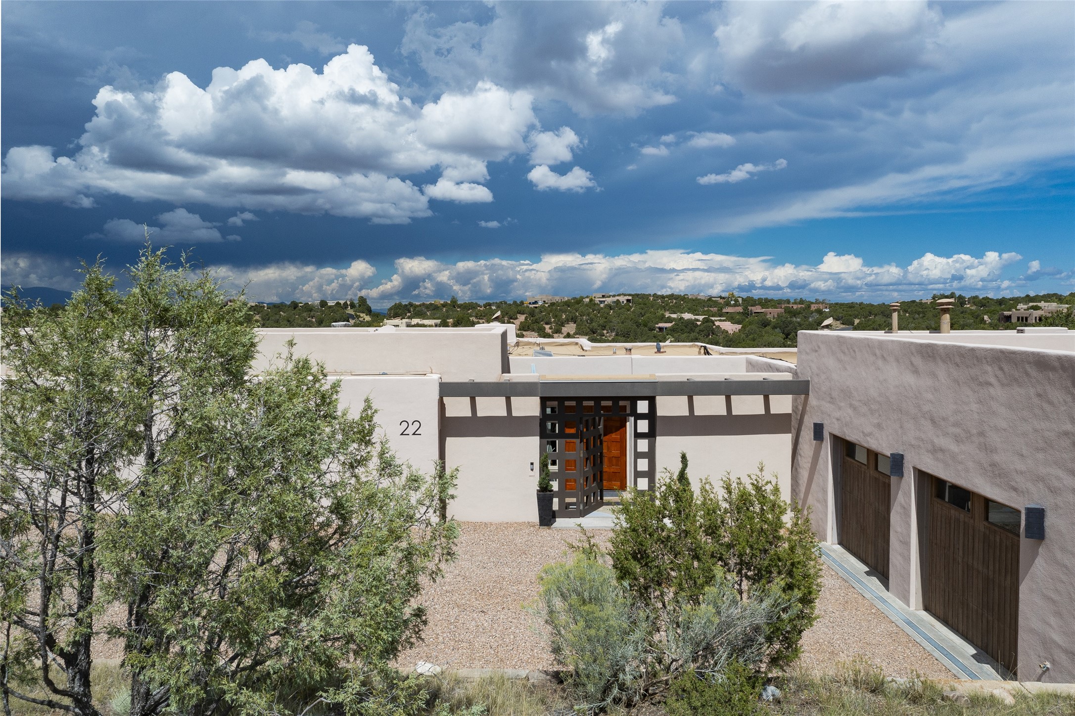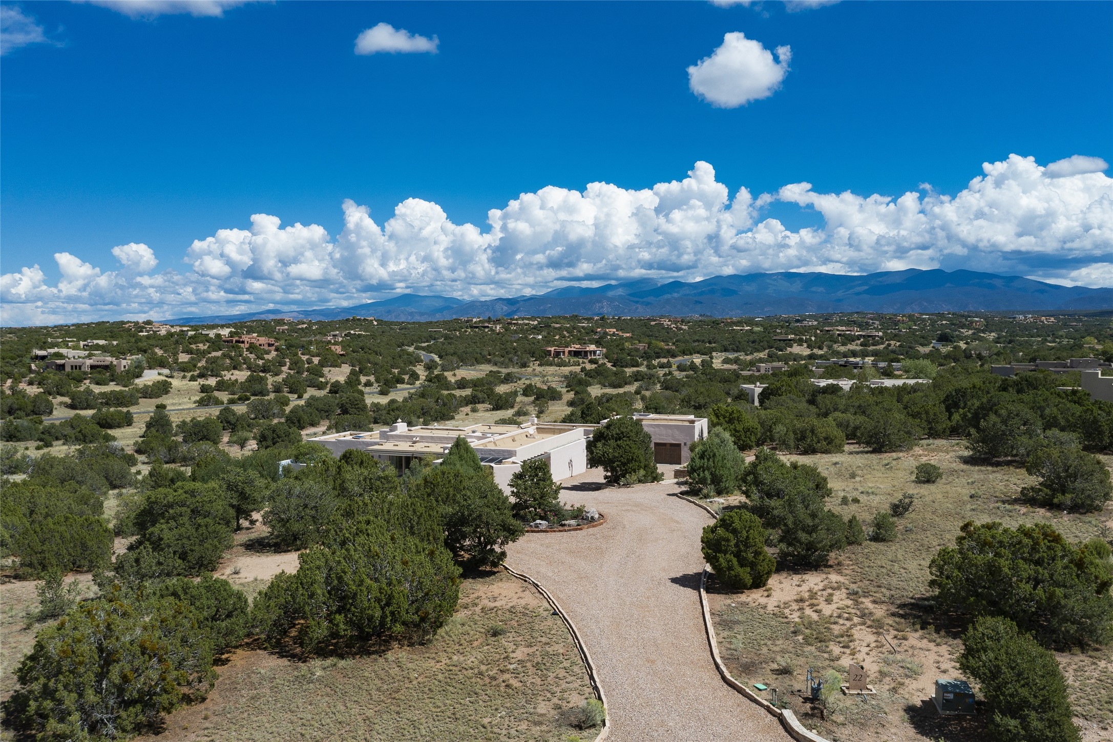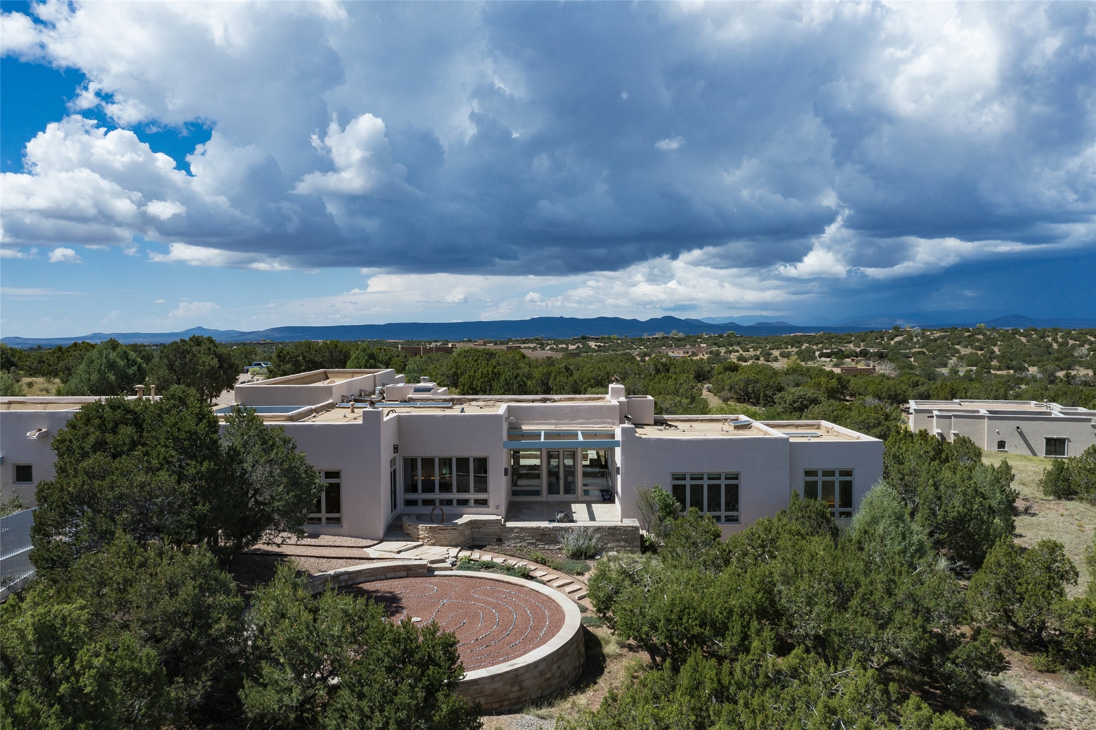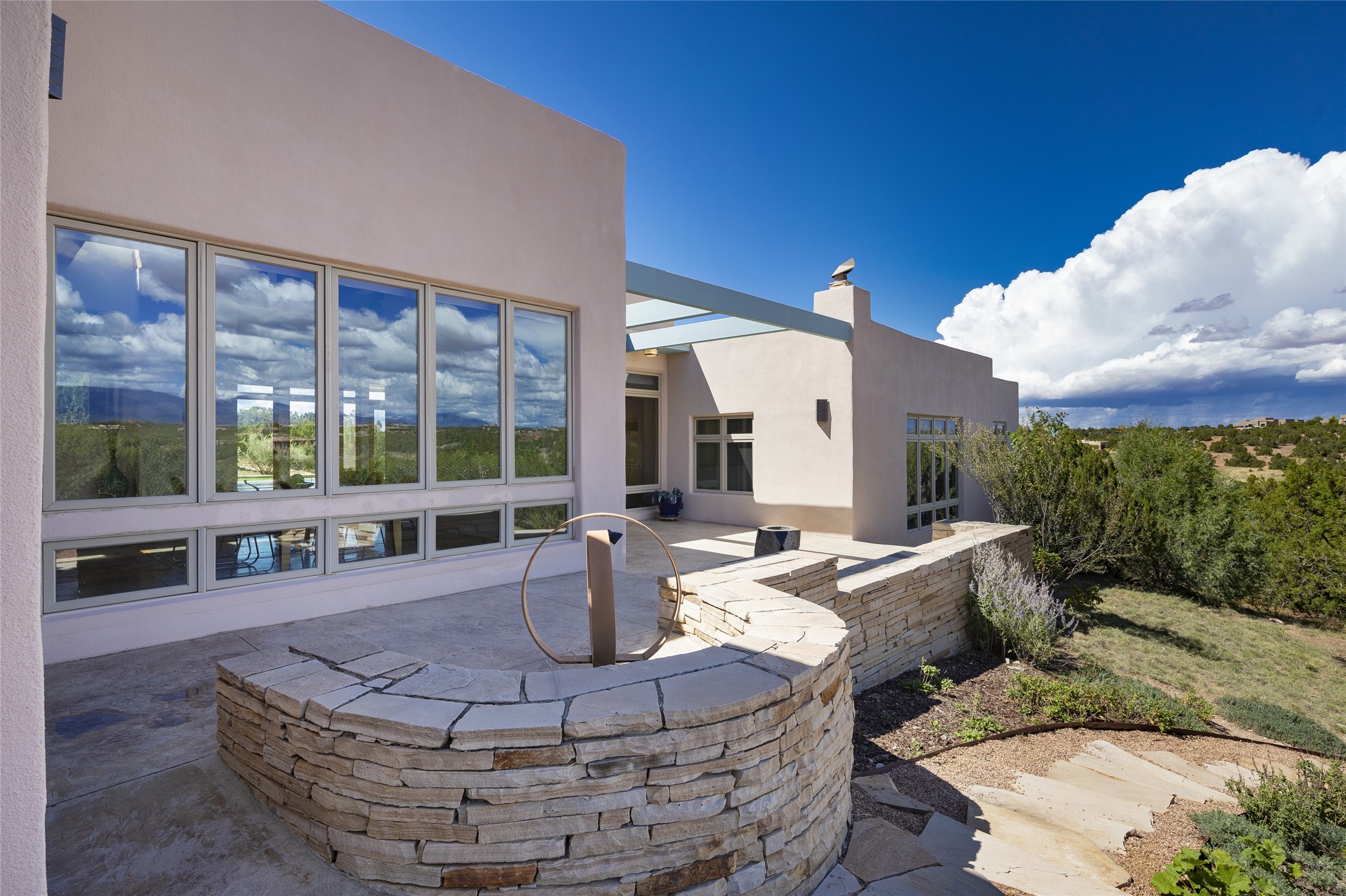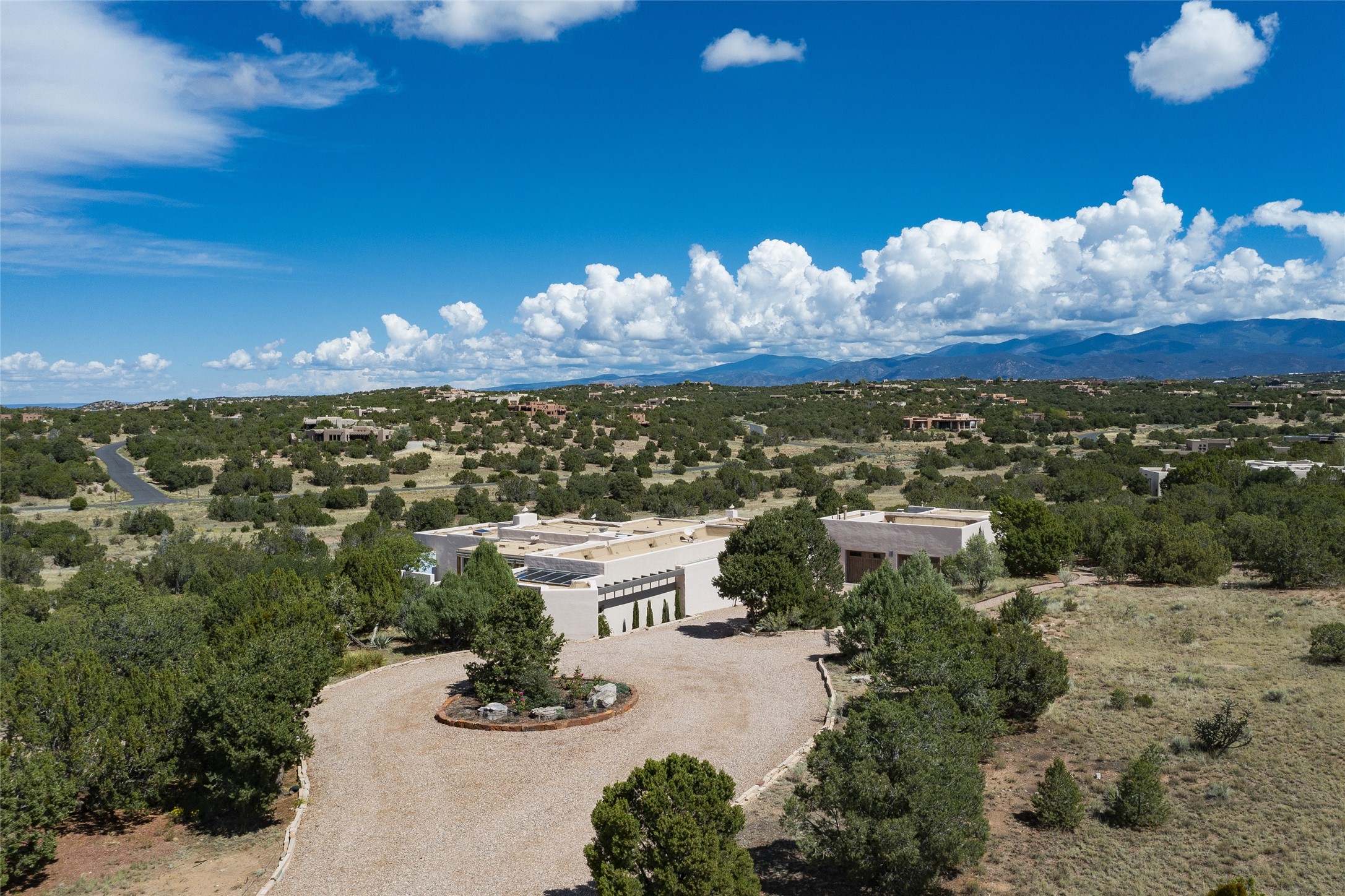 Experience the ultimate Santa Fe lifestyle with this Tour de Force contemporary house and guest house with unparalleled Sangre De Cristo Mountain views and a fabulous heated indoor lap pool. Located within close proximity to the Plaza and The Club at Las Campanas, and sited on a private, elevated 2+ acre cul de sac view lot, this sophisticated retreat, designed by renowned architect, Craig Hoopes, masterfully incorporates seamless indoor and outdoor living at its finest and perfectly blends contemporary design with Santa Fe warmth. The 3,127 square foot main house excites with a spacious open-concept great room complete with surround view windows which frame the Sangre De Cristo Mountains, fireplace, and access to dual outdoor portals and zen gardens. The industrial-style island kitchen is ideal for entertaining with stainless appliances, a casual dining area with a fireplace, and a large walk-in pantry, all of which enjoy expansive views and opens directly to the formal dining room and all main living areas. The spacious owner's suite delights with mountain views, fireplace, sitting area, a spa-like bath with its own private outdoor lounging area, dual walk-in closets, and a generous attached bonus room ideal as an office, media room, or art studio. Separate from the main living area is a private ensuite bedroom, a secondary bedroom or office, and access to the 1,183 square foot pool house complete with a resort-like indoor heated lap pool, sauna, shower, and exercise areas. Guests enjoy complete independence with the well-appointed detached 876 square foot one-bedroom guest house with a full kitchen, living room, fireplace, full bath, washer/dryer, and stunning views. Exceptional features include endless art walls, soft natural light, a flexible floor plan, excellent storage throughout, a backup generator, an updated roof, 2 newly replaced boilers, and updated interior plaster. This home represents a rare opportunity and truly, the ultimate Santa Fe lifestyle.