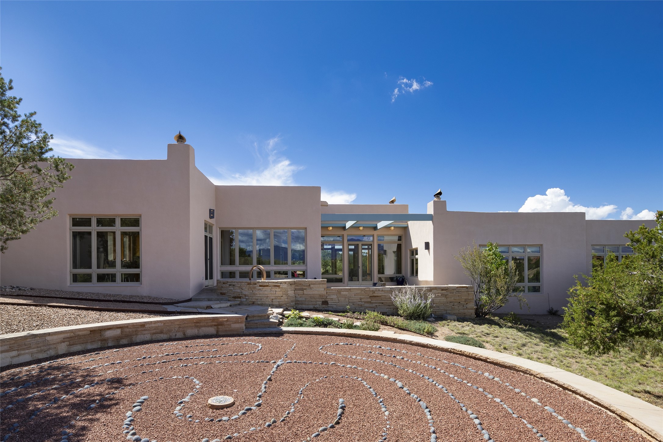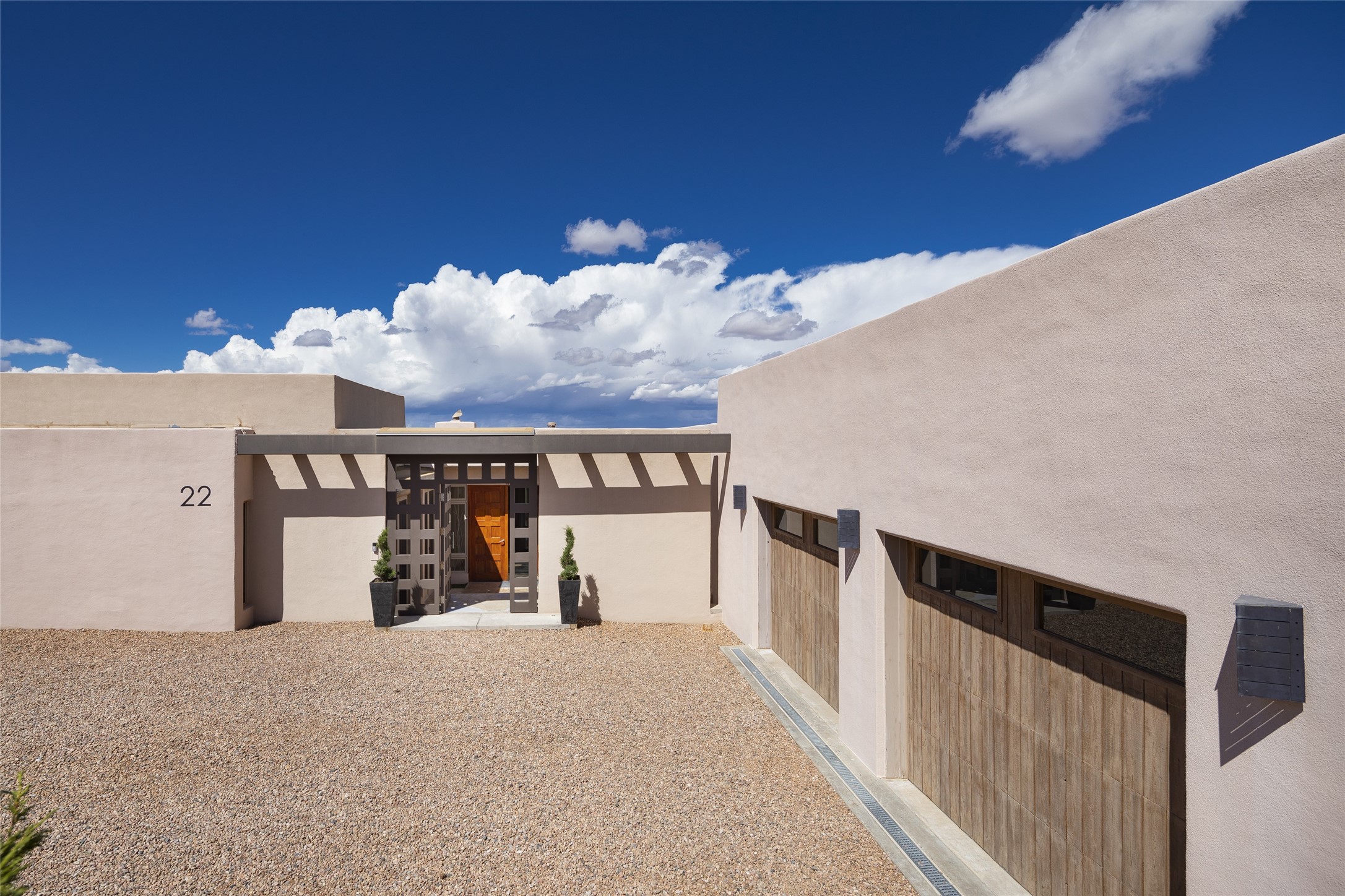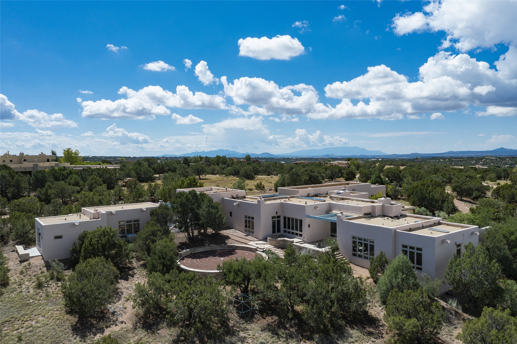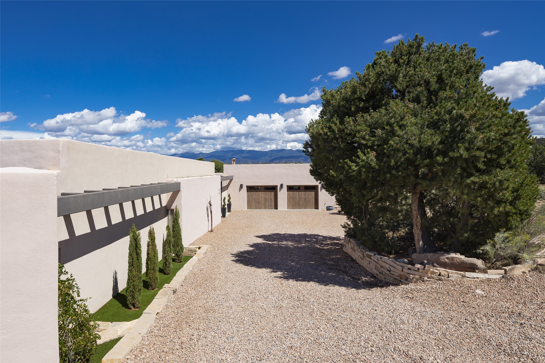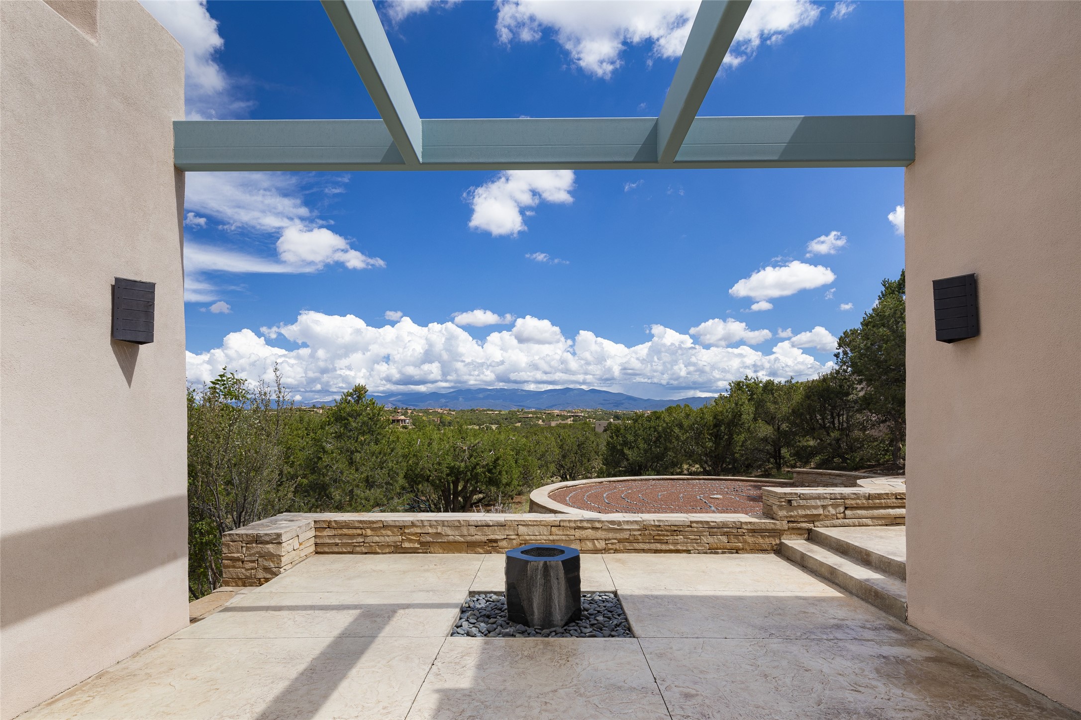Experience the ultimate Santa Fe lifestyle with this Tour de Force contemporary house and guest house with unparalleled Sangre De Cristo Mountain views and a fabulous heated indoor lap pool. Located within close proximity to the Plaza and The Club at Las Campanas, and sited on a private, elevated 2+ acre cul de sac view lot, this sophisticated retreat, designed by renowned architect, Craig Hoopes, masterfully incorporates seamless indoor and outdoor living at its finest and perfectly blends contemporary design with Santa Fe warmth. The 3,127 square foot main house excites with a spacious open-concept great room complete with surround view windows which frame the Sangre De Cristo Mountains, fireplace, and access to dual outdoor portals and zen gardens. The industrial-style island kitchen is ideal for entertaining with stainless appliances, a casual dining area with a fireplace, and a large walk-in pantry, all of which enjoy expansive views and opens directly to the formal dining room and all main living areas. The spacious owner's suite delights with mountain views, fireplace, sitting area, a spa-like bath with its own private outdoor lounging area, dual walk-in closets, and a generous attached bonus room ideal as an office, media room, or art studio. Separate from the main living area is a private ensuite bedroom, a secondary bedroom or office, and access to the 1,183 square foot pool house complete with a resort-like indoor heated lap pool, sauna, shower, and exercise areas. Guests enjoy complete independence with the well-appointed detached 876 square foot one-bedroom guest house with a full kitchen, living room, fireplace, full bath, washer/dryer, and stunning views. Exceptional features include endless art walls, soft natural light, a flexible floor plan, excellent storage throughout, a backup generator, an updated roof, 2 newly replaced boilers, and updated interior plaster. This home represents a rare opportunity and truly, the ultimate Santa Fe lifestyle.
