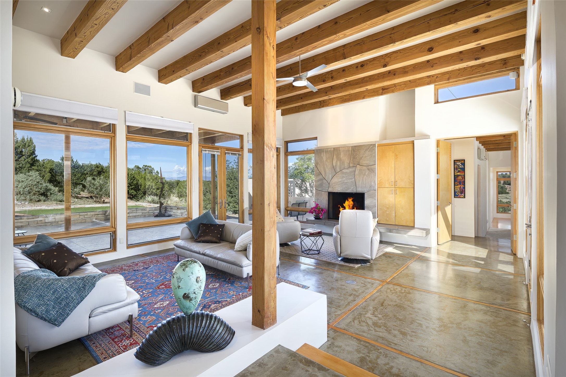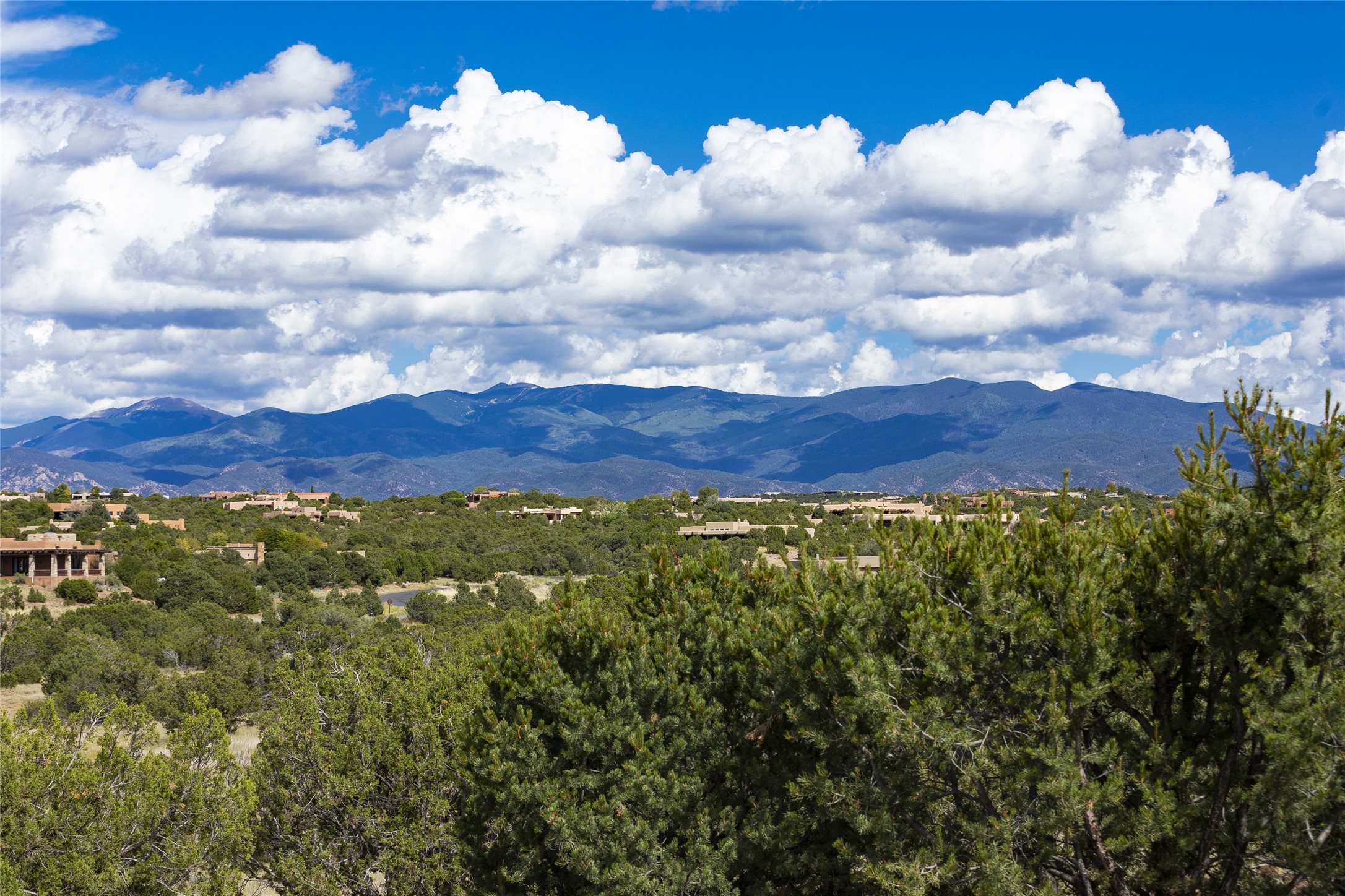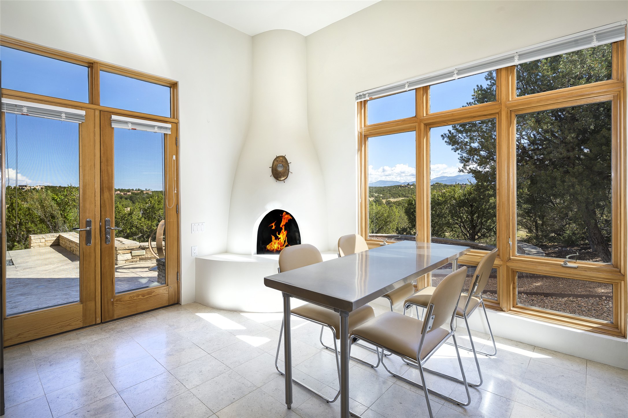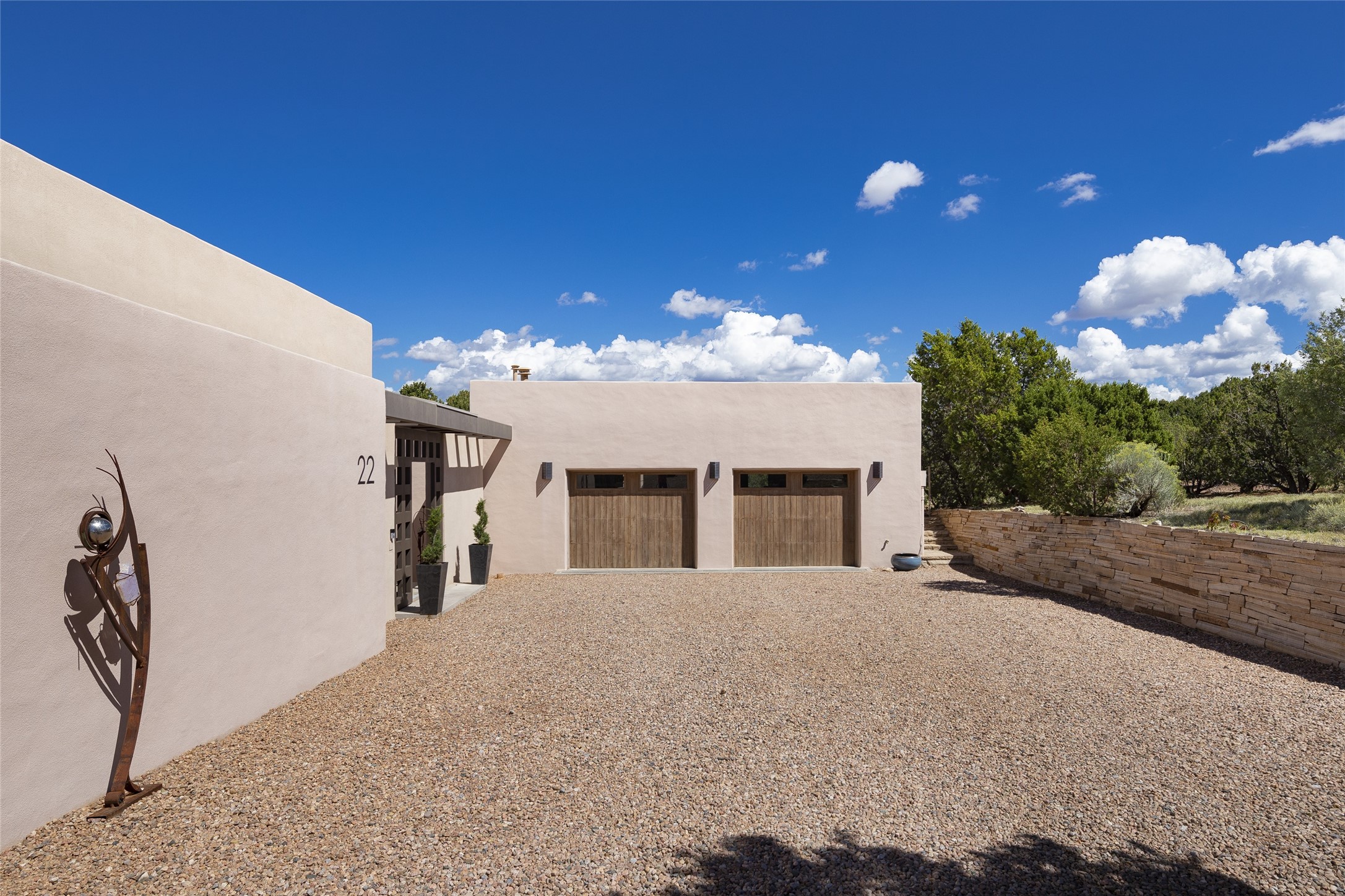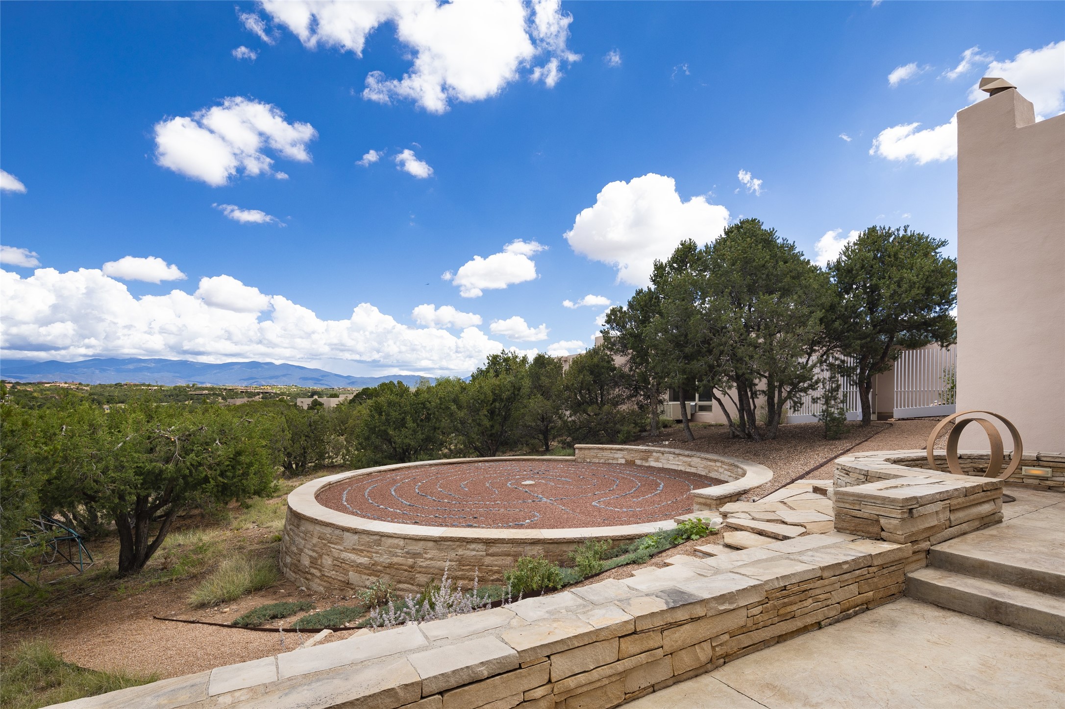 Experience the ultimate Santa Fe lifestyle with this Tour de Force contemporary house and guest house with unparalleled Sangre De Cristo Mountain views and a fabulous heated indoor lap pool. Located within close proximity to the Plaza and The Club at Las Campanas, and sited on a private, elevated 2+ acre cul de sac view lot, this sophisticated retreat, designed by renowned architect, Craig Hoopes, masterfully incorporates seamless indoor and outdoor living at its finest and perfectly blends contemporary design with Santa Fe warmth. The 3,127 square foot main house excites with a spacious open-concept great room complete with surround view windows which frame the Sangre De Cristo Mountains, fireplace, and access to dual outdoor portals and zen gardens. The industrial-style island kitchen is ideal for entertaining with stainless appliances, a casual dining area with a fireplace, and a large walk-in pantry, all of which enjoy expansive views and opens directly to the formal dining room and all main living areas. The spacious owner's suite delights with mountain views, fireplace, sitting area, a spa-like bath with its own private outdoor lounging area, dual walk-in closets, and a generous attached bonus room ideal as an office, media room, or art studio. Separate from the main living area is a private ensuite bedroom, a secondary bedroom or office, and access to the 1,183 square foot pool house complete with a resort-like indoor heated lap pool, sauna, shower, and exercise areas. Guests enjoy complete independence with the well-appointed detached 876 square foot one-bedroom guest house with a full kitchen, living room, fireplace, full bath, washer/dryer, and stunning views. Exceptional features include endless art walls, soft natural light, a flexible floor plan, excellent storage throughout, a backup generator, an updated roof, 2 newly replaced boilers, and updated interior plaster. This home represents a rare opportunity and truly, the ultimate Santa Fe lifestyle.