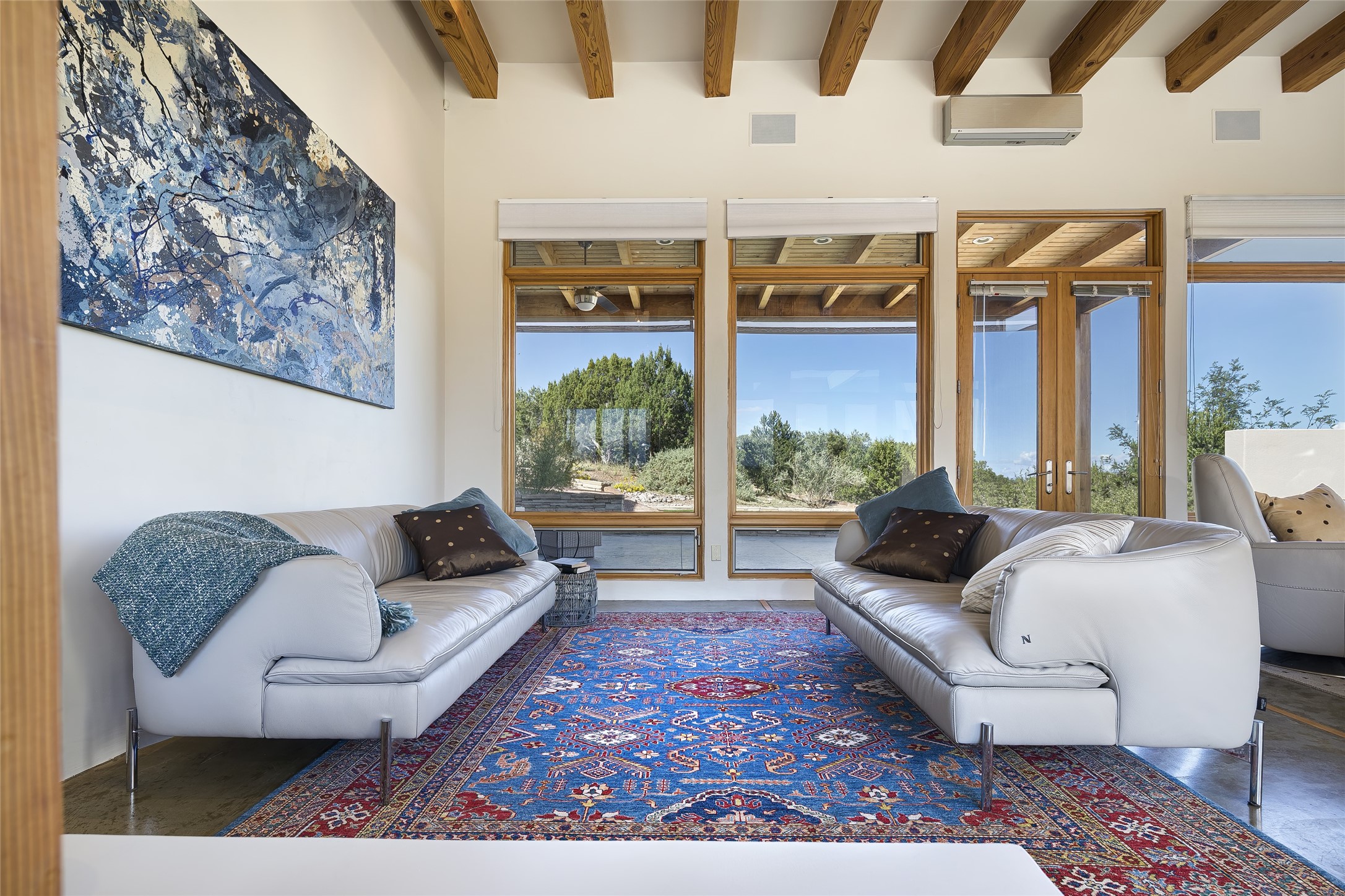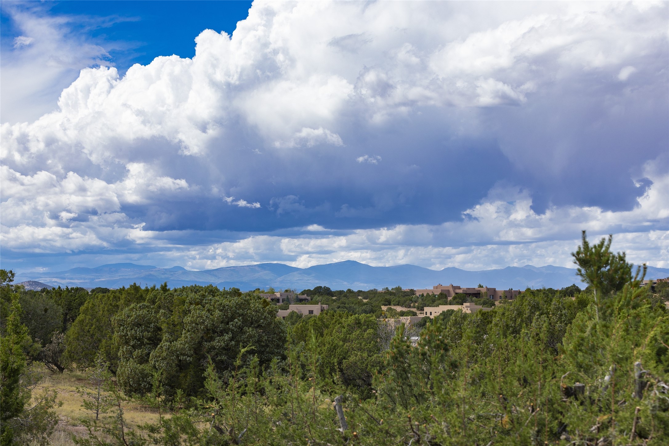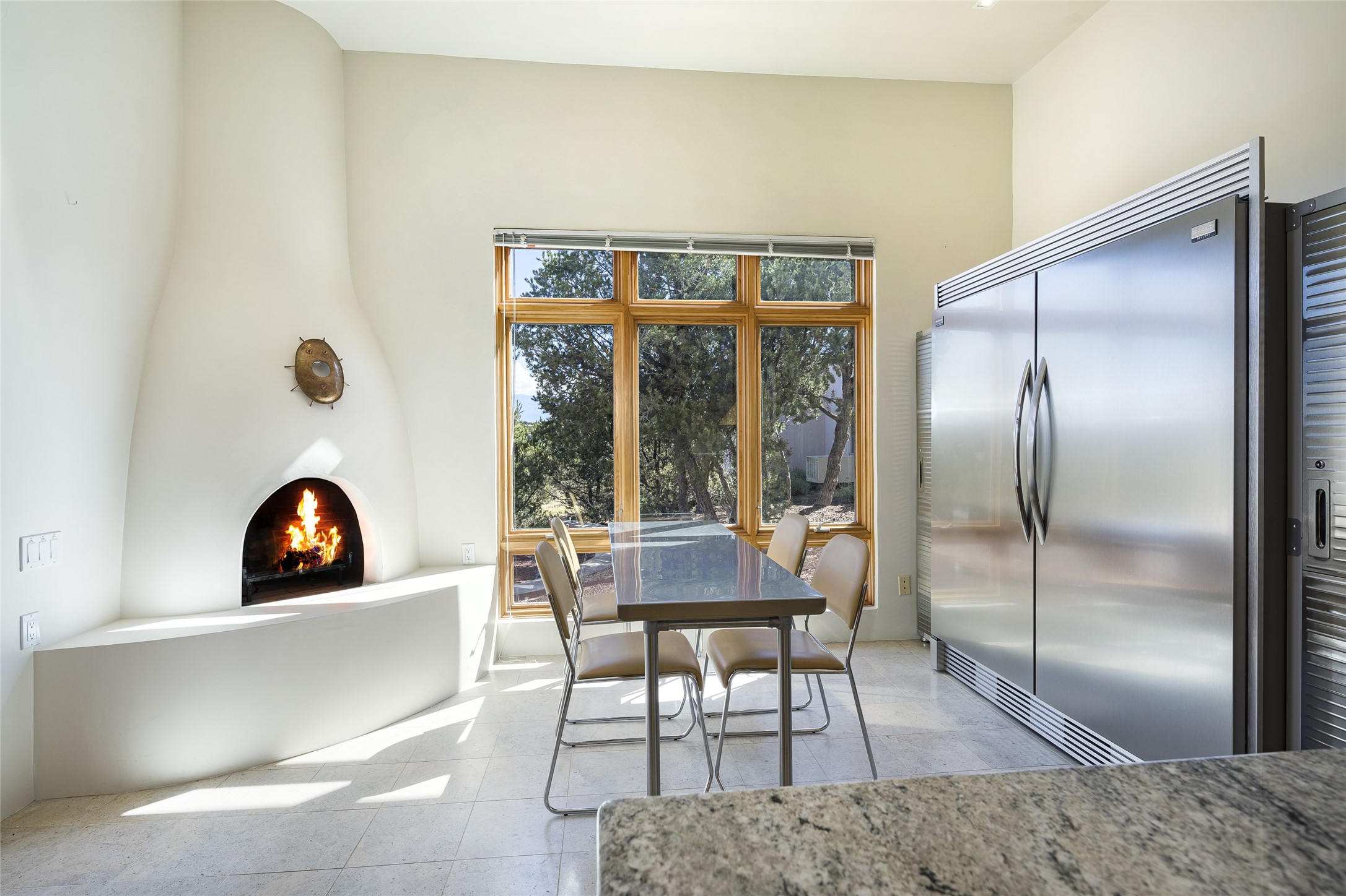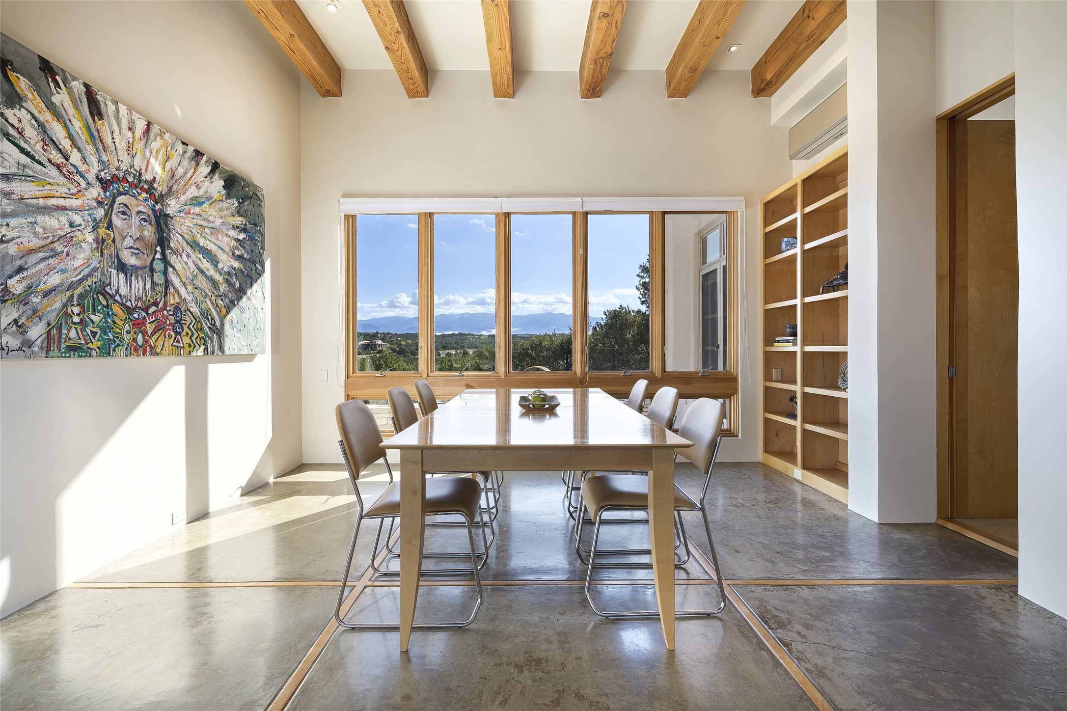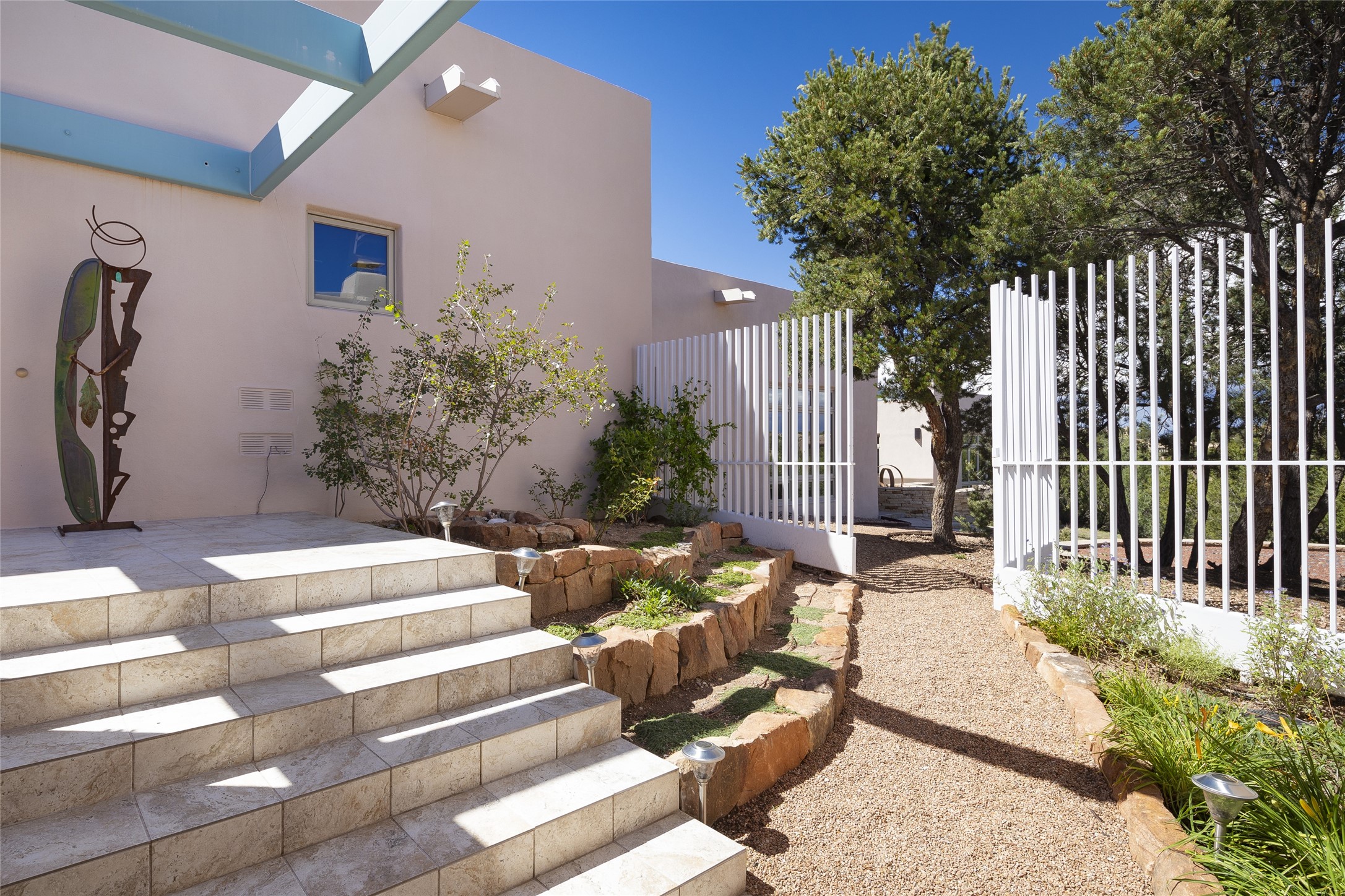 Experience the ultimate Santa Fe lifestyle with this Tour de Force contemporary house and guest house with unparalleled Sangre De Cristo Mountain views and a fabulous heated indoor lap pool. Located within close proximity to the Plaza and The Club at Las Campanas, and sited on a private, elevated 2+ acre cul de sac view lot, this sophisticated retreat, designed by renowned architect, Craig Hoopes, masterfully incorporates seamless indoor and outdoor living at its finest and perfectly blends contemporary design with Santa Fe warmth. The 3,127 square foot main house excites with a spacious open-concept great room complete with surround view windows which frame the Sangre De Cristo Mountains, fireplace, and access to dual outdoor portals and zen gardens. The industrial-style island kitchen is ideal for entertaining with stainless appliances, a casual dining area with a fireplace, and a large walk-in pantry, all of which enjoy expansive views and opens directly to the formal dining room and all main living areas. The spacious owner's suite delights with mountain views, fireplace, sitting area, a spa-like bath with its own private outdoor lounging area, dual walk-in closets, and a generous attached bonus room ideal as an office, media room, or art studio. Separate from the main living area is a private ensuite bedroom, a secondary bedroom or office, and access to the 1,183 square foot pool house complete with a resort-like indoor heated lap pool, sauna, shower, and exercise areas. Guests enjoy complete independence with the well-appointed detached 876 square foot one-bedroom guest house with a full kitchen, living room, fireplace, full bath, washer/dryer, and stunning views. Exceptional features include endless art walls, soft natural light, a flexible floor plan, excellent storage throughout, a backup generator, an updated roof, 2 newly replaced boilers, and updated interior plaster. This home represents a rare opportunity and truly, the ultimate Santa Fe lifestyle.