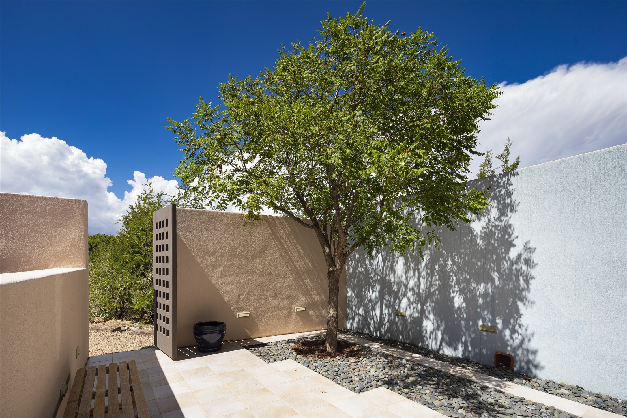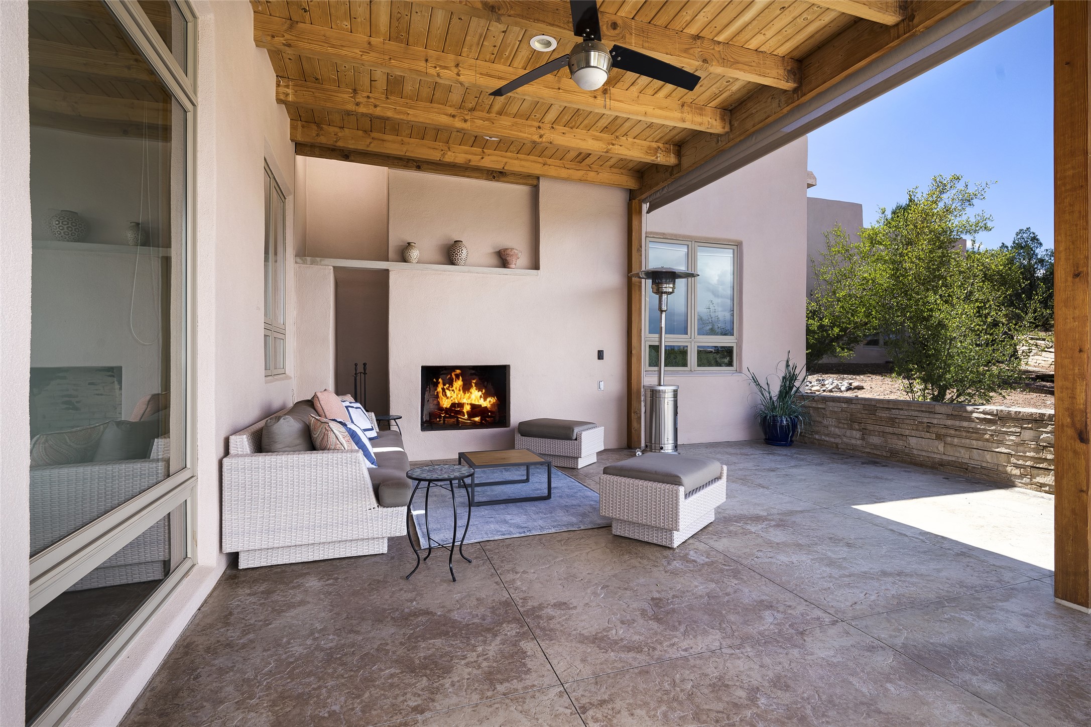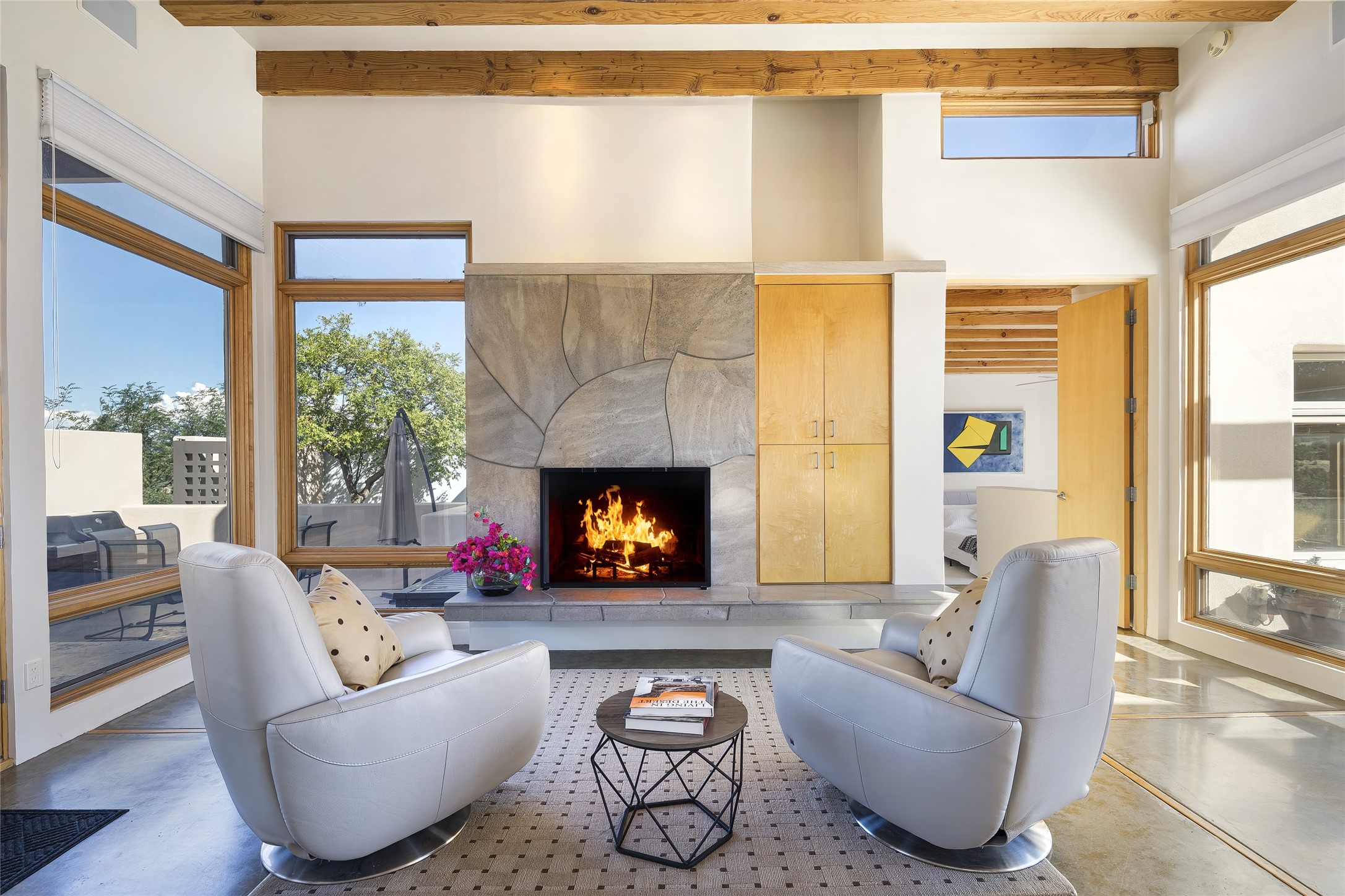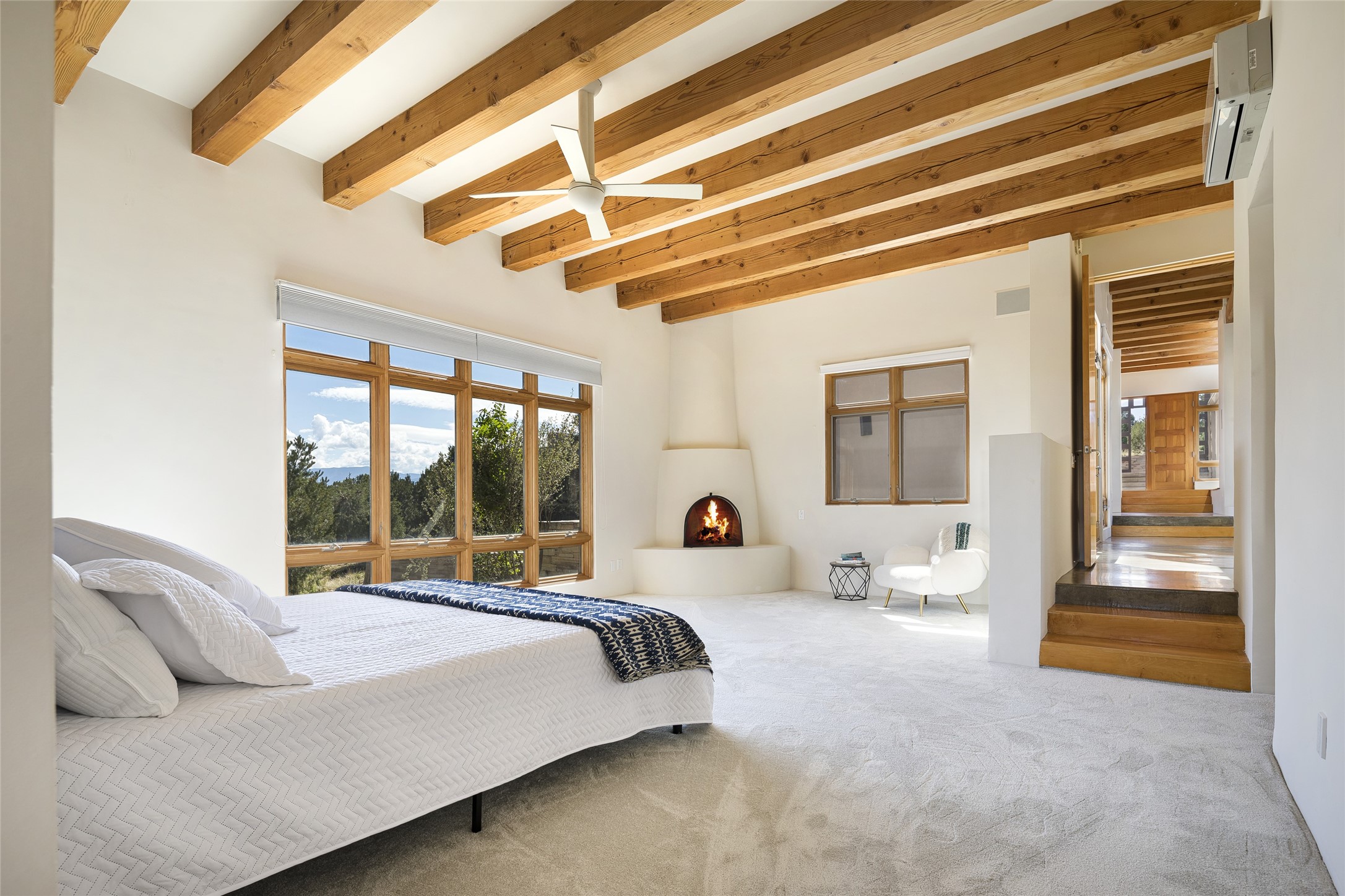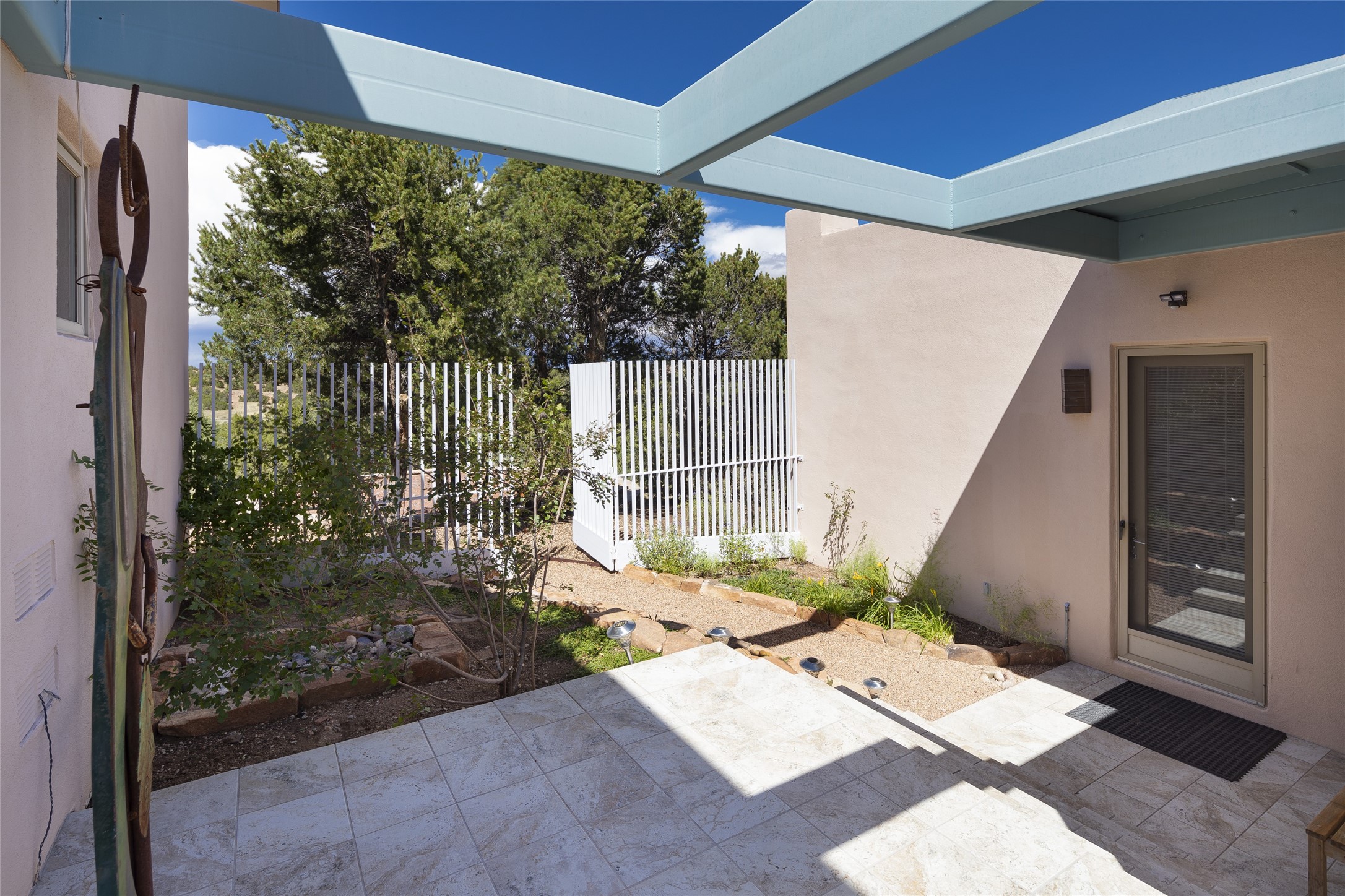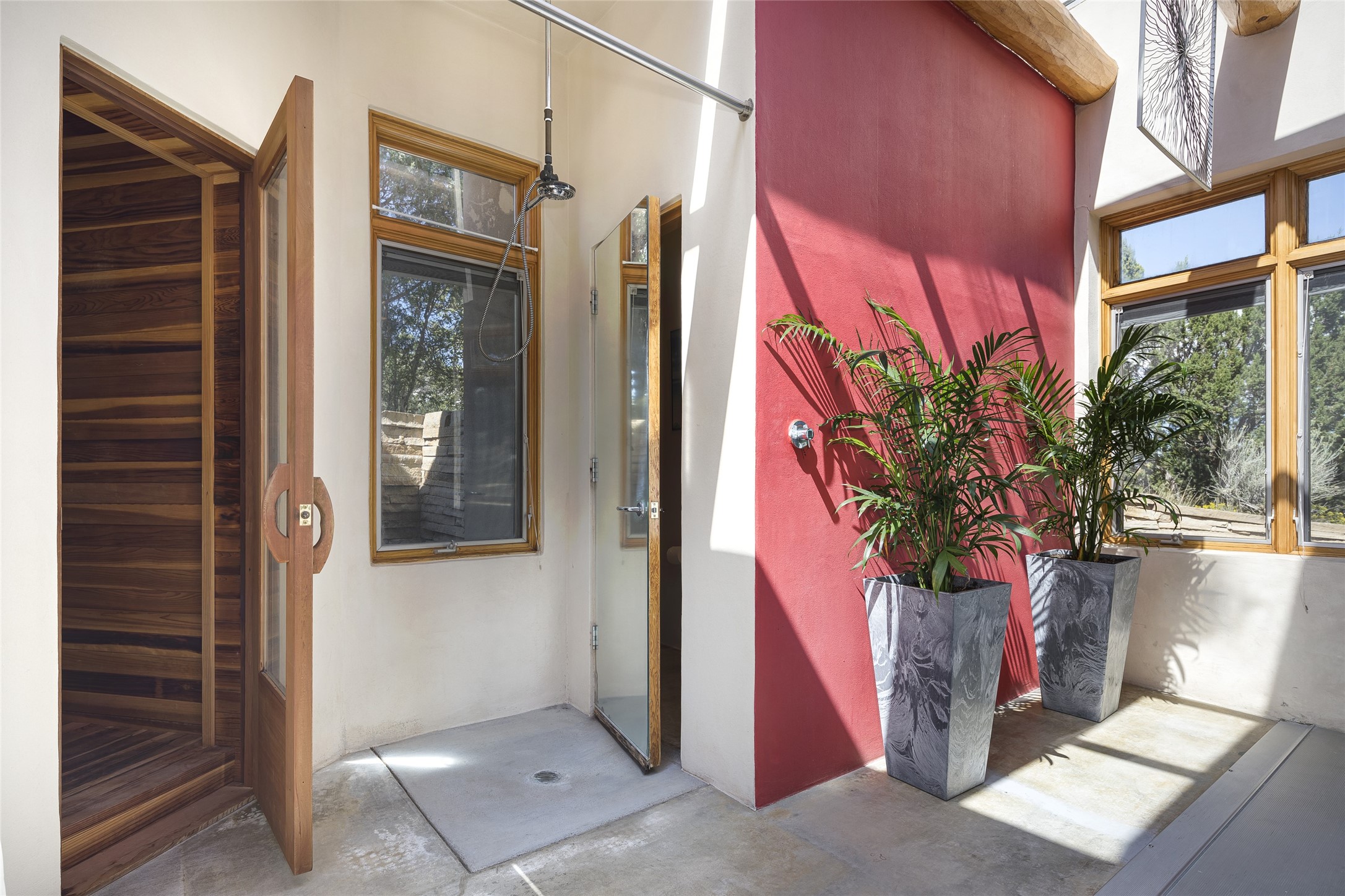 Experience the ultimate Santa Fe lifestyle with this Tour de Force contemporary house and guest house with unparalleled Sangre De Cristo Mountain views and a fabulous heated indoor lap pool. Located within close proximity to the Plaza and The Club at Las Campanas, and sited on a private, elevated 2+ acre cul de sac view lot, this sophisticated retreat, designed by renowned architect, Craig Hoopes, masterfully incorporates seamless indoor and outdoor living at its finest and perfectly blends contemporary design with Santa Fe warmth. The 3,127 square foot main house excites with a spacious open-concept great room complete with surround view windows which frame the Sangre De Cristo Mountains, fireplace, and access to dual outdoor portals and zen gardens. The industrial-style island kitchen is ideal for entertaining with stainless appliances, a casual dining area with a fireplace, and a large walk-in pantry, all of which enjoy expansive views and opens directly to the formal dining room and all main living areas. The spacious owner's suite delights with mountain views, fireplace, sitting area, a spa-like bath with its own private outdoor lounging area, dual walk-in closets, and a generous attached bonus room ideal as an office, media room, or art studio. Separate from the main living area is a private ensuite bedroom, a secondary bedroom or office, and access to the 1,183 square foot pool house complete with a resort-like indoor heated lap pool, sauna, shower, and exercise areas. Guests enjoy complete independence with the well-appointed detached 876 square foot one-bedroom guest house with a full kitchen, living room, fireplace, full bath, washer/dryer, and stunning views. Exceptional features include endless art walls, soft natural light, a flexible floor plan, excellent storage throughout, a backup generator, an updated roof, 2 newly replaced boilers, and updated interior plaster. This home represents a rare opportunity and truly, the ultimate Santa Fe lifestyle.