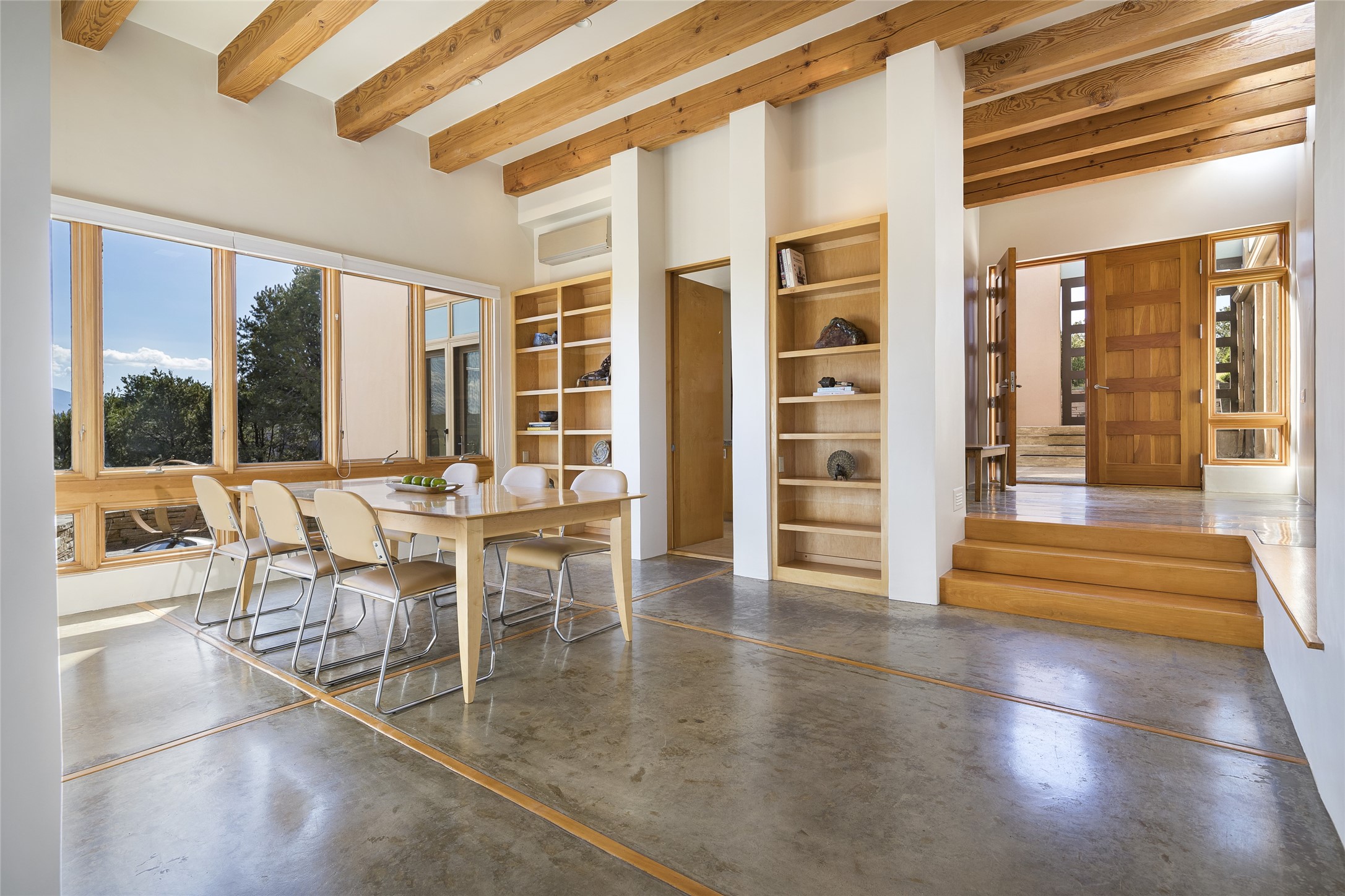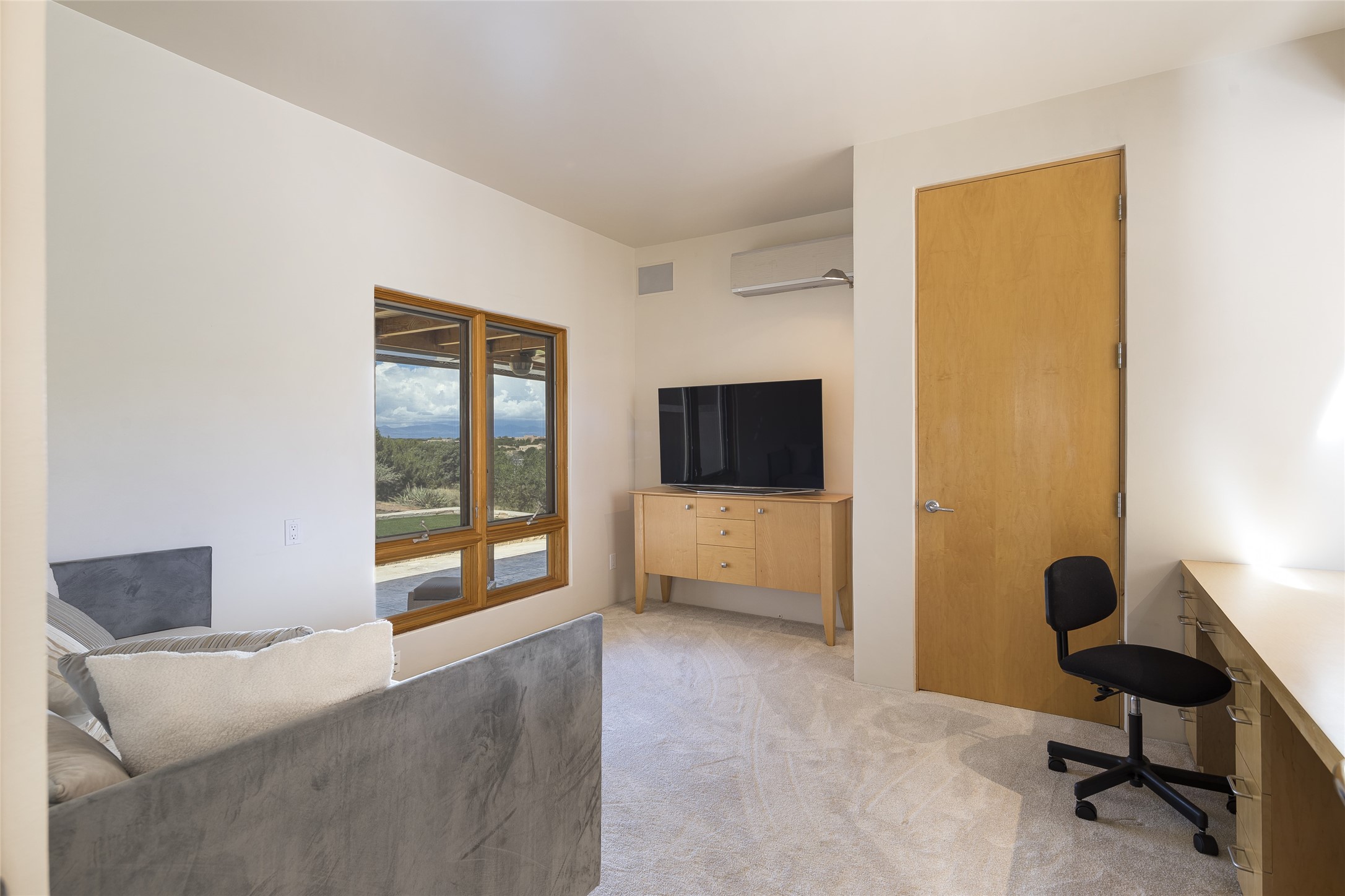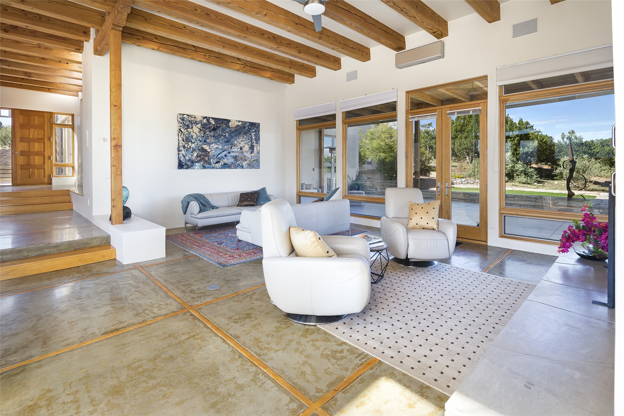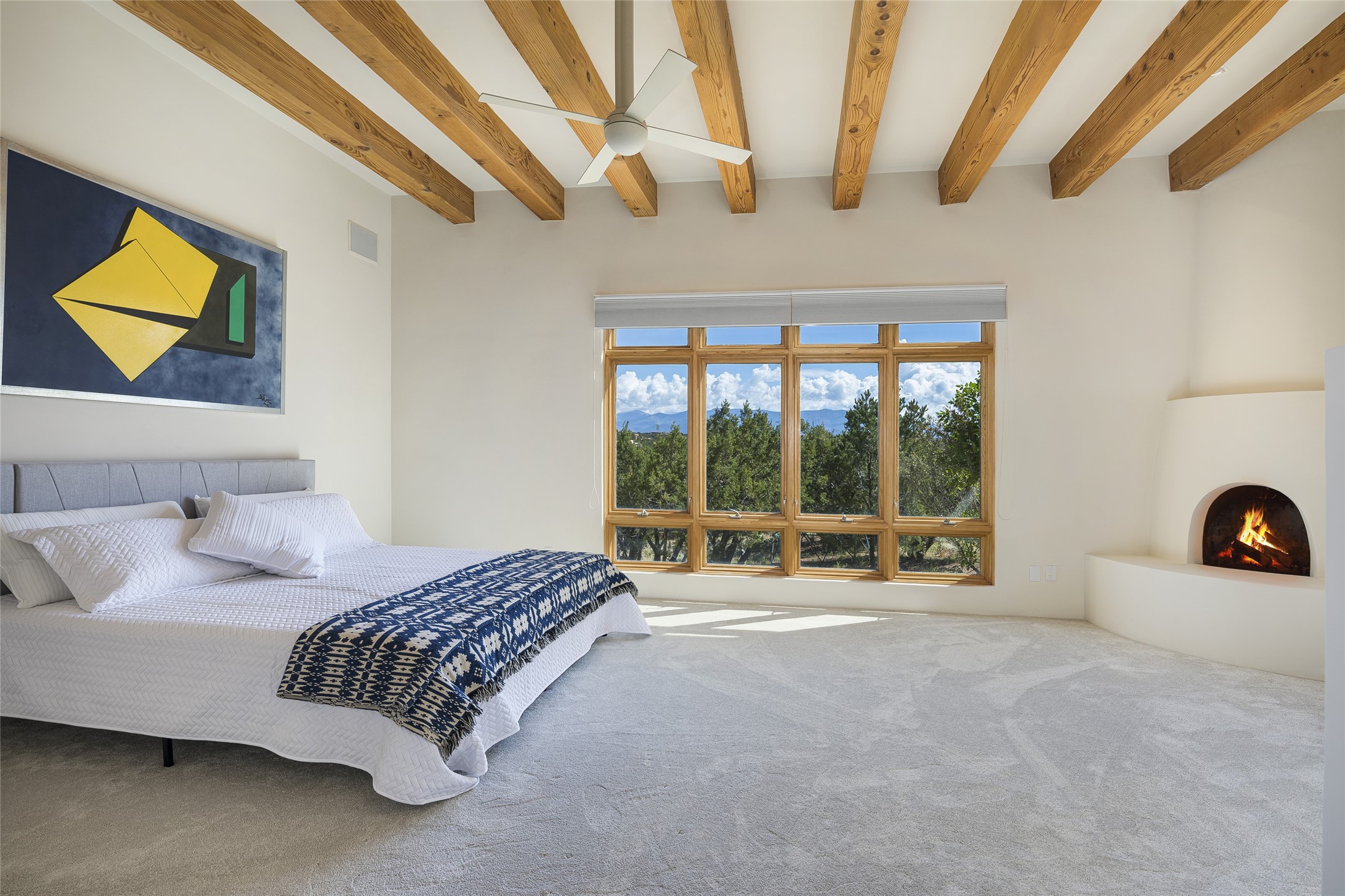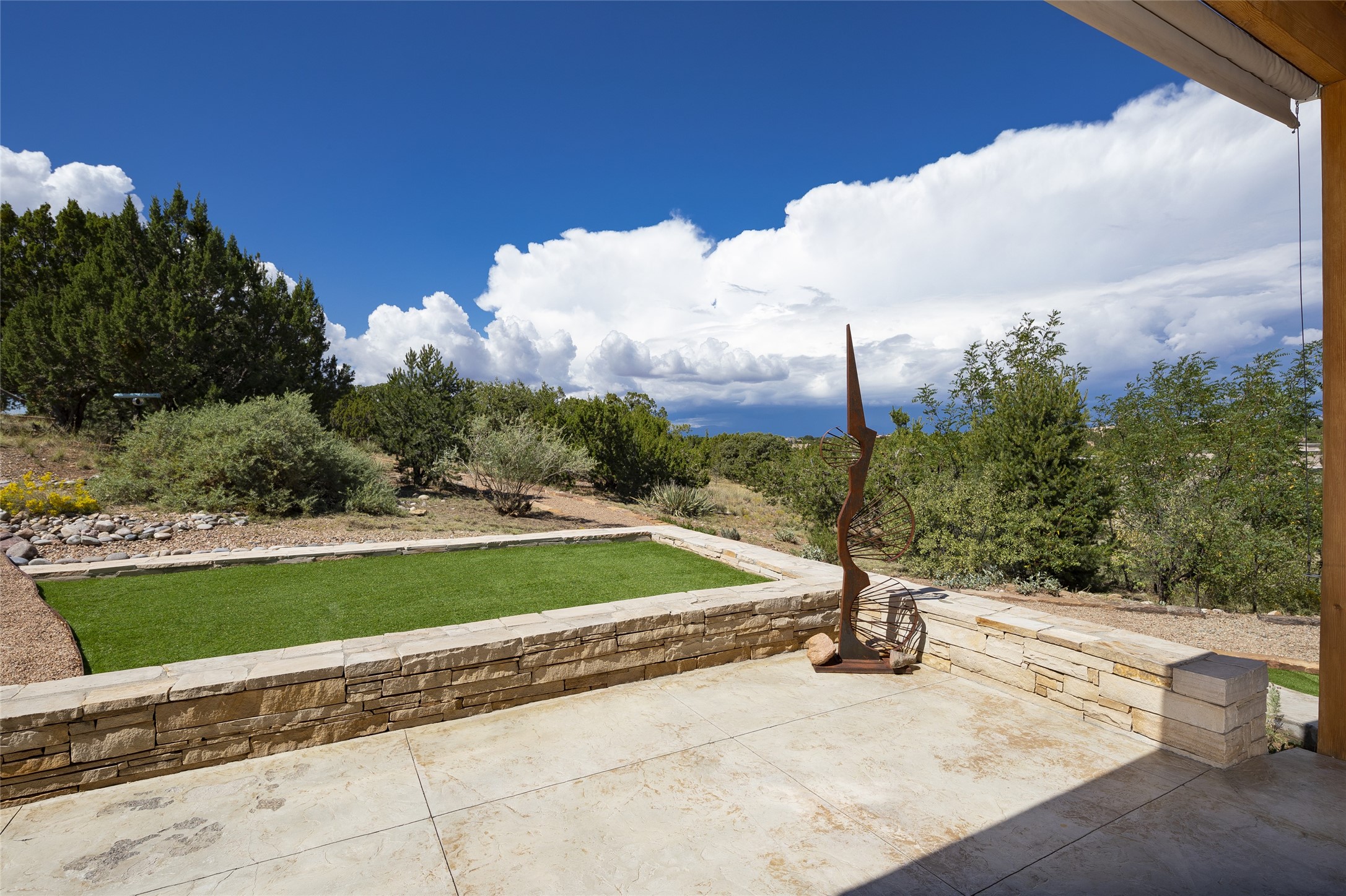 Experience the ultimate Santa Fe lifestyle with this Tour de Force contemporary house and guest house with unparalleled Sangre De Cristo Mountain views and a fabulous heated indoor lap pool. Located within close proximity to the Plaza and The Club at Las Campanas, and sited on a private, elevated 2+ acre cul de sac view lot, this sophisticated retreat, designed by renowned architect, Craig Hoopes, masterfully incorporates seamless indoor and outdoor living at its finest and perfectly blends contemporary design with Santa Fe warmth. The 3,127 square foot main house excites with a spacious open-concept great room complete with surround view windows which frame the Sangre De Cristo Mountains, fireplace, and access to dual outdoor portals and zen gardens. The industrial-style island kitchen is ideal for entertaining with stainless appliances, a casual dining area with a fireplace, and a large walk-in pantry, all of which enjoy expansive views and opens directly to the formal dining room and all main living areas. The spacious owner's suite delights with mountain views, fireplace, sitting area, a spa-like bath with its own private outdoor lounging area, dual walk-in closets, and a generous attached bonus room ideal as an office, media room, or art studio. Separate from the main living area is a private ensuite bedroom, a secondary bedroom or office, and access to the 1,183 square foot pool house complete with a resort-like indoor heated lap pool, sauna, shower, and exercise areas. Guests enjoy complete independence with the well-appointed detached 876 square foot one-bedroom guest house with a full kitchen, living room, fireplace, full bath, washer/dryer, and stunning views. Exceptional features include endless art walls, soft natural light, a flexible floor plan, excellent storage throughout, a backup generator, an updated roof, 2 newly replaced boilers, and updated interior plaster. This home represents a rare opportunity and truly, the ultimate Santa Fe lifestyle.