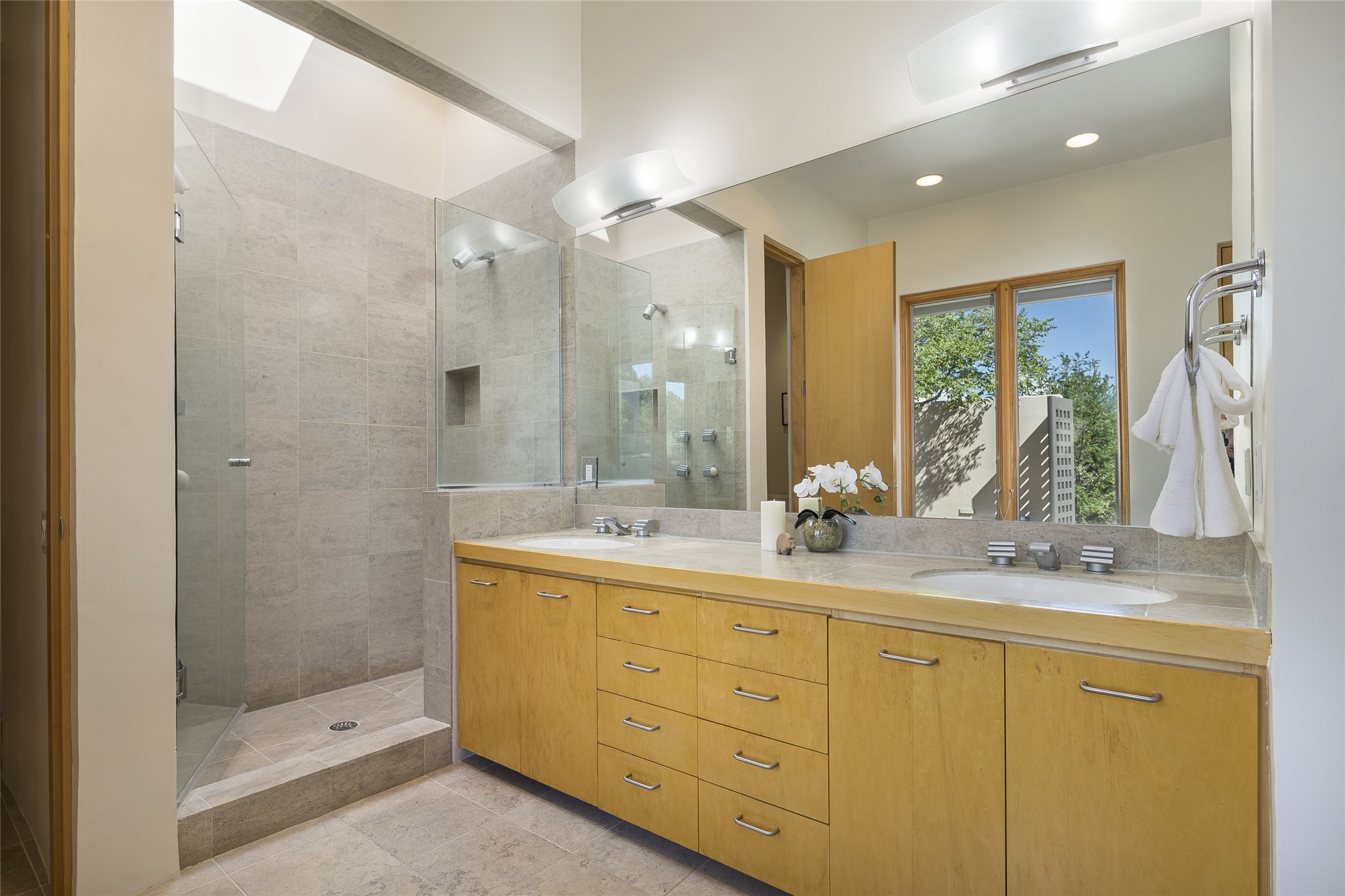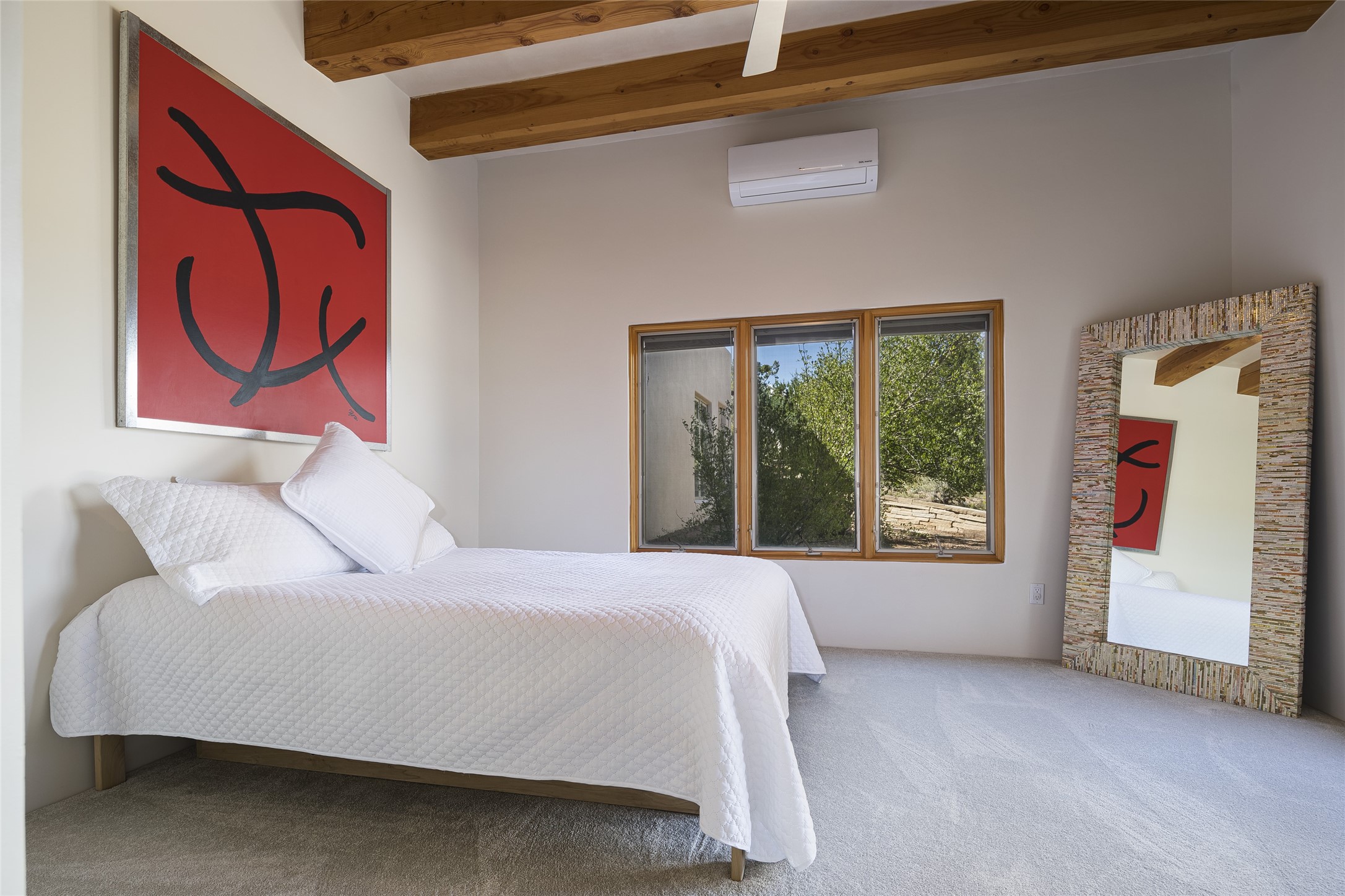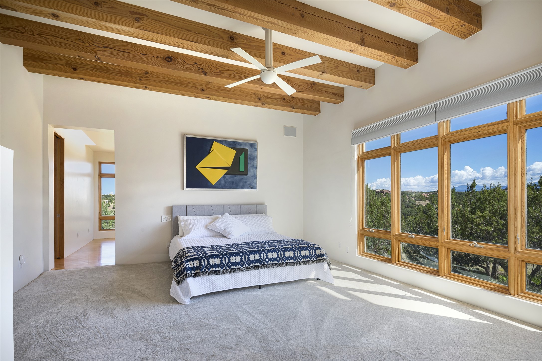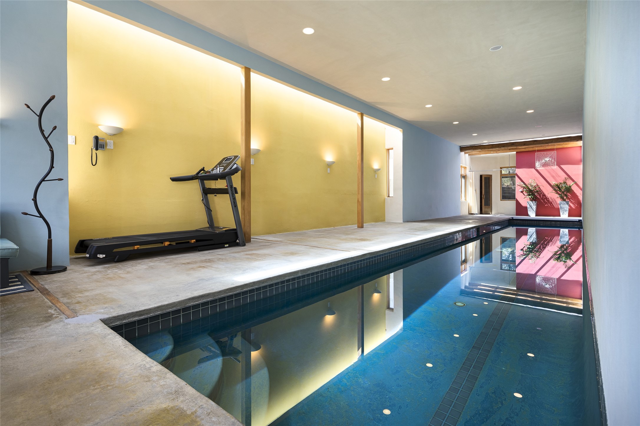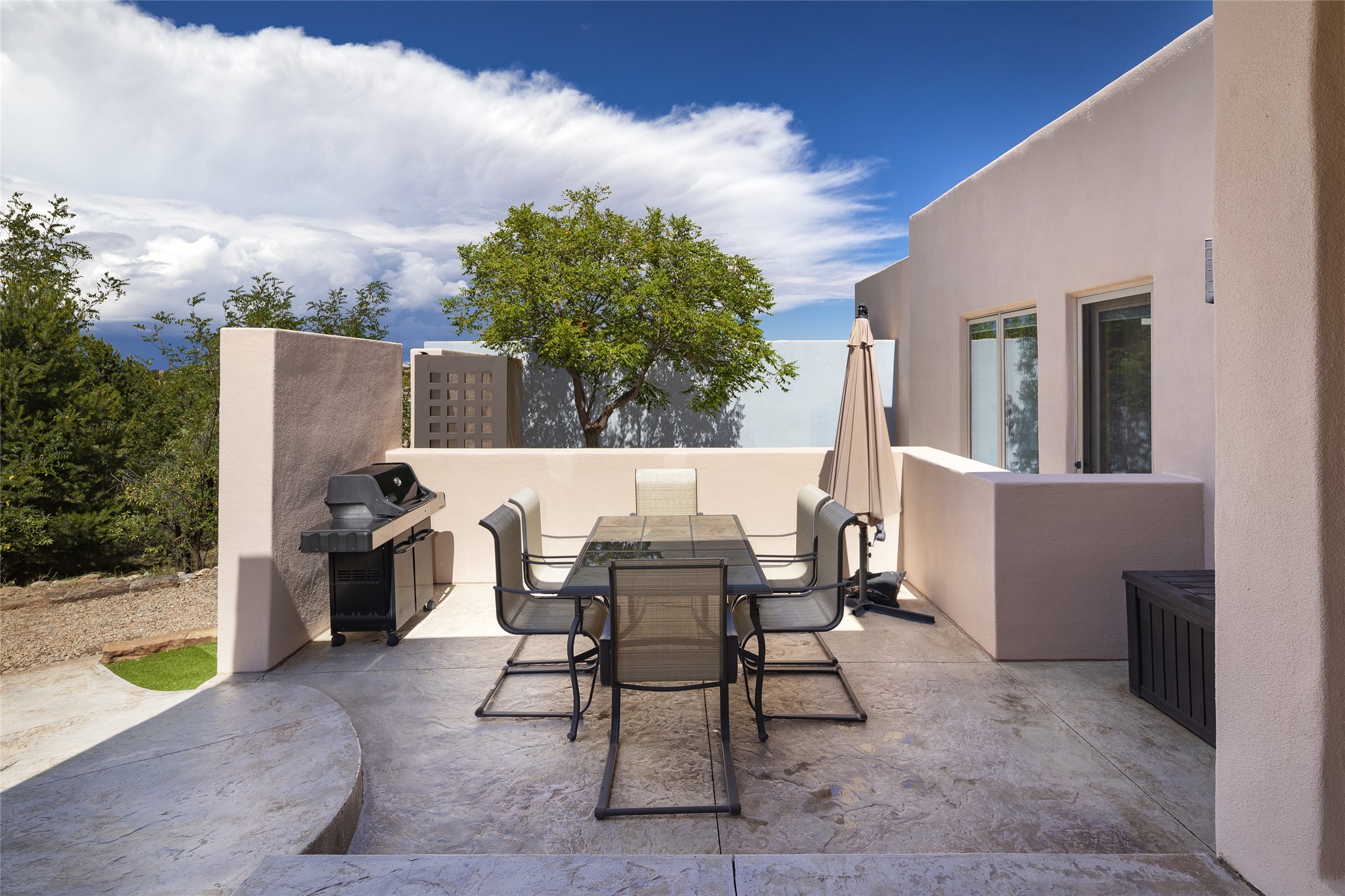 Experience the ultimate Santa Fe lifestyle with this Tour de Force contemporary house and guest house with unparalleled Sangre De Cristo Mountain views and a fabulous heated indoor lap pool. Located within close proximity to the Plaza and The Club at Las Campanas, and sited on a private, elevated 2+ acre cul de sac view lot, this sophisticated retreat, designed by renowned architect, Craig Hoopes, masterfully incorporates seamless indoor and outdoor living at its finest and perfectly blends contemporary design with Santa Fe warmth. The 3,127 square foot main house excites with a spacious open-concept great room complete with surround view windows which frame the Sangre De Cristo Mountains, fireplace, and access to dual outdoor portals and zen gardens. The industrial-style island kitchen is ideal for entertaining with stainless appliances, a casual dining area with a fireplace, and a large walk-in pantry, all of which enjoy expansive views and opens directly to the formal dining room and all main living areas. The spacious owner's suite delights with mountain views, fireplace, sitting area, a spa-like bath with its own private outdoor lounging area, dual walk-in closets, and a generous attached bonus room ideal as an office, media room, or art studio. Separate from the main living area is a private ensuite bedroom, a secondary bedroom or office, and access to the 1,183 square foot pool house complete with a resort-like indoor heated lap pool, sauna, shower, and exercise areas. Guests enjoy complete independence with the well-appointed detached 876 square foot one-bedroom guest house with a full kitchen, living room, fireplace, full bath, washer/dryer, and stunning views. Exceptional features include endless art walls, soft natural light, a flexible floor plan, excellent storage throughout, a backup generator, an updated roof, 2 newly replaced boilers, and updated interior plaster. This home represents a rare opportunity and truly, the ultimate Santa Fe lifestyle.