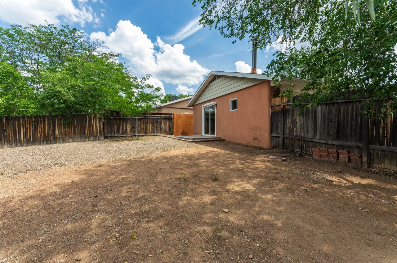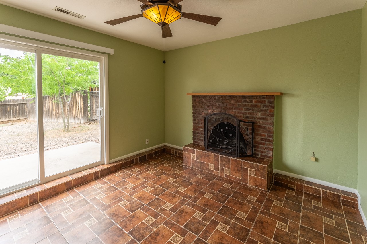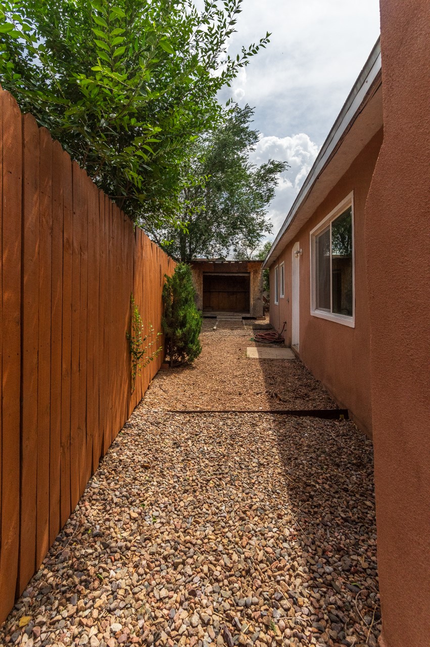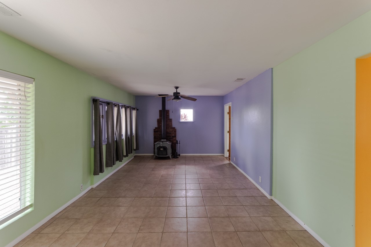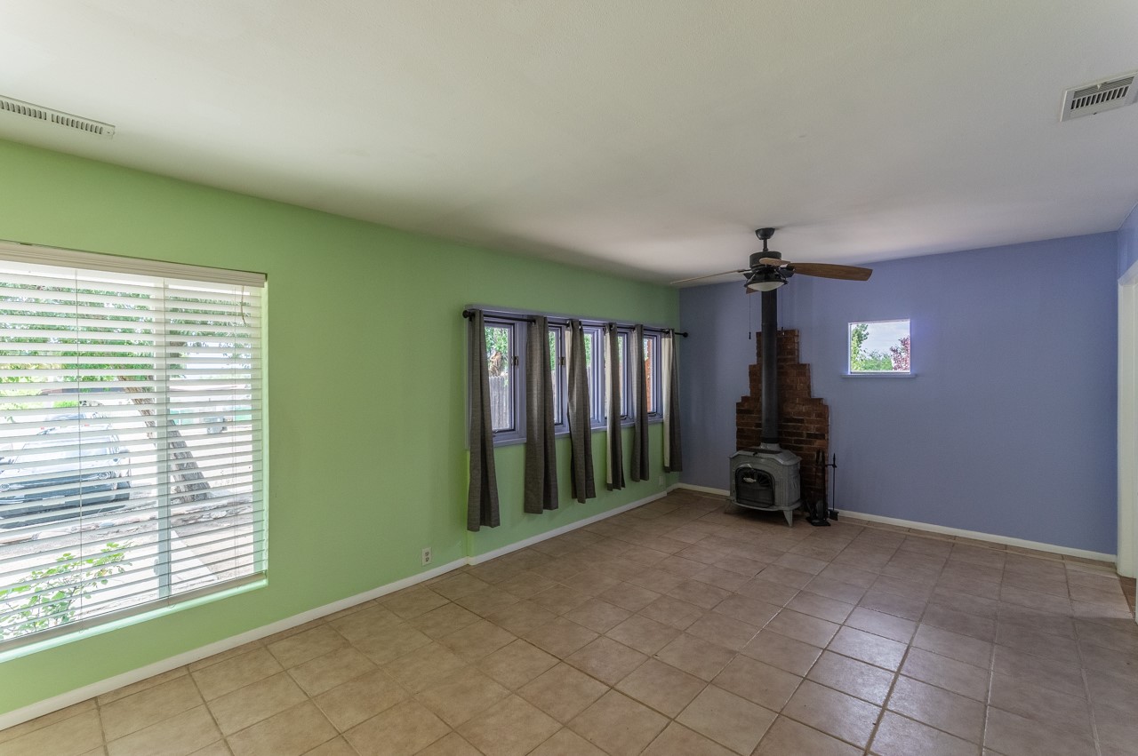 This home is charming with a large living room with a wood-burning stove and entry into a den with a fireplace and sliding glass door to the large fenced yard with double gate access from the street. The kitchen has an eating area and a back door to the west side of the backyard complete with a shed, that wraps around to another smaller side yard. The primary bedroom has an en suite half bath. Tile floor throughout the home. The original driveway has room for two-car parking. Large trees shade the front yard with the homesitting on a corner lot.