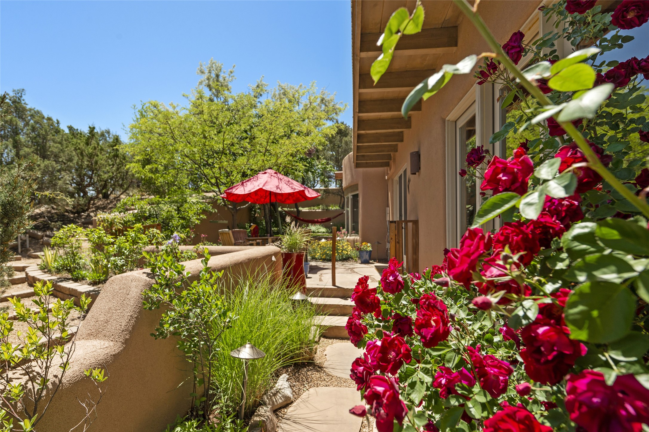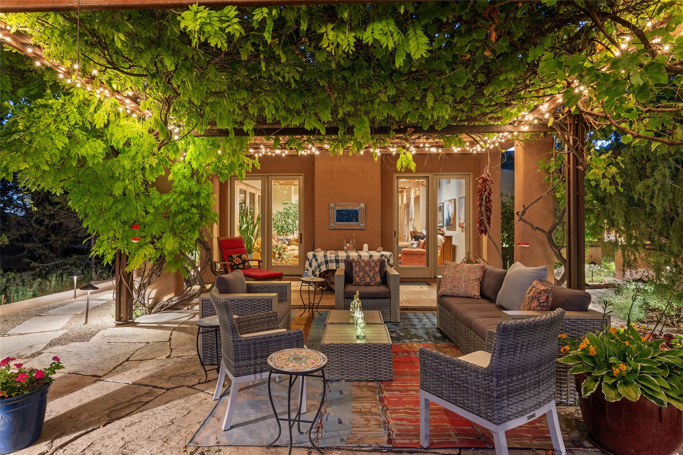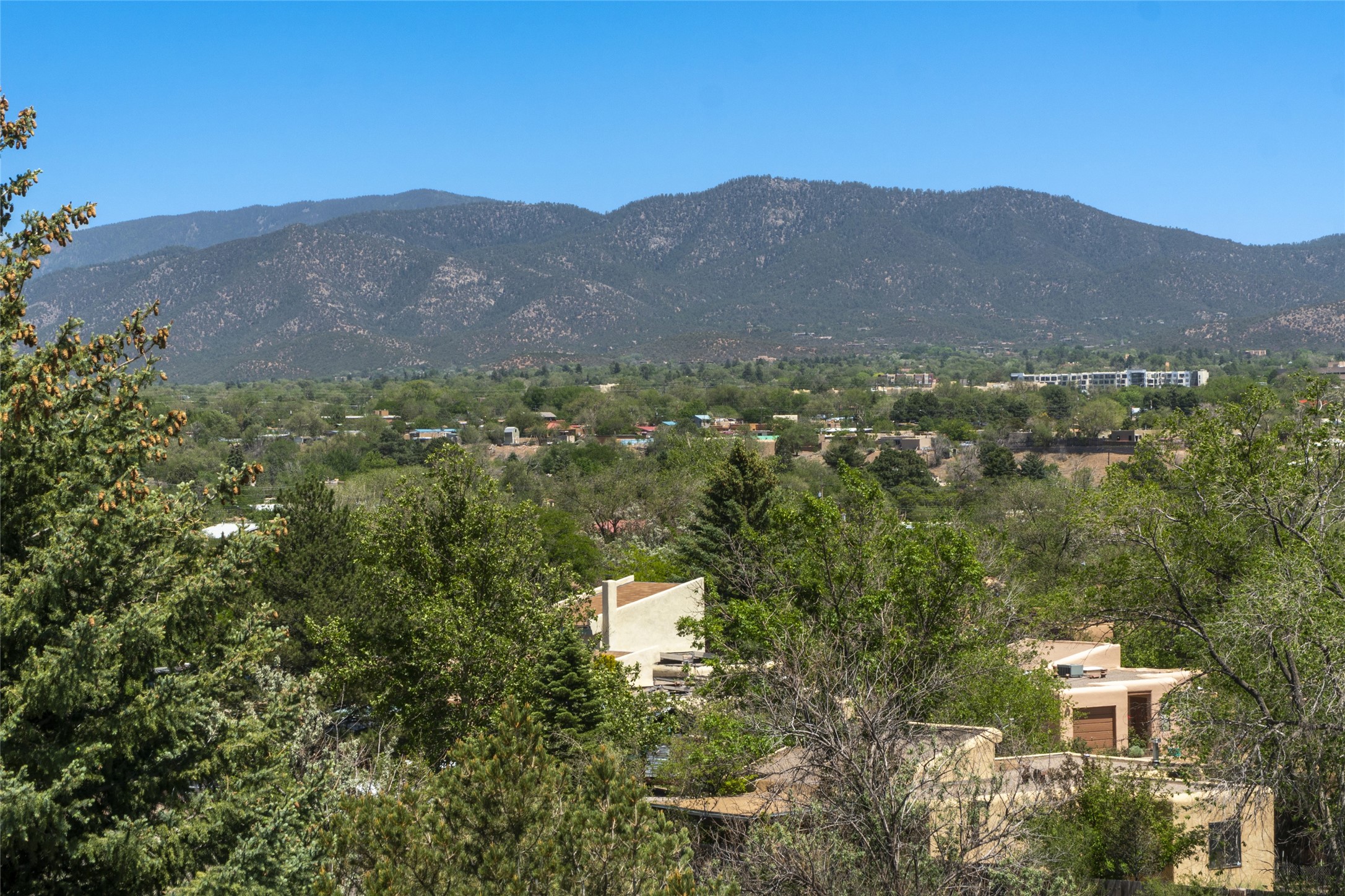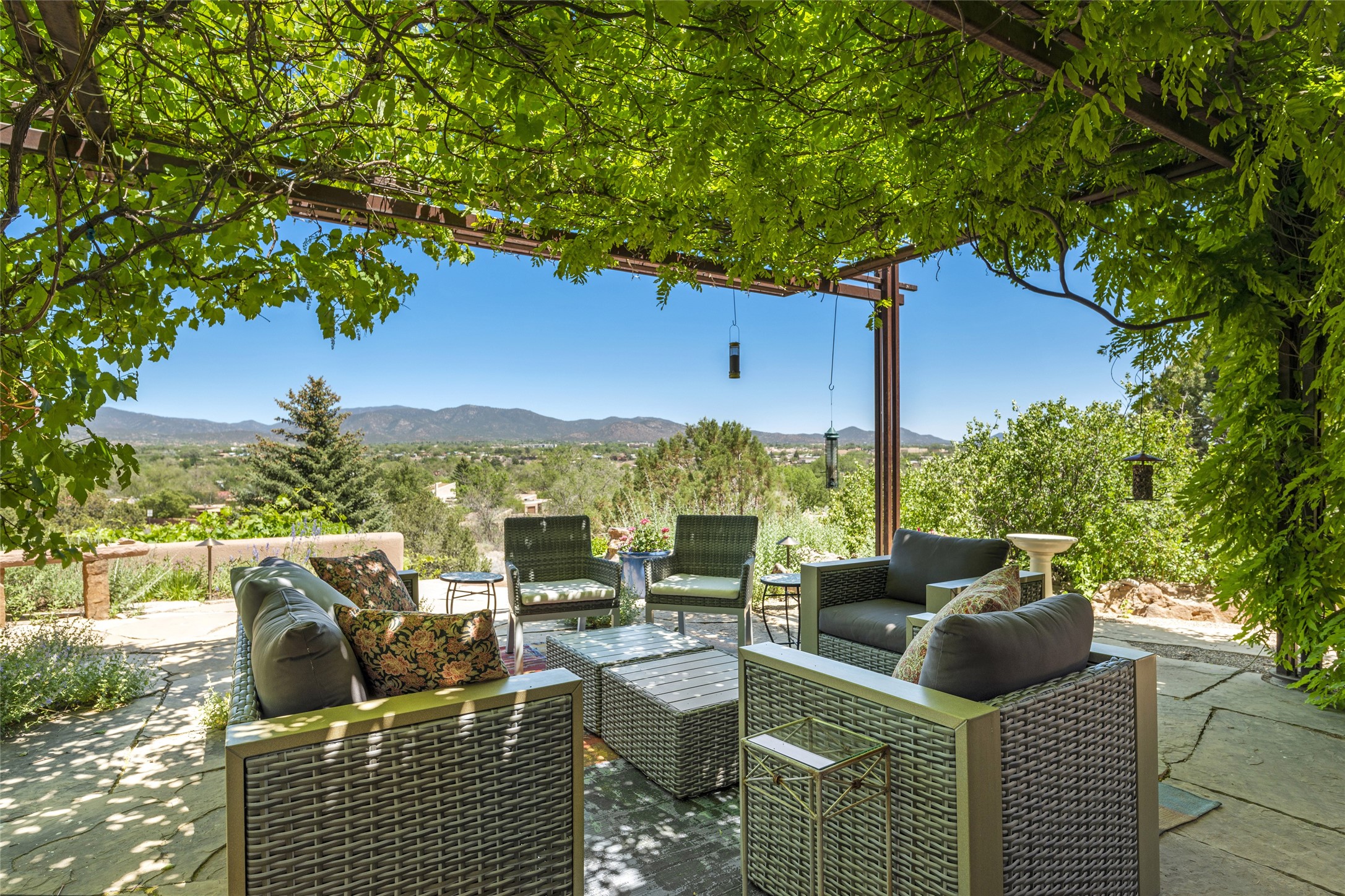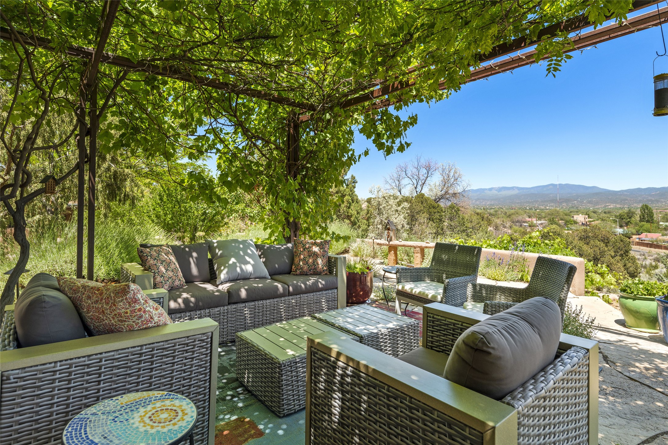 Hold your breath! You will be awed by the views, and enchanted by the gardens of this delightful, in-town property. The house was built by Michael Hurlocker, a Santa Fe builder, as his personal residence. He is well-known for his dedication to high quality design and construction. The light-filled interior is of gracious, ample proportions with many French doors leading to the gardens. Truly a home for easy living and entertaining in the spacious living and dining areas. The room-sized outside portal is pure magic, with grape and wisteria vines overhead and a view to the Sangre de Cristo Mountains to the east. A comfortable bay window seat graces the well-designed kitchen which has lots of counter space and cabinets. The primary suite is quietly situated at the top of the house, with large bedroom and splendid view deck, roomy bathroom and super-big walk-in closet. Two guest bedrooms both have French doors to the outside and are separately located from the main bedroom suite. One is currently used as a studio. And now for the bonus features - A home office with double doors in the main core of the house and a large storage room off the oversized, two-car garage. Landscape lighting has recently been installed and the gardens are on drip and sprinkler irrigation. Conveniently located in Las Lomas subdivision on 0.54 acres, this home is a delight, as also seen in the magical evening photographs!