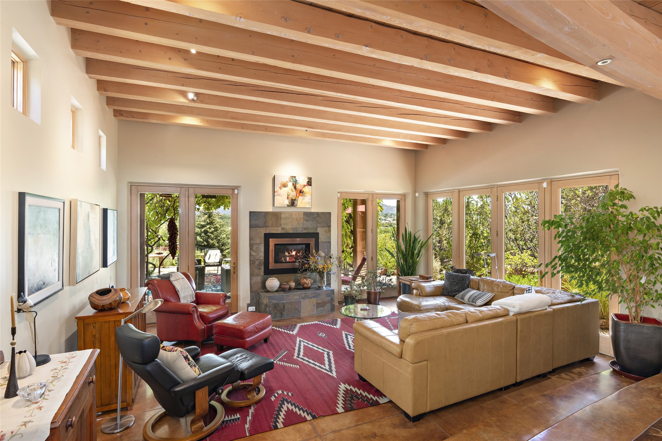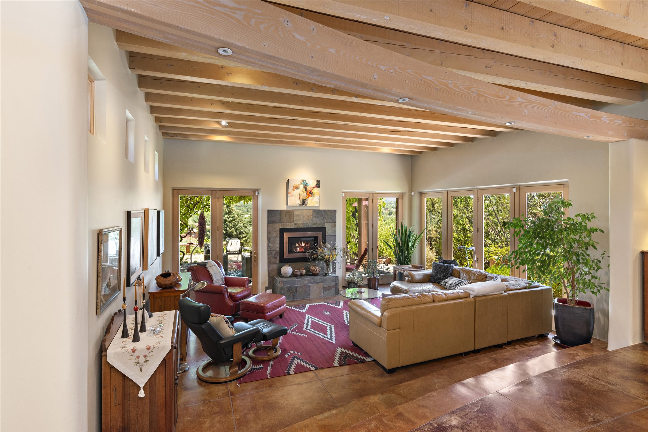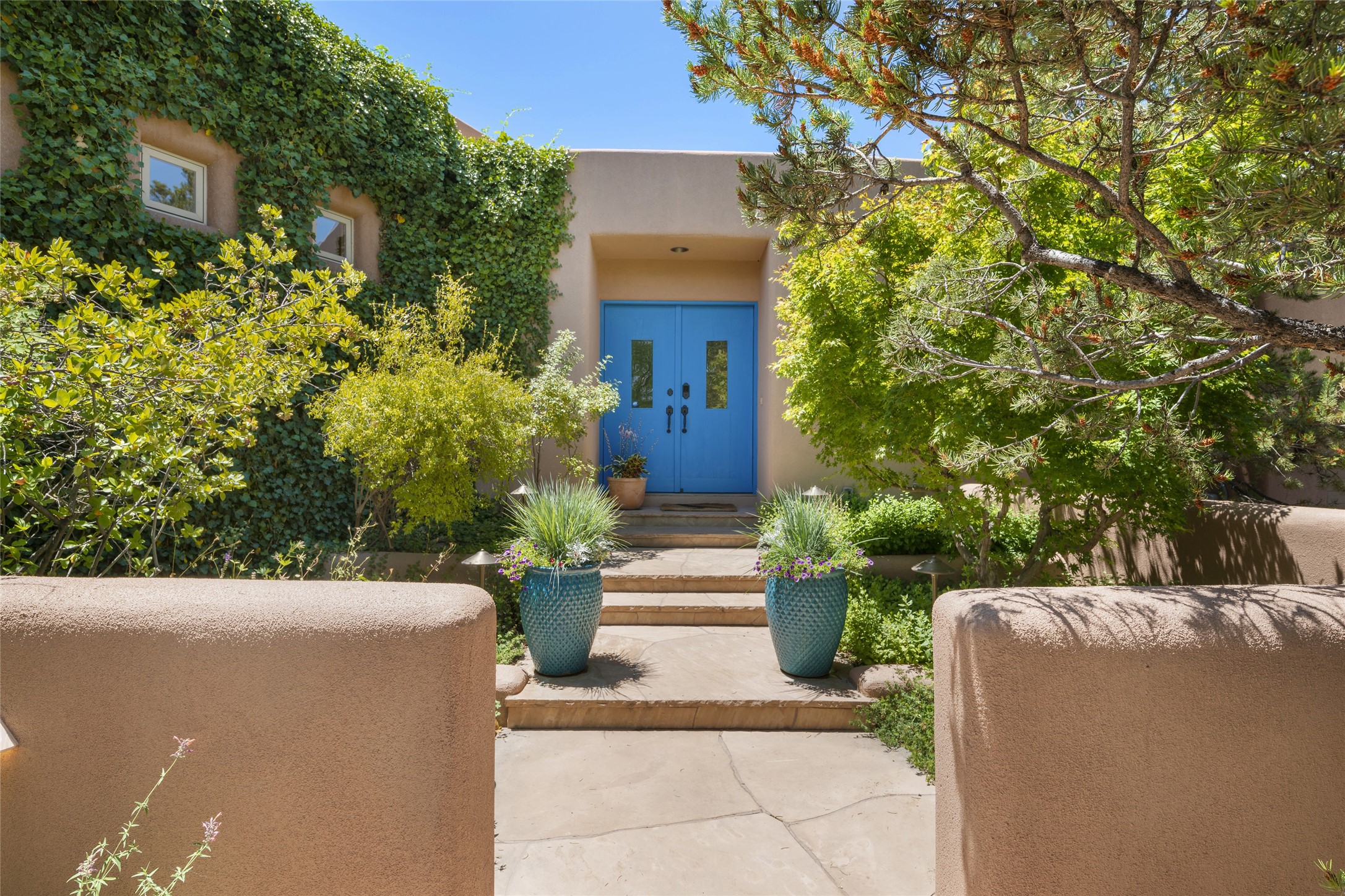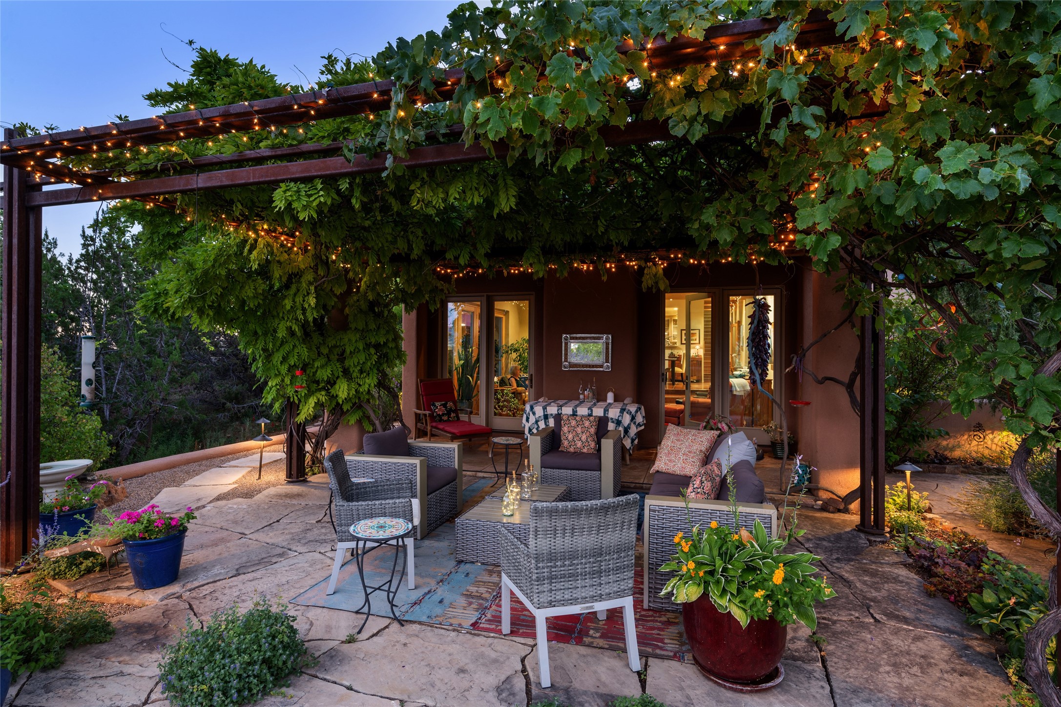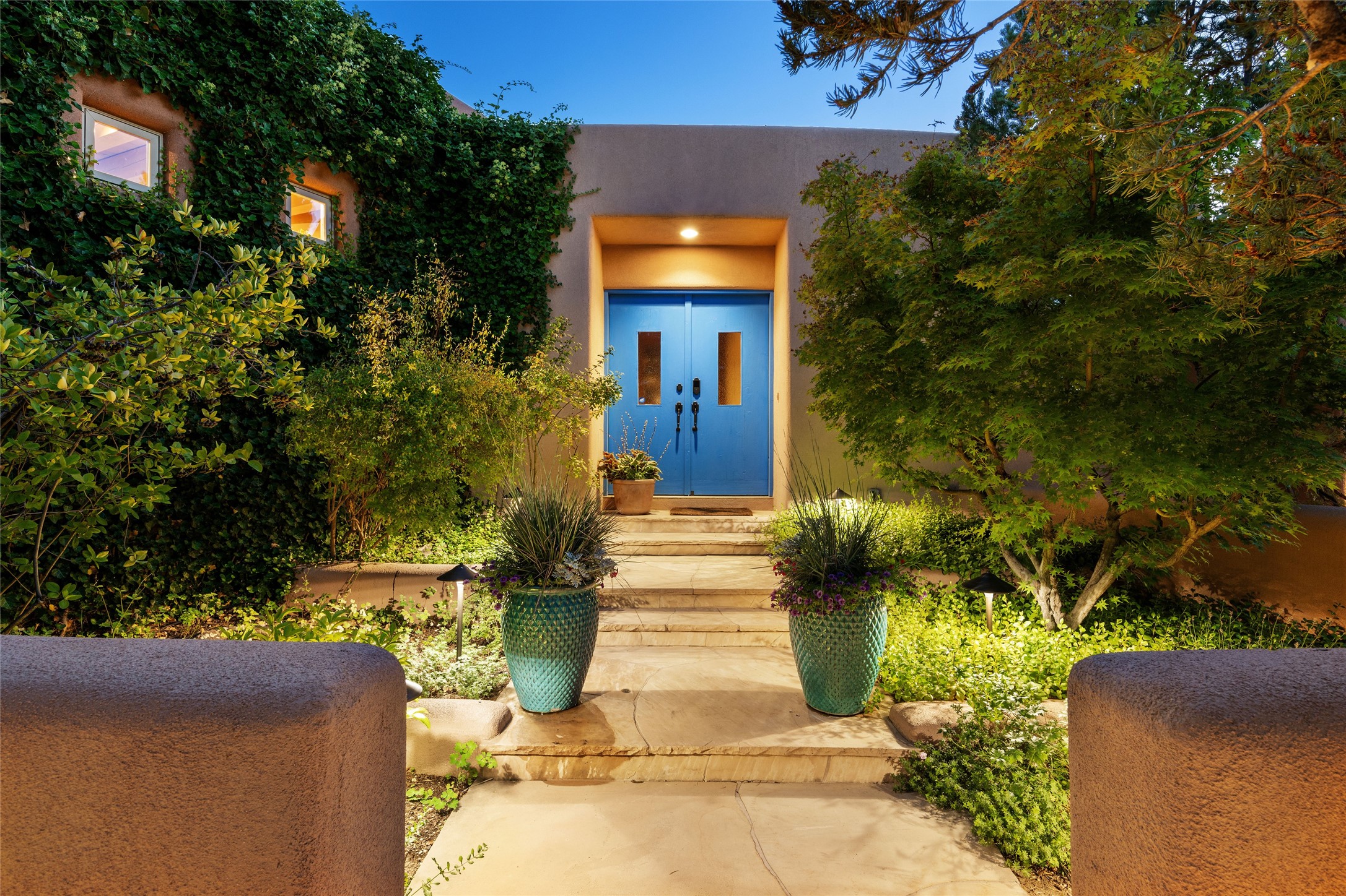 Hold your breath! You will be awed by the views, and enchanted by the gardens of this delightful, in-town property. The house was built by Michael Hurlocker, a Santa Fe builder, as his personal residence. He is well-known for his dedication to high quality design and construction. The light-filled interior is of gracious, ample proportions with many French doors leading to the gardens. Truly a home for easy living and entertaining in the spacious living and dining areas. The room-sized outside portal is pure magic, with grape and wisteria vines overhead and a view to the Sangre de Cristo Mountains to the east. A comfortable bay window seat graces the well-designed kitchen which has lots of counter space and cabinets. The primary suite is quietly situated at the top of the house, with large bedroom and splendid view deck, roomy bathroom and super-big walk-in closet. Two guest bedrooms both have French doors to the outside and are separately located from the main bedroom suite. One is currently used as a studio. And now for the bonus features - A home office with double doors in the main core of the house and a large storage room off the oversized, two-car garage. Landscape lighting has recently been installed and the gardens are on drip and sprinkler irrigation. Conveniently located in Las Lomas subdivision on 0.54 acres, this home is a delight, as also seen in the magical evening photographs!