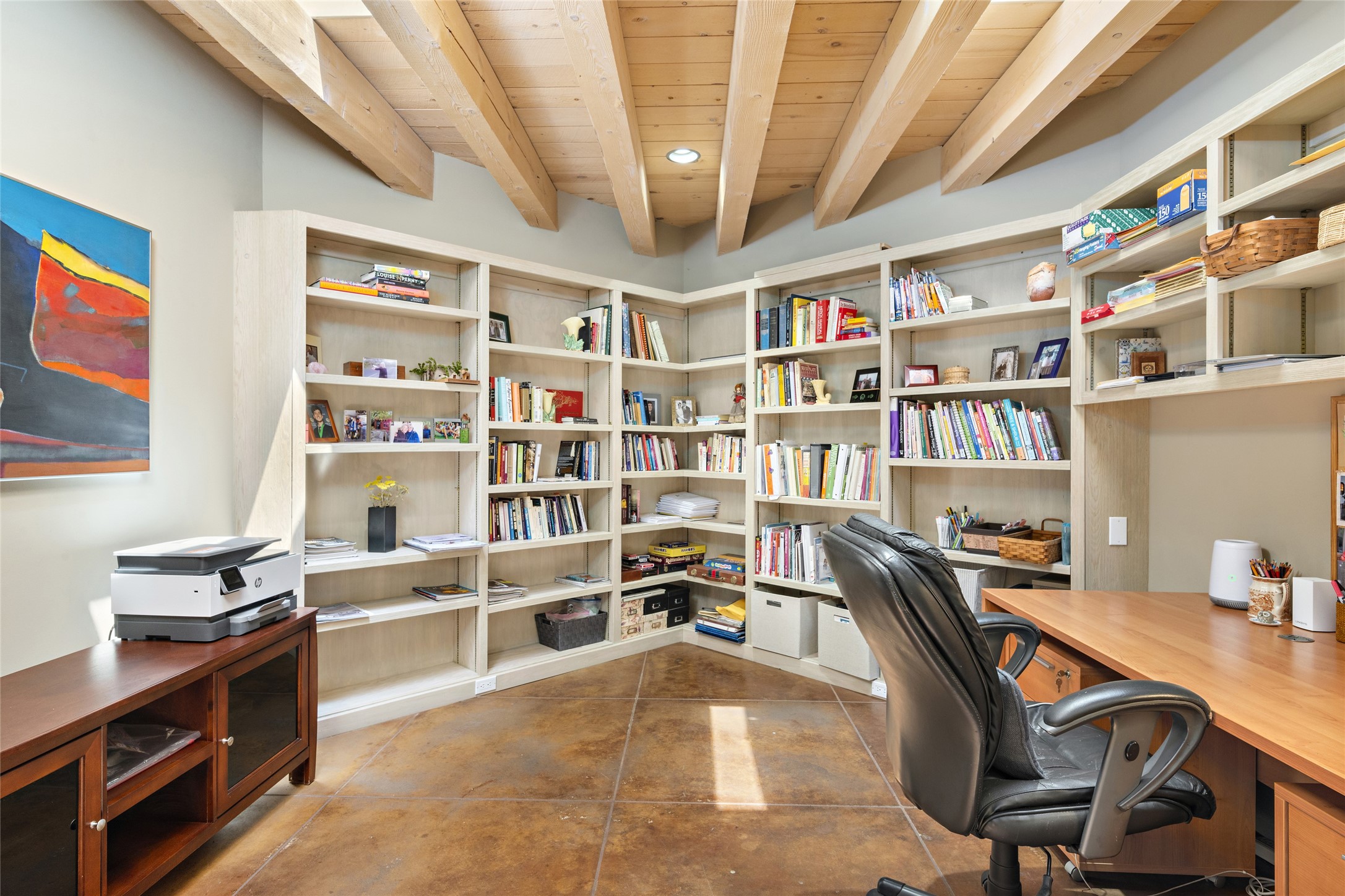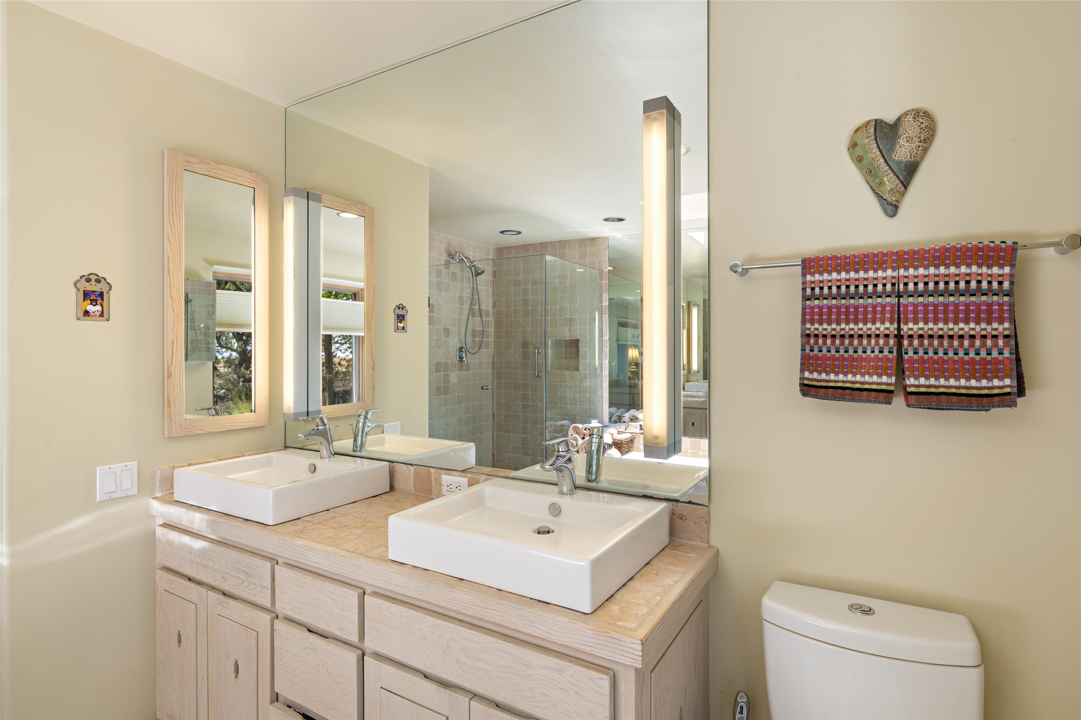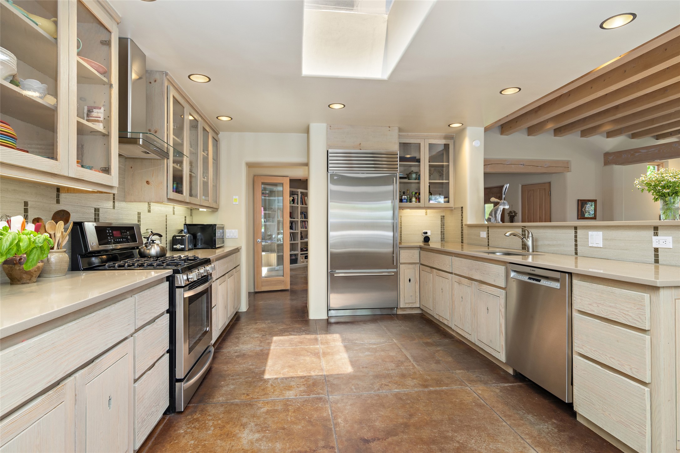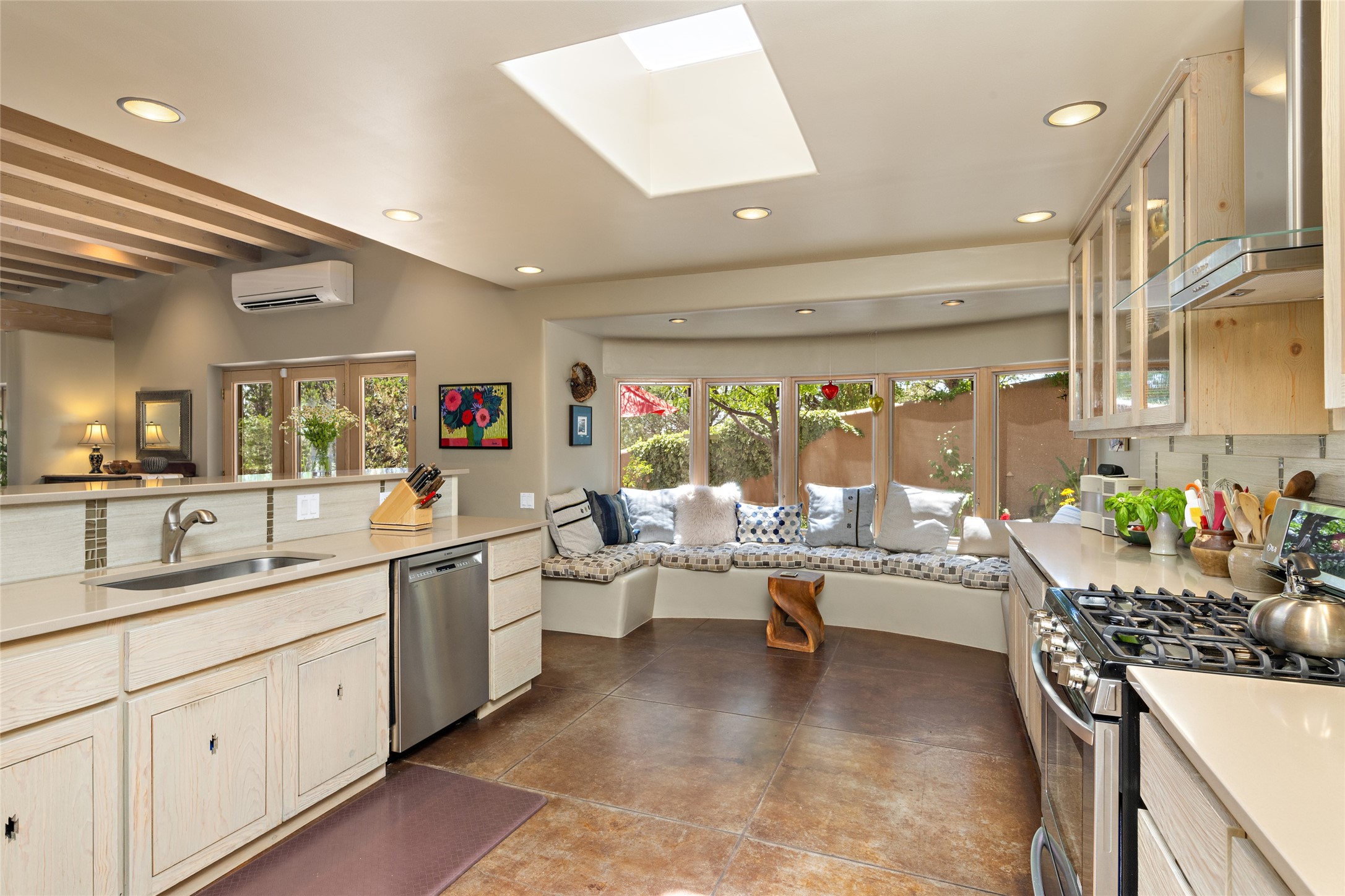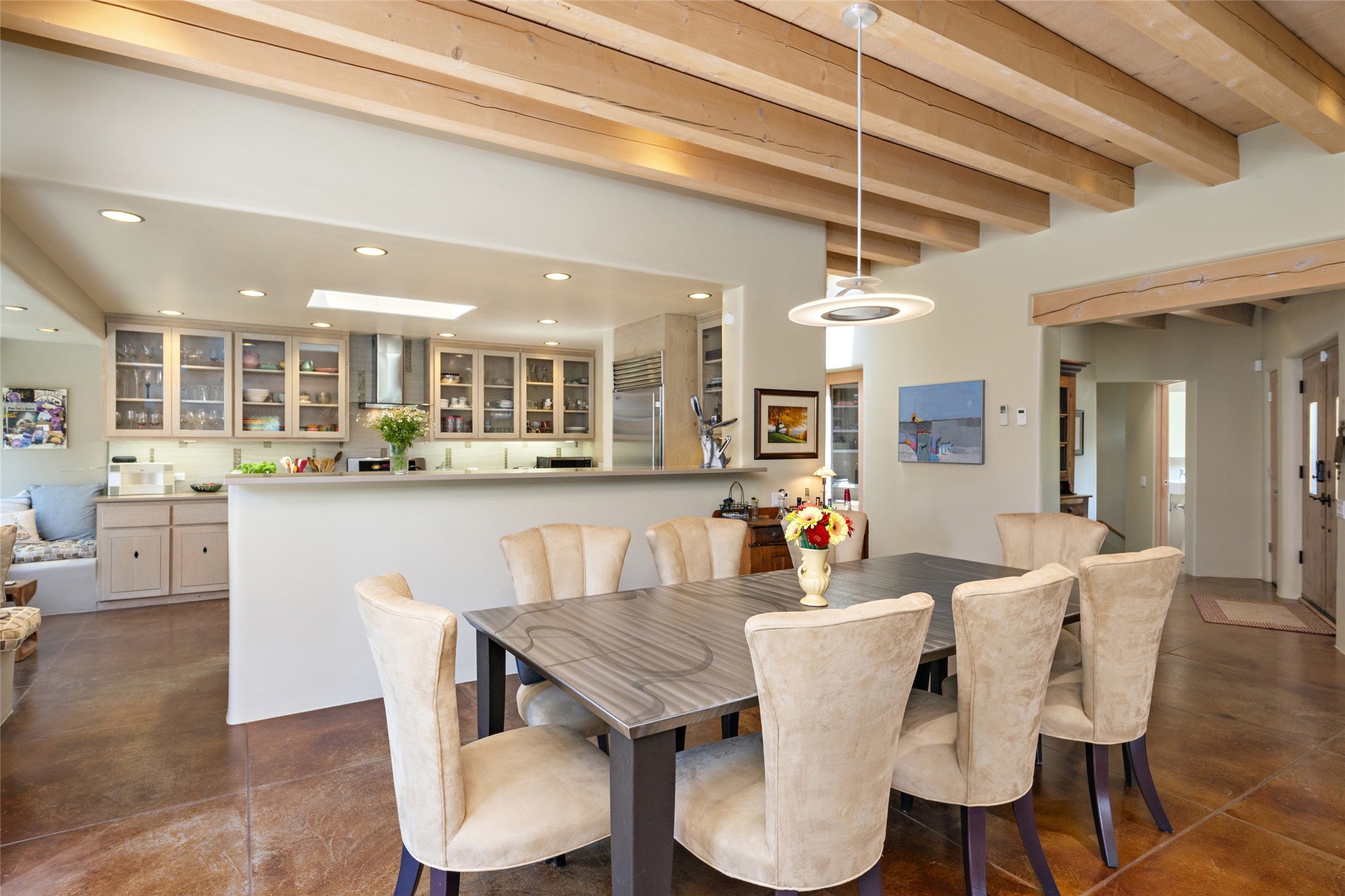 Hold your breath! You will be awed by the views, and enchanted by the gardens of this delightful, in-town property. The house was built by Michael Hurlocker, a Santa Fe builder, as his personal residence. He is well-known for his dedication to high quality design and construction. The light-filled interior is of gracious, ample proportions with many French doors leading to the gardens. Truly a home for easy living and entertaining in the spacious living and dining areas. The room-sized outside portal is pure magic, with grape and wisteria vines overhead and a view to the Sangre de Cristo Mountains to the east. A comfortable bay window seat graces the well-designed kitchen which has lots of counter space and cabinets. The primary suite is quietly situated at the top of the house, with large bedroom and splendid view deck, roomy bathroom and super-big walk-in closet. Two guest bedrooms both have French doors to the outside and are separately located from the main bedroom suite. One is currently used as a studio. And now for the bonus features - A home office with double doors in the main core of the house and a large storage room off the oversized, two-car garage. Landscape lighting has recently been installed and the gardens are on drip and sprinkler irrigation. Conveniently located in Las Lomas subdivision on 0.54 acres, this home is a delight, as also seen in the magical evening photographs!