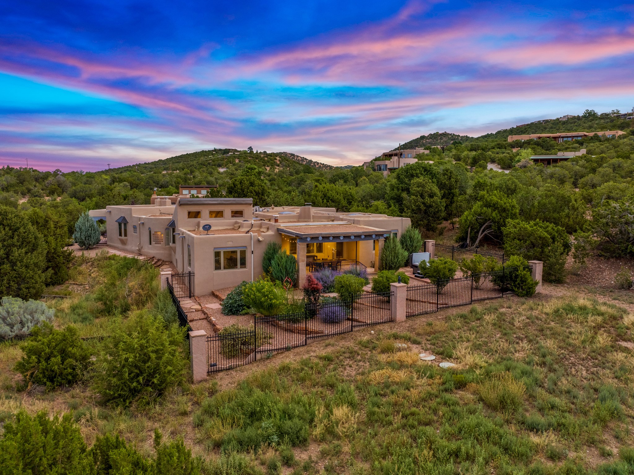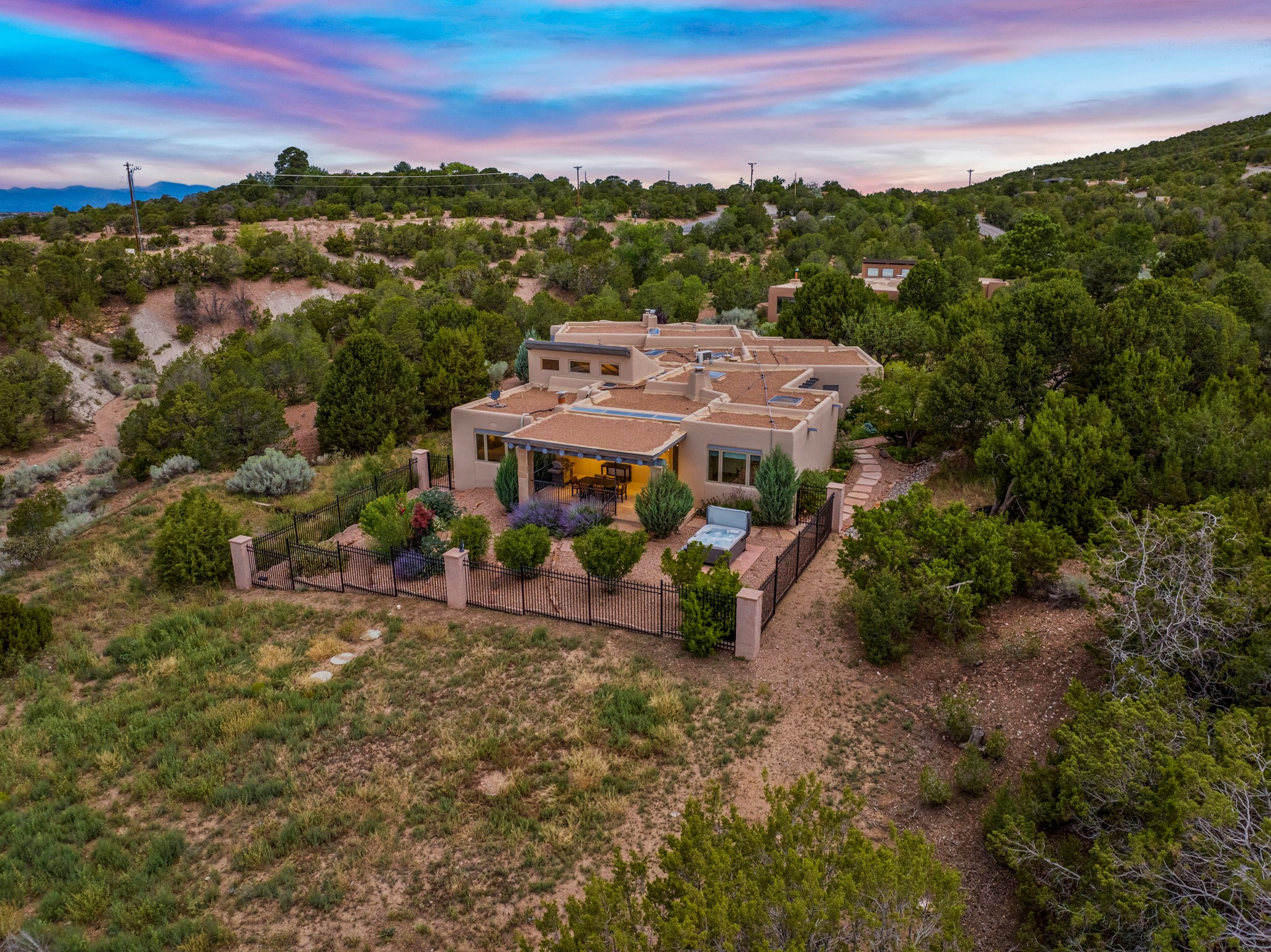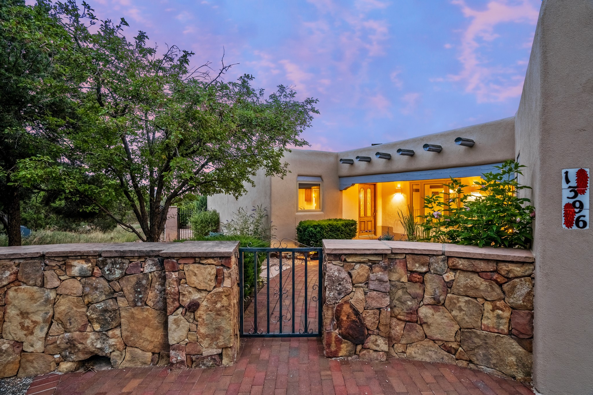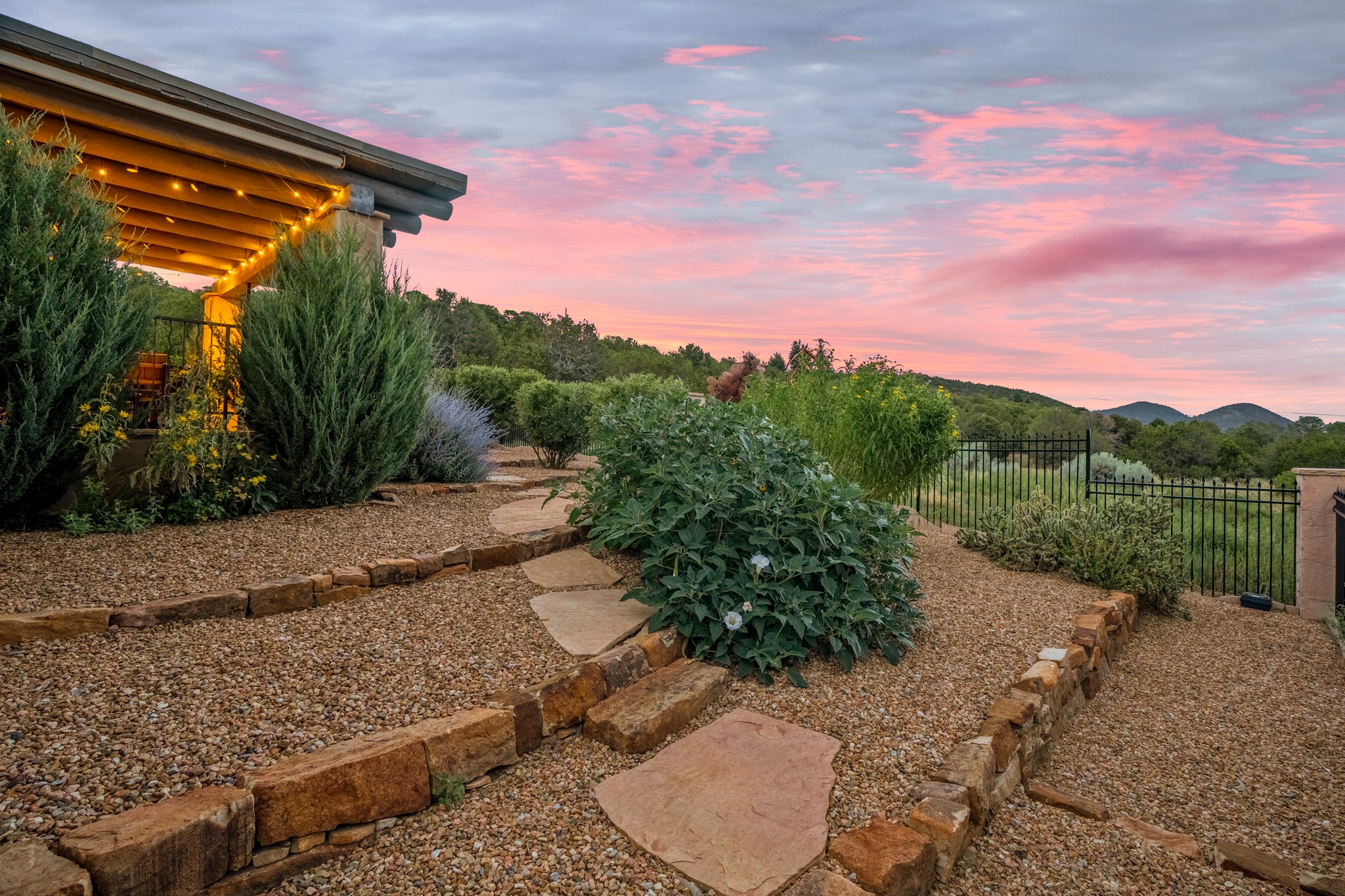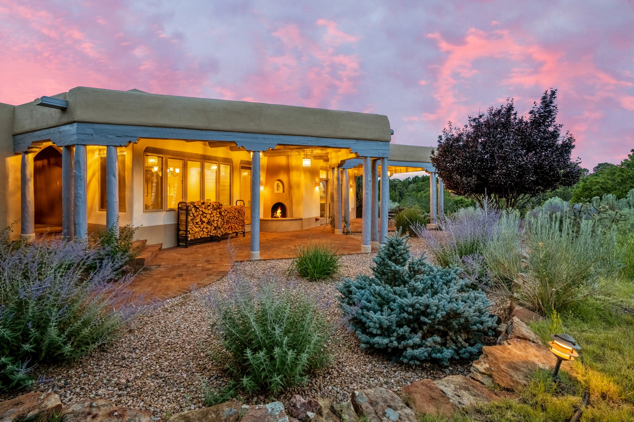 Superb location nestled in the foothills of the Sangre de Cristos is surprisingly private and offers easy access for enjoying all of the amenities of downtown and all the activities of the mountains (hiking, skiing, biking, etc...). The idyllic setting boasts tons of outdoor portal space to enjoy the lovely gardens and views toward the southwest, including Sun and Moon mountains. Set on just over one acre, including an enclosed fenced area, has direct mountain access. This sun-filled home embraces all that is the land of enchantment with 2 of the 4 bedrooms featuring full en-suites, 5 wood burning kiva fireplaces (1 outdoor), two kitchens, and a steam shower. The floor plan could be desirable for multi-generational options which is highlighted by one level access.