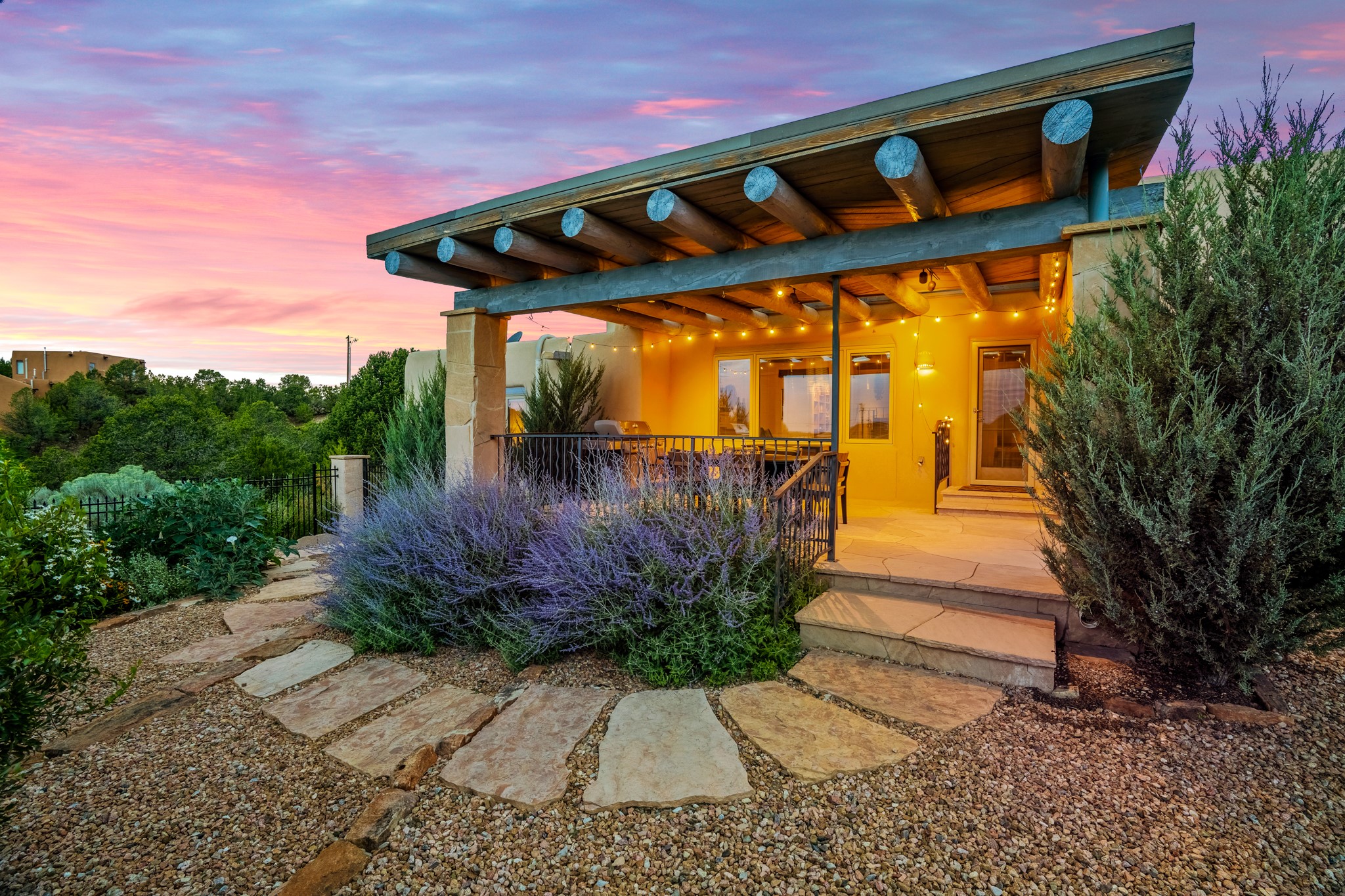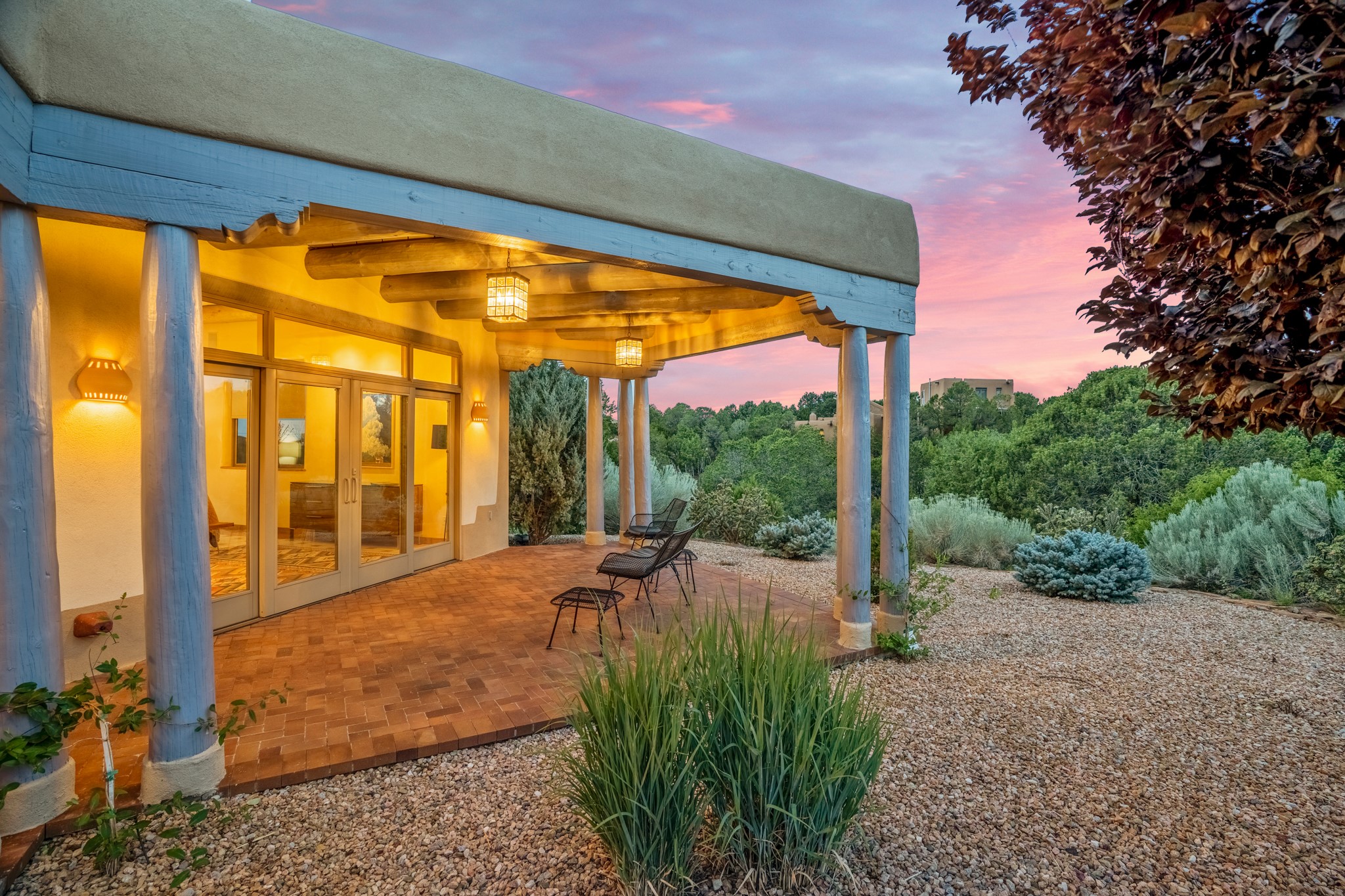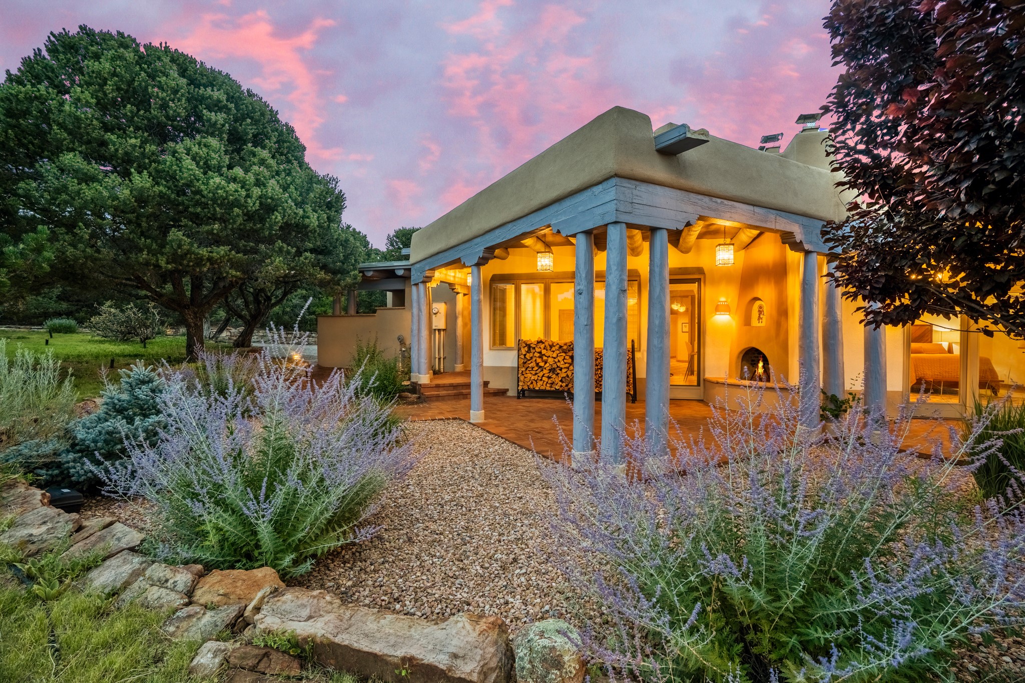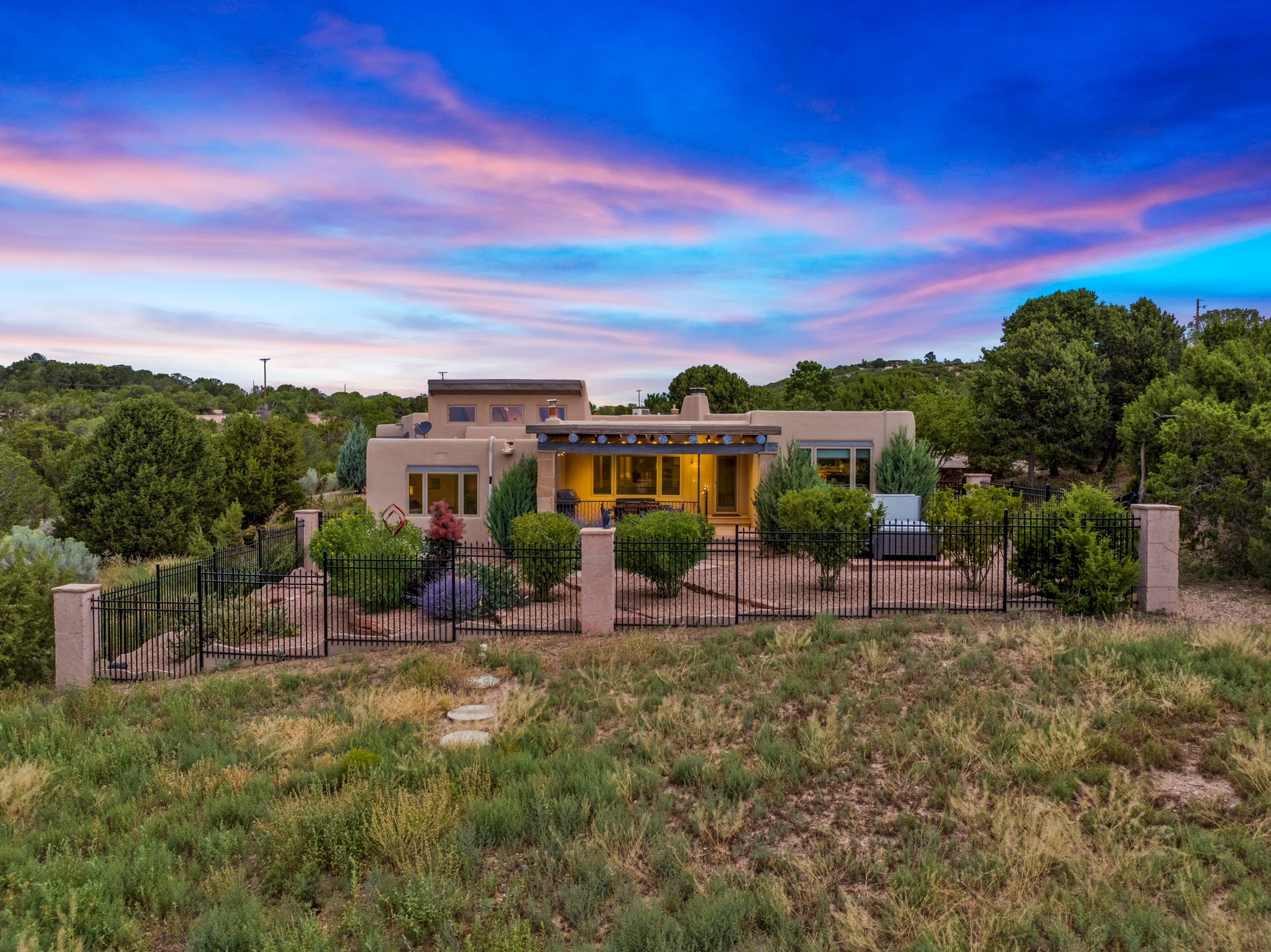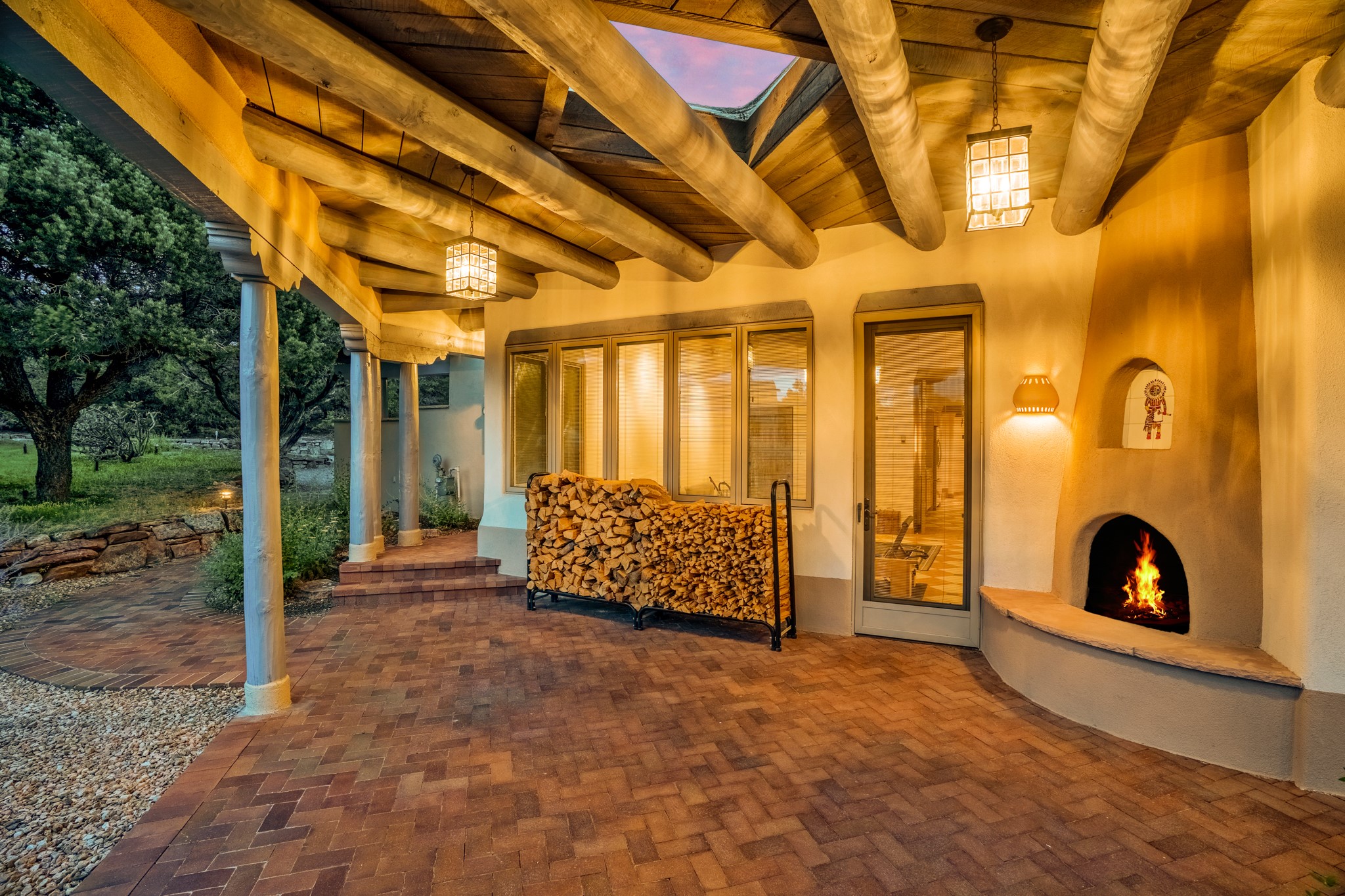 Superb location nestled in the foothills of the Sangre de Cristos is surprisingly private and offers easy access for enjoying all of the amenities of downtown and all the activities of the mountains (hiking, skiing, biking, etc...). The idyllic setting boasts tons of outdoor portal space to enjoy the lovely gardens and views toward the southwest, including Sun and Moon mountains. Set on just over one acre, including an enclosed fenced area, has direct mountain access. This sun-filled home embraces all that is the land of enchantment with 2 of the 4 bedrooms featuring full en-suites, 5 wood burning kiva fireplaces (1 outdoor), two kitchens, and a steam shower. The floor plan could be desirable for multi-generational options which is highlighted by one level access.