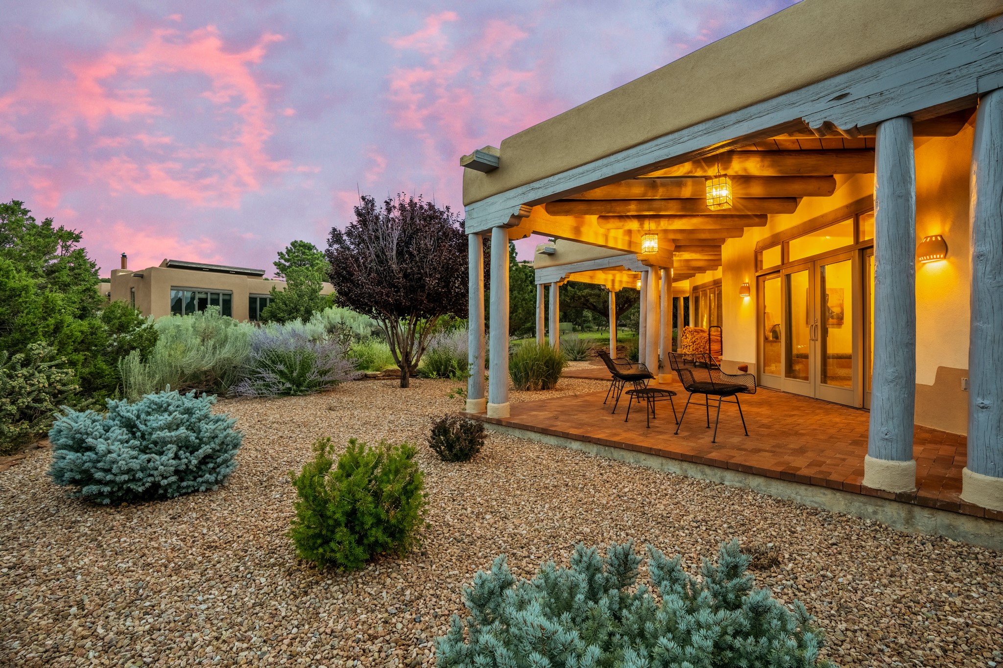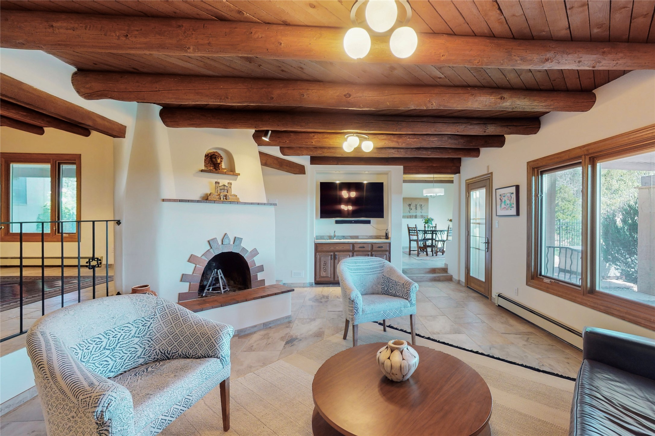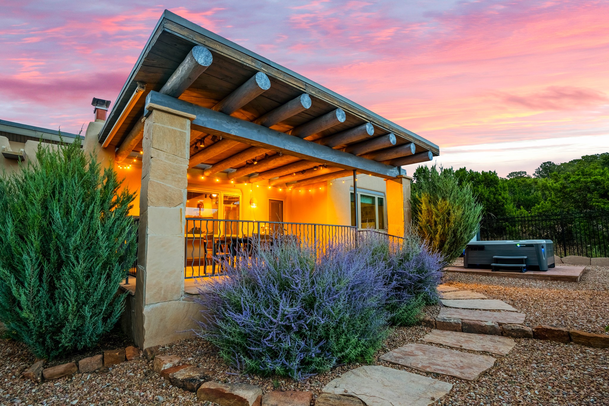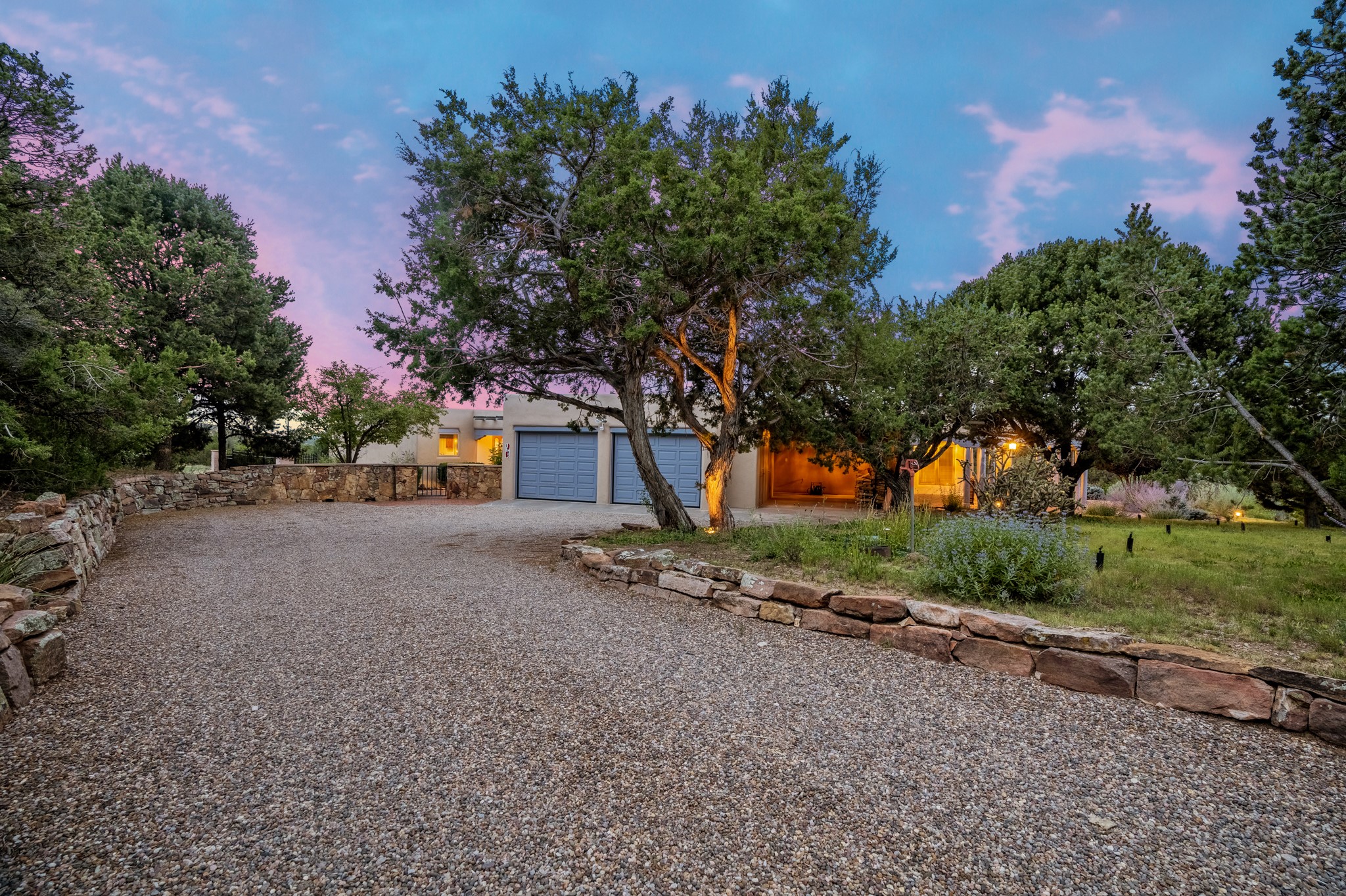 Superb location nestled in the foothills of the Sangre de Cristos is surprisingly private and offers easy access for enjoying all of the amenities of downtown and all the activities of the mountains (hiking, skiing, biking, etc...). The idyllic setting boasts tons of outdoor portal space to enjoy the lovely gardens and views toward the southwest, including Sun and Moon mountains. Set on just over one acre, including an enclosed fenced area, has direct mountain access. This sun-filled home embraces all that is the land of enchantment with 2 of the 4 bedrooms featuring full en-suites, 5 wood burning kiva fireplaces (1 outdoor), two kitchens, and a steam shower. The floor plan could be desirable for multi-generational options which is highlighted by one level access.