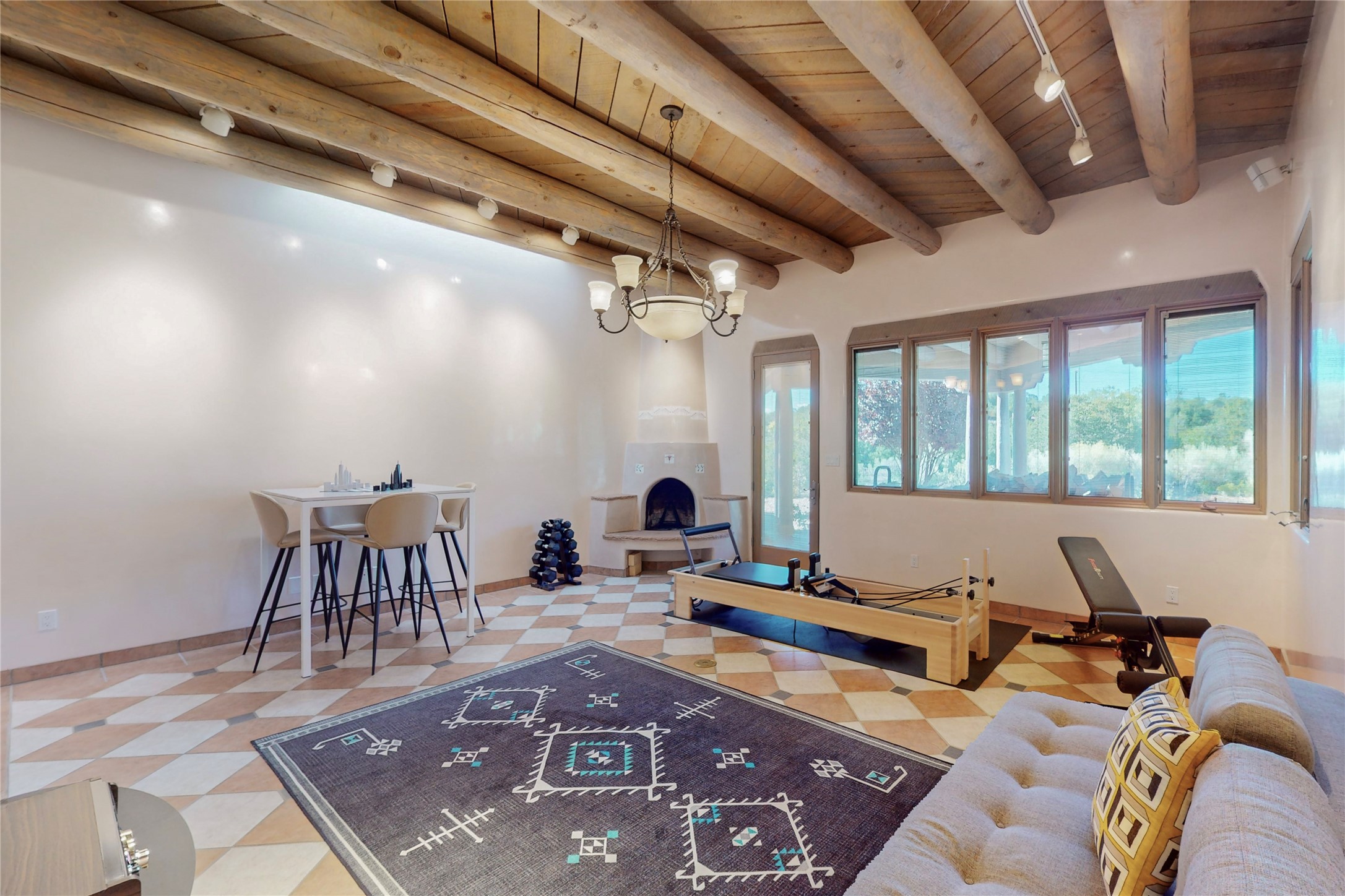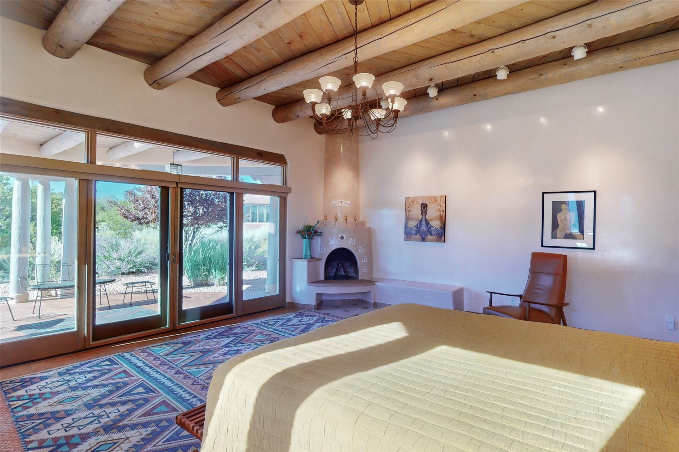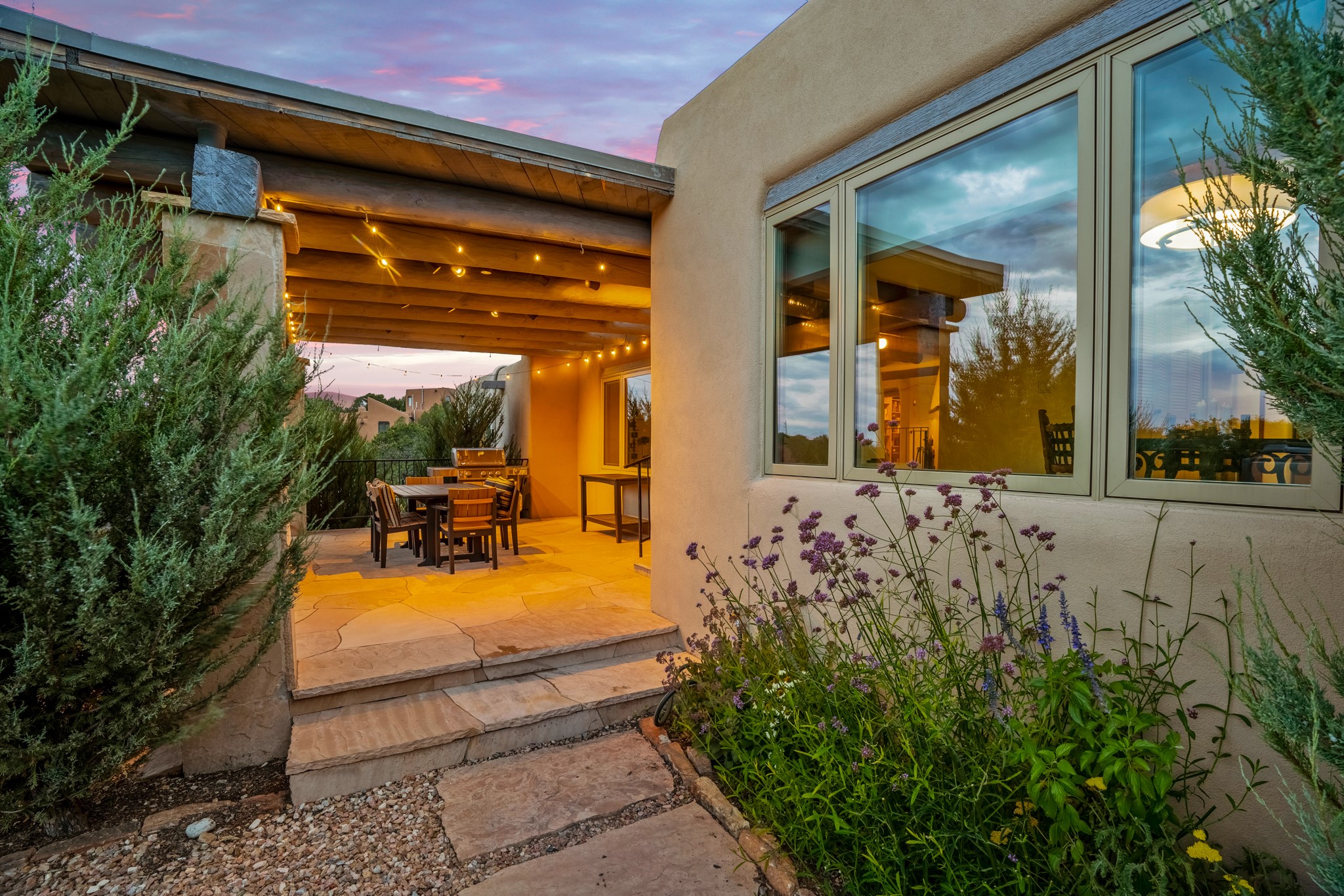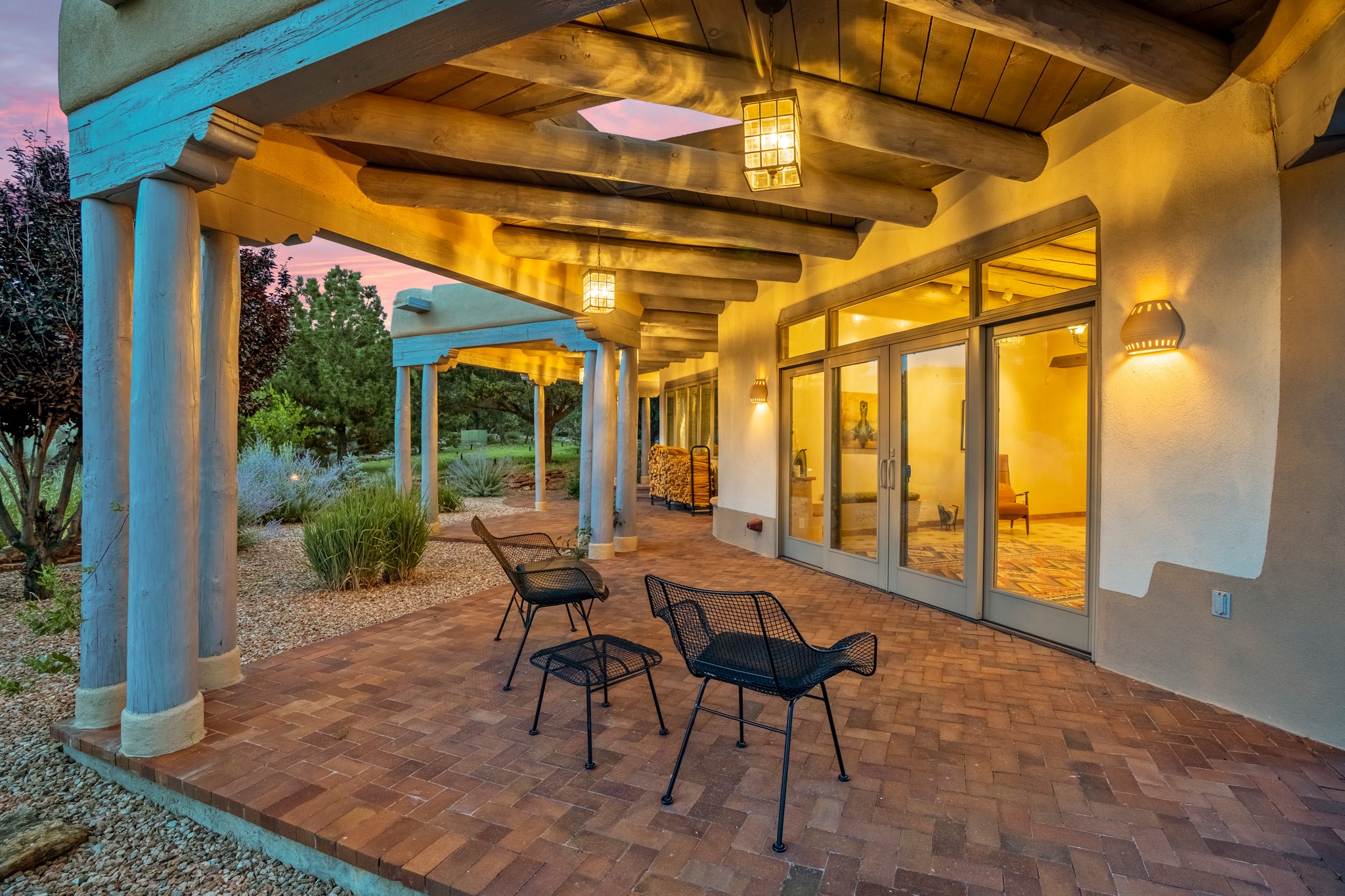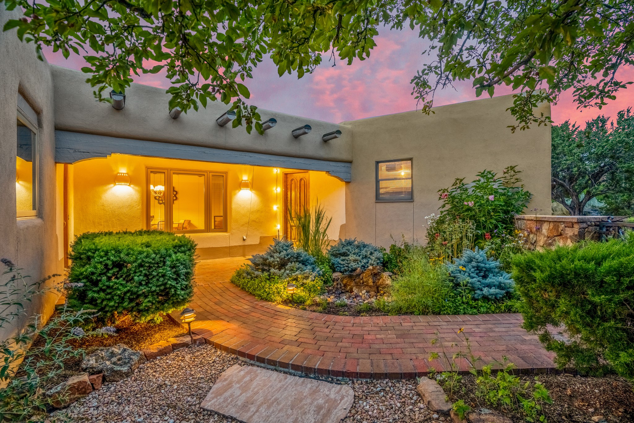 Superb location nestled in the foothills of the Sangre de Cristos is surprisingly private and offers easy access for enjoying all of the amenities of downtown and all the activities of the mountains (hiking, skiing, biking, etc...). The idyllic setting boasts tons of outdoor portal space to enjoy the lovely gardens and views toward the southwest, including Sun and Moon mountains. Set on just over one acre, including an enclosed fenced area, has direct mountain access. This sun-filled home embraces all that is the land of enchantment with 2 of the 4 bedrooms featuring full en-suites, 5 wood burning kiva fireplaces (1 outdoor), two kitchens, and a steam shower. The floor plan could be desirable for multi-generational options which is highlighted by one level access.