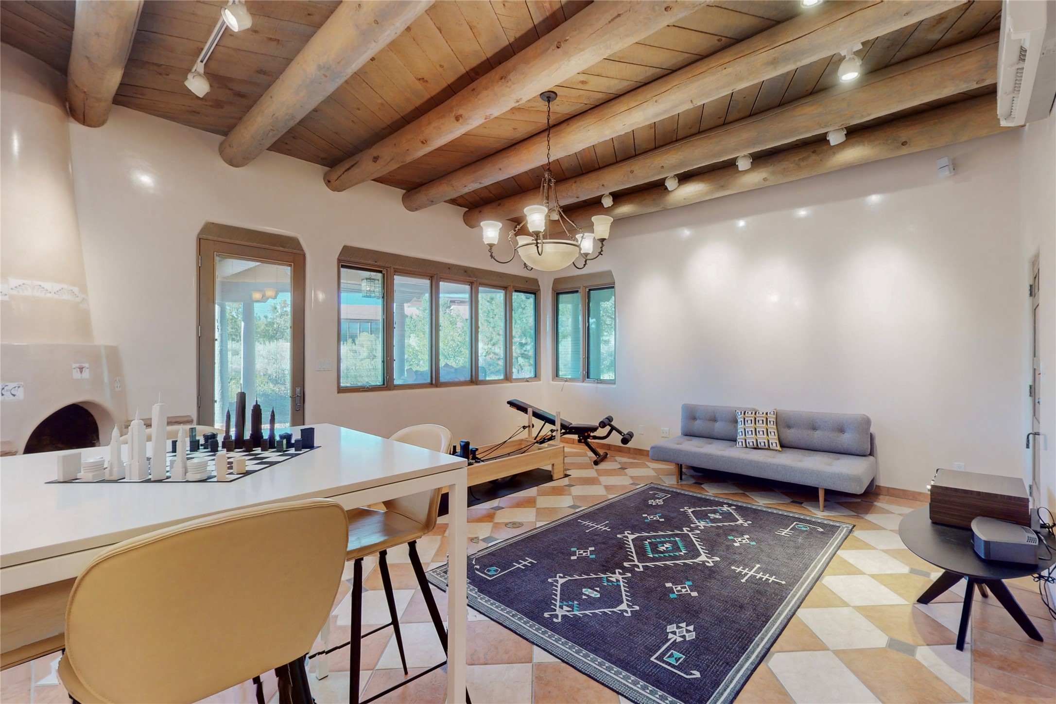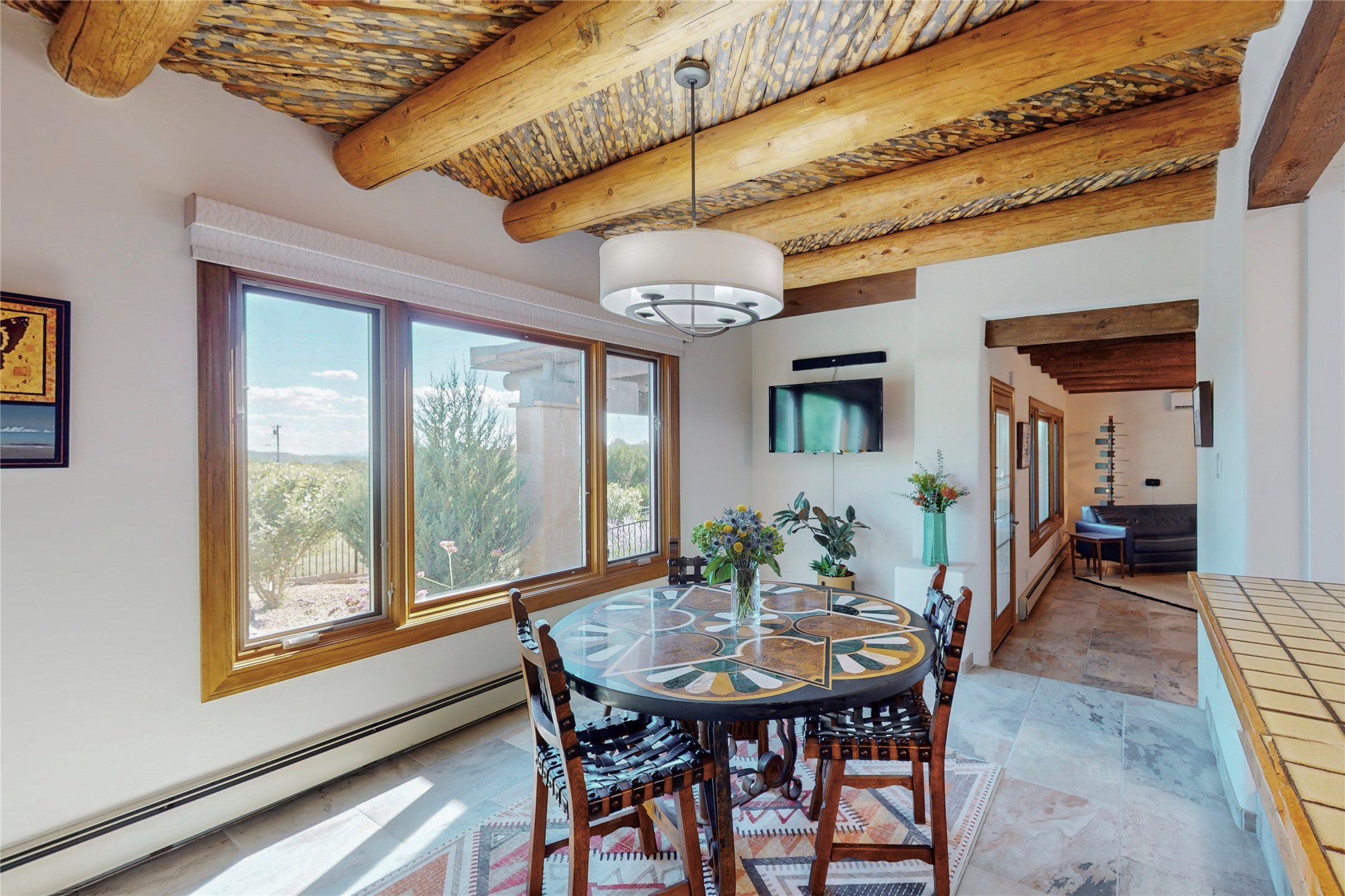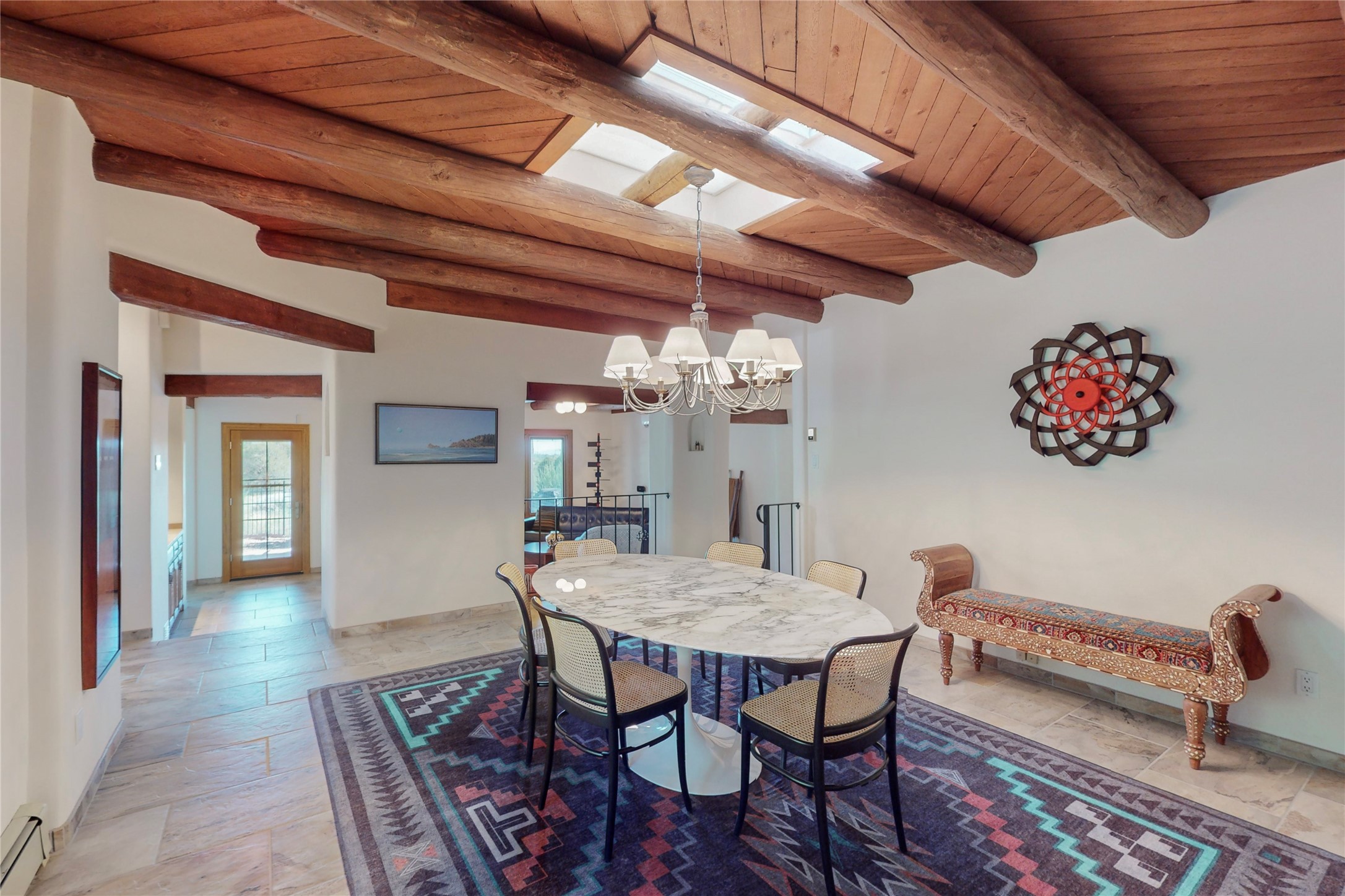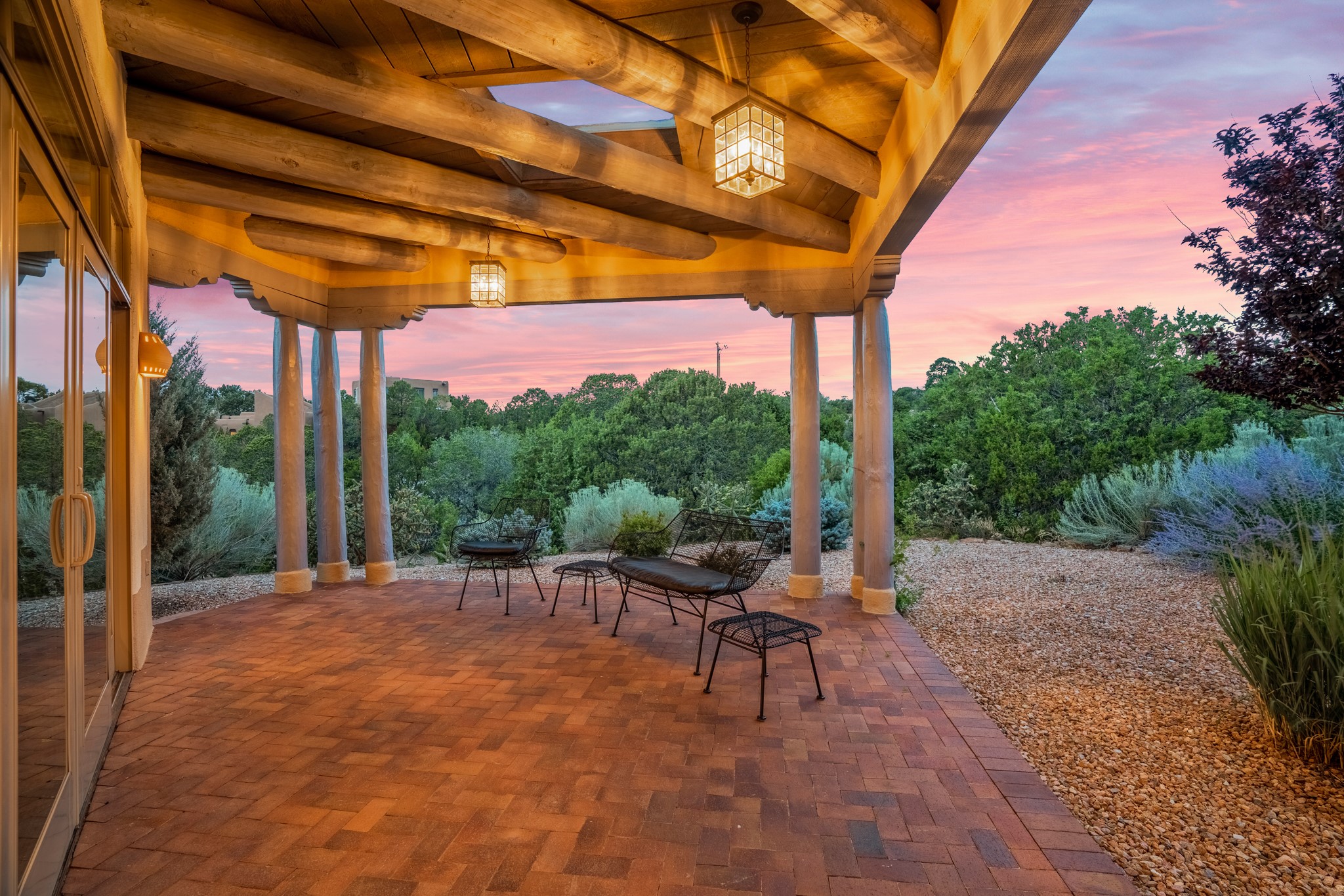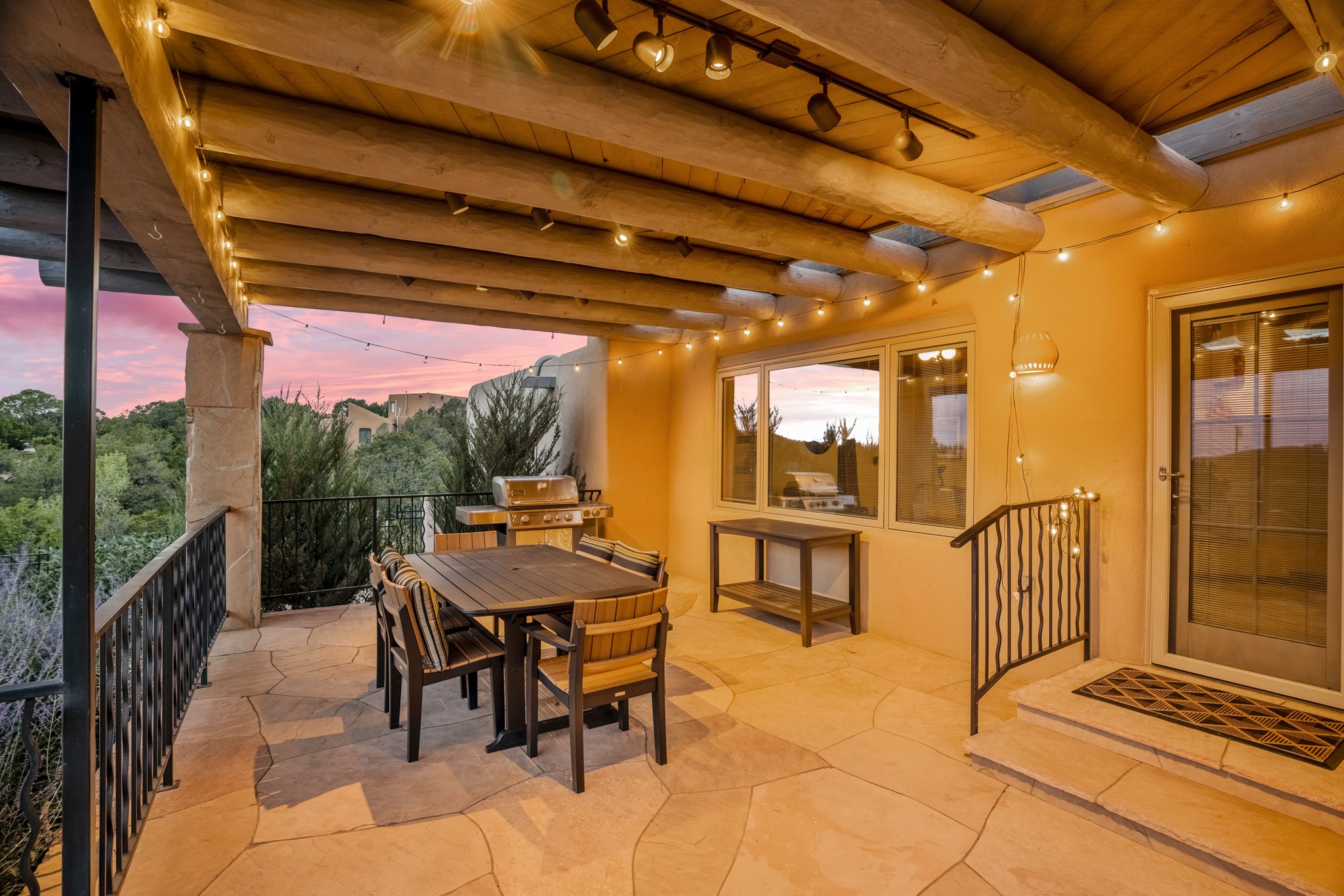 Superb location nestled in the foothills of the Sangre de Cristos is surprisingly private and offers easy access for enjoying all of the amenities of downtown and all the activities of the mountains (hiking, skiing, biking, etc...). The idyllic setting boasts tons of outdoor portal space to enjoy the lovely gardens and views toward the southwest, including Sun and Moon mountains. Set on just over one acre, including an enclosed fenced area, has direct mountain access. This sun-filled home embraces all that is the land of enchantment with 2 of the 4 bedrooms featuring full en-suites, 5 wood burning kiva fireplaces (1 outdoor), two kitchens, and a steam shower. The floor plan could be desirable for multi-generational options which is highlighted by one level access.