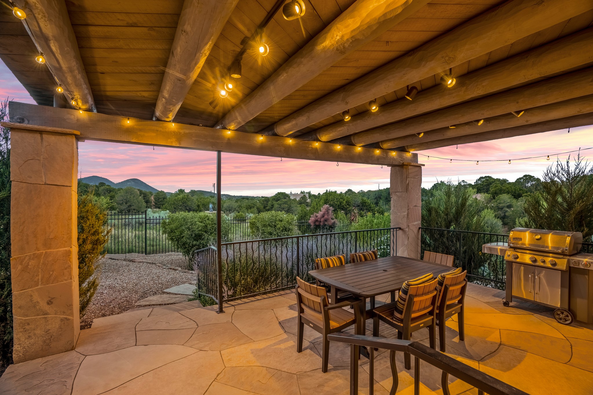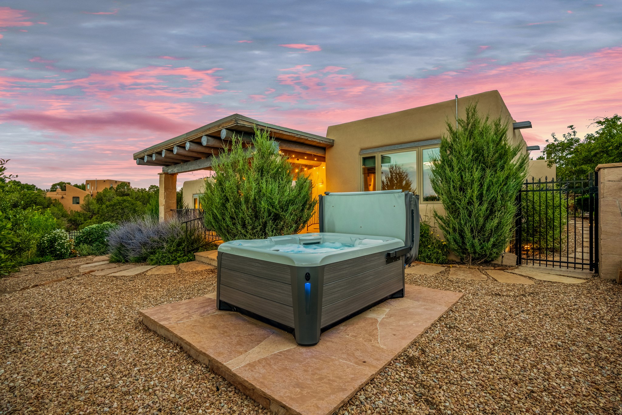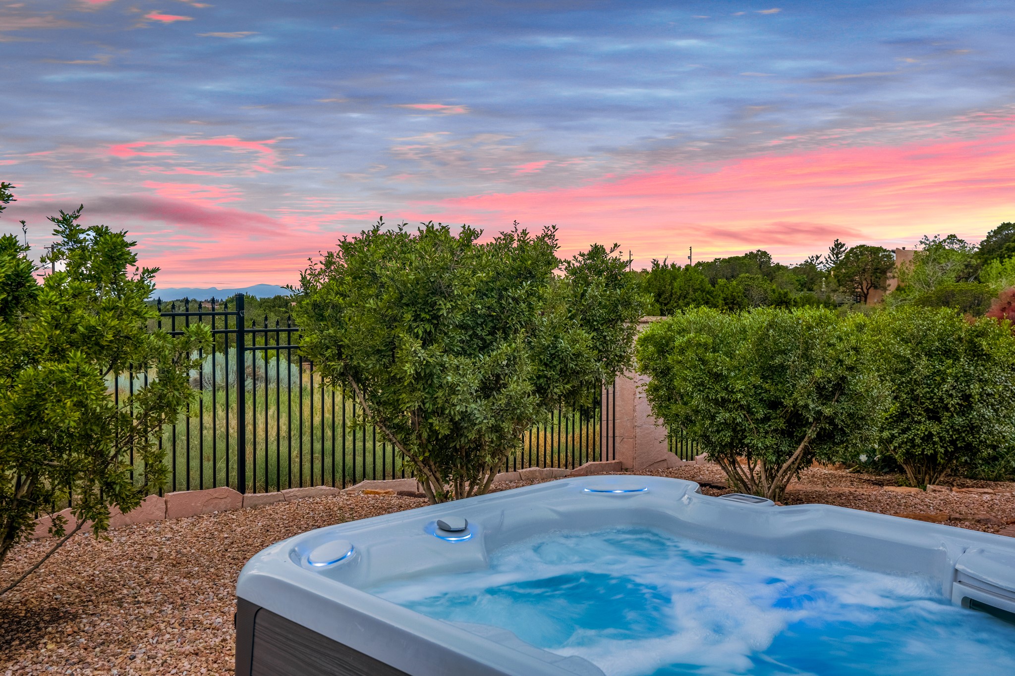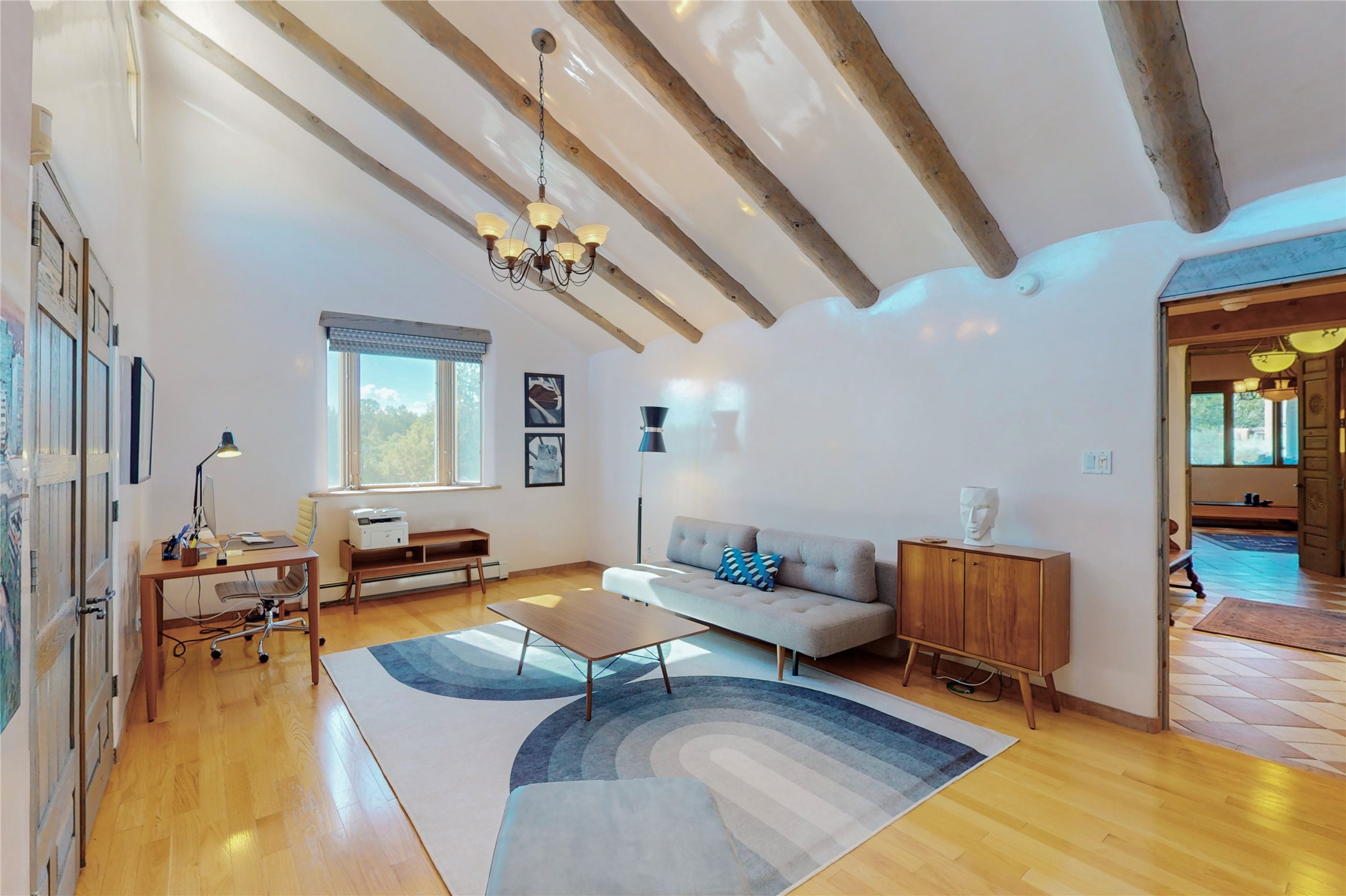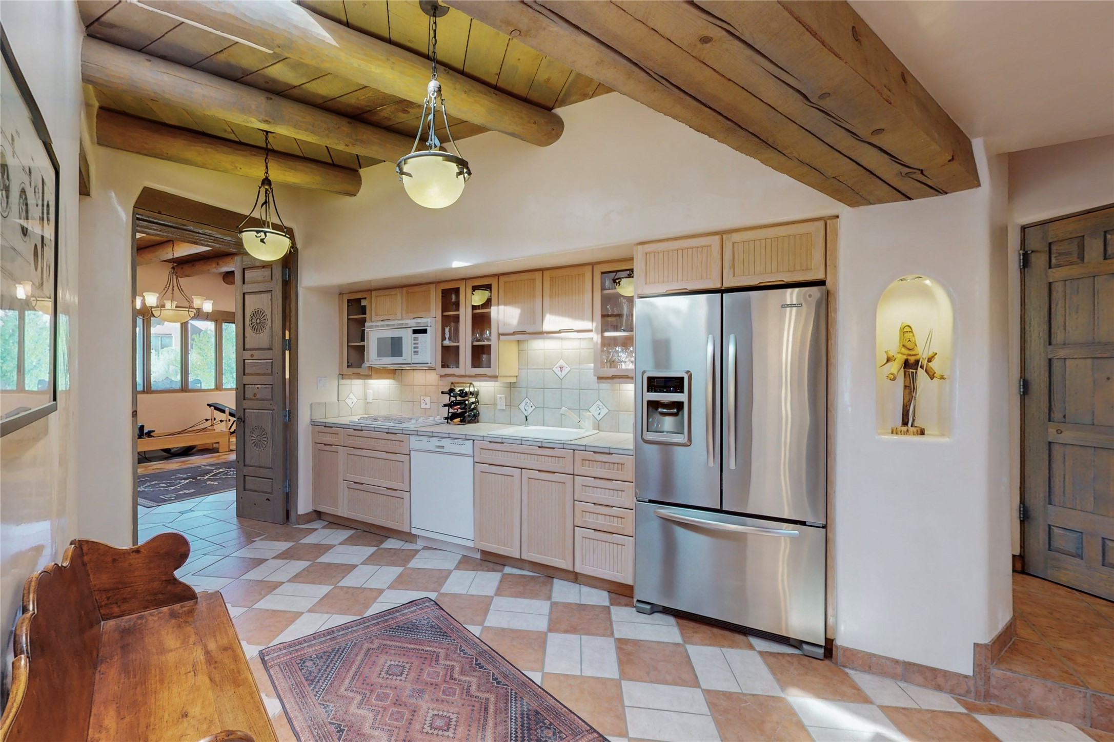 Superb location nestled in the foothills of the Sangre de Cristos is surprisingly private and offers easy access for enjoying all of the amenities of downtown and all the activities of the mountains (hiking, skiing, biking, etc...). The idyllic setting boasts tons of outdoor portal space to enjoy the lovely gardens and views toward the southwest, including Sun and Moon mountains. Set on just over one acre, including an enclosed fenced area, has direct mountain access. This sun-filled home embraces all that is the land of enchantment with 2 of the 4 bedrooms featuring full en-suites, 5 wood burning kiva fireplaces (1 outdoor), two kitchens, and a steam shower. The floor plan could be desirable for multi-generational options which is highlighted by one level access.