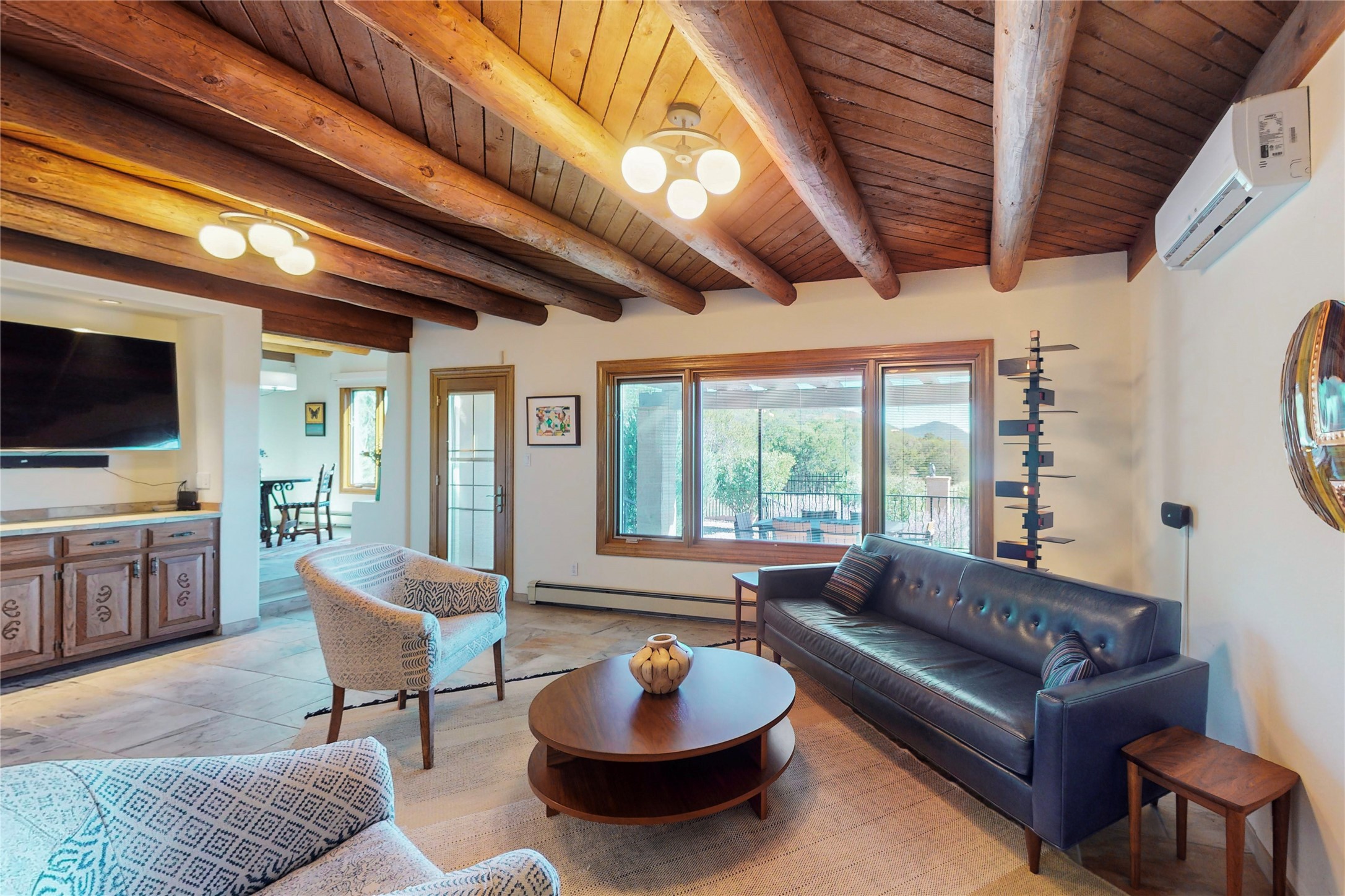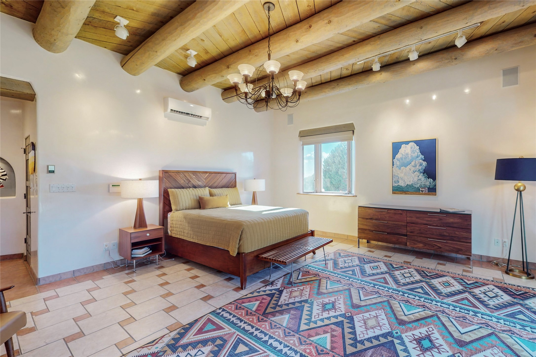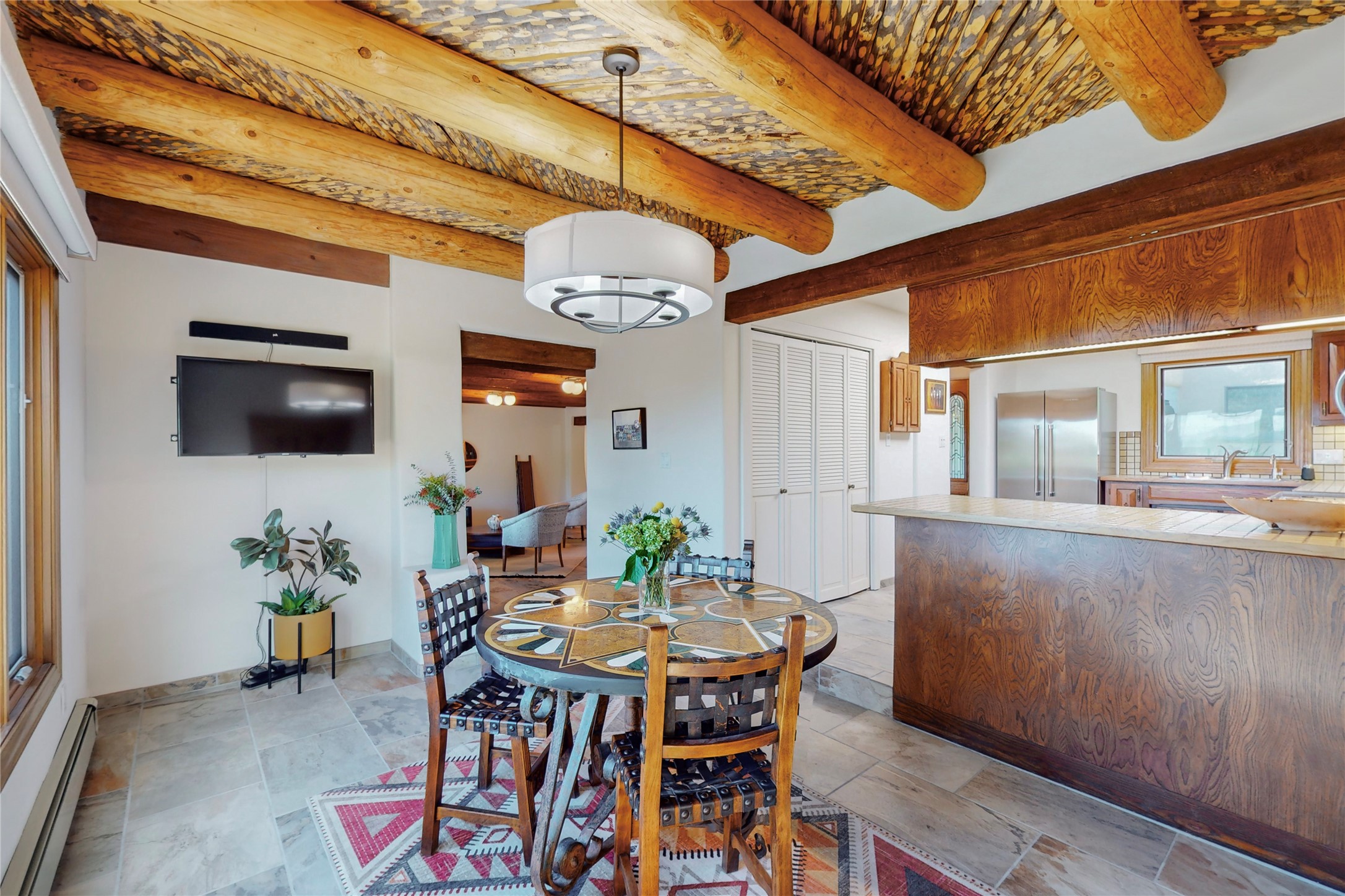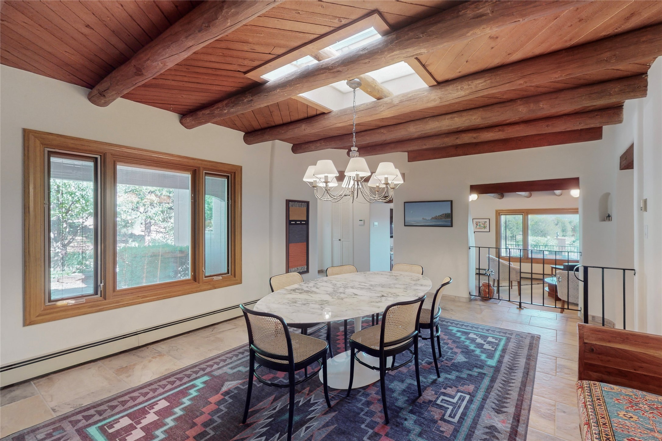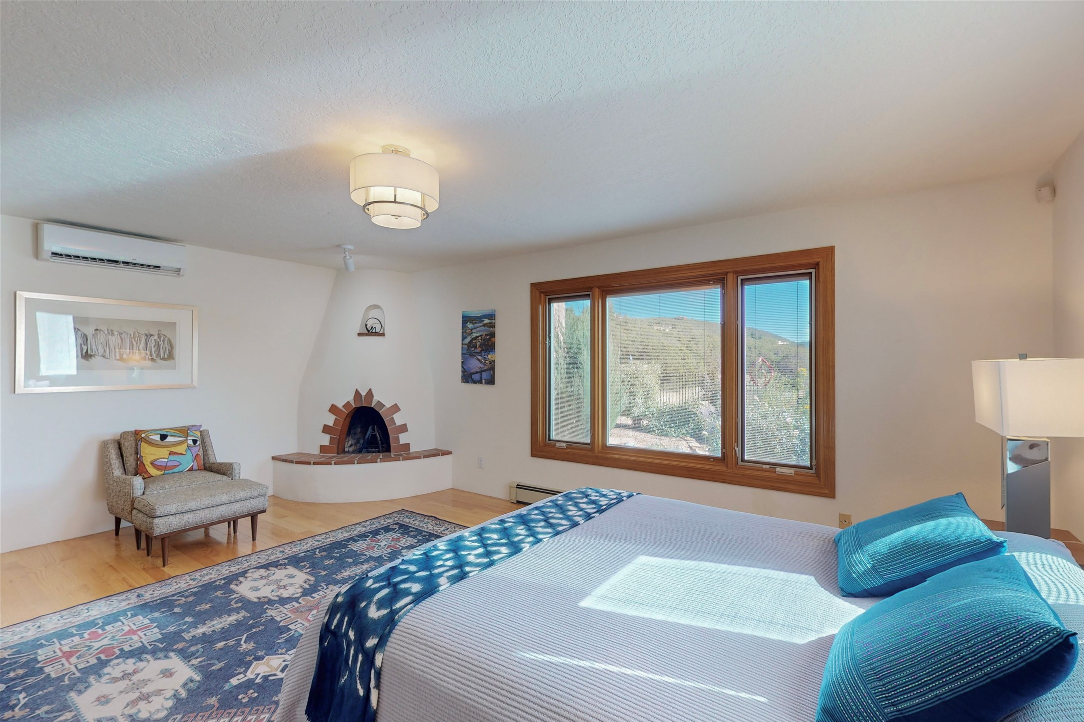 Superb location nestled in the foothills of the Sangre de Cristos is surprisingly private and offers easy access for enjoying all of the amenities of downtown and all the activities of the mountains (hiking, skiing, biking, etc...). The idyllic setting boasts tons of outdoor portal space to enjoy the lovely gardens and views toward the southwest, including Sun and Moon mountains. Set on just over one acre, including an enclosed fenced area, has direct mountain access. This sun-filled home embraces all that is the land of enchantment with 2 of the 4 bedrooms featuring full en-suites, 5 wood burning kiva fireplaces (1 outdoor), two kitchens, and a steam shower. The floor plan could be desirable for multi-generational options which is highlighted by one level access.