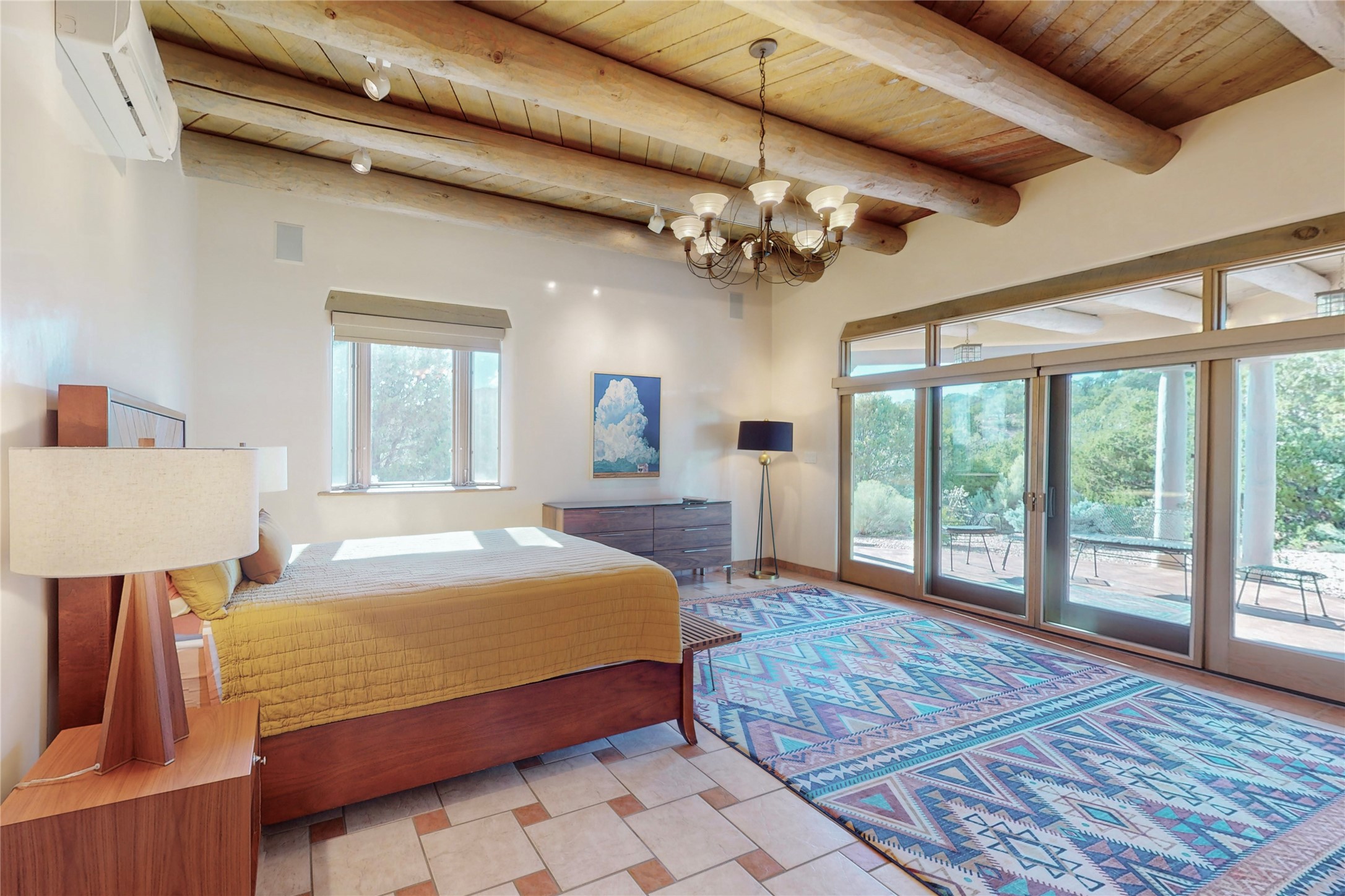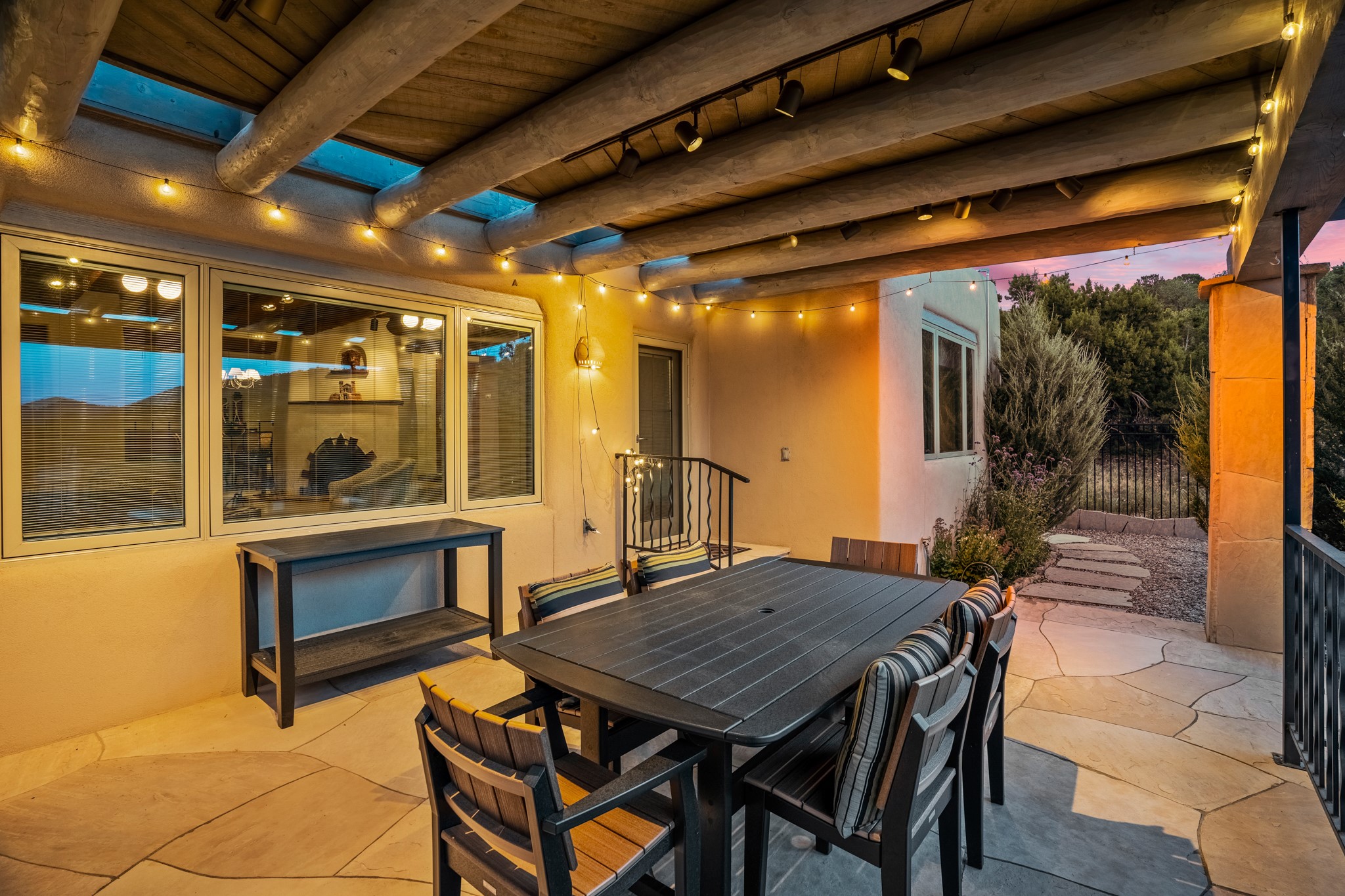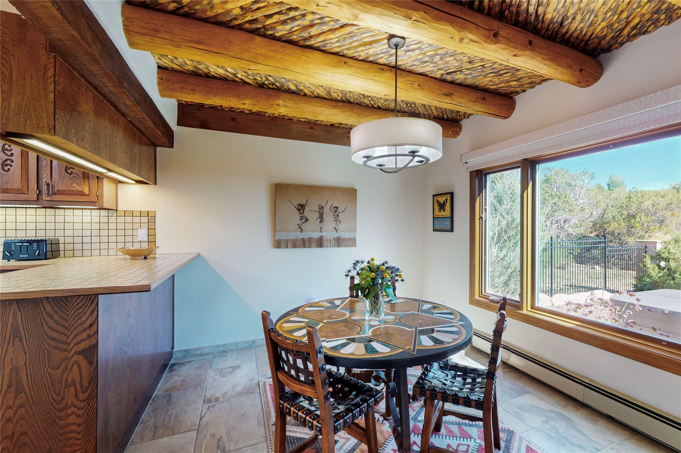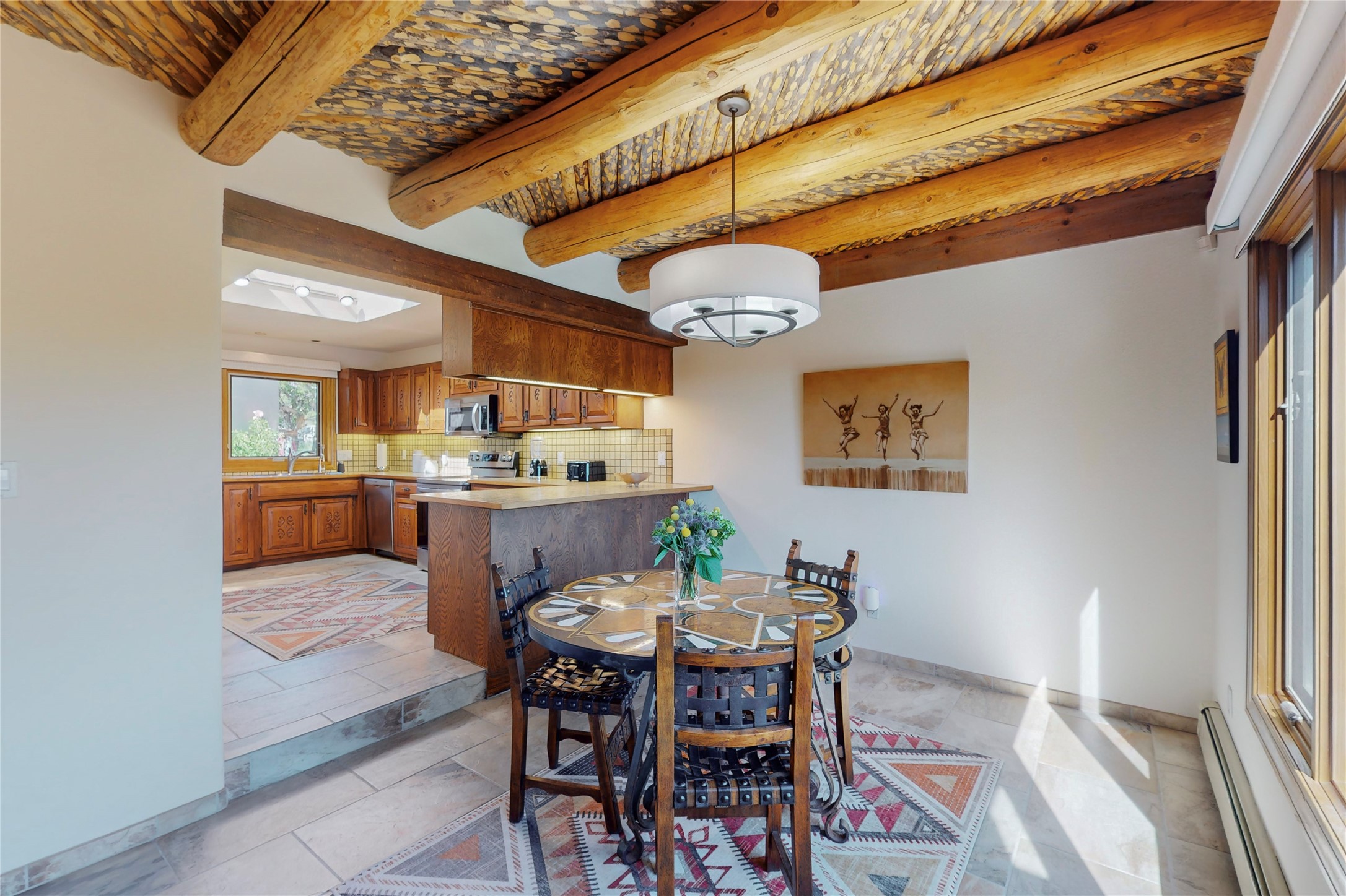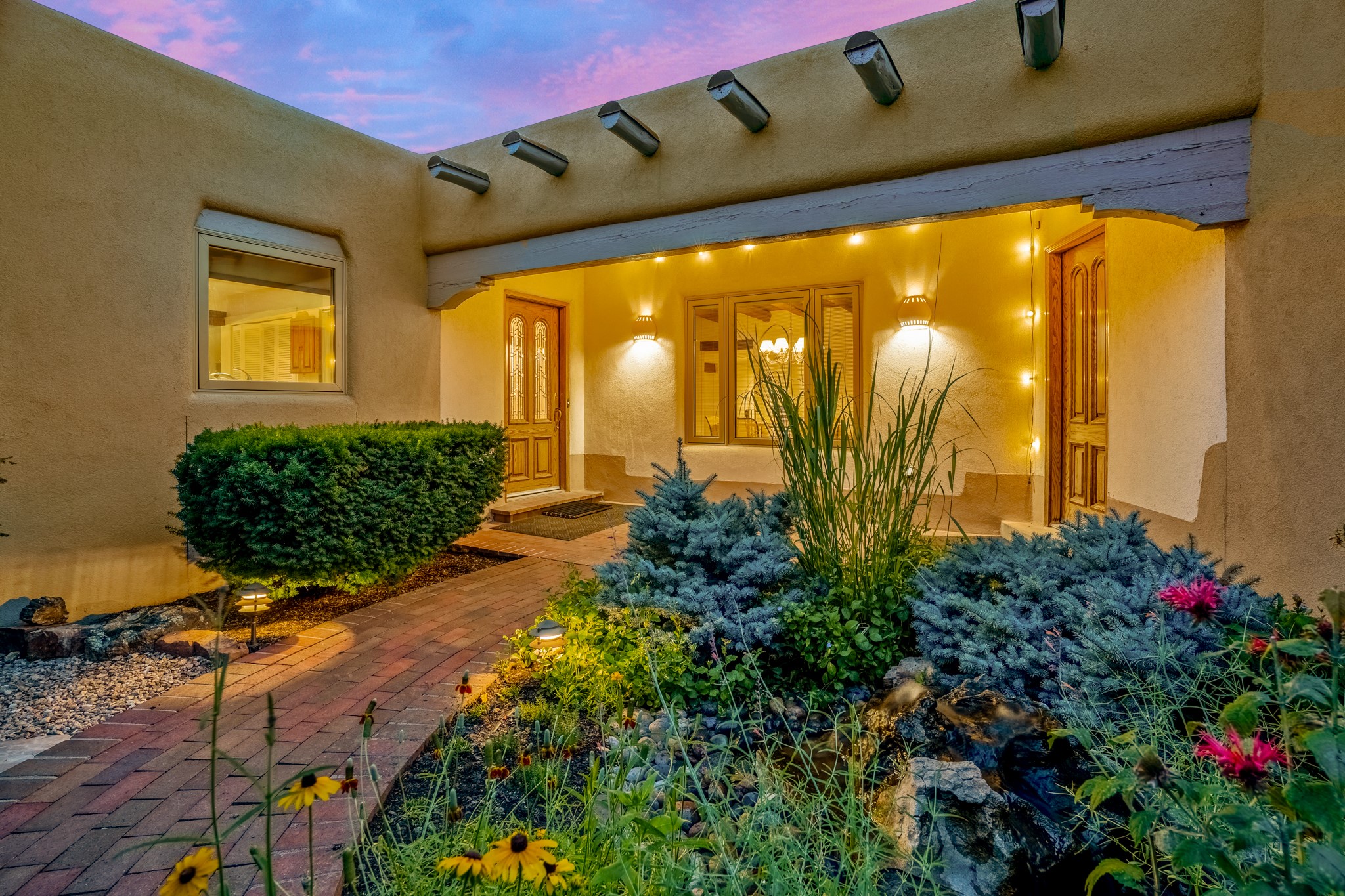 Superb location nestled in the foothills of the Sangre de Cristos is surprisingly private and offers easy access for enjoying all of the amenities of downtown and all the activities of the mountains (hiking, skiing, biking, etc...). The idyllic setting boasts tons of outdoor portal space to enjoy the lovely gardens and views toward the southwest, including Sun and Moon mountains. Set on just over one acre, including an enclosed fenced area, has direct mountain access. This sun-filled home embraces all that is the land of enchantment with 2 of the 4 bedrooms featuring full en-suites, 5 wood burning kiva fireplaces (1 outdoor), two kitchens, and a steam shower. The floor plan could be desirable for multi-generational options which is highlighted by one level access.