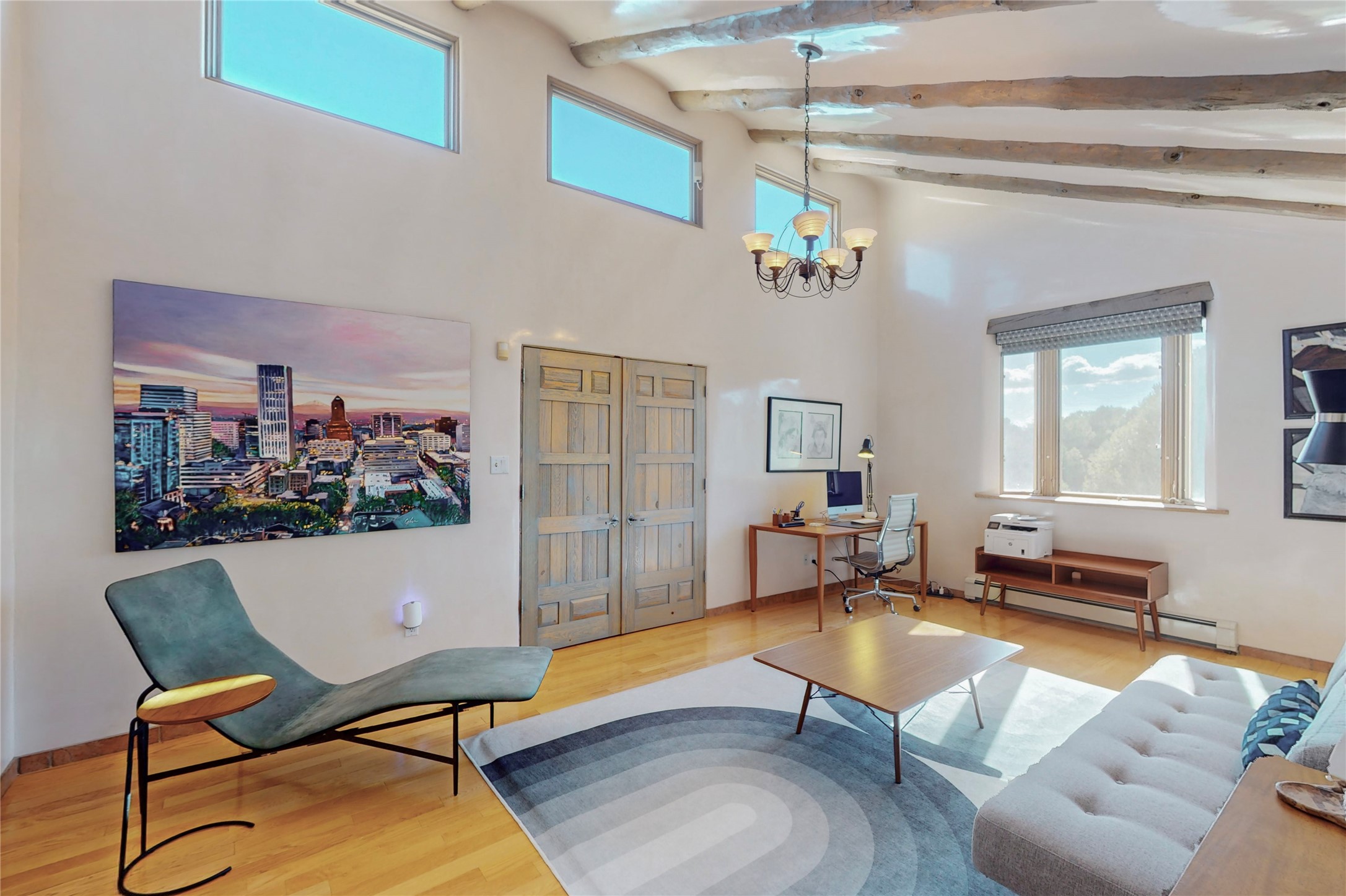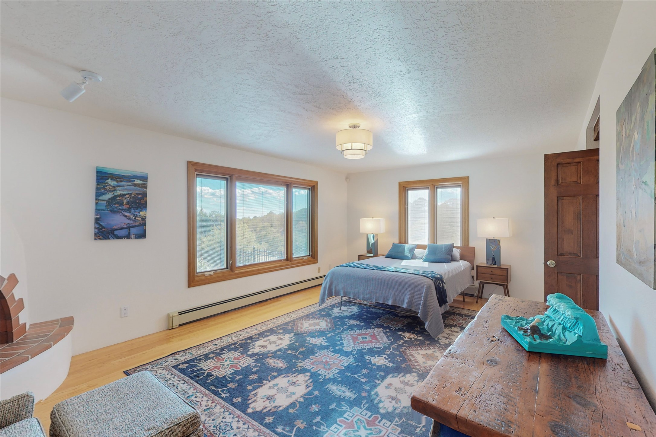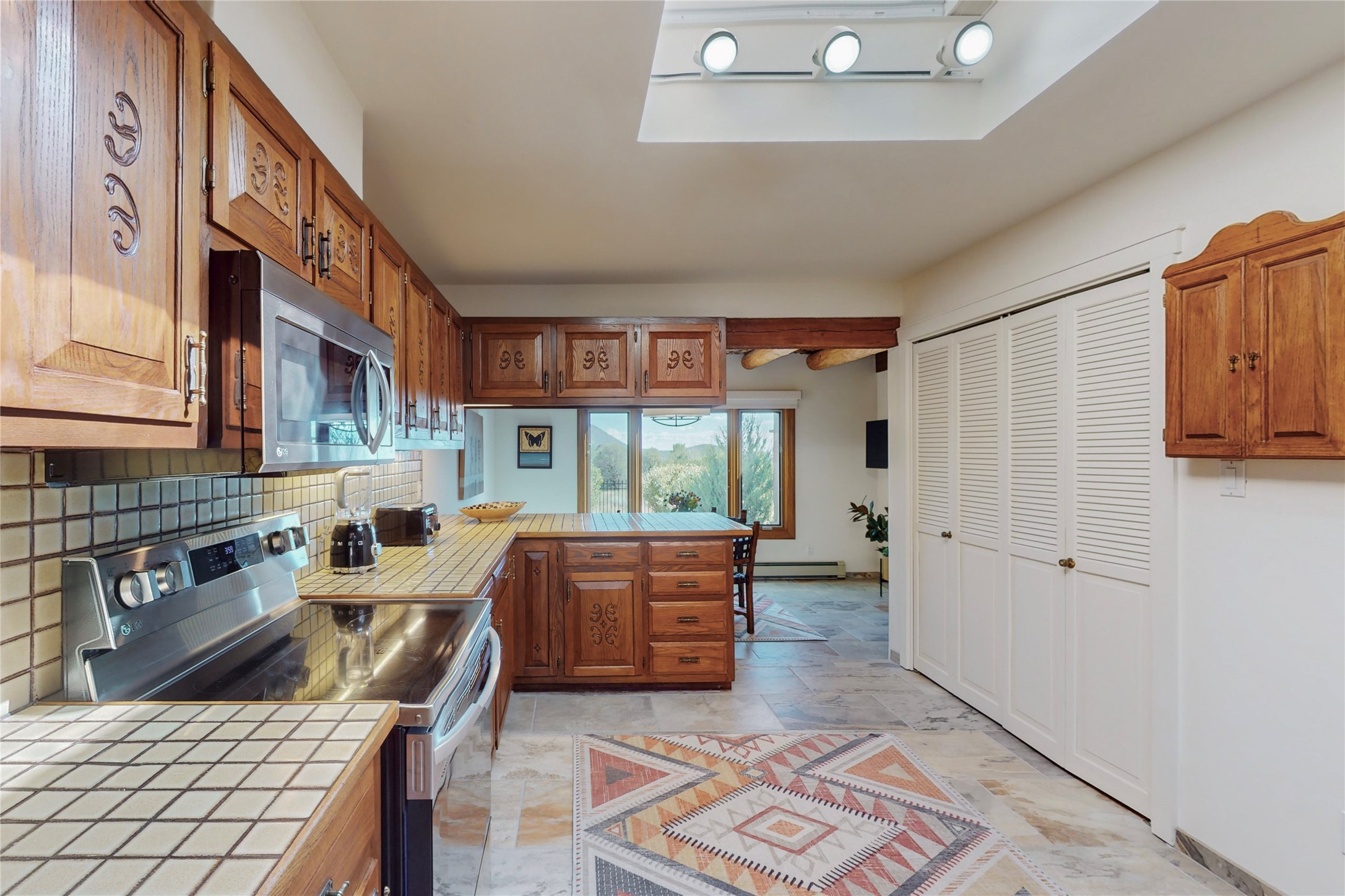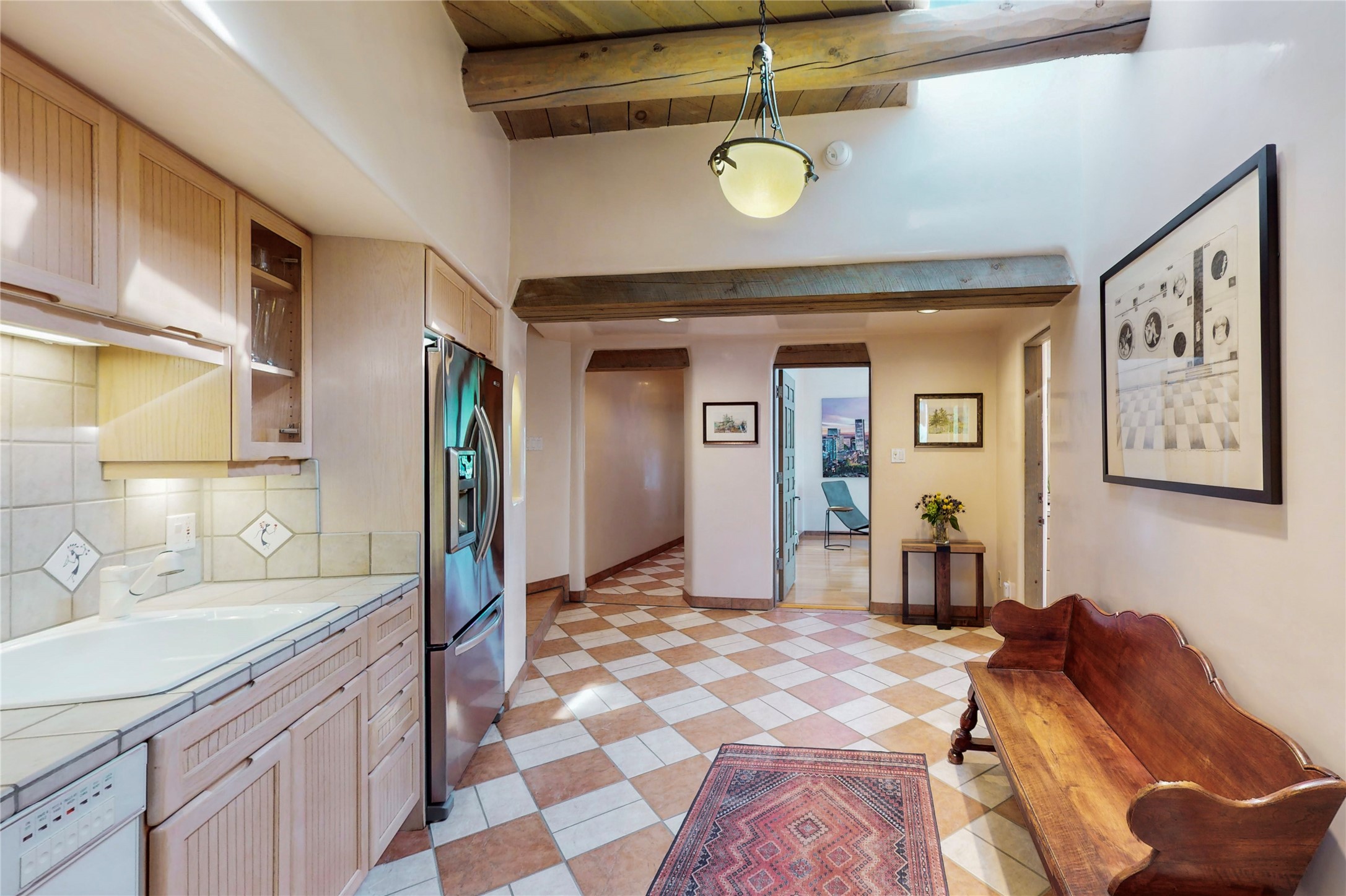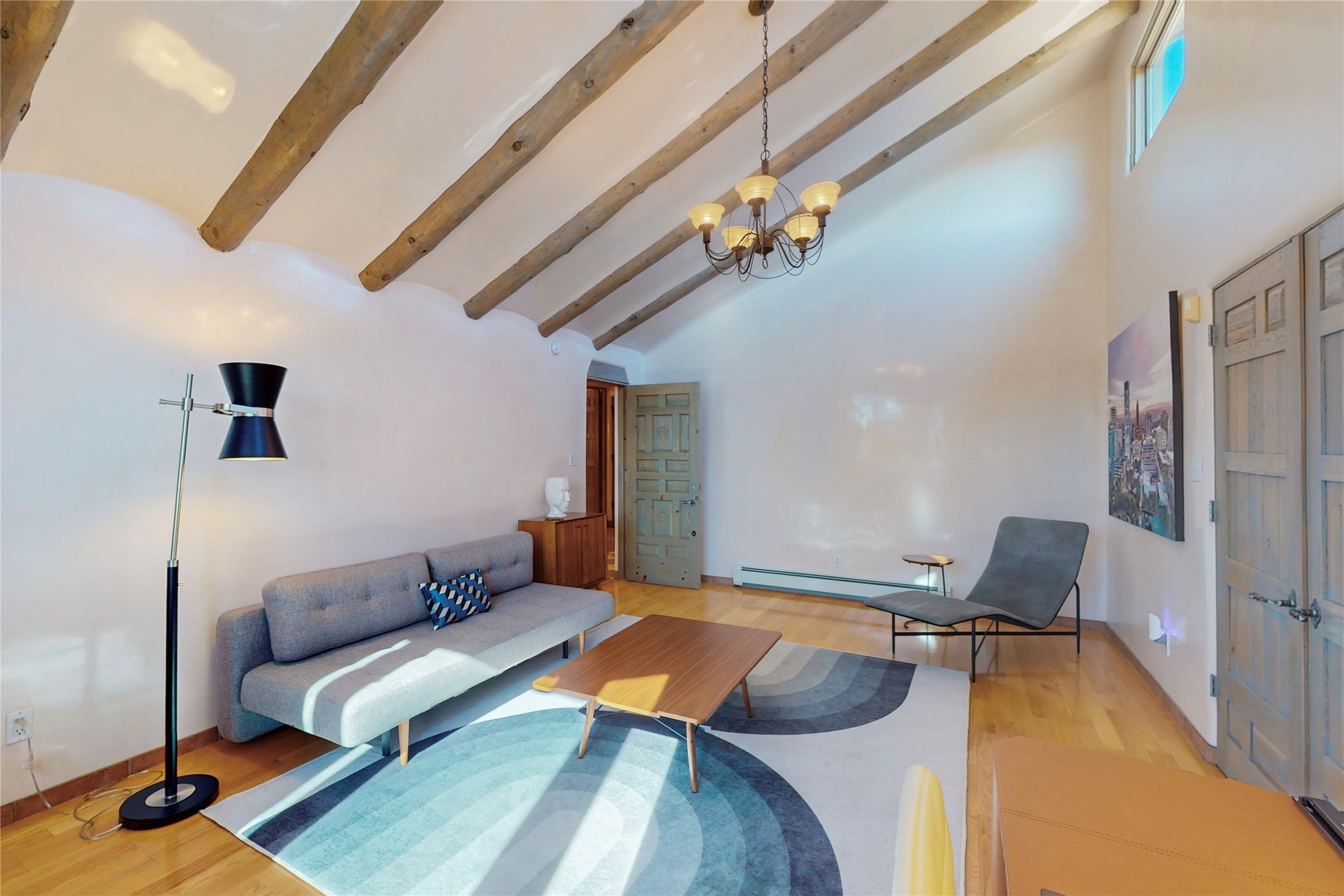 Superb location nestled in the foothills of the Sangre de Cristos is surprisingly private and offers easy access for enjoying all of the amenities of downtown and all the activities of the mountains (hiking, skiing, biking, etc...). The idyllic setting boasts tons of outdoor portal space to enjoy the lovely gardens and views toward the southwest, including Sun and Moon mountains. Set on just over one acre, including an enclosed fenced area, has direct mountain access. This sun-filled home embraces all that is the land of enchantment with 2 of the 4 bedrooms featuring full en-suites, 5 wood burning kiva fireplaces (1 outdoor), two kitchens, and a steam shower. The floor plan could be desirable for multi-generational options which is highlighted by one level access.