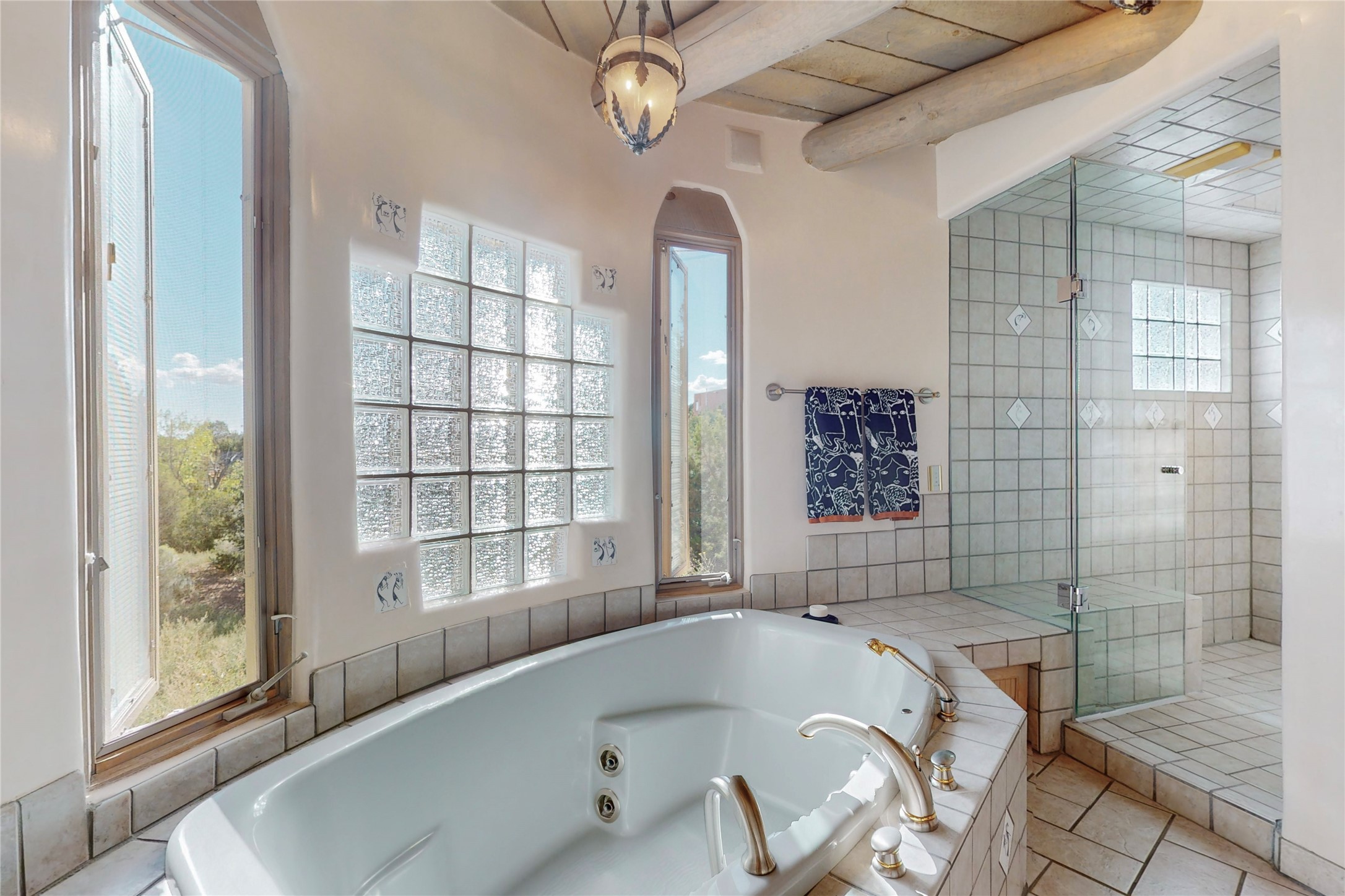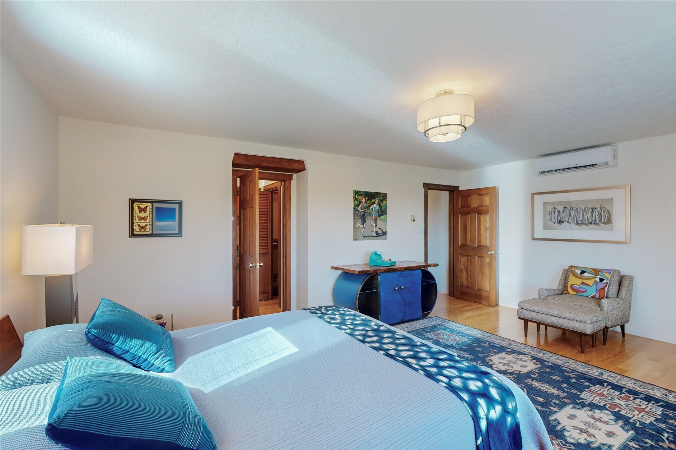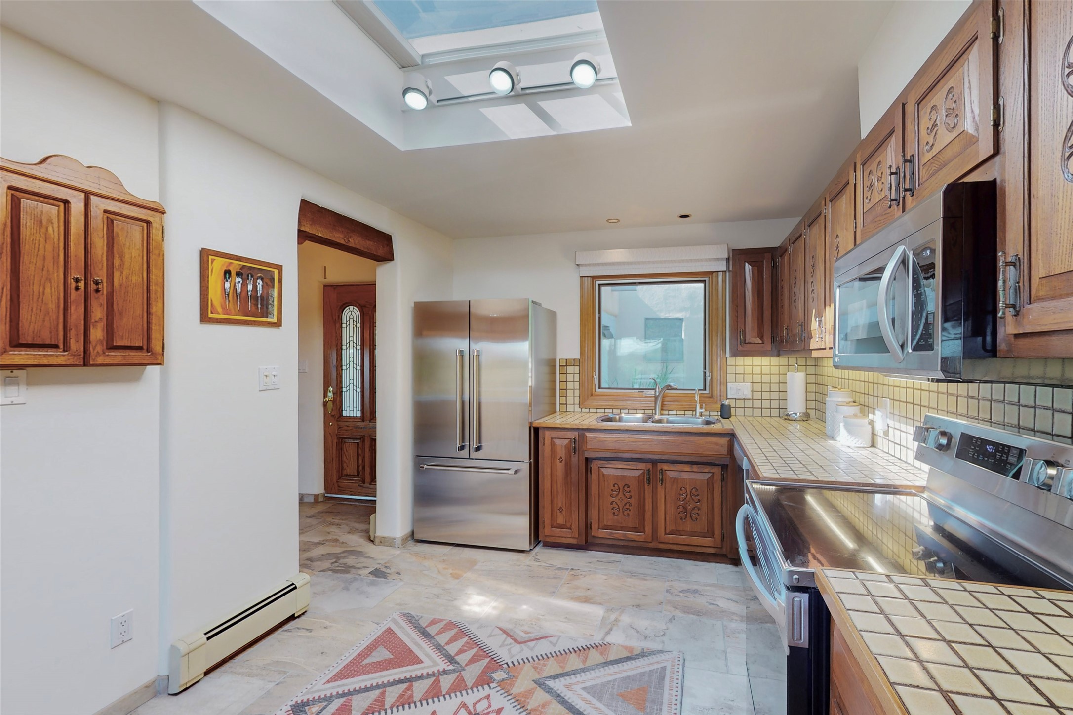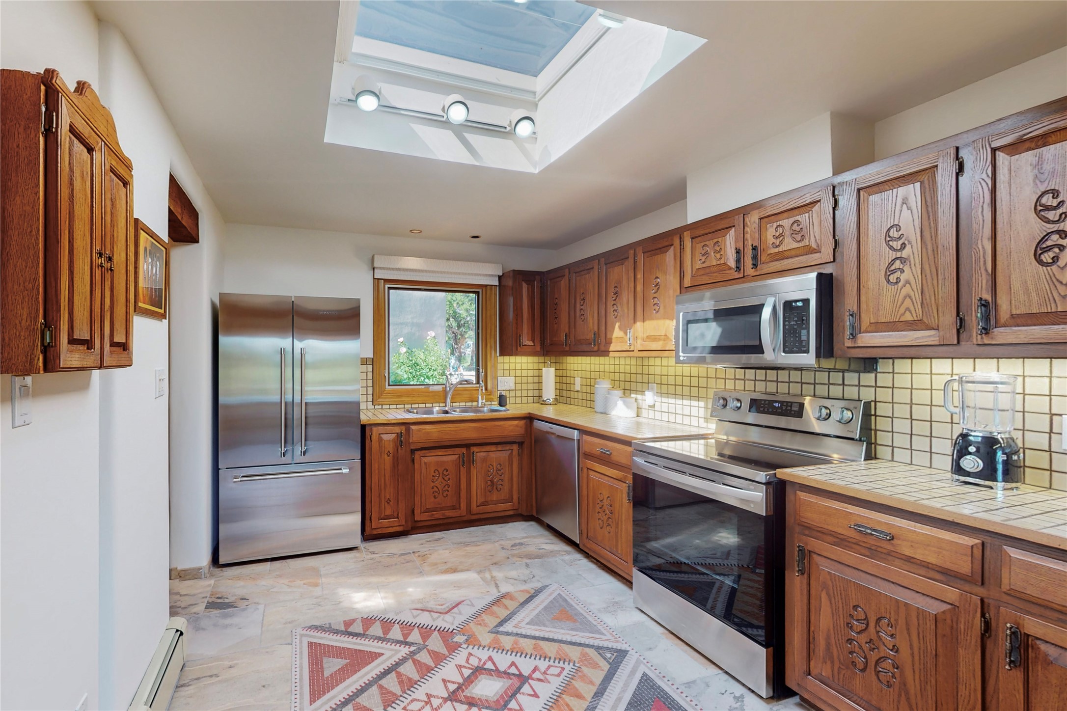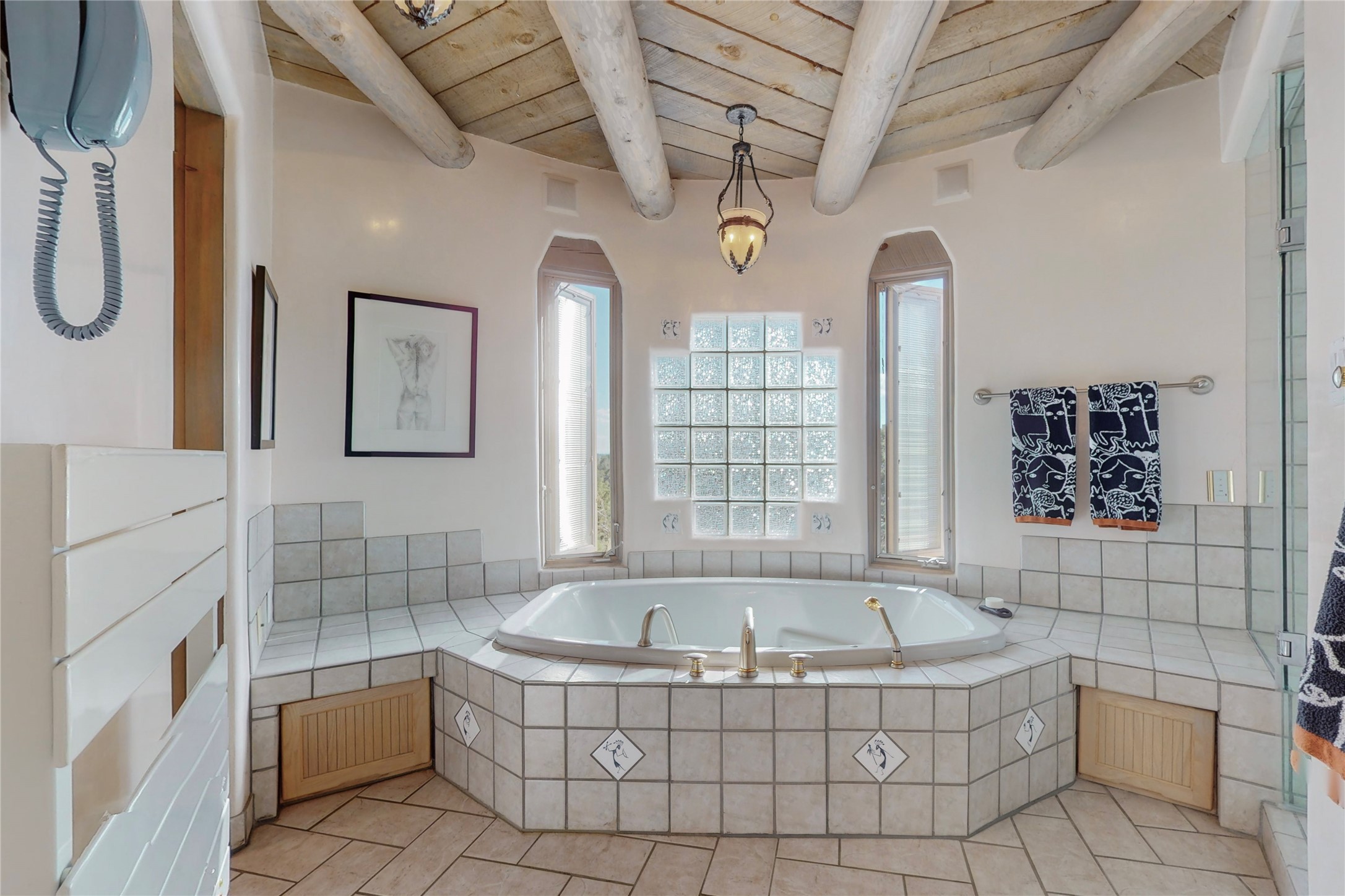 Superb location nestled in the foothills of the Sangre de Cristos is surprisingly private and offers easy access for enjoying all of the amenities of downtown and all the activities of the mountains (hiking, skiing, biking, etc...). The idyllic setting boasts tons of outdoor portal space to enjoy the lovely gardens and views toward the southwest, including Sun and Moon mountains. Set on just over one acre, including an enclosed fenced area, has direct mountain access. This sun-filled home embraces all that is the land of enchantment with 2 of the 4 bedrooms featuring full en-suites, 5 wood burning kiva fireplaces (1 outdoor), two kitchens, and a steam shower. The floor plan could be desirable for multi-generational options which is highlighted by one level access.