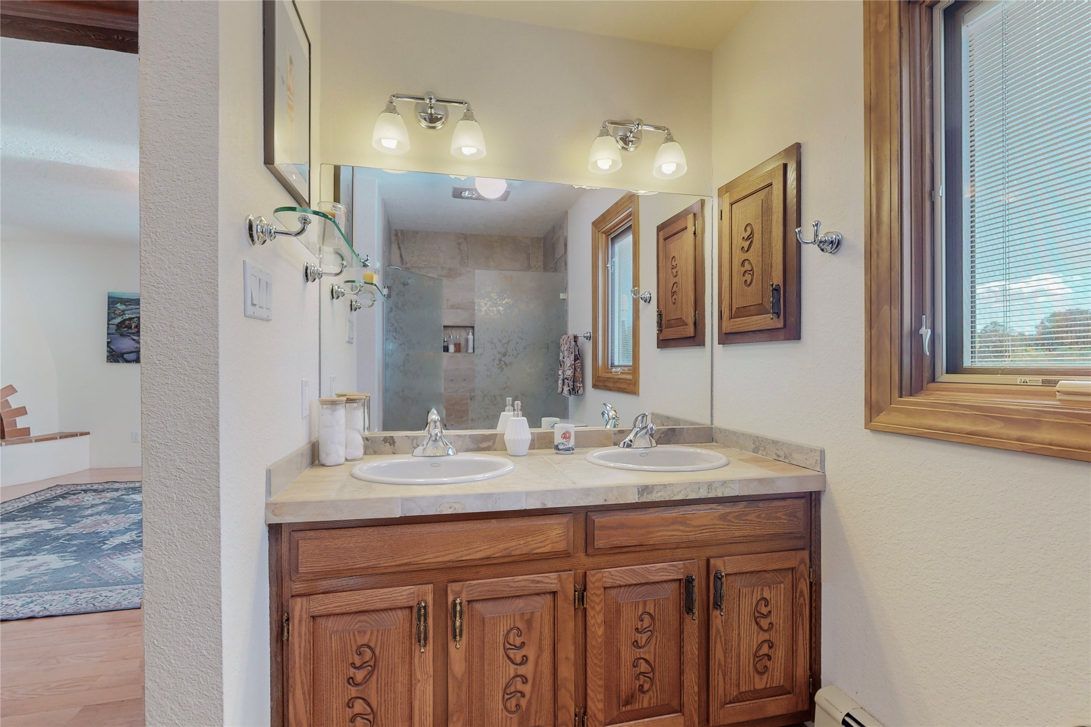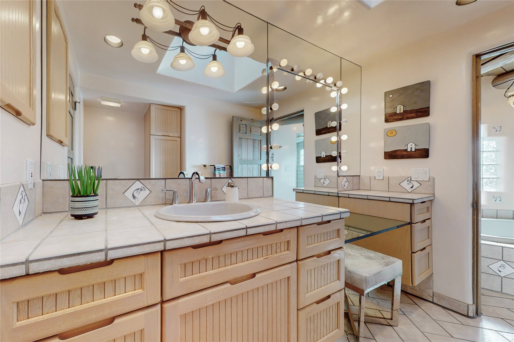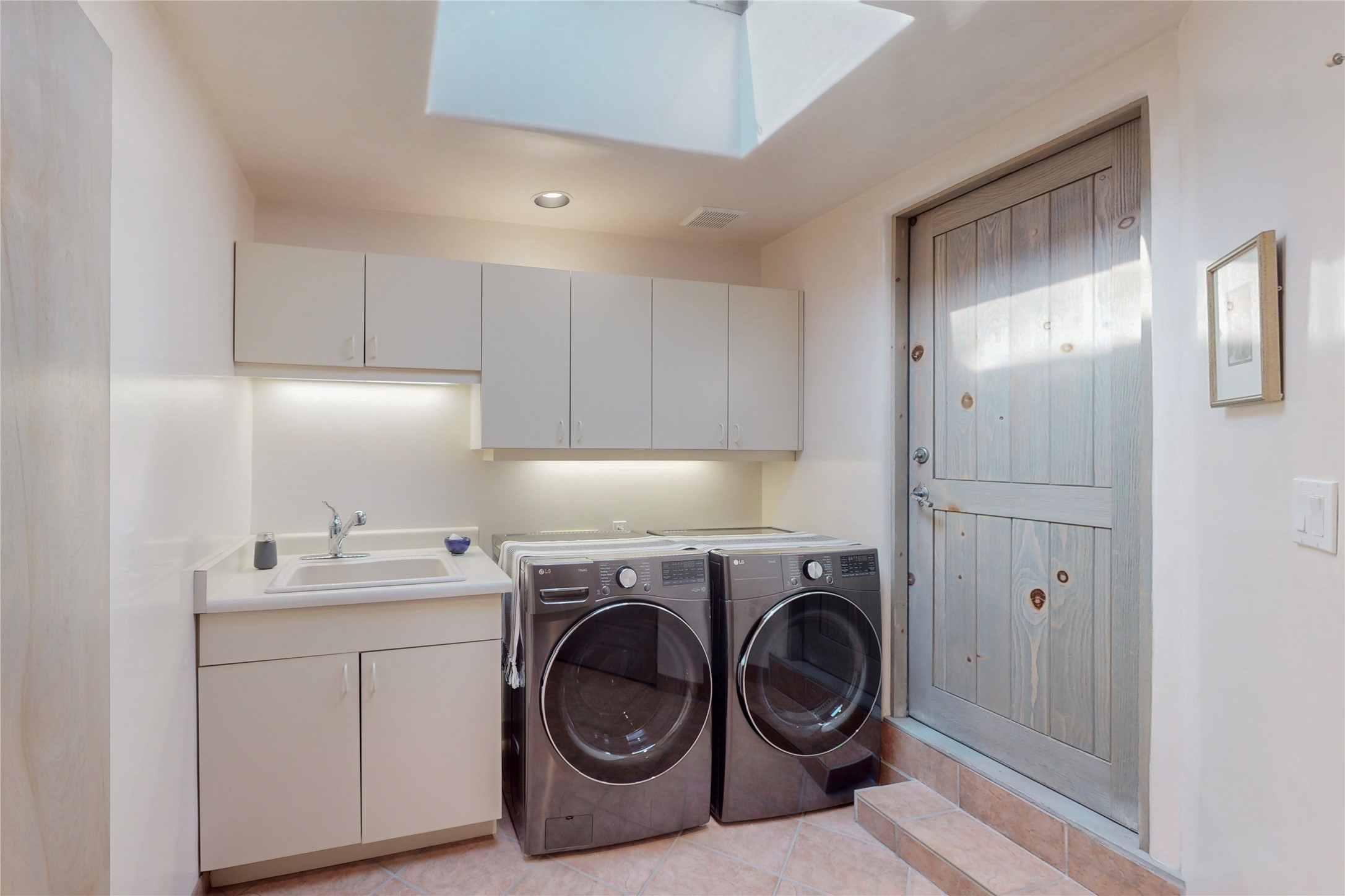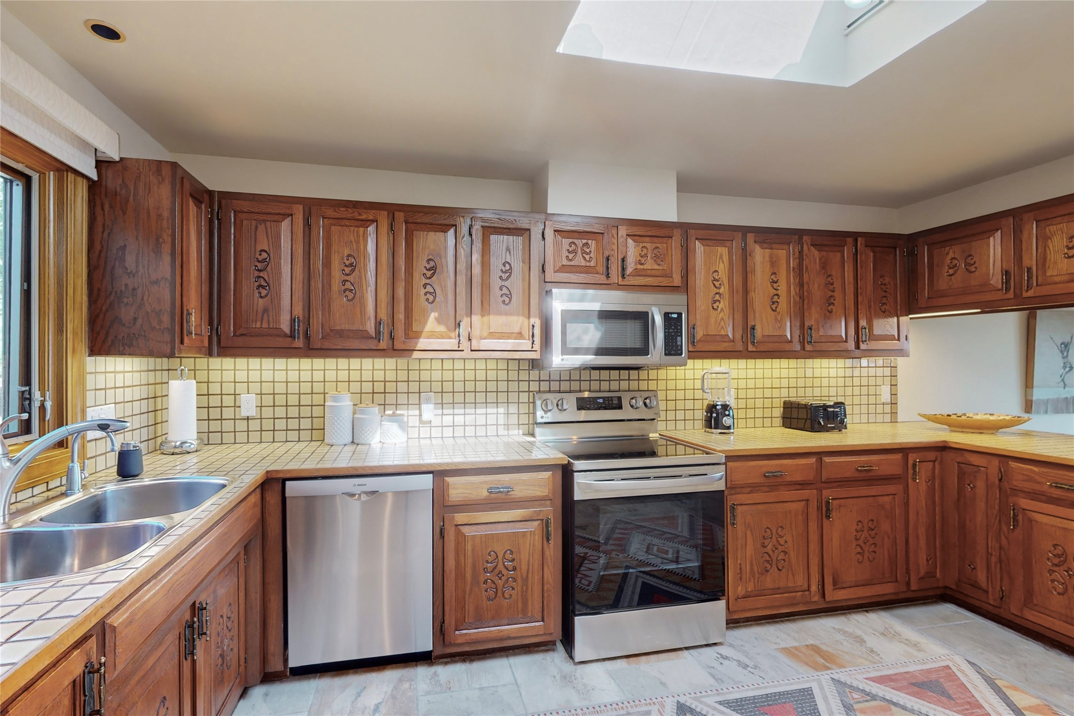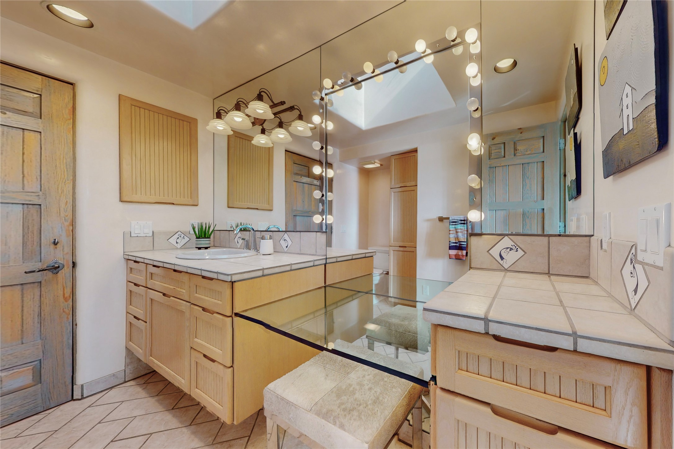 Superb location nestled in the foothills of the Sangre de Cristos is surprisingly private and offers easy access for enjoying all of the amenities of downtown and all the activities of the mountains (hiking, skiing, biking, etc...). The idyllic setting boasts tons of outdoor portal space to enjoy the lovely gardens and views toward the southwest, including Sun and Moon mountains. Set on just over one acre, including an enclosed fenced area, has direct mountain access. This sun-filled home embraces all that is the land of enchantment with 2 of the 4 bedrooms featuring full en-suites, 5 wood burning kiva fireplaces (1 outdoor), two kitchens, and a steam shower. The floor plan could be desirable for multi-generational options which is highlighted by one level access.