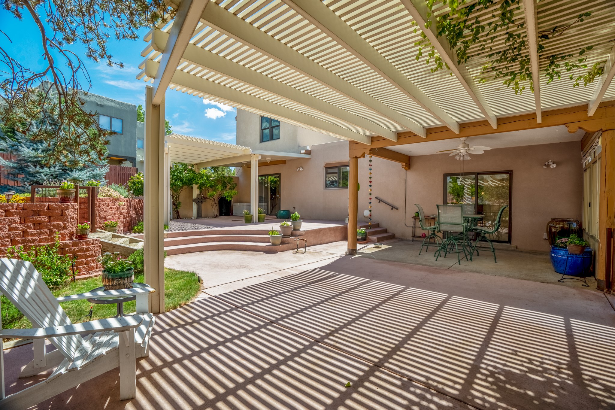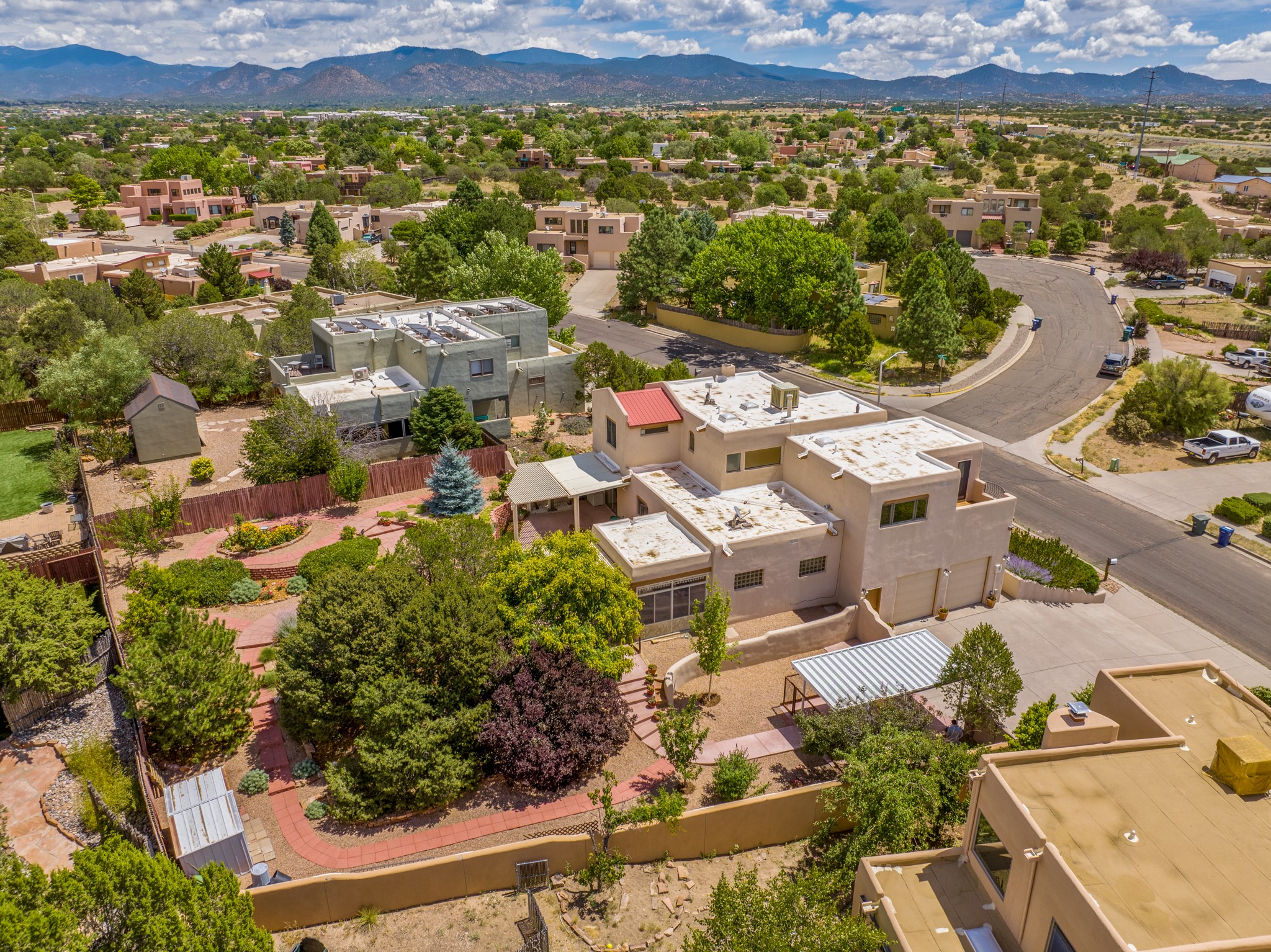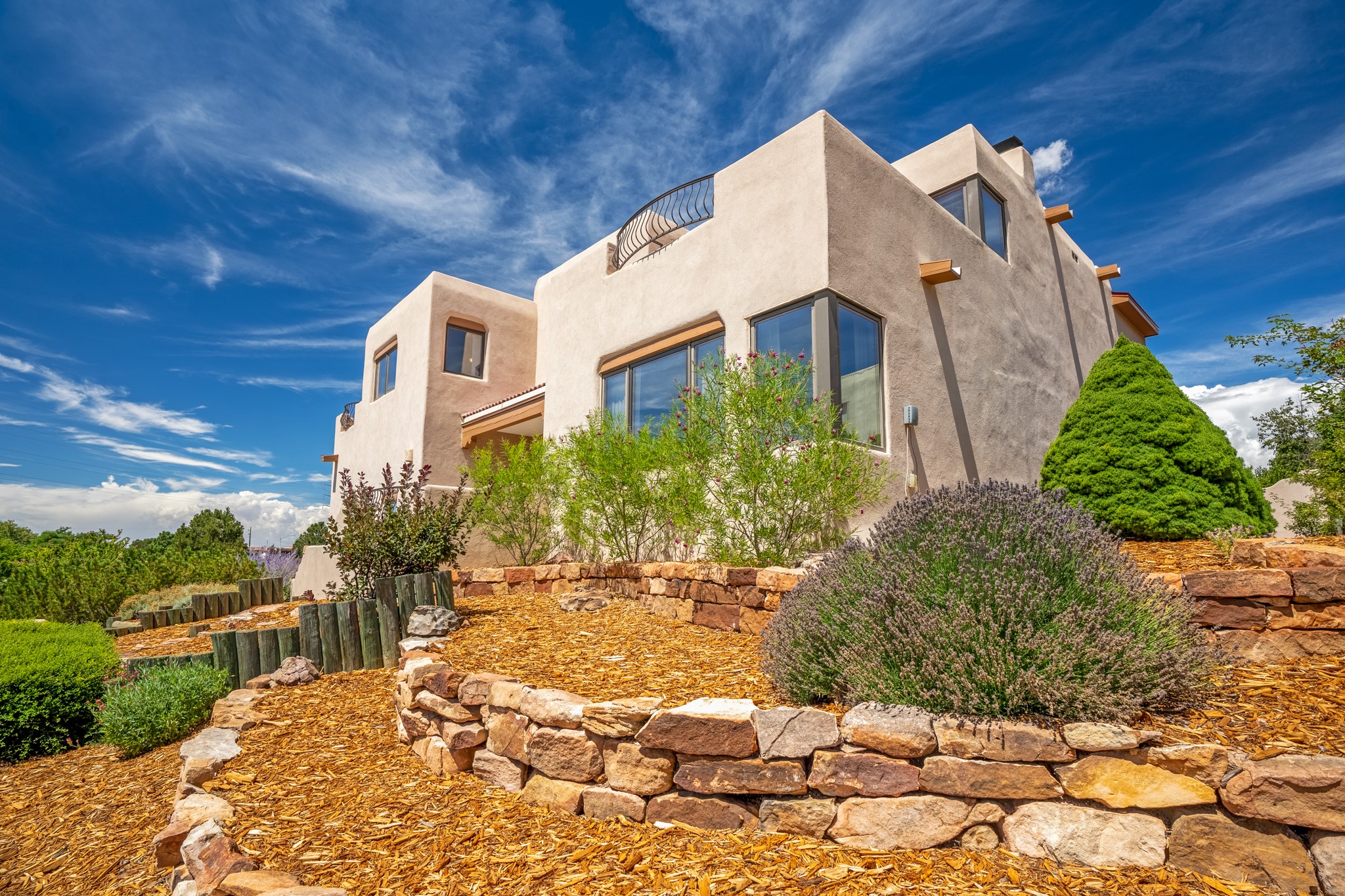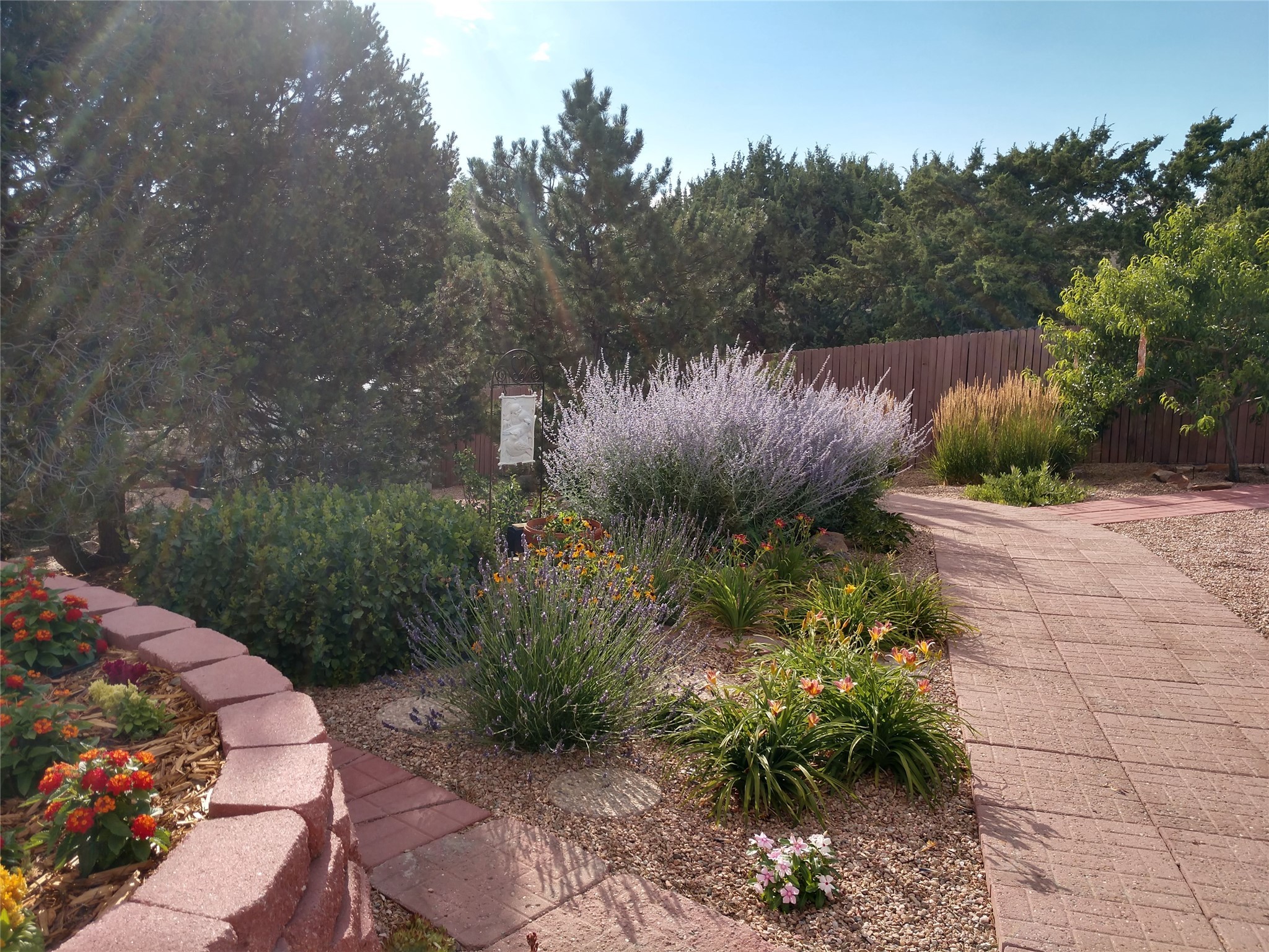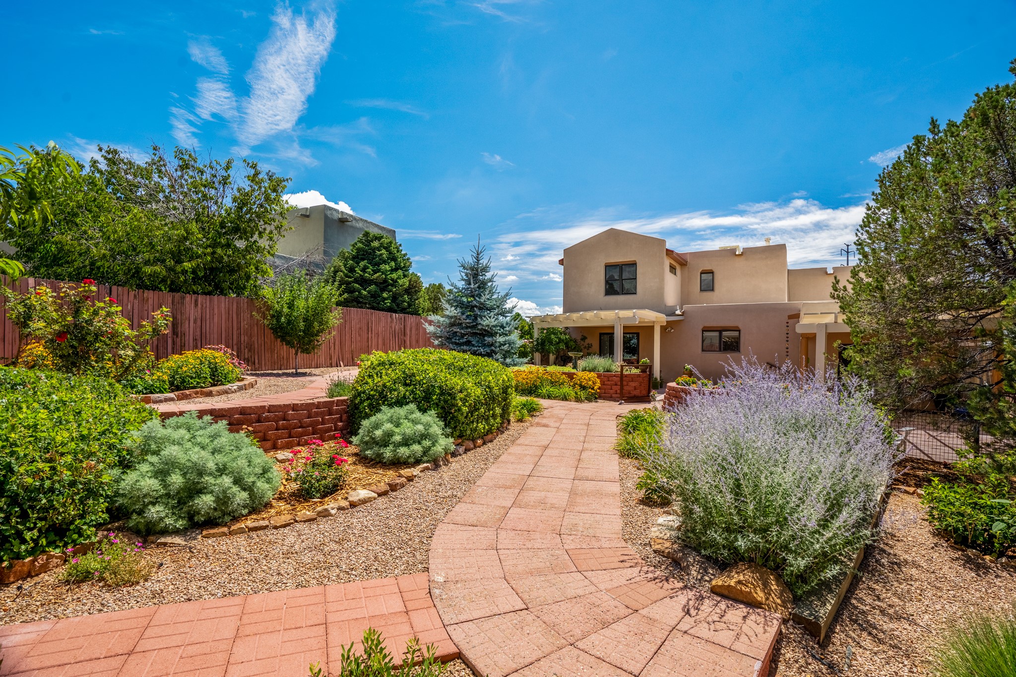 Experience Villa Caballero, a highly sought-after neighborhood known for quiet living, great location, and oversize lots. The area is particularly admired for its marvelous blend of natural beauty and charming residential spaces. One sweet gem is this multi-level home with a flexible floor plan featuring three bedrooms upstairs plus an office/den off the Primary Suite. An optional fourth bedroom is on the main level with access to the backyard pergola offering flexibility in living spaces. All bedrooms are spacious and feature stunning views. This Santa Fe style home is complete with beautiful vigas, nichos, and kiva fireplace on the main floor with plenty of space to entertain. The spacious primary bedroom suite offers a comfortable retreat, including a large bath with jetted tub and a separate office/sitting space and a view deck to enjoy sunsets and mountain views. The separated bedroom plan ensures privacy for everyone in the household and includes an additional view deck. The kitchen is spacious including an island and access to a huge utility/laundry room. A flexible family/dining/tv room with access to the back pergola is just off the kitchen in one direction and the formal dining and living room are off the other direction. This is truly a fabulous home for ease of entertaining. In addition, the views out virtually every window allow enjoyment of the breathtaking scenery and views, and invite you to soak in the surrounding beauty.Speaking of beauty, the lush and mature landscaping of this home boasts wonderful pathways meandering through multiple fruit trees, flowering beds, and shrubs. The thoughtful design creates a serene and inviting atmosphere. To add to the tranquility, there's even a large backyard pergola, perfect for peaceful entertaining and relaxation with wonderful architectural plays of shadow and light.Not only will you feel at peace in this home, but the lush landscaping will also attract birds and bees, creating a haven for wildlife enthusiasts and nature lovers alike. It truly is a wonderful environment to appreciate the harmony of nature and a great place to call home.