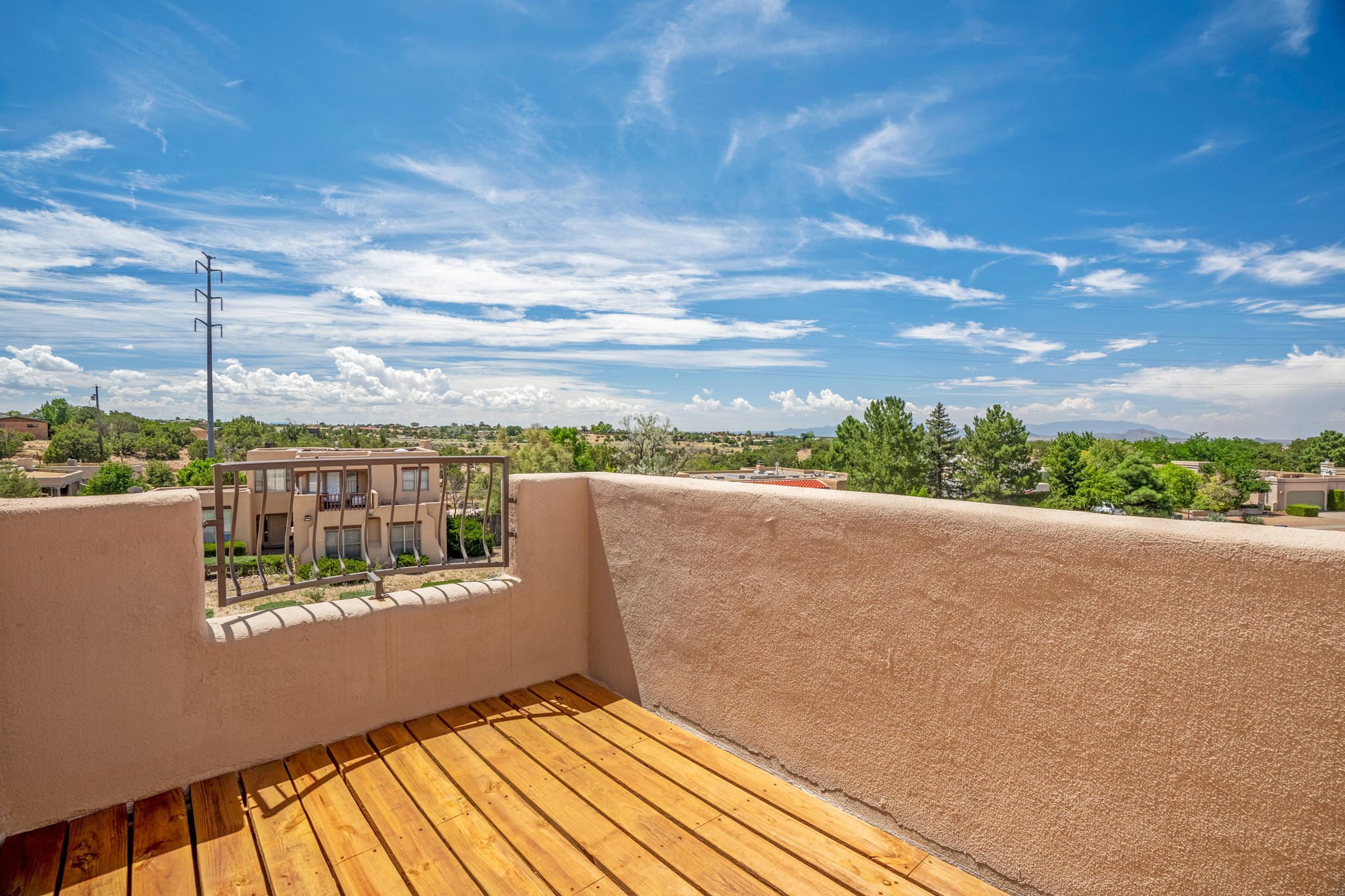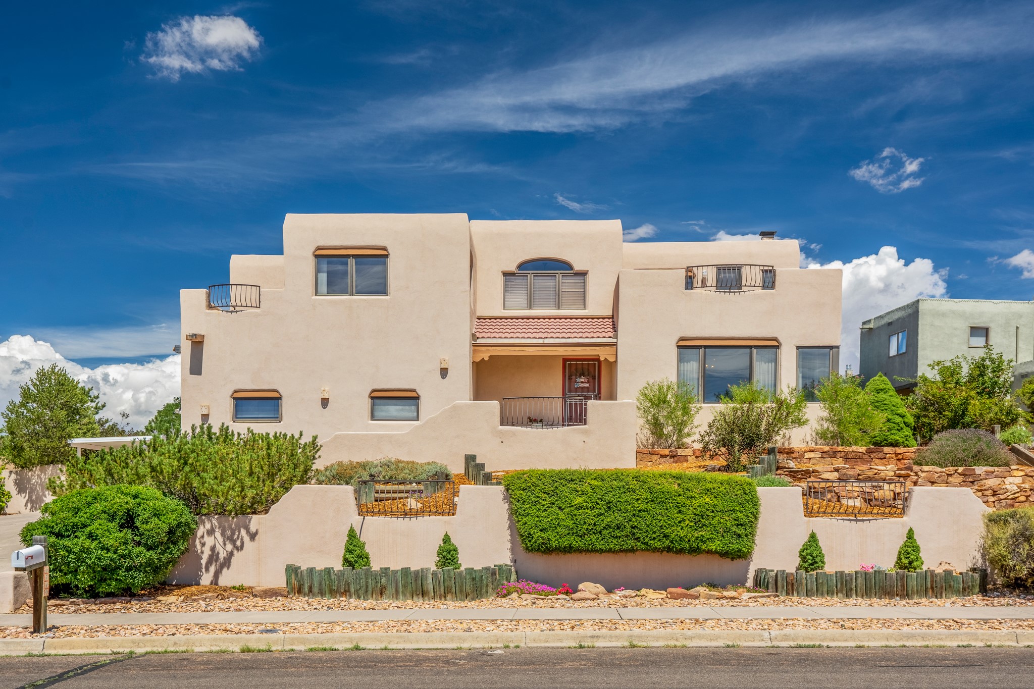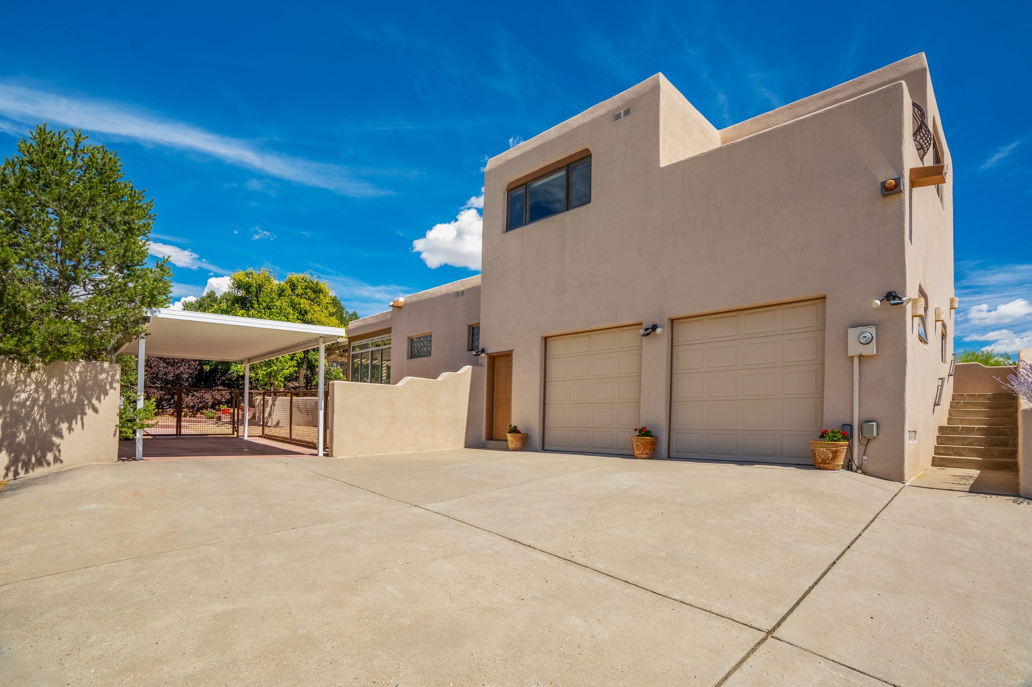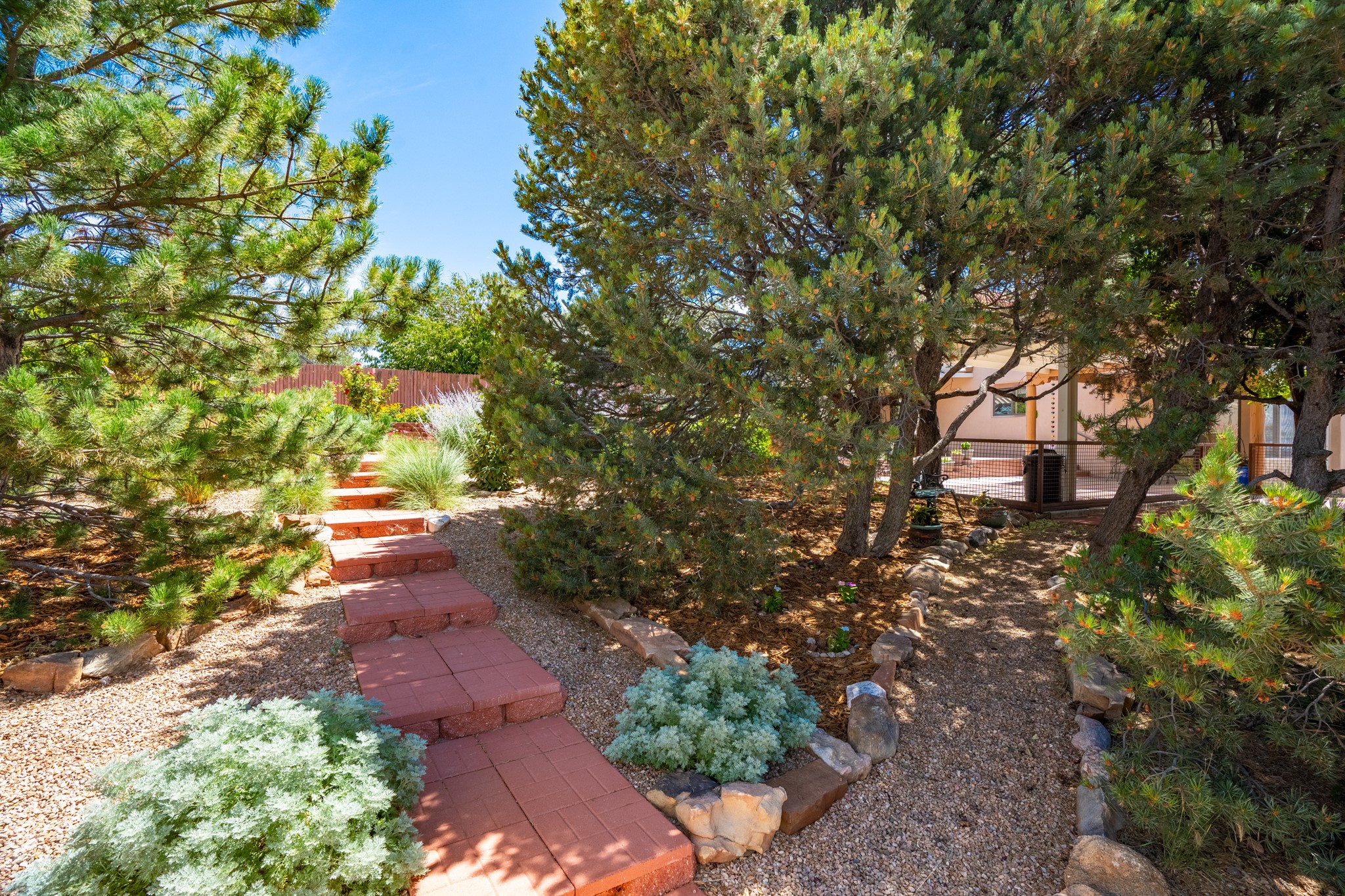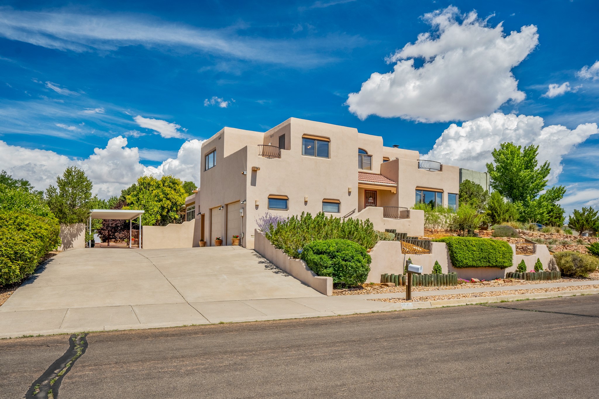 Experience Villa Caballero, a highly sought-after neighborhood known for quiet living, great location, and oversize lots. The area is particularly admired for its marvelous blend of natural beauty and charming residential spaces. One sweet gem is this multi-level home with a flexible floor plan featuring three bedrooms upstairs plus an office/den off the Primary Suite. An optional fourth bedroom is on the main level with access to the backyard pergola offering flexibility in living spaces. All bedrooms are spacious and feature stunning views. This Santa Fe style home is complete with beautiful vigas, nichos, and kiva fireplace on the main floor with plenty of space to entertain. The spacious primary bedroom suite offers a comfortable retreat, including a large bath with jetted tub and a separate office/sitting space and a view deck to enjoy sunsets and mountain views. The separated bedroom plan ensures privacy for everyone in the household and includes an additional view deck. The kitchen is spacious including an island and access to a huge utility/laundry room. A flexible family/dining/tv room with access to the back pergola is just off the kitchen in one direction and the formal dining and living room are off the other direction. This is truly a fabulous home for ease of entertaining. In addition, the views out virtually every window allow enjoyment of the breathtaking scenery and views, and invite you to soak in the surrounding beauty.Speaking of beauty, the lush and mature landscaping of this home boasts wonderful pathways meandering through multiple fruit trees, flowering beds, and shrubs. The thoughtful design creates a serene and inviting atmosphere. To add to the tranquility, there's even a large backyard pergola, perfect for peaceful entertaining and relaxation with wonderful architectural plays of shadow and light.Not only will you feel at peace in this home, but the lush landscaping will also attract birds and bees, creating a haven for wildlife enthusiasts and nature lovers alike. It truly is a wonderful environment to appreciate the harmony of nature and a great place to call home.