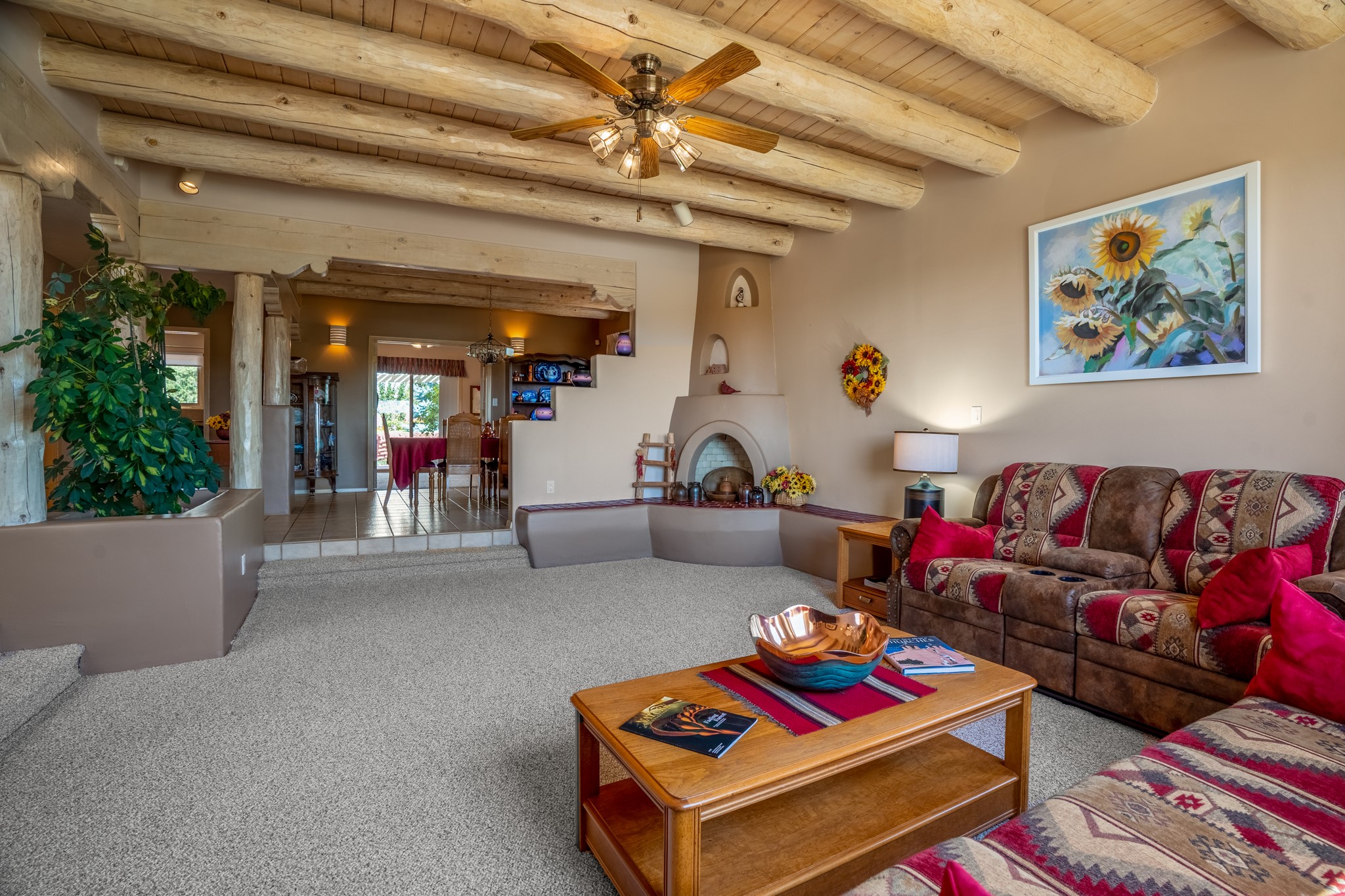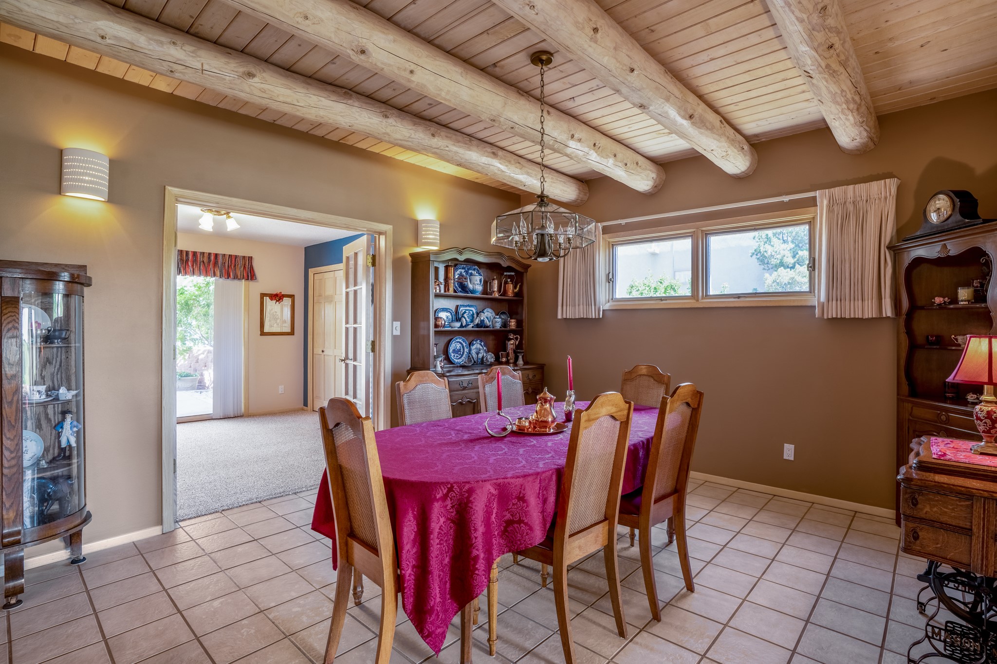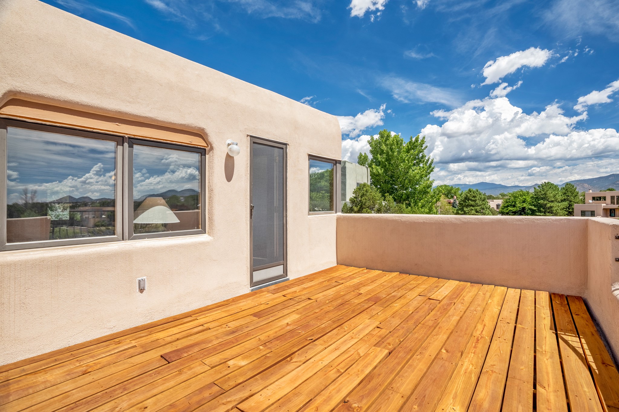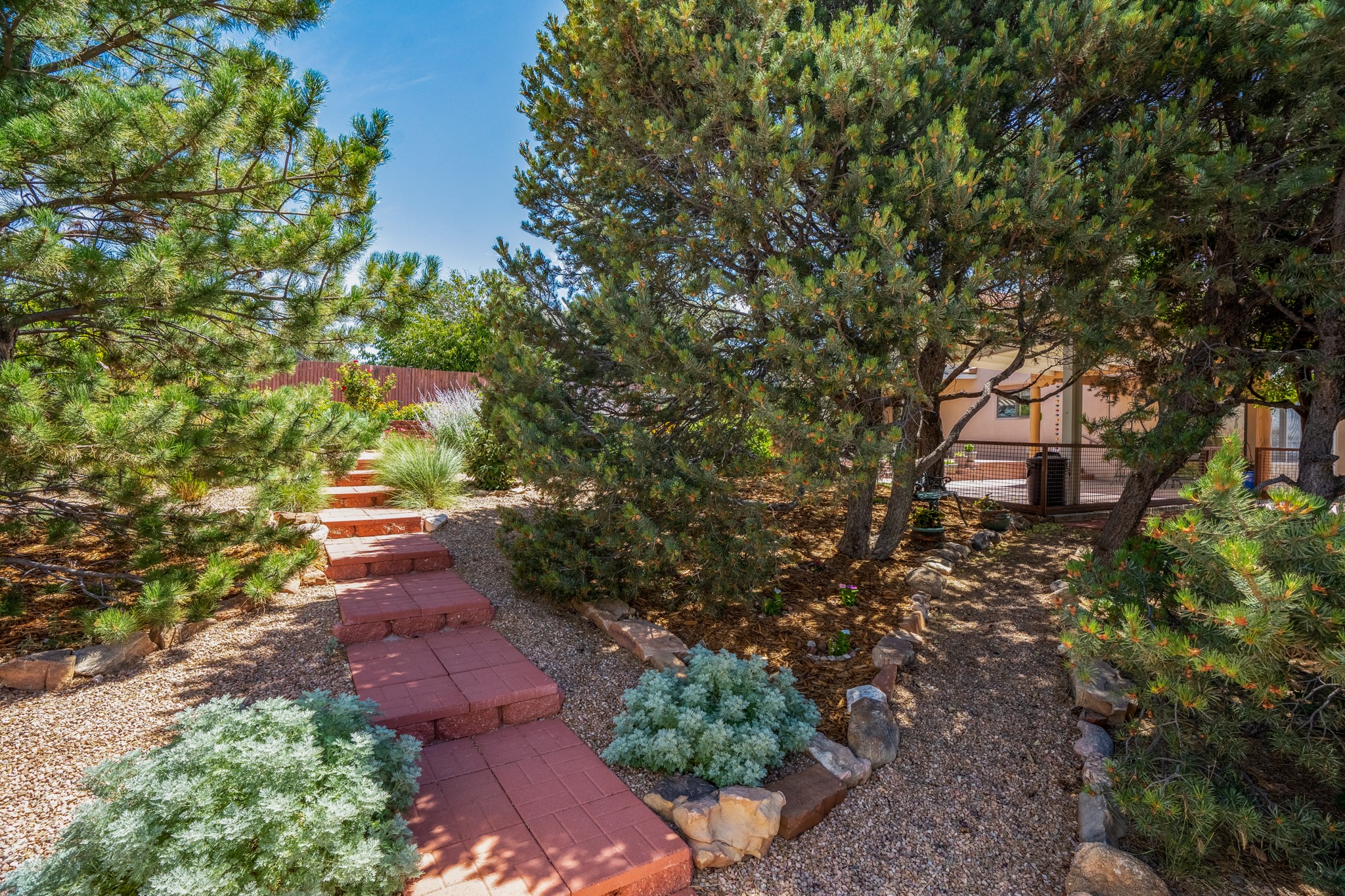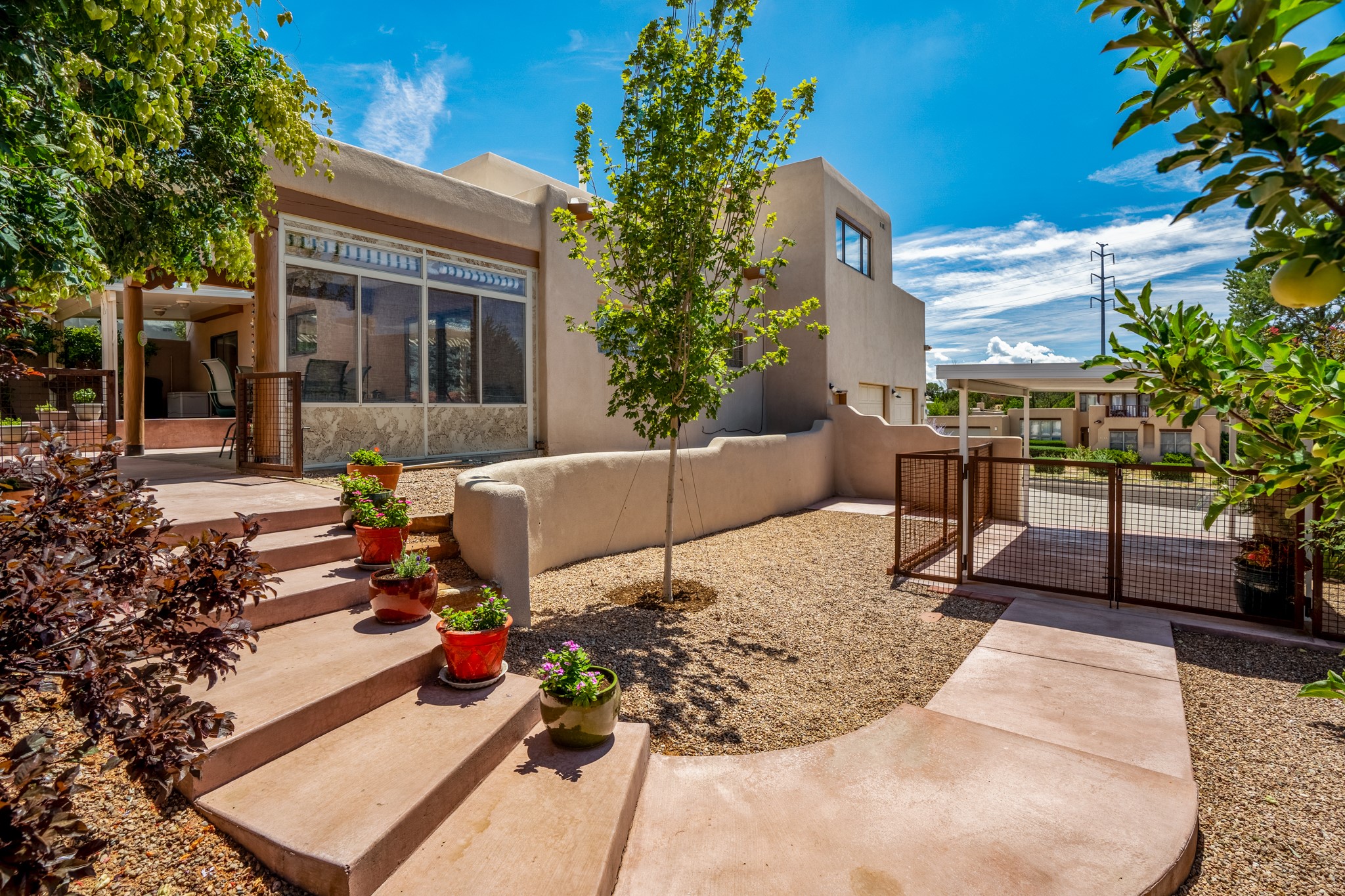 Experience Villa Caballero, a highly sought-after neighborhood known for quiet living, great location, and oversize lots. The area is particularly admired for its marvelous blend of natural beauty and charming residential spaces. One sweet gem is this multi-level home with a flexible floor plan featuring three bedrooms upstairs plus an office/den off the Primary Suite. An optional fourth bedroom is on the main level with access to the backyard pergola offering flexibility in living spaces. All bedrooms are spacious and feature stunning views. This Santa Fe style home is complete with beautiful vigas, nichos, and kiva fireplace on the main floor with plenty of space to entertain. The spacious primary bedroom suite offers a comfortable retreat, including a large bath with jetted tub and a separate office/sitting space and a view deck to enjoy sunsets and mountain views. The separated bedroom plan ensures privacy for everyone in the household and includes an additional view deck. The kitchen is spacious including an island and access to a huge utility/laundry room. A flexible family/dining/tv room with access to the back pergola is just off the kitchen in one direction and the formal dining and living room are off the other direction. This is truly a fabulous home for ease of entertaining. In addition, the views out virtually every window allow enjoyment of the breathtaking scenery and views, and invite you to soak in the surrounding beauty.Speaking of beauty, the lush and mature landscaping of this home boasts wonderful pathways meandering through multiple fruit trees, flowering beds, and shrubs. The thoughtful design creates a serene and inviting atmosphere. To add to the tranquility, there's even a large backyard pergola, perfect for peaceful entertaining and relaxation with wonderful architectural plays of shadow and light.Not only will you feel at peace in this home, but the lush landscaping will also attract birds and bees, creating a haven for wildlife enthusiasts and nature lovers alike. It truly is a wonderful environment to appreciate the harmony of nature and a great place to call home.