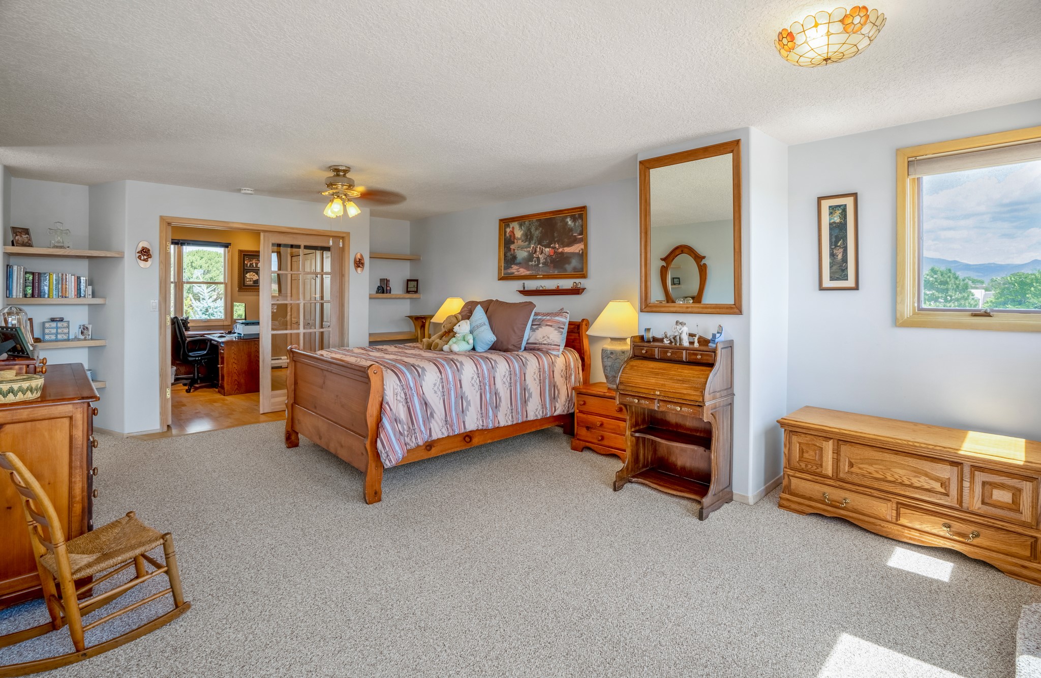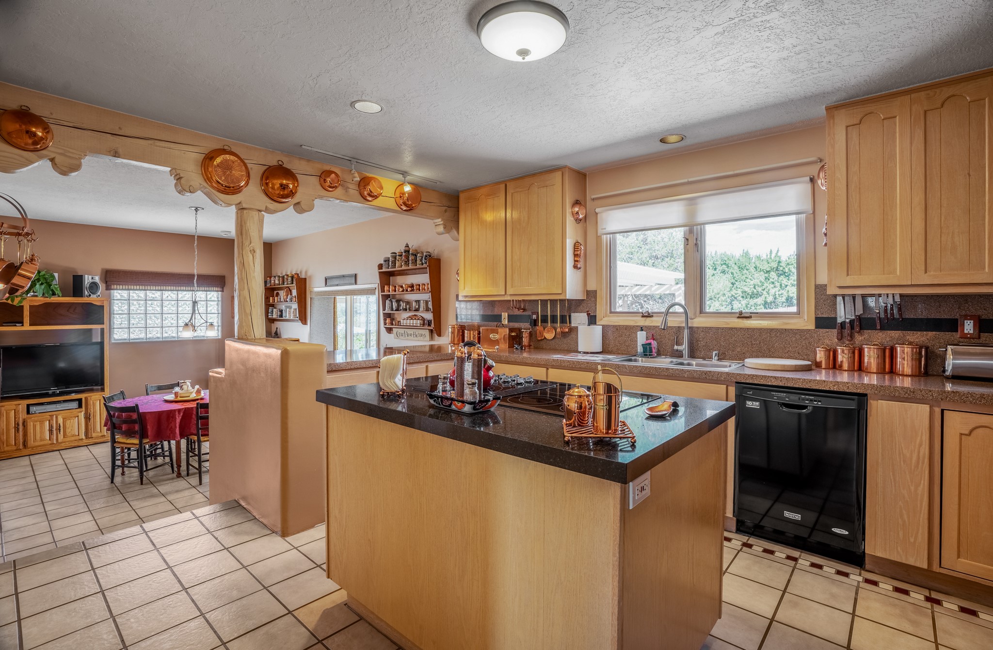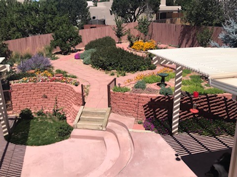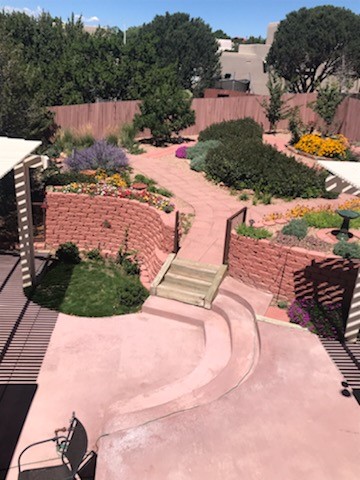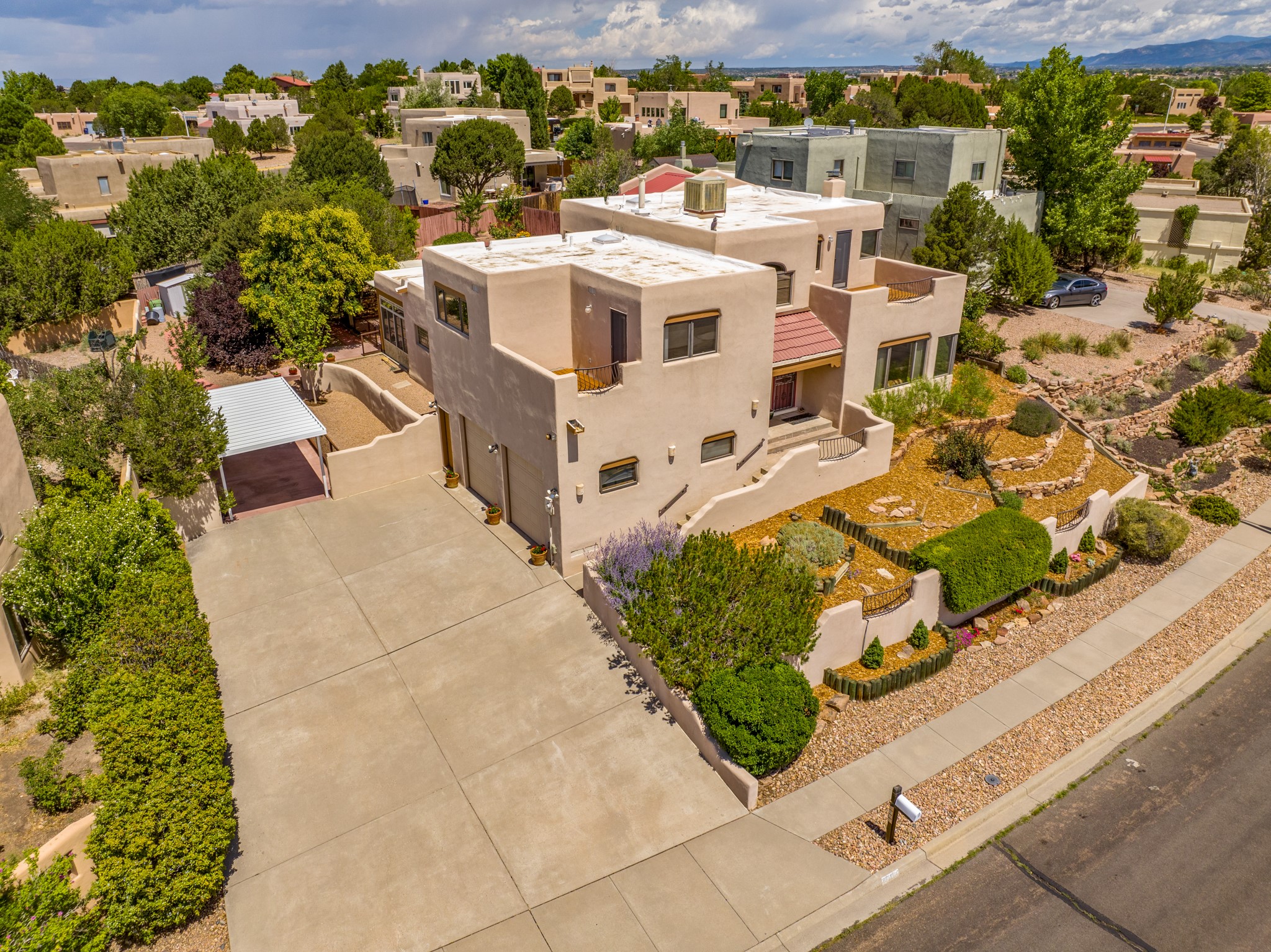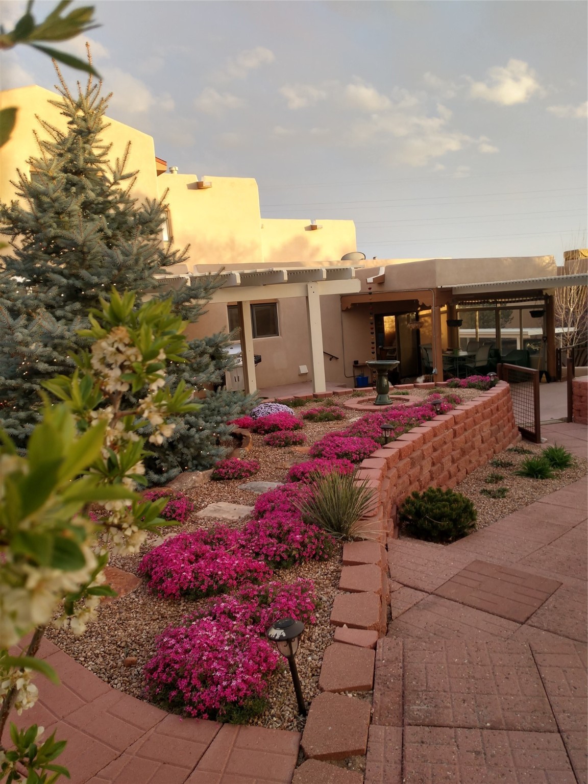 Experience Villa Caballero, a highly sought-after neighborhood known for quiet living, great location, and oversize lots. The area is particularly admired for its marvelous blend of natural beauty and charming residential spaces. One sweet gem is this multi-level home with a flexible floor plan featuring three bedrooms upstairs plus an office/den off the Primary Suite. An optional fourth bedroom is on the main level with access to the backyard pergola offering flexibility in living spaces. All bedrooms are spacious and feature stunning views. This Santa Fe style home is complete with beautiful vigas, nichos, and kiva fireplace on the main floor with plenty of space to entertain. The spacious primary bedroom suite offers a comfortable retreat, including a large bath with jetted tub and a separate office/sitting space and a view deck to enjoy sunsets and mountain views. The separated bedroom plan ensures privacy for everyone in the household and includes an additional view deck. The kitchen is spacious including an island and access to a huge utility/laundry room. A flexible family/dining/tv room with access to the back pergola is just off the kitchen in one direction and the formal dining and living room are off the other direction. This is truly a fabulous home for ease of entertaining. In addition, the views out virtually every window allow enjoyment of the breathtaking scenery and views, and invite you to soak in the surrounding beauty.Speaking of beauty, the lush and mature landscaping of this home boasts wonderful pathways meandering through multiple fruit trees, flowering beds, and shrubs. The thoughtful design creates a serene and inviting atmosphere. To add to the tranquility, there's even a large backyard pergola, perfect for peaceful entertaining and relaxation with wonderful architectural plays of shadow and light.Not only will you feel at peace in this home, but the lush landscaping will also attract birds and bees, creating a haven for wildlife enthusiasts and nature lovers alike. It truly is a wonderful environment to appreciate the harmony of nature and a great place to call home.