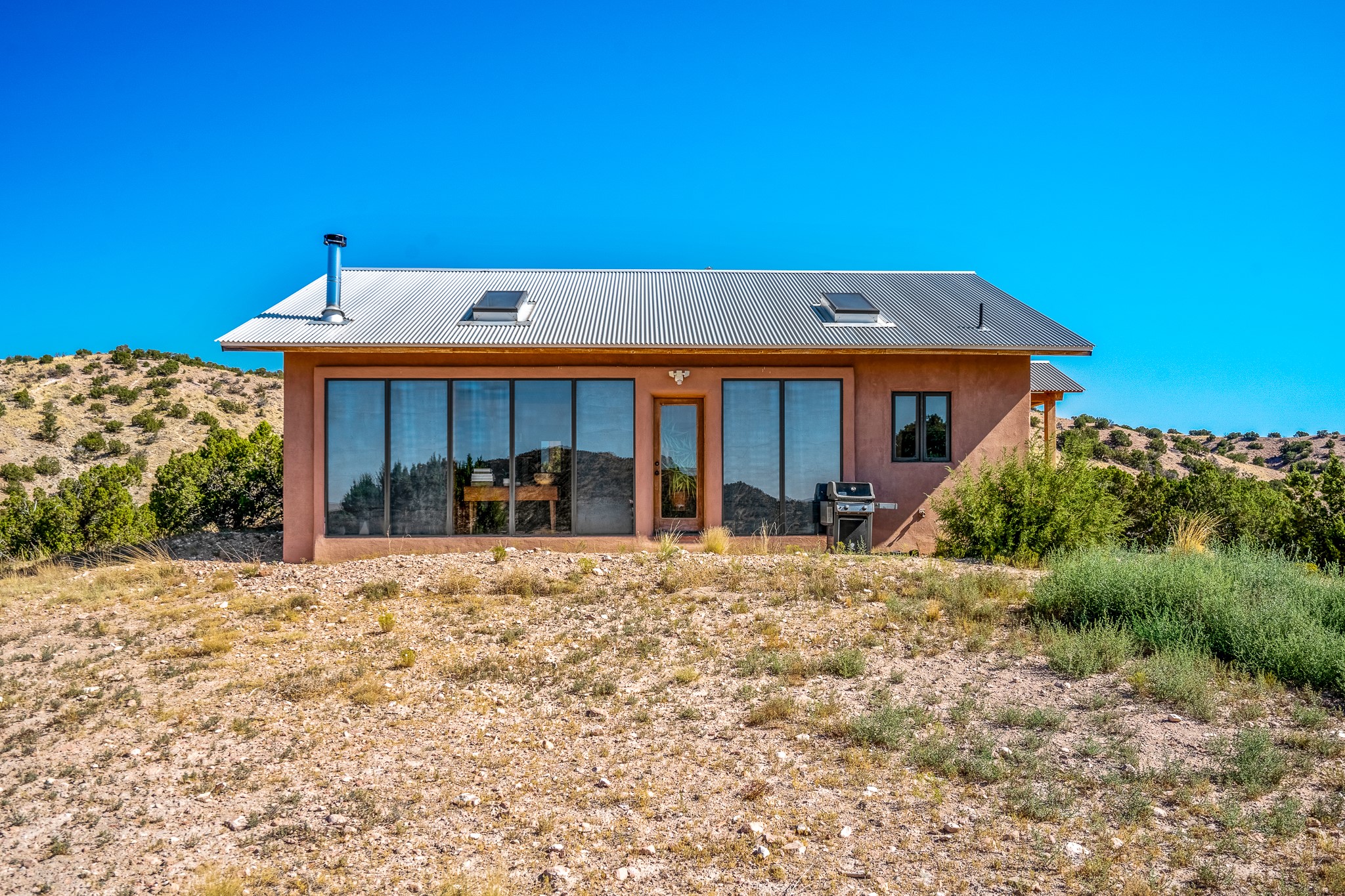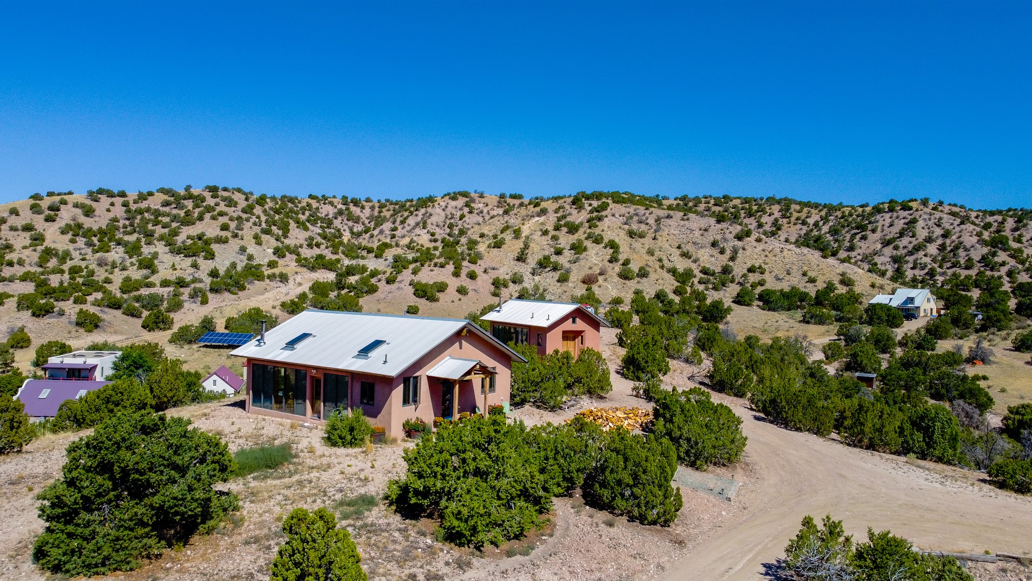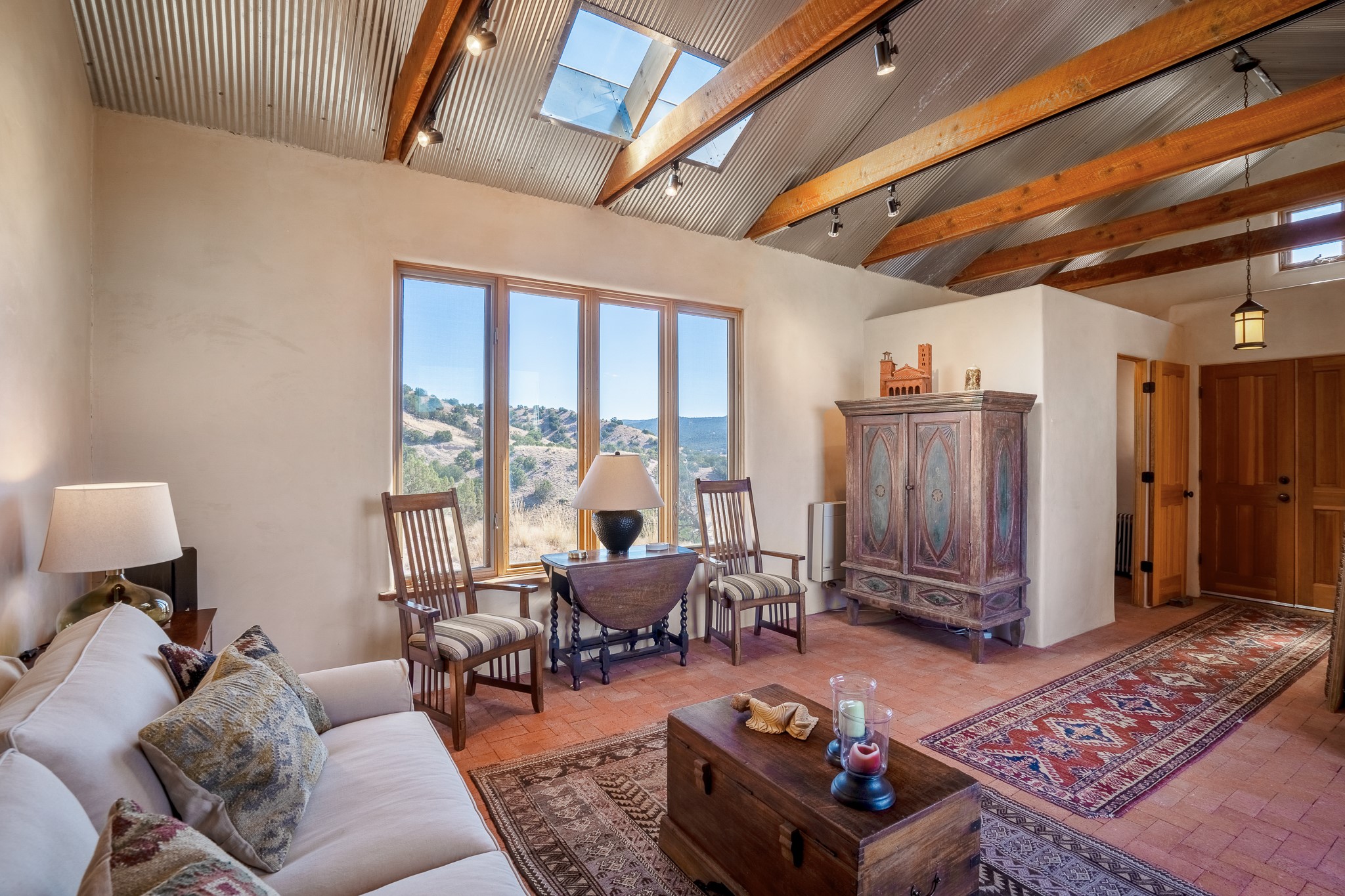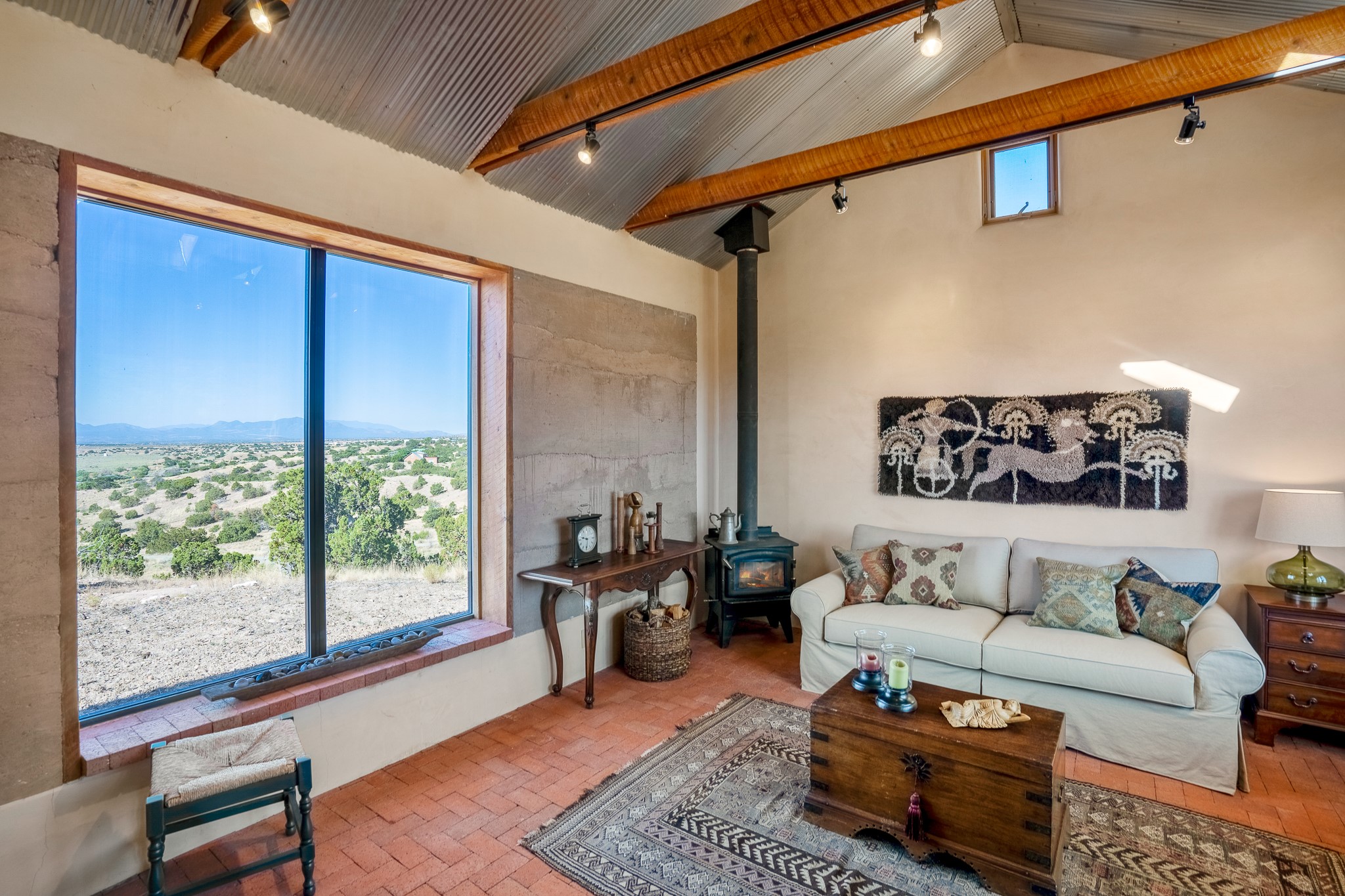 Panoramic views from a beautiful house and casita in Lamy! Located just minutes fromThe Agora shopping area in Eldorado and sited atop a picturesque hill, this uniqueproperty boasts a charming 1044 sq. ft. 2-bedroom, 2-bathroom E-crete home with a pitched roof,along with a detached 436 sq. ft. casita featuring a pitched roof and a 3/4 bathroom. Sited on 3acres with community water and constructed in 2006 by famed local builder Karen Terry, known as a pioneer in passive solar and eco-conscious design. Both structures incorporate Trombe walls - these walls collect heat from the sun and radiate it into the interior. Heat is further supplemented by gas wall heaters and cozy wood-burning stoves. The many 6' and floor to ceiling insulated double panewindows are highly energy efficient and provide an abundance of natural light.Impeccably styled with sleek, modern aesthetics, this property exudes the authenticNorthern New Mexico atmosphere, showcasing beautiful brick flooring and plasteredwalls. A true Lamy gem.