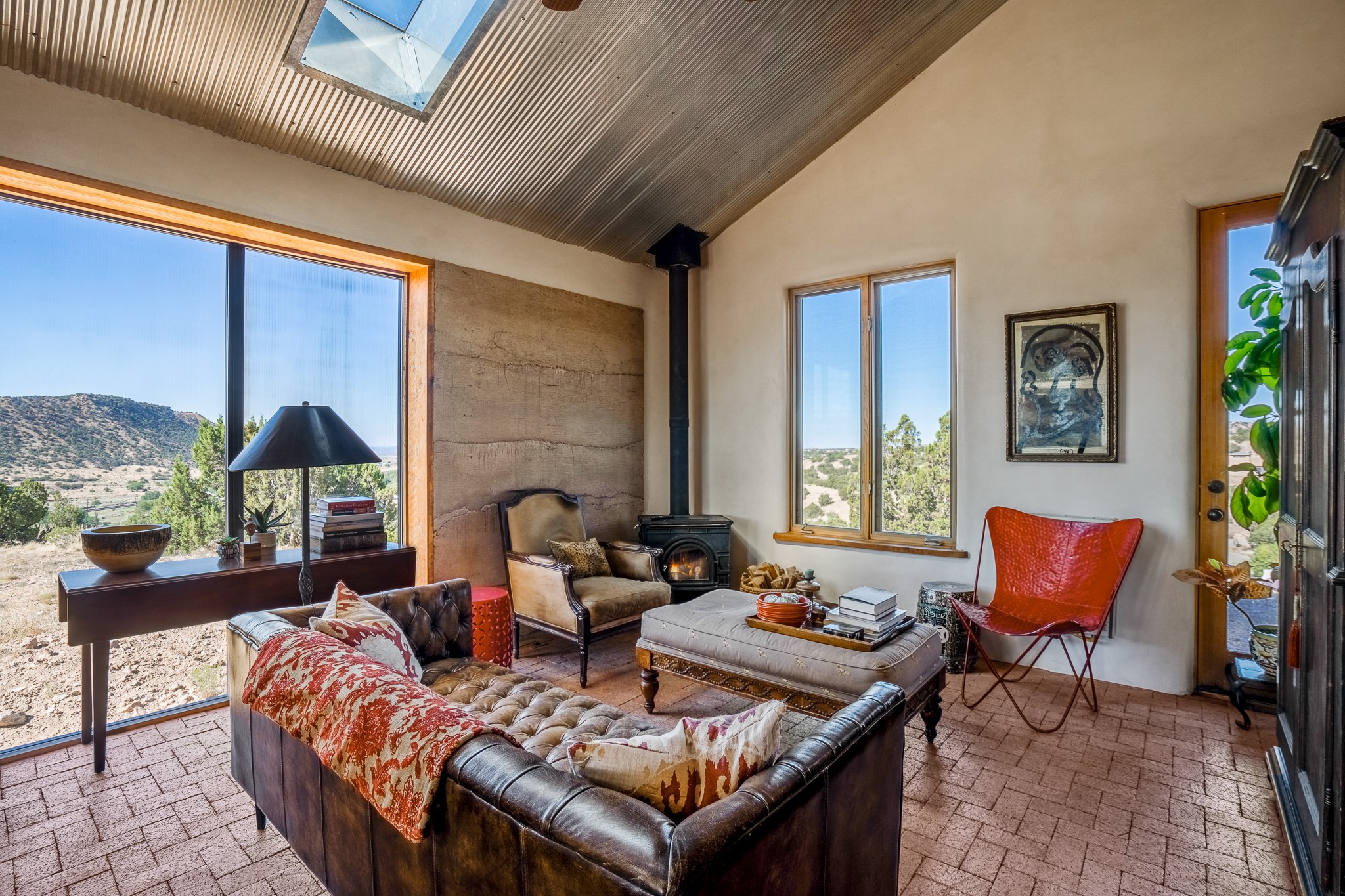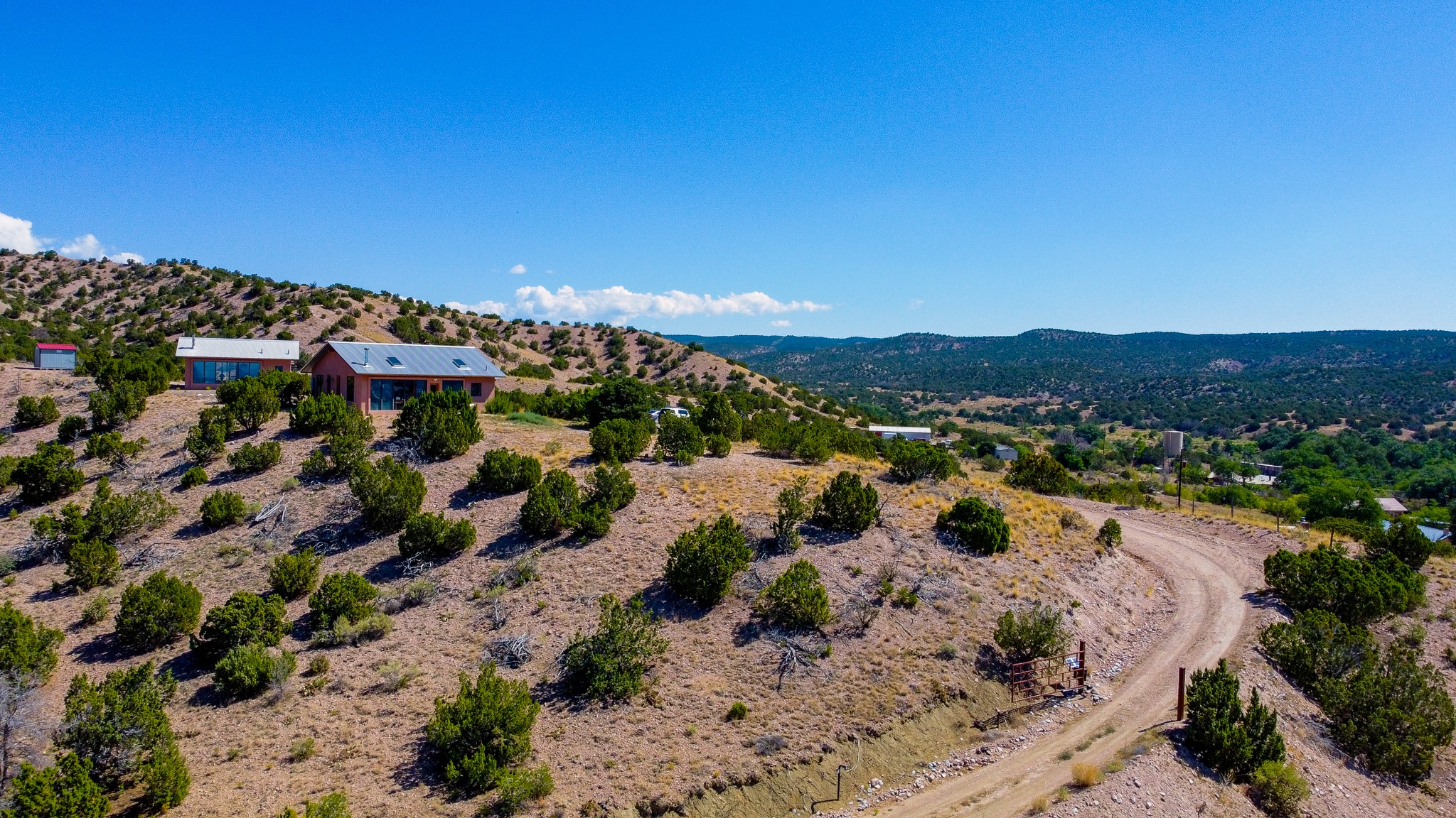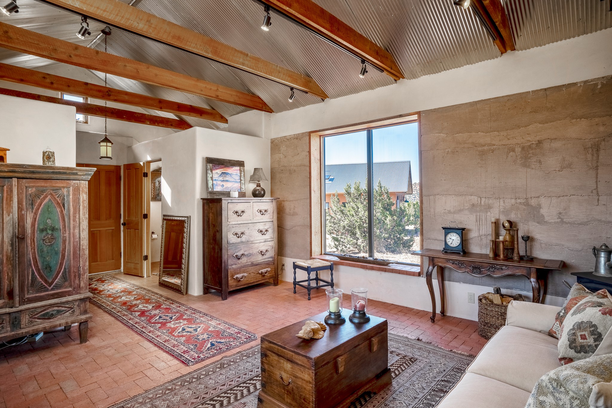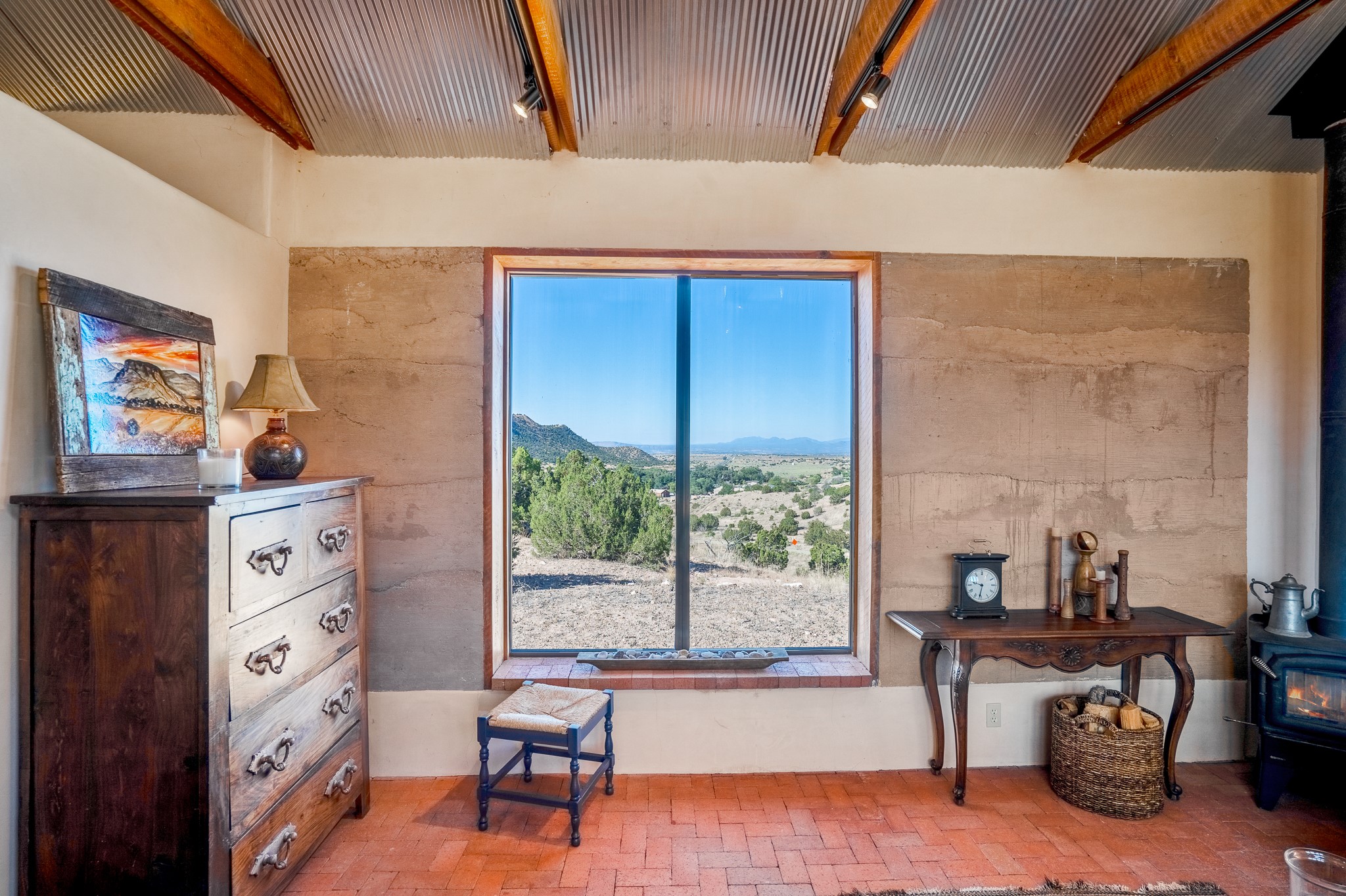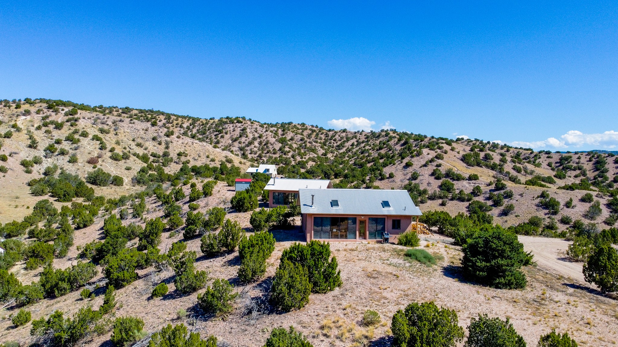 Panoramic views from a beautiful house and casita in Lamy! Located just minutes fromThe Agora shopping area in Eldorado and sited atop a picturesque hill, this uniqueproperty boasts a charming 1044 sq. ft. 2-bedroom, 2-bathroom E-crete home with a pitched roof,along with a detached 436 sq. ft. casita featuring a pitched roof and a 3/4 bathroom. Sited on 3acres with community water and constructed in 2006 by famed local builder Karen Terry, known as a pioneer in passive solar and eco-conscious design. Both structures incorporate Trombe walls - these walls collect heat from the sun and radiate it into the interior. Heat is further supplemented by gas wall heaters and cozy wood-burning stoves. The many 6' and floor to ceiling insulated double panewindows are highly energy efficient and provide an abundance of natural light.Impeccably styled with sleek, modern aesthetics, this property exudes the authenticNorthern New Mexico atmosphere, showcasing beautiful brick flooring and plasteredwalls. A true Lamy gem.