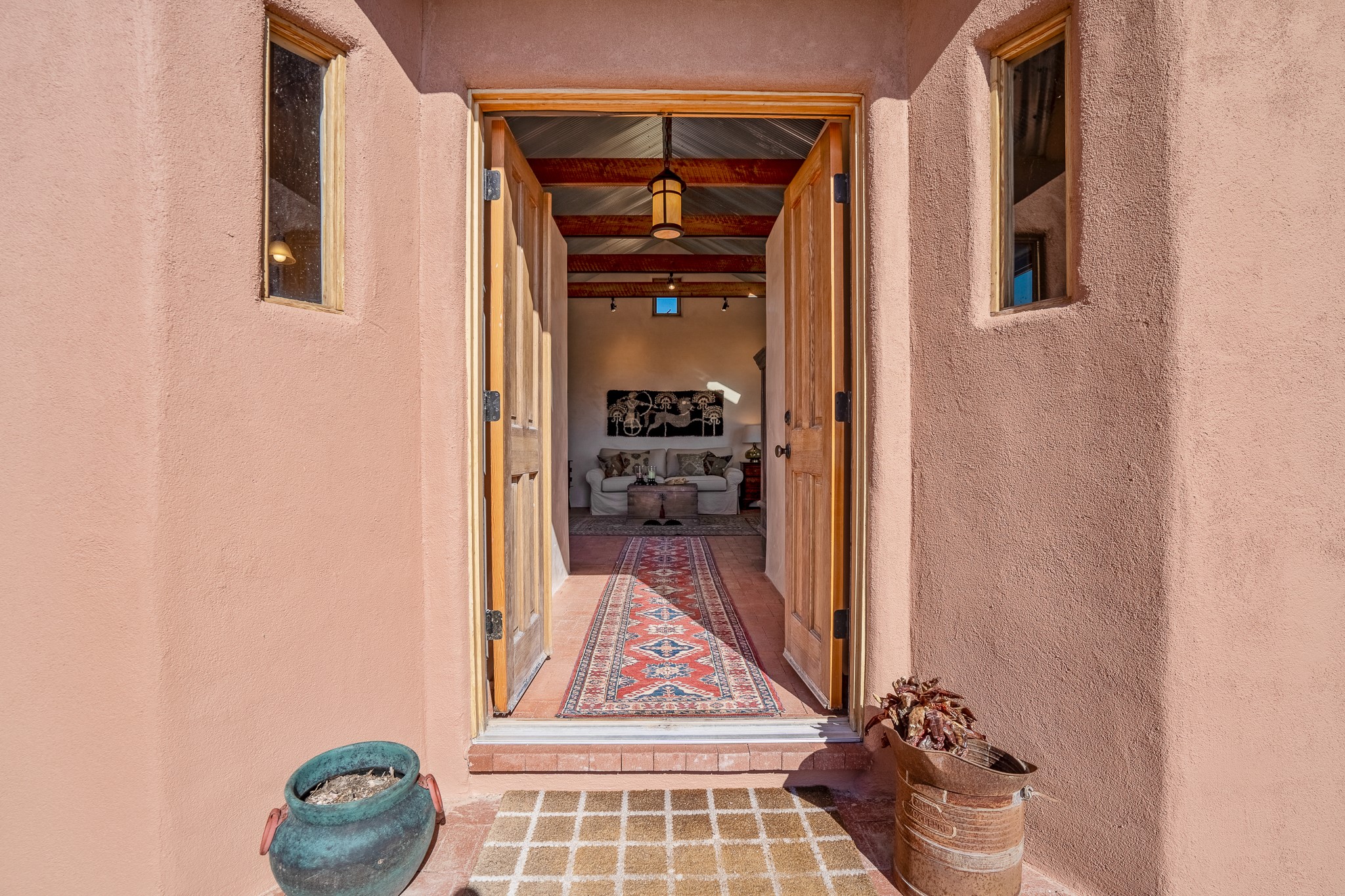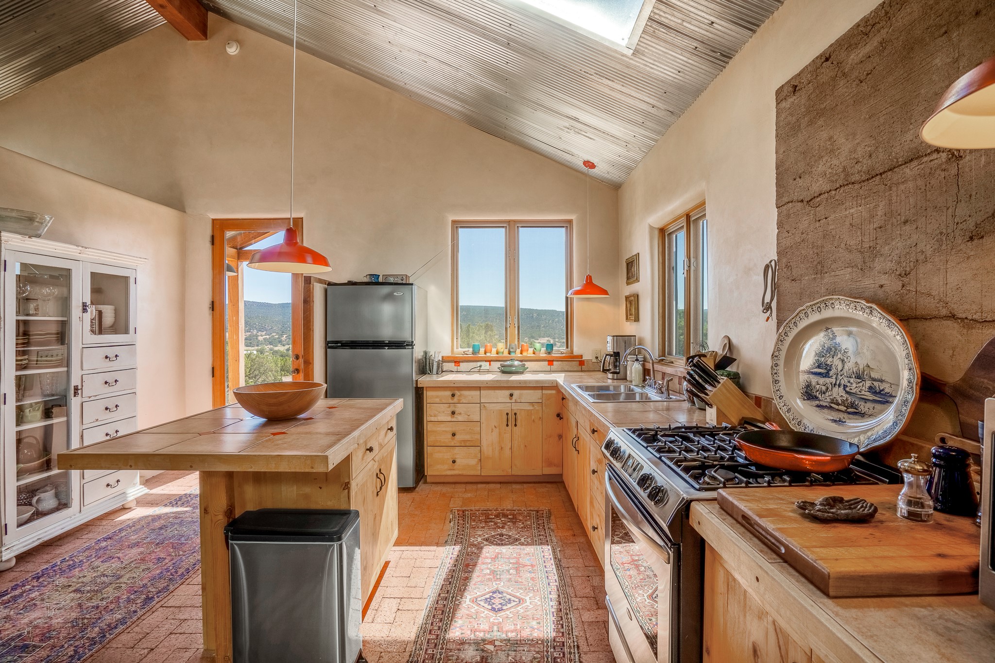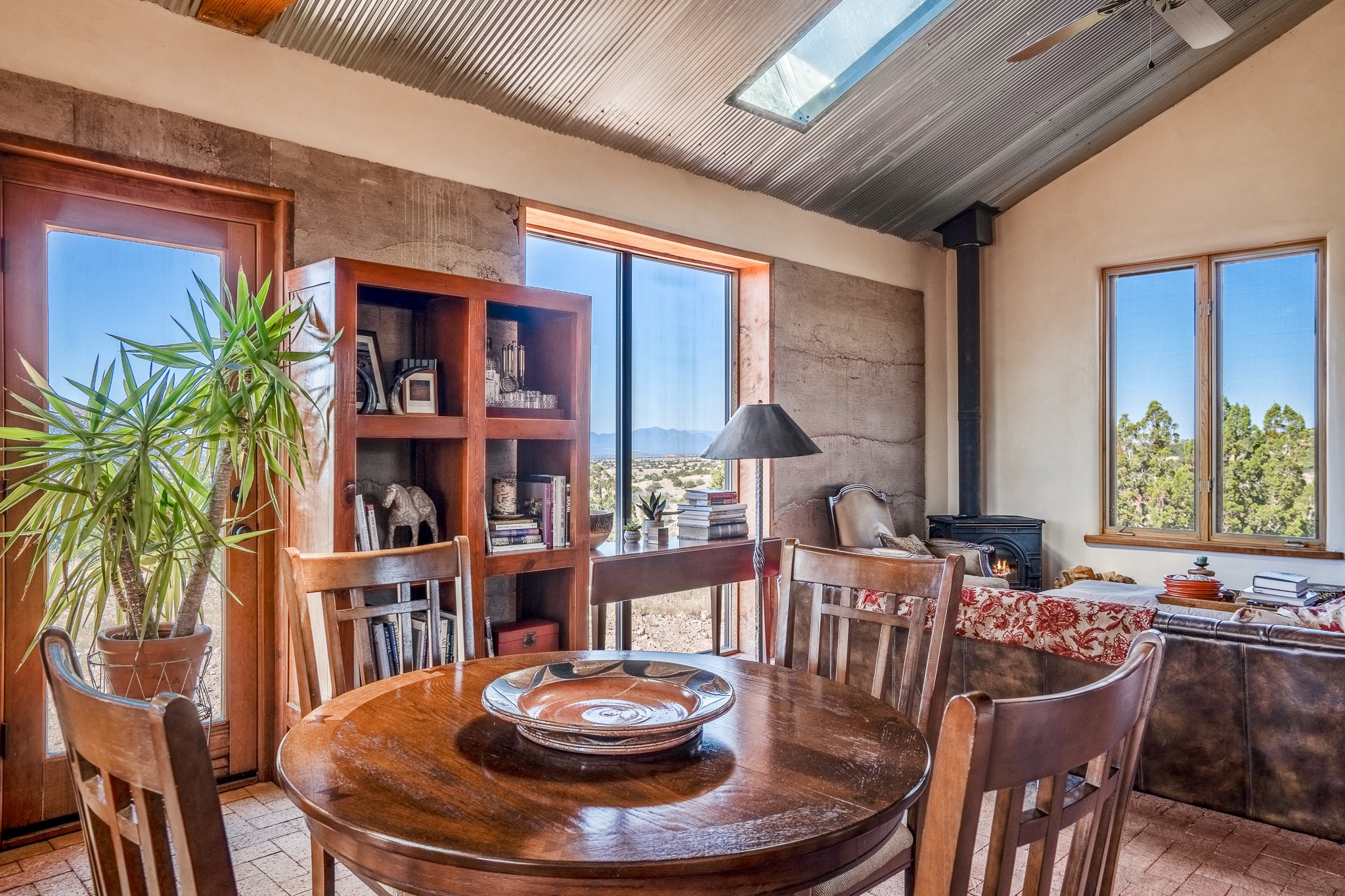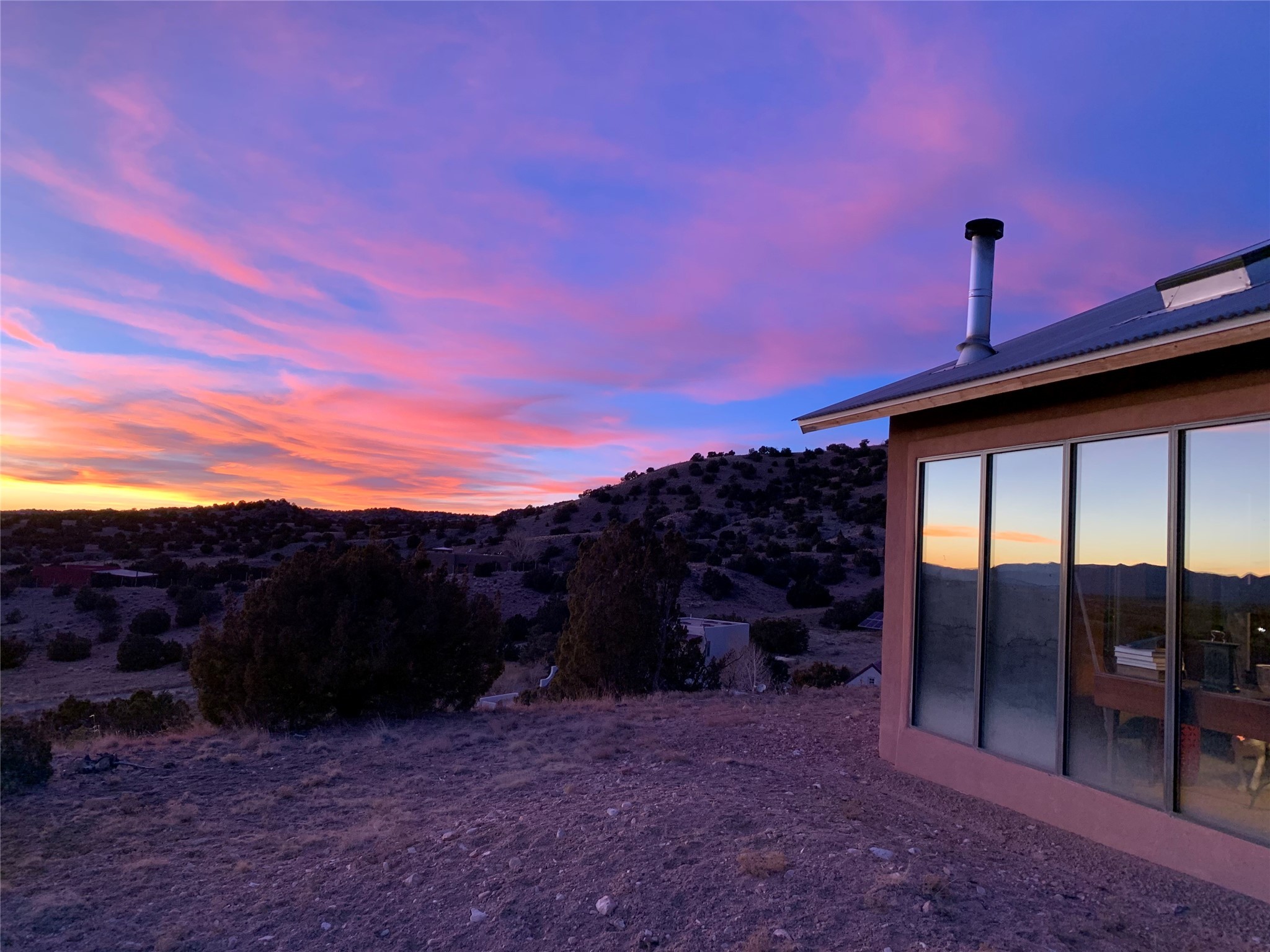 Panoramic views from a beautiful house and casita in Lamy! Located just minutes fromThe Agora shopping area in Eldorado and sited atop a picturesque hill, this uniqueproperty boasts a charming 1044 sq. ft. 2-bedroom, 2-bathroom E-crete home with a pitched roof,along with a detached 436 sq. ft. casita featuring a pitched roof and a 3/4 bathroom. Sited on 3acres with community water and constructed in 2006 by famed local builder Karen Terry, known as a pioneer in passive solar and eco-conscious design. Both structures incorporate Trombe walls - these walls collect heat from the sun and radiate it into the interior. Heat is further supplemented by gas wall heaters and cozy wood-burning stoves. The many 6' and floor to ceiling insulated double panewindows are highly energy efficient and provide an abundance of natural light.Impeccably styled with sleek, modern aesthetics, this property exudes the authenticNorthern New Mexico atmosphere, showcasing beautiful brick flooring and plasteredwalls. A true Lamy gem.
