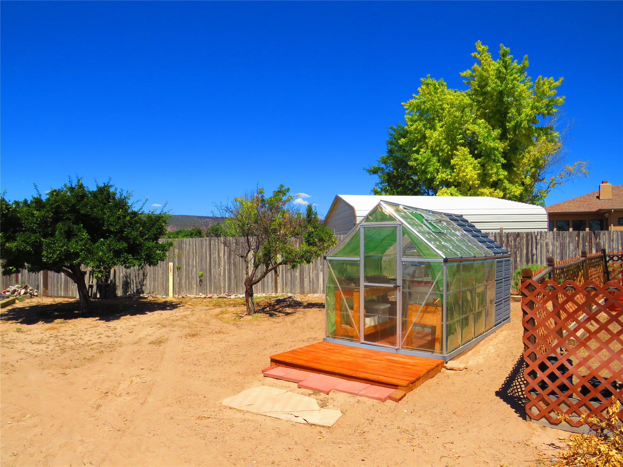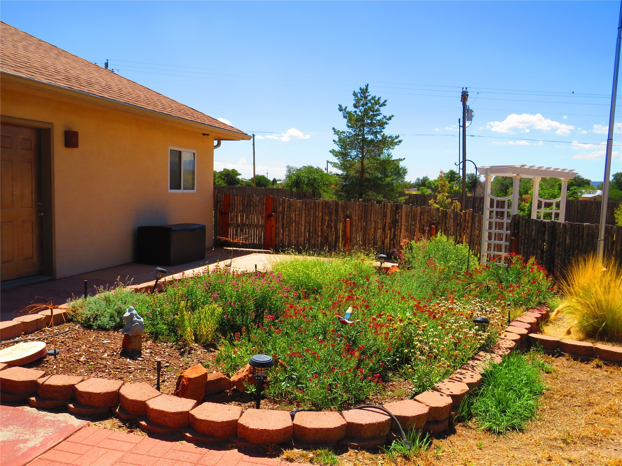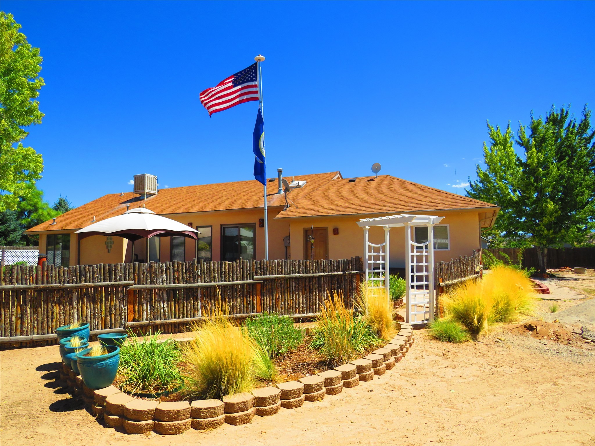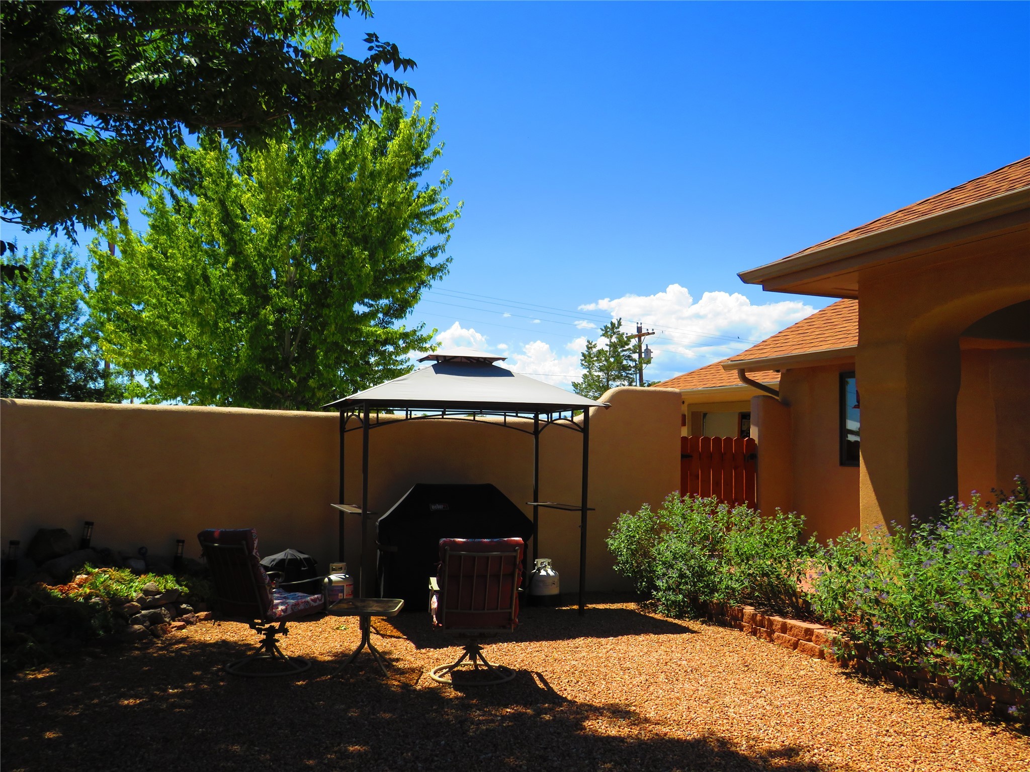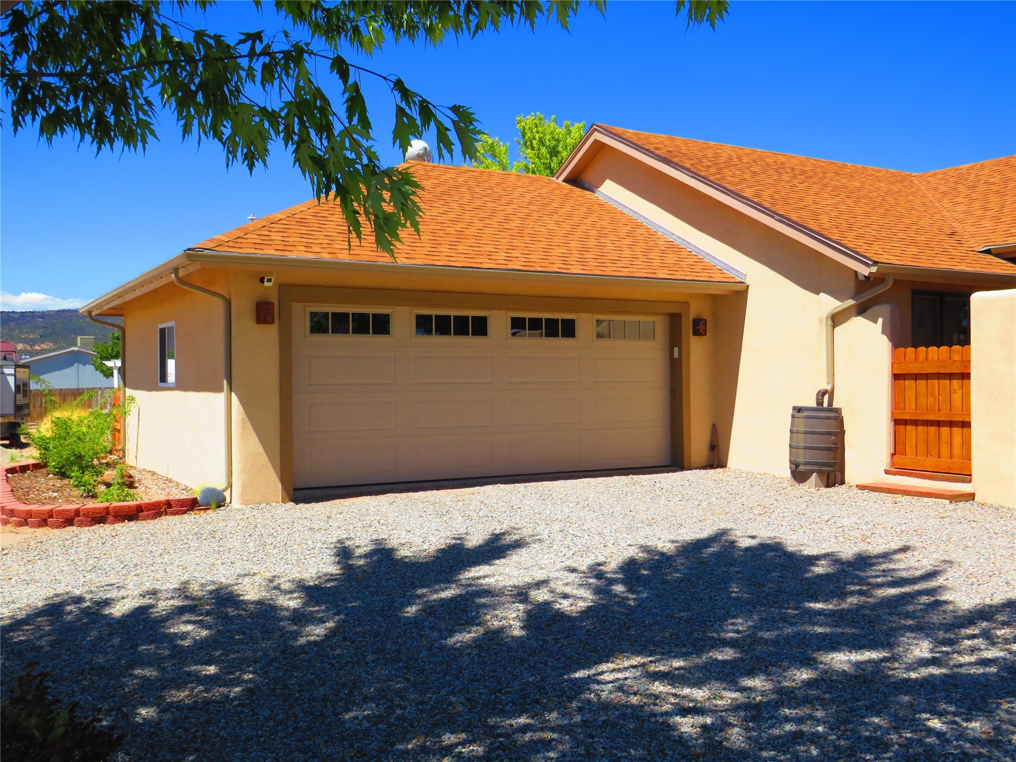 This beautifully designed home is set on .78 acres in a quiet, private, rural location. Design features include a walled courtyard, glass block accents, vigas and herringbone decking, and lots of light. The kitchen is spacious and well-appointed with stone counters and stainless appliances. The bathrooms are nicely updated. Outside, there are lots of trees, including a variety of fruit trees, and easy to care for plantings of native and water hardy perennials. There is a nice storage shed, a greenhouse, water catchment, and raised beds for the garden lover. The back yard includes a spacious sunny patio and the front offers shady walled-in seclusion. The entire property is fully fenced and there is an electric gate. This is an easy commute to Los Alamos, Espanola, and Santa Fe. Endless outdoor adventure is minutes away, offering the best that beautiful Northern New Mexico has to offer. All canopies and patio furniture convey.
