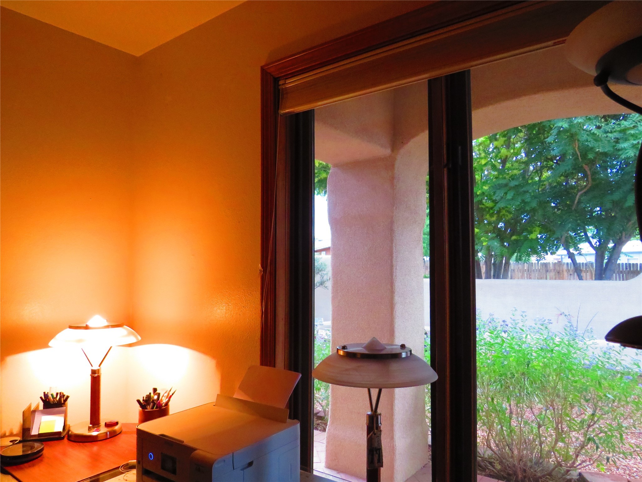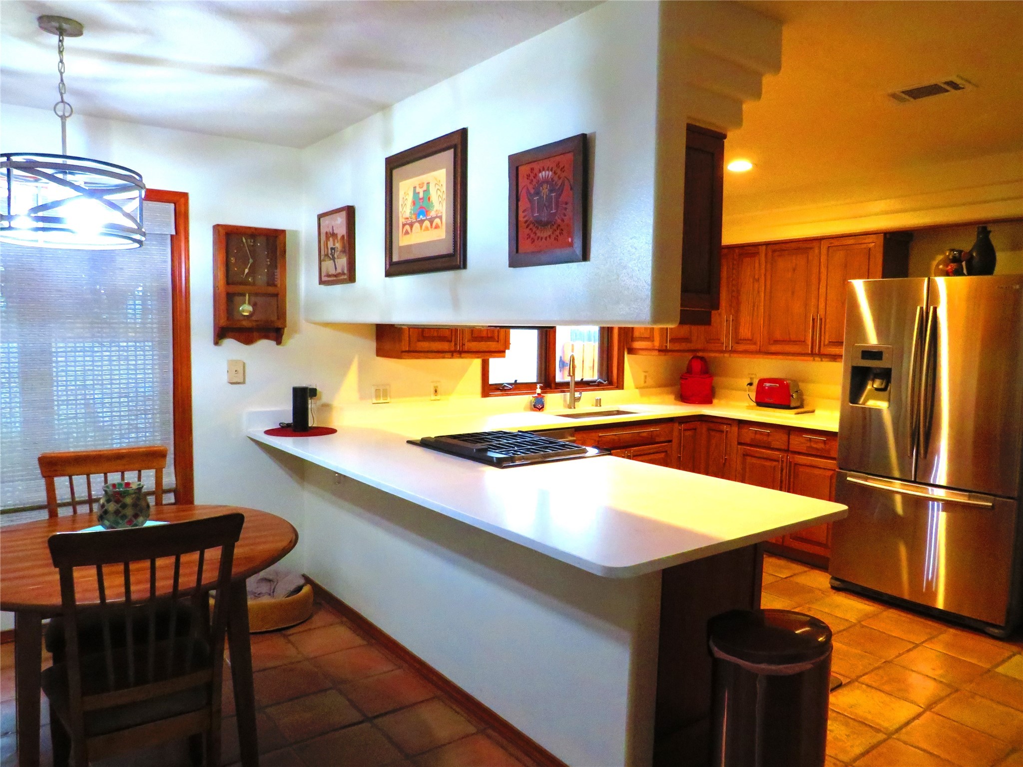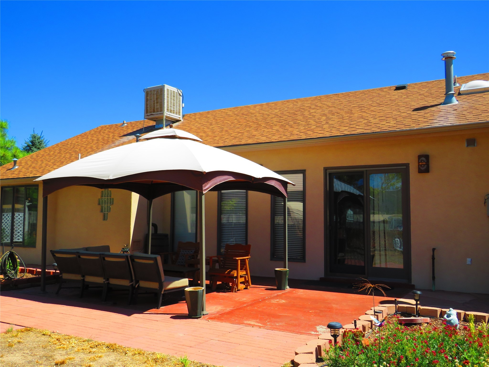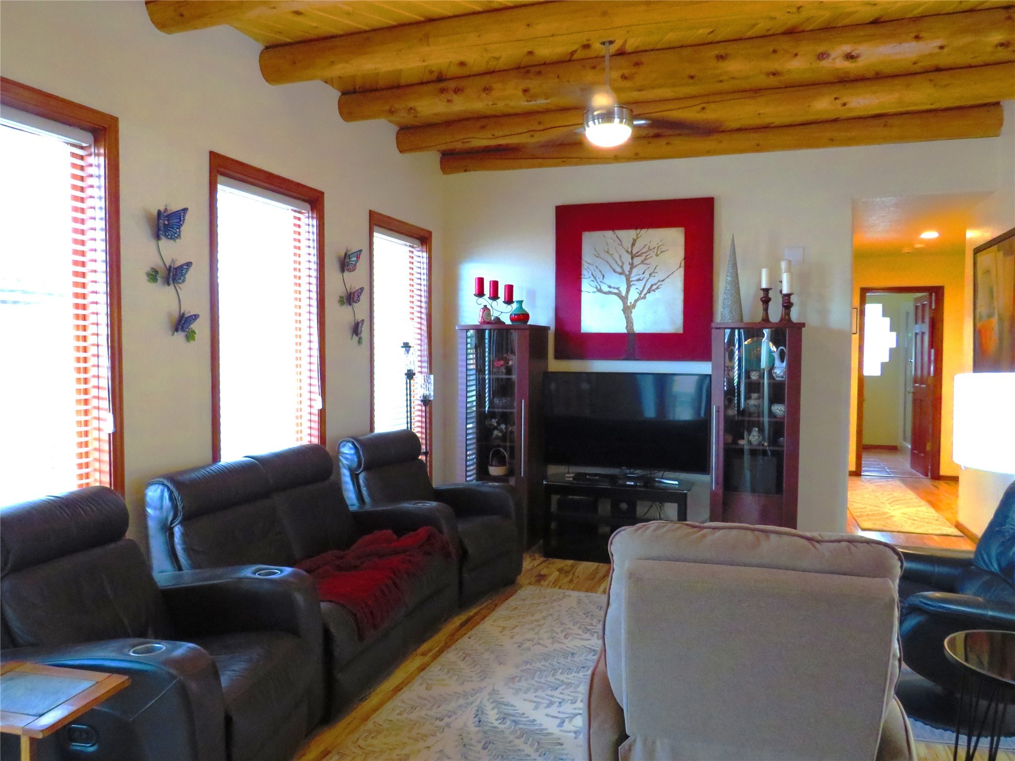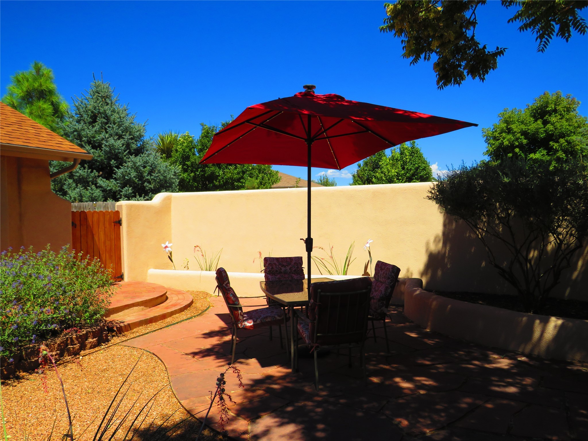 This beautifully designed home is set on .78 acres in a quiet, private, rural location. Design features include a walled courtyard, glass block accents, vigas and herringbone decking, and lots of light. The kitchen is spacious and well-appointed with stone counters and stainless appliances. The bathrooms are nicely updated. Outside, there are lots of trees, including a variety of fruit trees, and easy to care for plantings of native and water hardy perennials. There is a nice storage shed, a greenhouse, water catchment, and raised beds for the garden lover. The back yard includes a spacious sunny patio and the front offers shady walled-in seclusion. The entire property is fully fenced and there is an electric gate. This is an easy commute to Los Alamos, Espanola, and Santa Fe. Endless outdoor adventure is minutes away, offering the best that beautiful Northern New Mexico has to offer. All canopies and patio furniture convey.