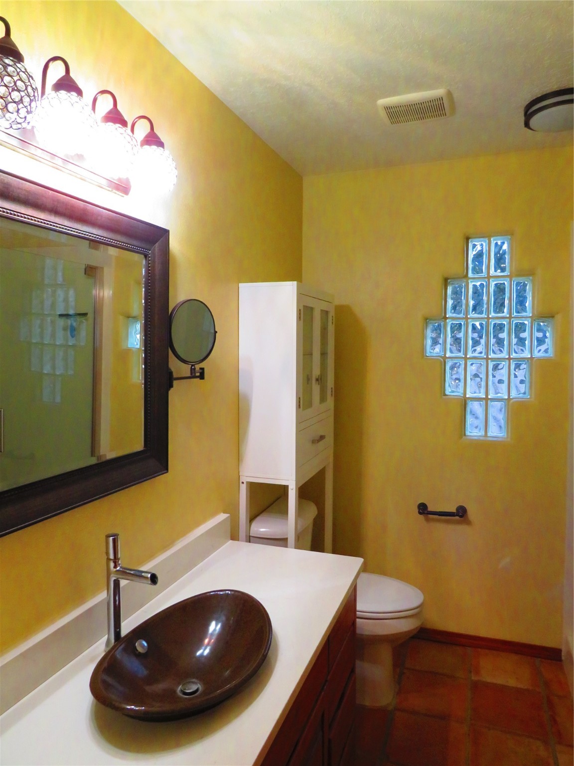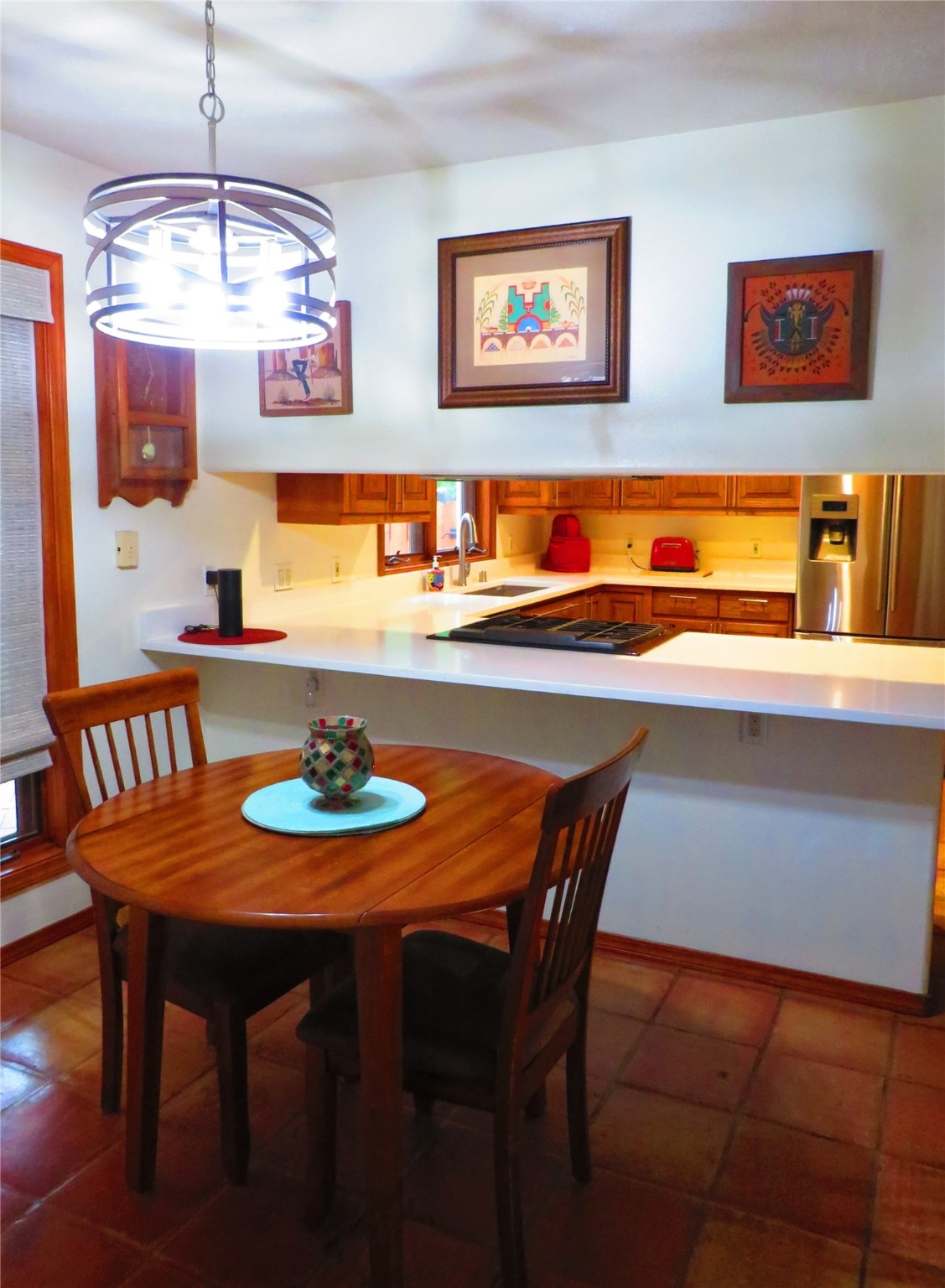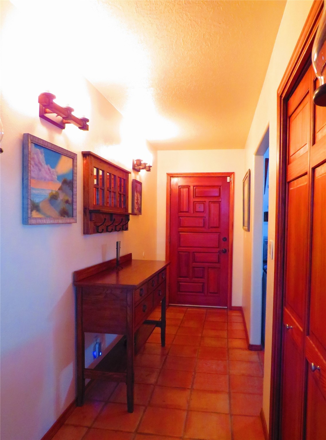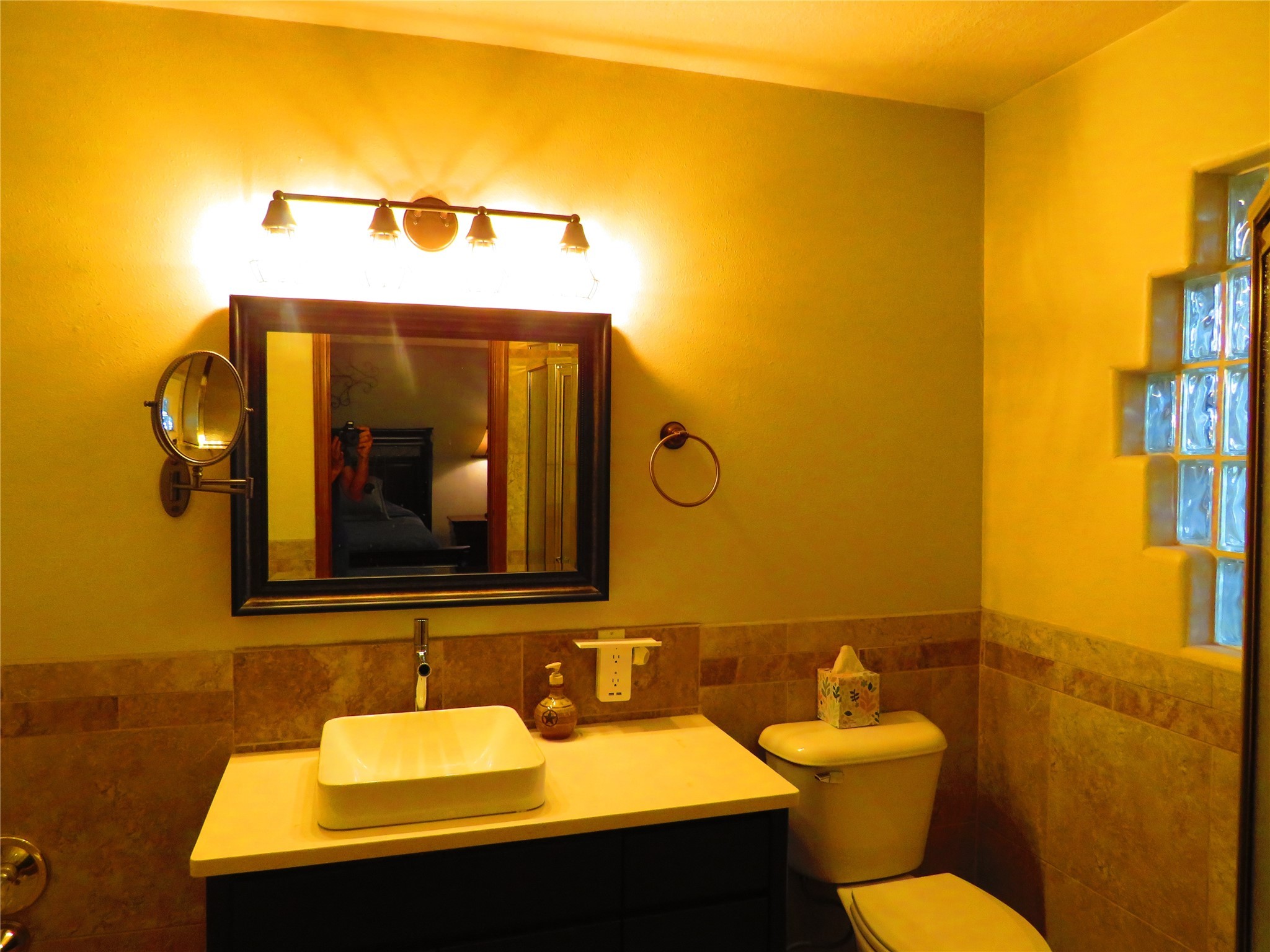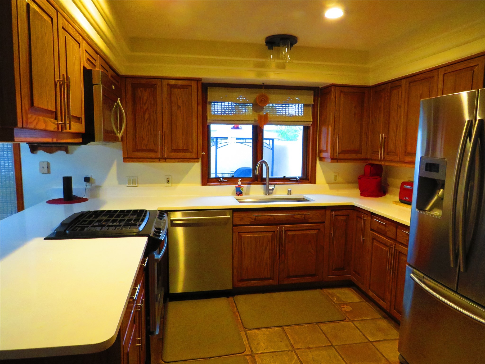 This beautifully designed home is set on .78 acres in a quiet, private, rural location. Design features include a walled courtyard, glass block accents, vigas and herringbone decking, and lots of light. The kitchen is spacious and well-appointed with stone counters and stainless appliances. The bathrooms are nicely updated. Outside, there are lots of trees, including a variety of fruit trees, and easy to care for plantings of native and water hardy perennials. There is a nice storage shed, a greenhouse, water catchment, and raised beds for the garden lover. The back yard includes a spacious sunny patio and the front offers shady walled-in seclusion. The entire property is fully fenced and there is an electric gate. This is an easy commute to Los Alamos, Espanola, and Santa Fe. Endless outdoor adventure is minutes away, offering the best that beautiful Northern New Mexico has to offer. All canopies and patio furniture convey.