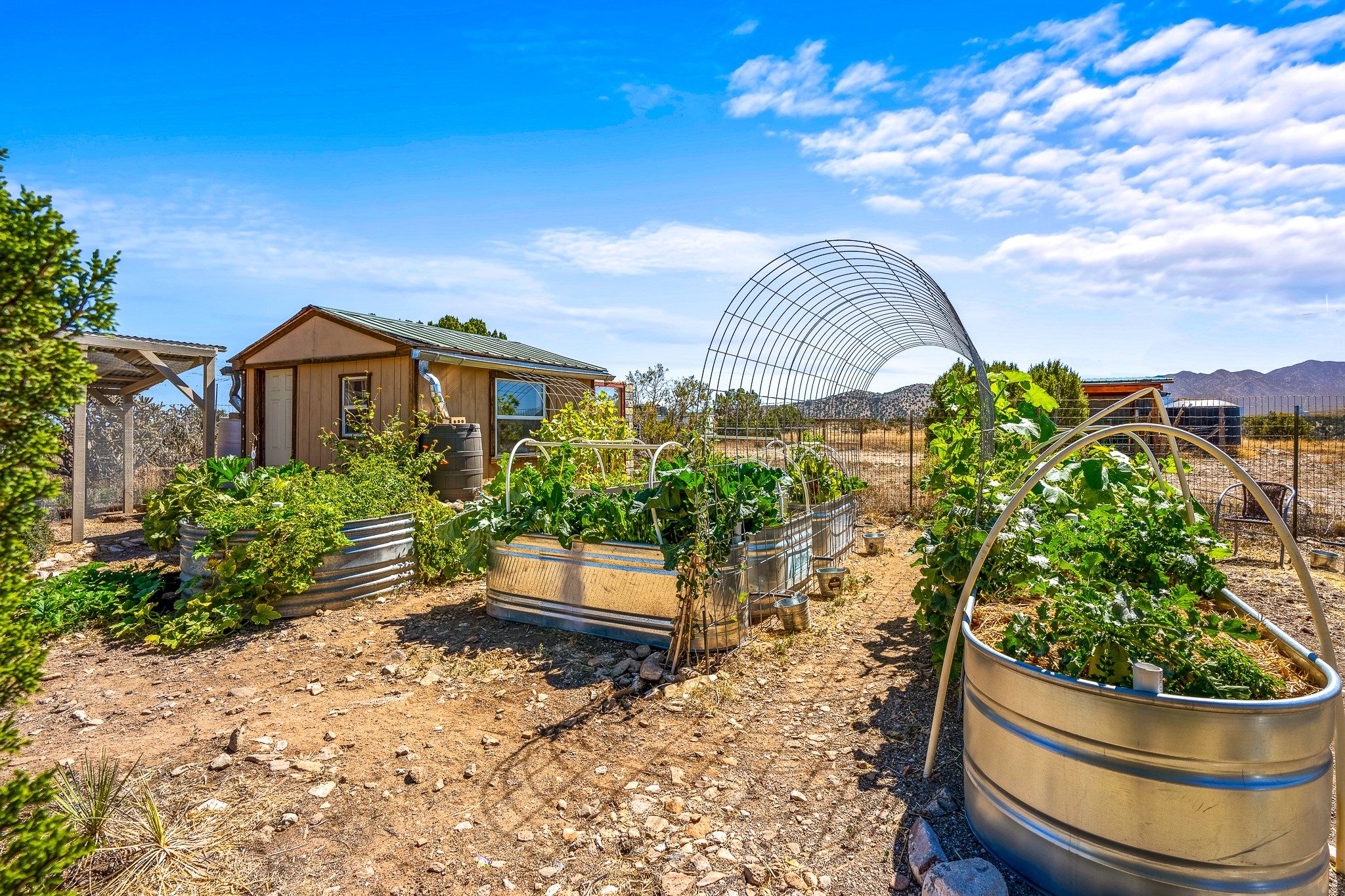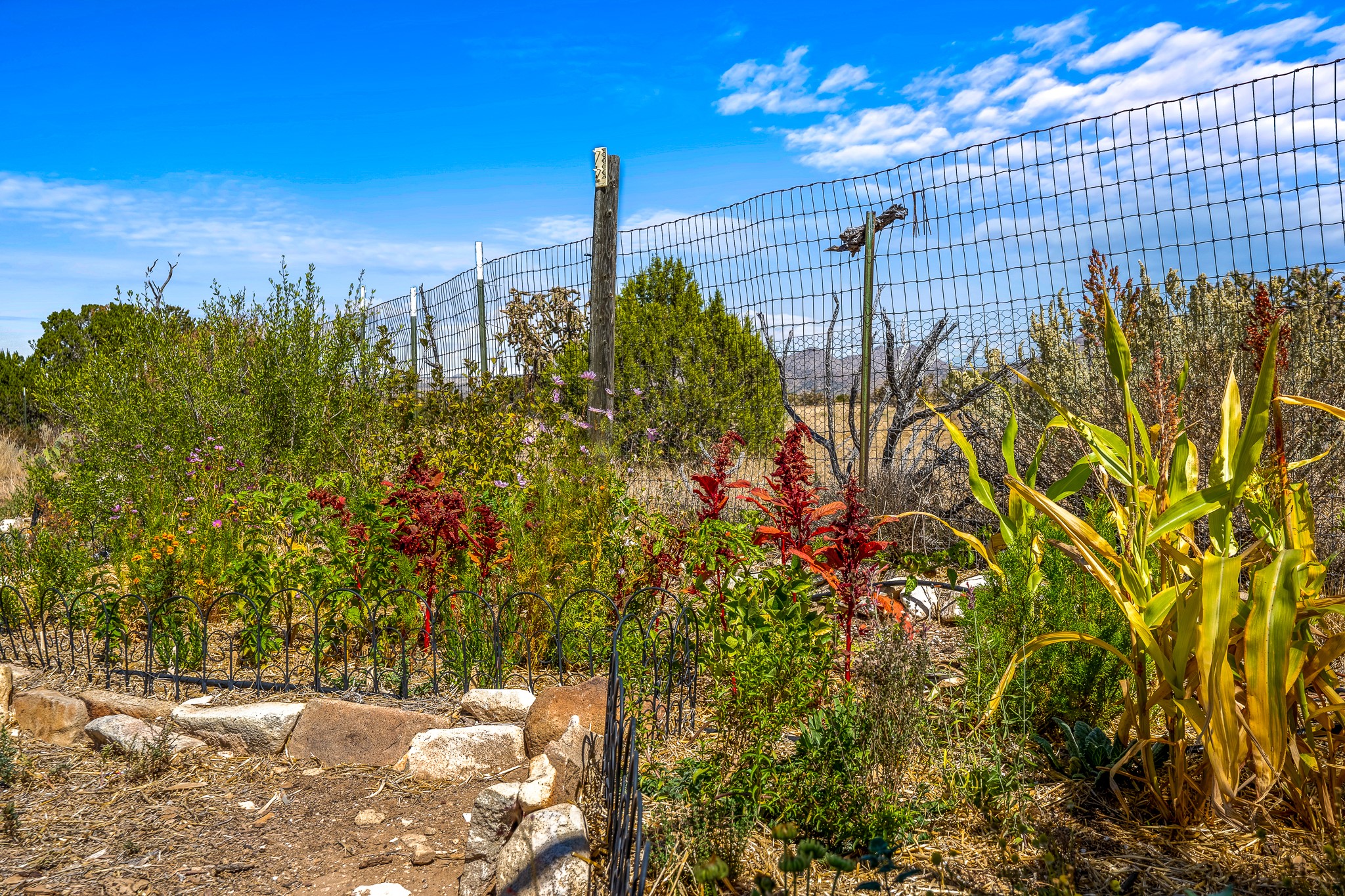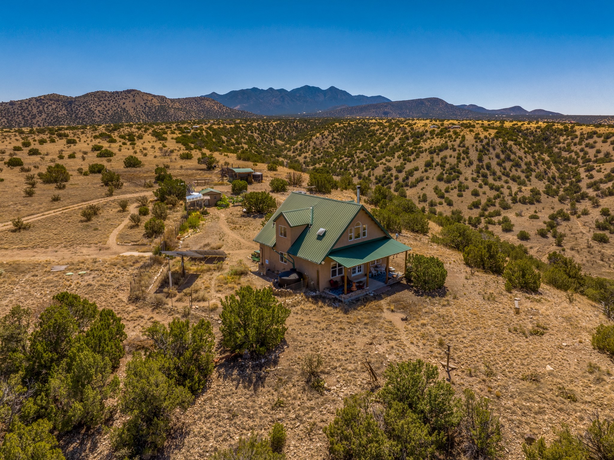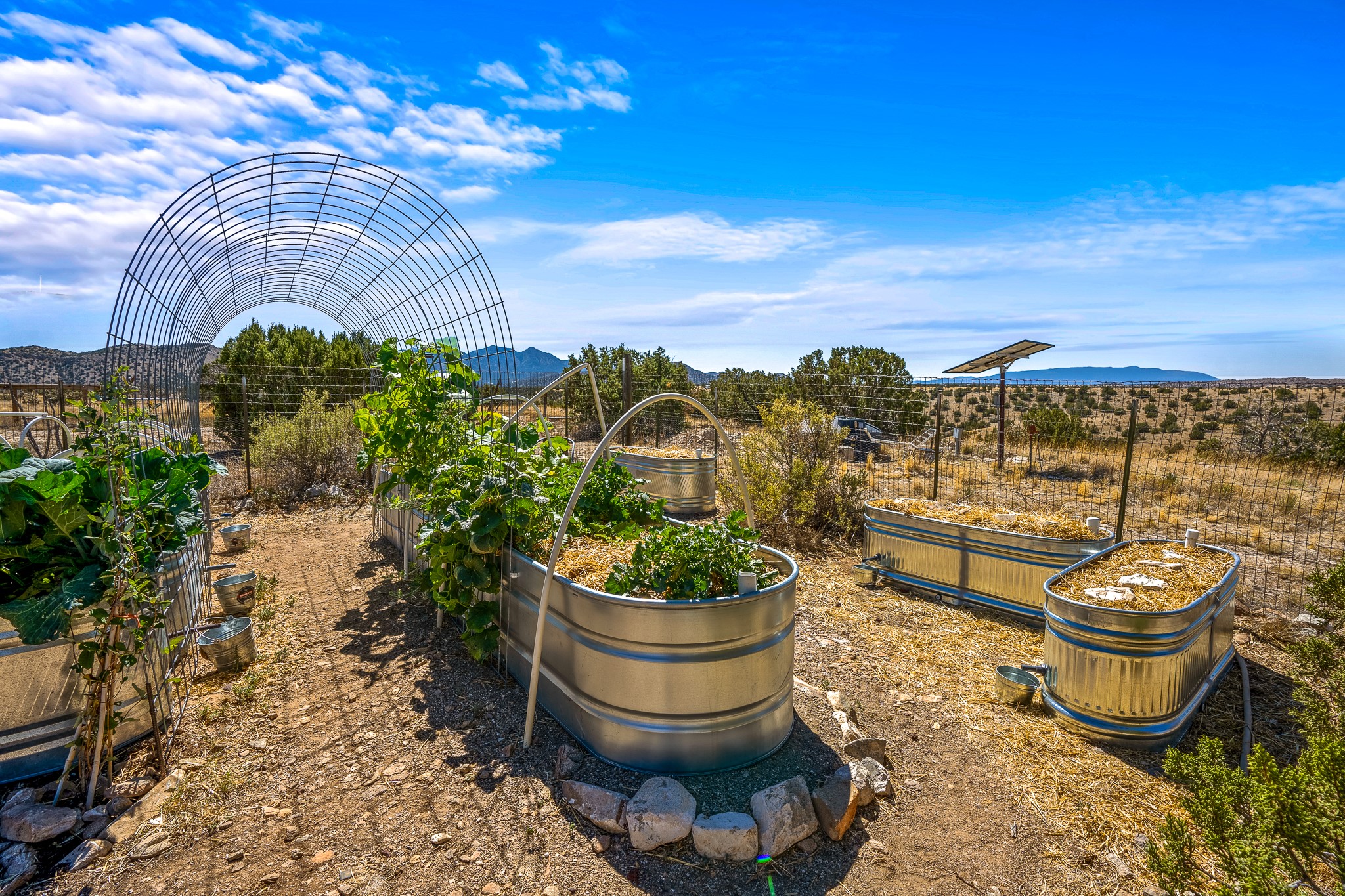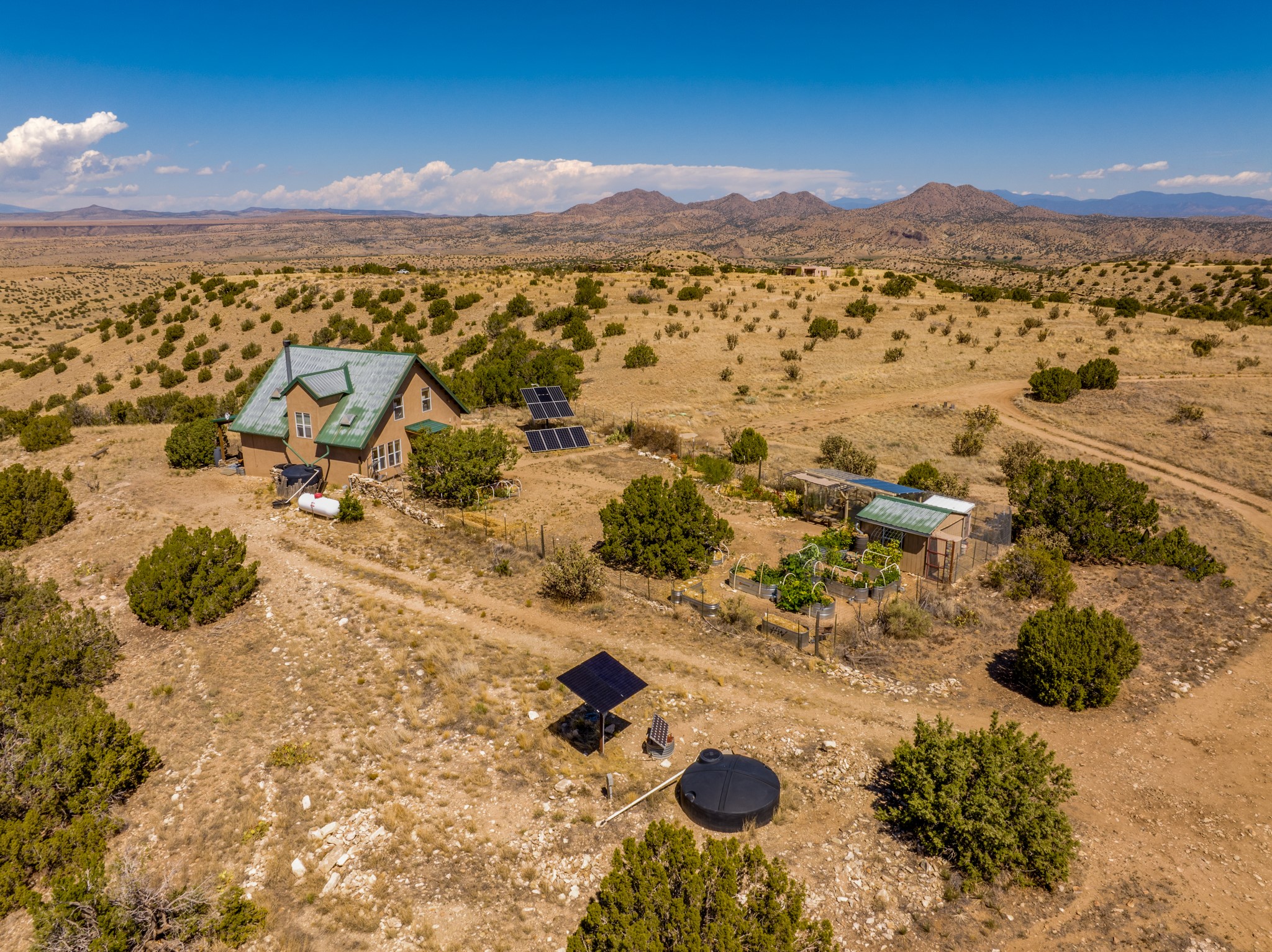 You'll find this high-desert homestead perched on a mesa's edge, with jaw-dropping views in every direction. A high-ceilinged, 1259 square foot home, with one bedroom and one bathroom, sits on 40 acres. This open floor plan home gives many configuration options- a roomy yet cozy space. Property has abundant, thriving gardens, a shed and chicken coop, as well as a corral and space for horses. Water is supplied by a private well, and electricity by the sun. Sellers have recently invested nearly $50,000 in the property, including new solar panels, charge controller, inverters, and batteries, 5600 gallons of water storage (in addition to 3100 gallons of rain catchment), new well pump, booster pump and whole house water filtration system. 3.5 miles from highway 14. Come experience the profound privacy, and quiet this property provides while only being a short hop to the thriving artist community of Madrid and a 45 min drive to Santa Fe. Excellent off the grid property with expansive vistas of the Cerrillos Hills and the Jemez, Sangre de Cristo, Ortiz, and Sandia Mountains.