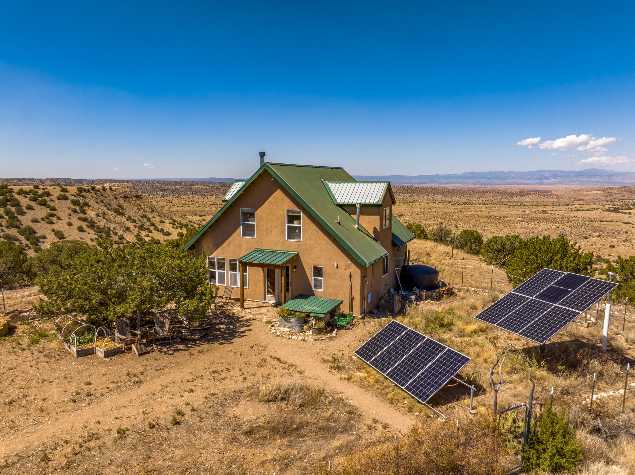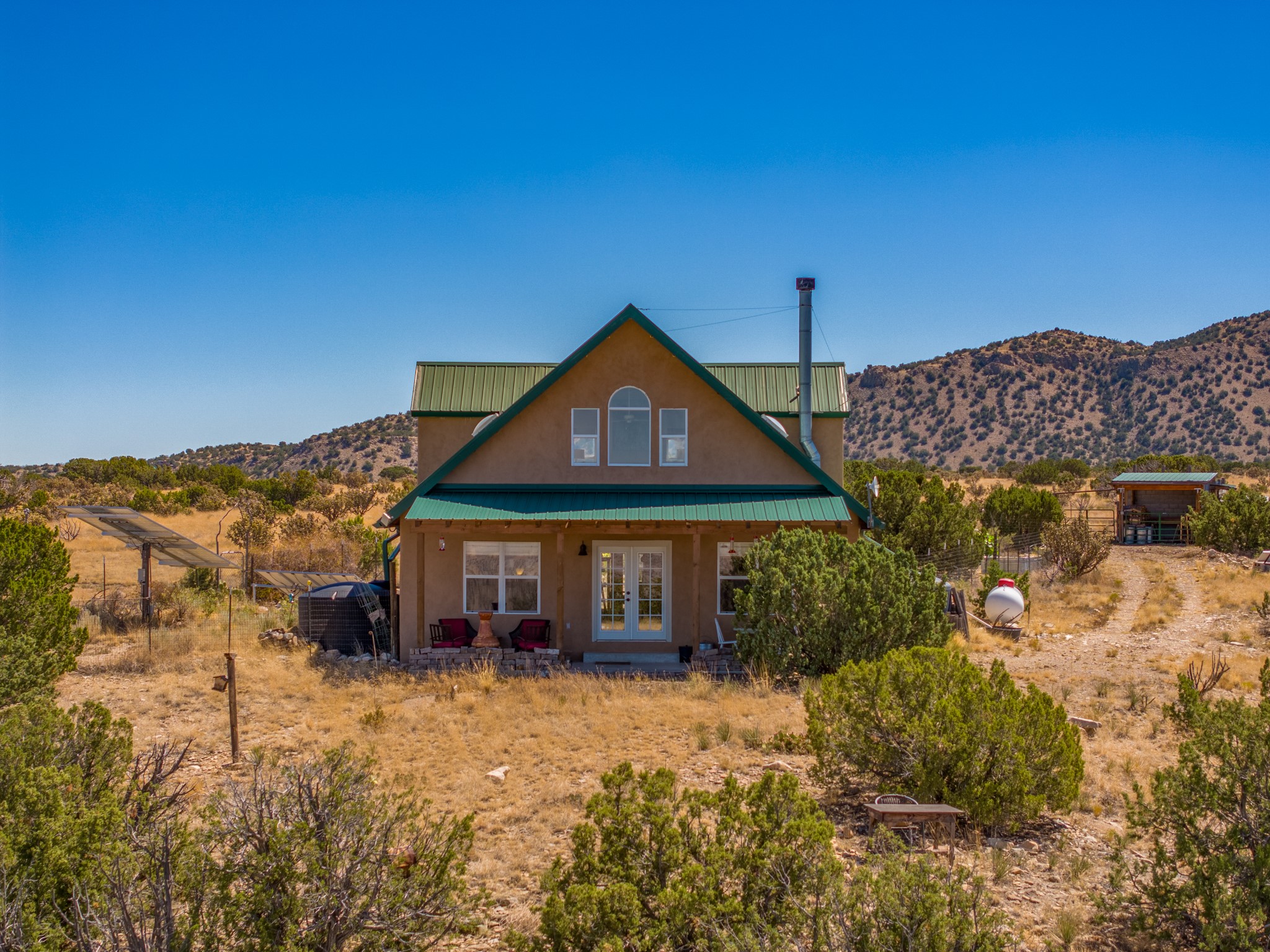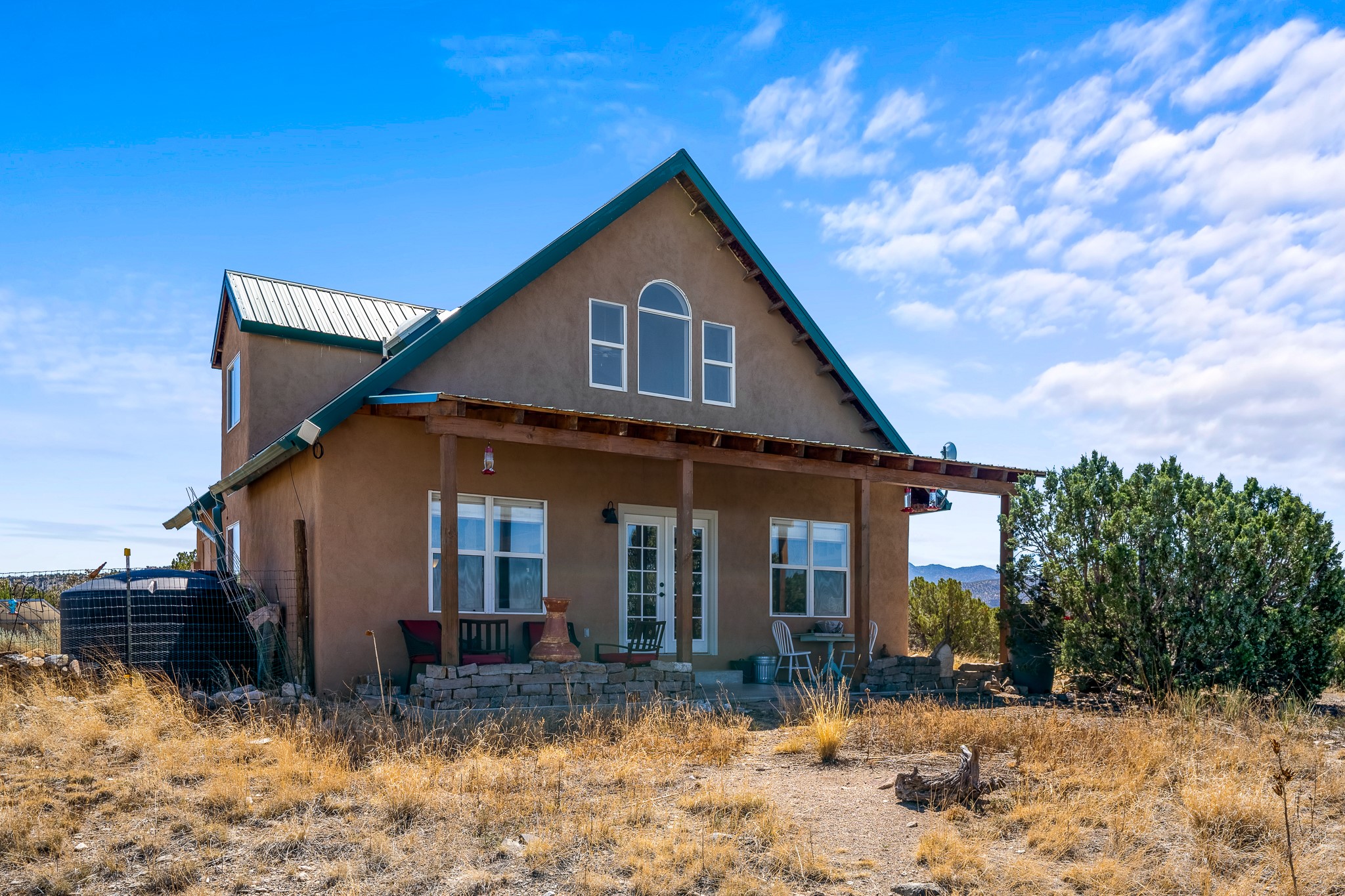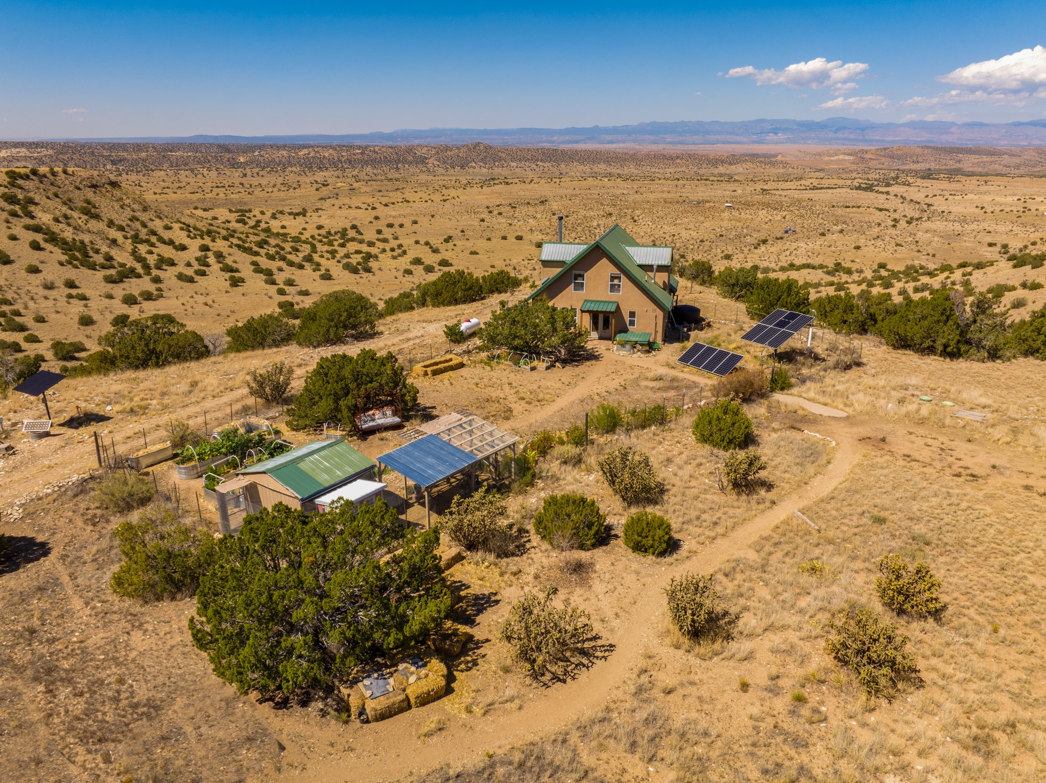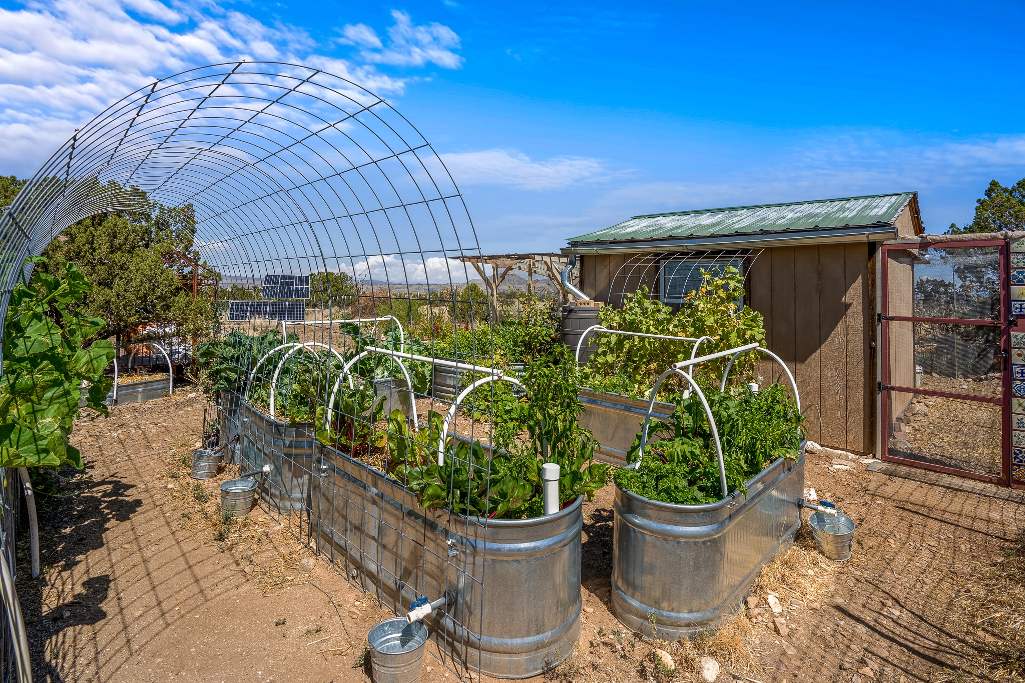 You'll find this high-desert homestead perched on a mesa's edge, with jaw-dropping views in every direction. A high-ceilinged, 1259 square foot home, with one bedroom and one bathroom, sits on 40 acres. This open floor plan home gives many configuration options- a roomy yet cozy space. Property has abundant, thriving gardens, a shed and chicken coop, as well as a corral and space for horses. Water is supplied by a private well, and electricity by the sun. Sellers have recently invested nearly $50,000 in the property, including new solar panels, charge controller, inverters, and batteries, 5600 gallons of water storage (in addition to 3100 gallons of rain catchment), new well pump, booster pump and whole house water filtration system. 3.5 miles from highway 14. Come experience the profound privacy, and quiet this property provides while only being a short hop to the thriving artist community of Madrid and a 45 min drive to Santa Fe. Excellent off the grid property with expansive vistas of the Cerrillos Hills and the Jemez, Sangre de Cristo, Ortiz, and Sandia Mountains.