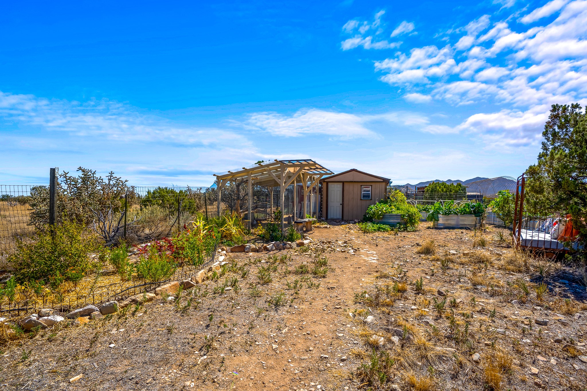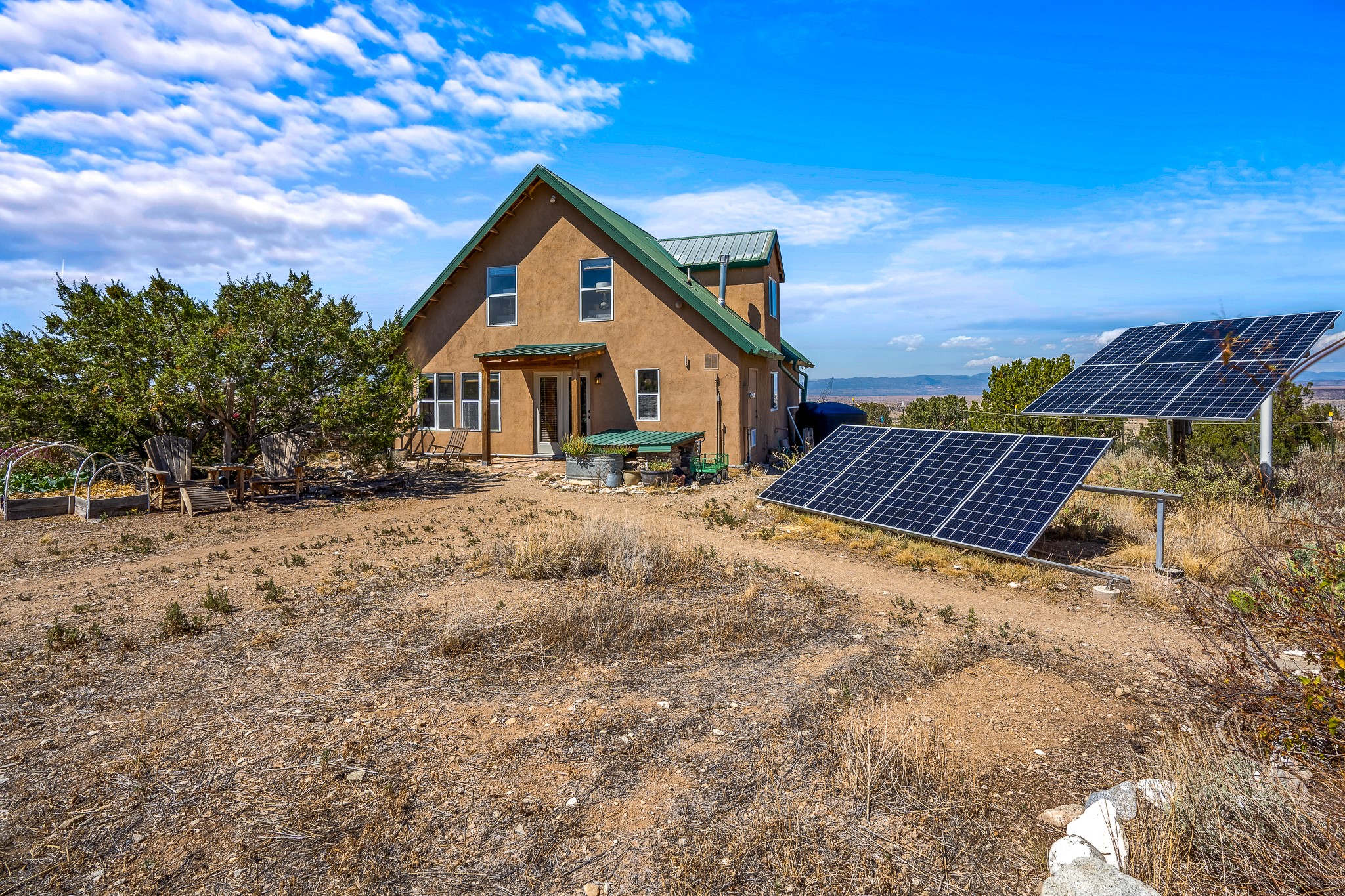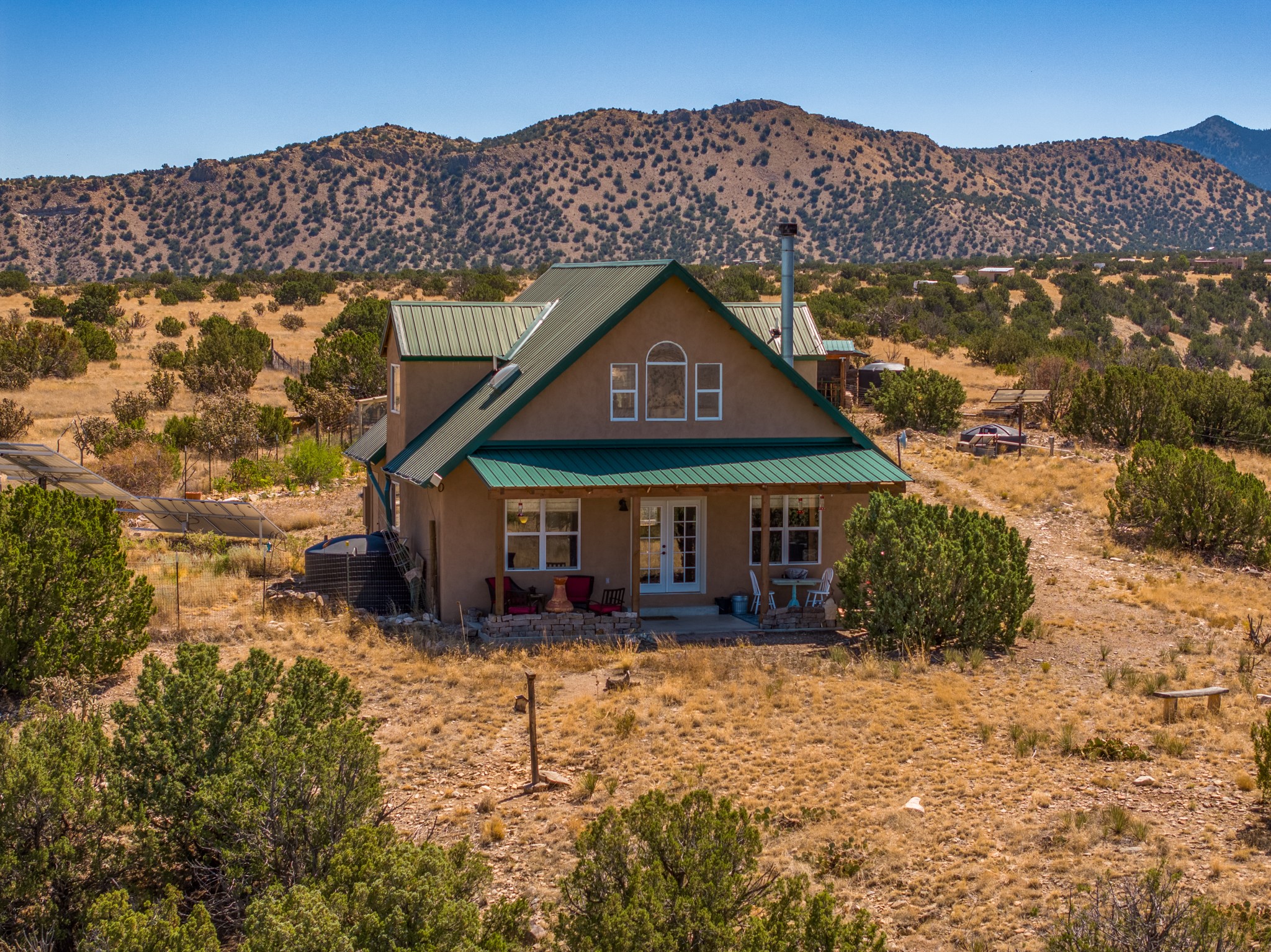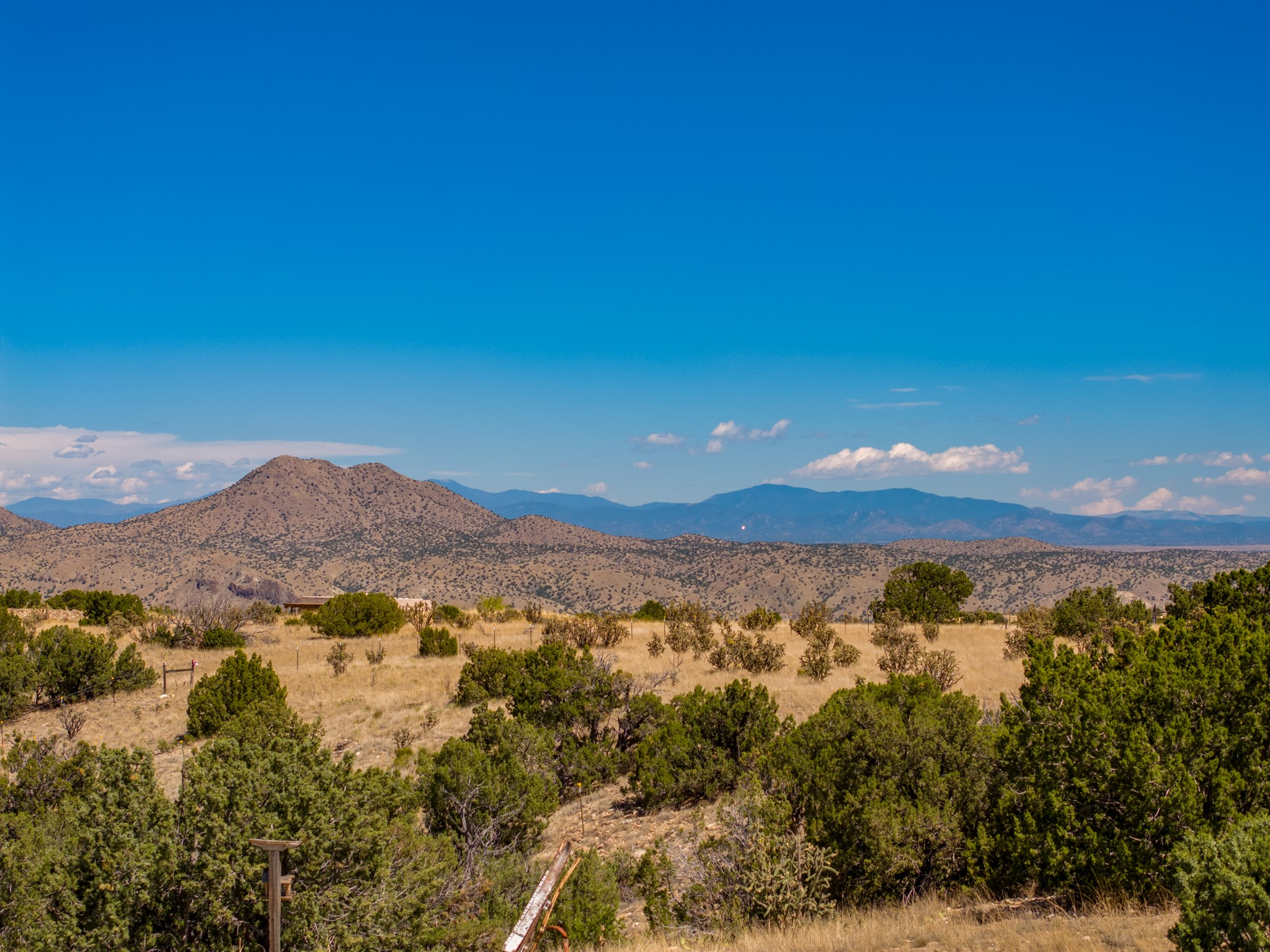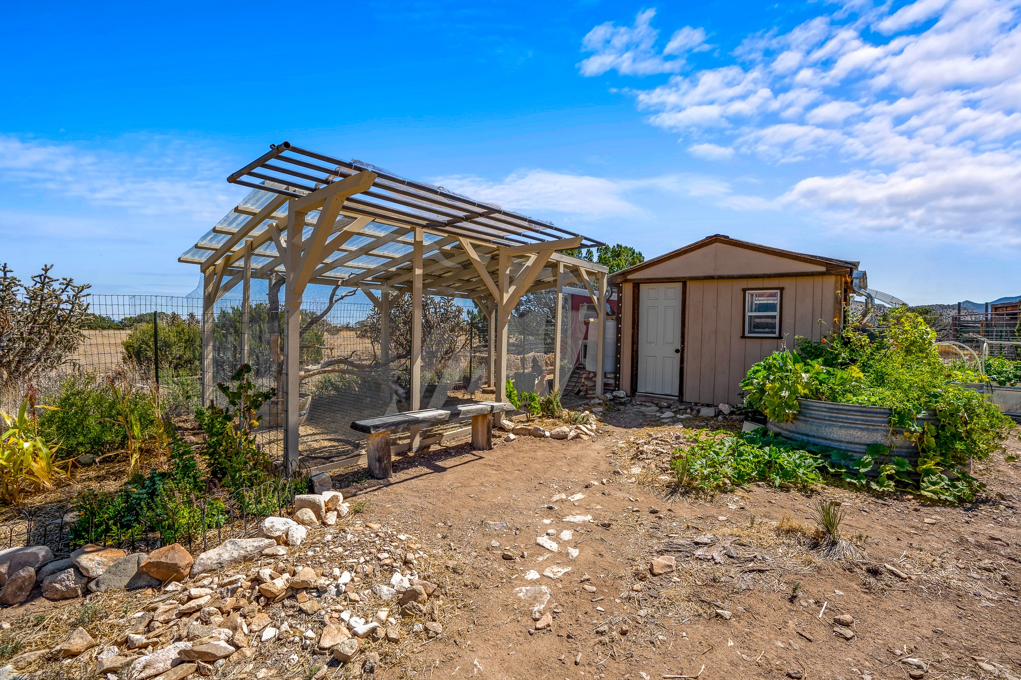 You'll find this high-desert homestead perched on a mesa's edge, with jaw-dropping views in every direction. A high-ceilinged, 1259 square foot home, with one bedroom and one bathroom, sits on 40 acres. This open floor plan home gives many configuration options- a roomy yet cozy space. Property has abundant, thriving gardens, a shed and chicken coop, as well as a corral and space for horses. Water is supplied by a private well, and electricity by the sun. Sellers have recently invested nearly $50,000 in the property, including new solar panels, charge controller, inverters, and batteries, 5600 gallons of water storage (in addition to 3100 gallons of rain catchment), new well pump, booster pump and whole house water filtration system. 3.5 miles from highway 14. Come experience the profound privacy, and quiet this property provides while only being a short hop to the thriving artist community of Madrid and a 45 min drive to Santa Fe. Excellent off the grid property with expansive vistas of the Cerrillos Hills and the Jemez, Sangre de Cristo, Ortiz, and Sandia Mountains.