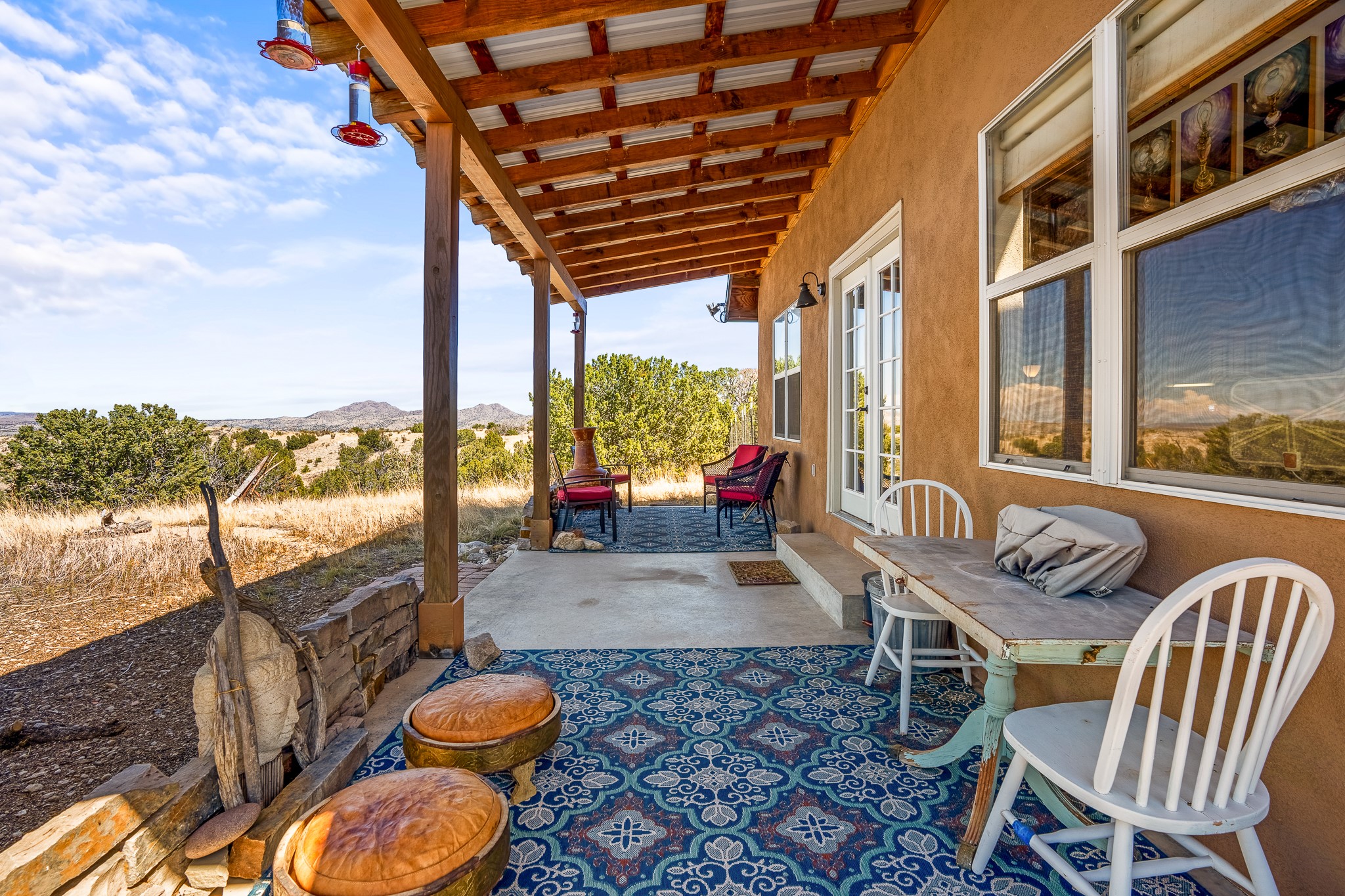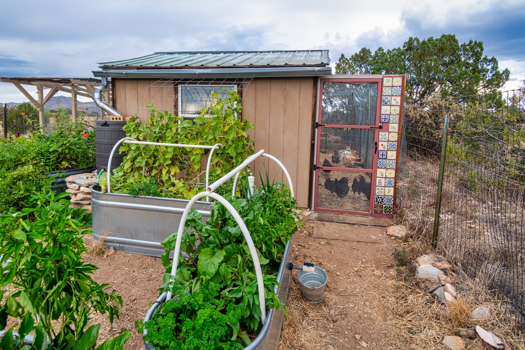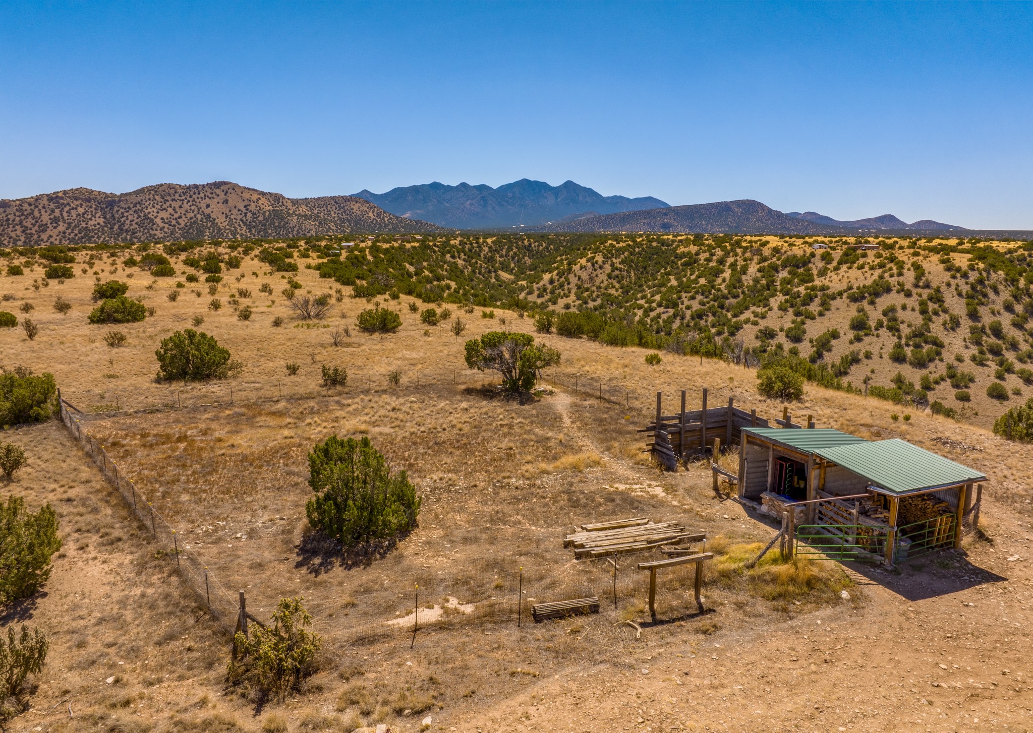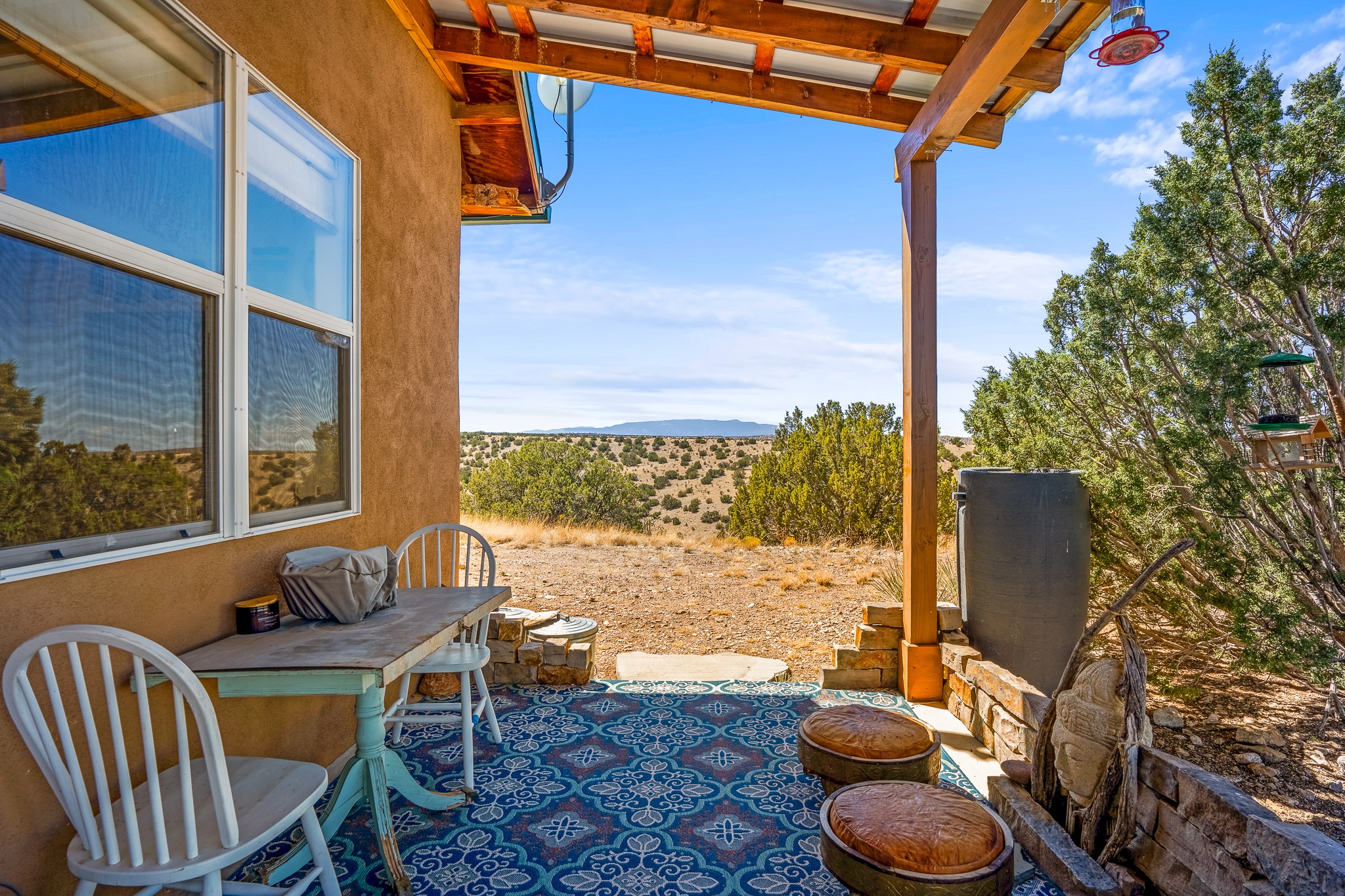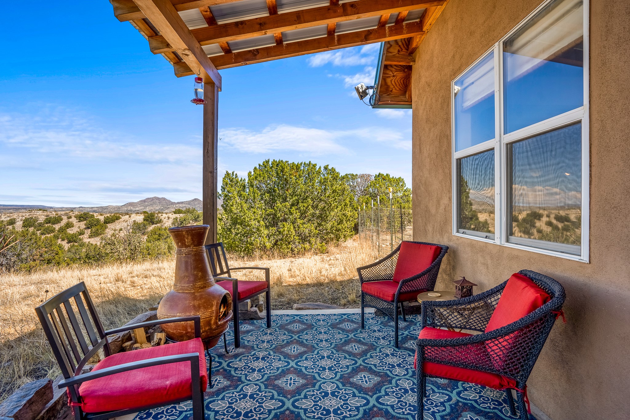 You'll find this high-desert homestead perched on a mesa's edge, with jaw-dropping views in every direction. A high-ceilinged, 1259 square foot home, with one bedroom and one bathroom, sits on 40 acres. This open floor plan home gives many configuration options- a roomy yet cozy space. Property has abundant, thriving gardens, a shed and chicken coop, as well as a corral and space for horses. Water is supplied by a private well, and electricity by the sun. Sellers have recently invested nearly $50,000 in the property, including new solar panels, charge controller, inverters, and batteries, 5600 gallons of water storage (in addition to 3100 gallons of rain catchment), new well pump, booster pump and whole house water filtration system. 3.5 miles from highway 14. Come experience the profound privacy, and quiet this property provides while only being a short hop to the thriving artist community of Madrid and a 45 min drive to Santa Fe. Excellent off the grid property with expansive vistas of the Cerrillos Hills and the Jemez, Sangre de Cristo, Ortiz, and Sandia Mountains.