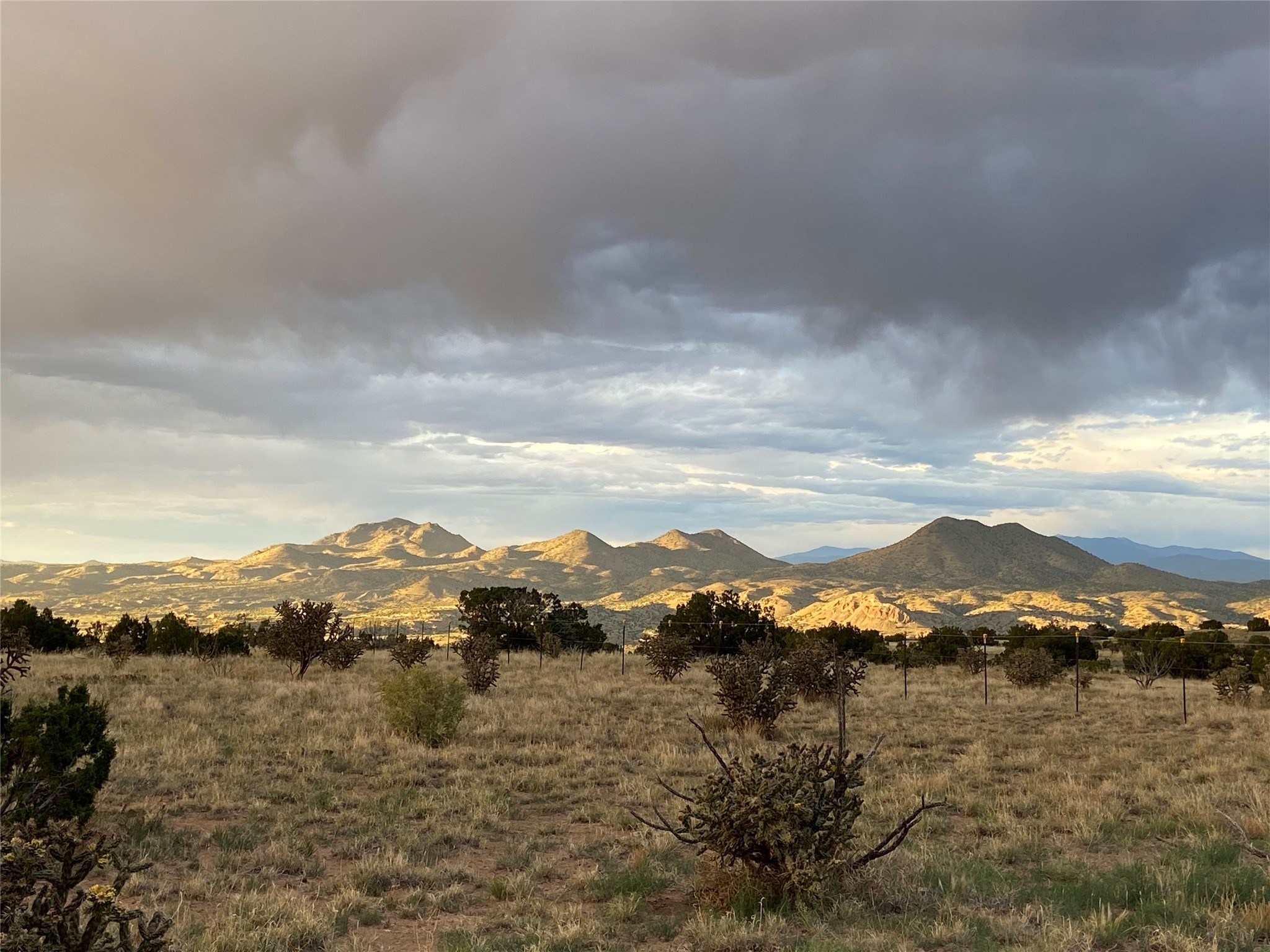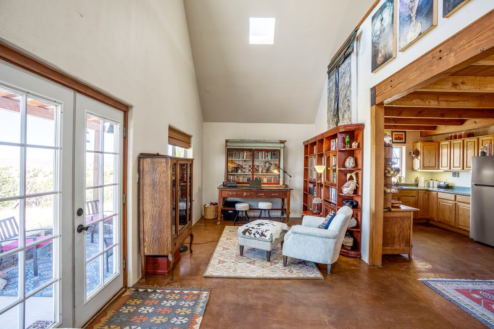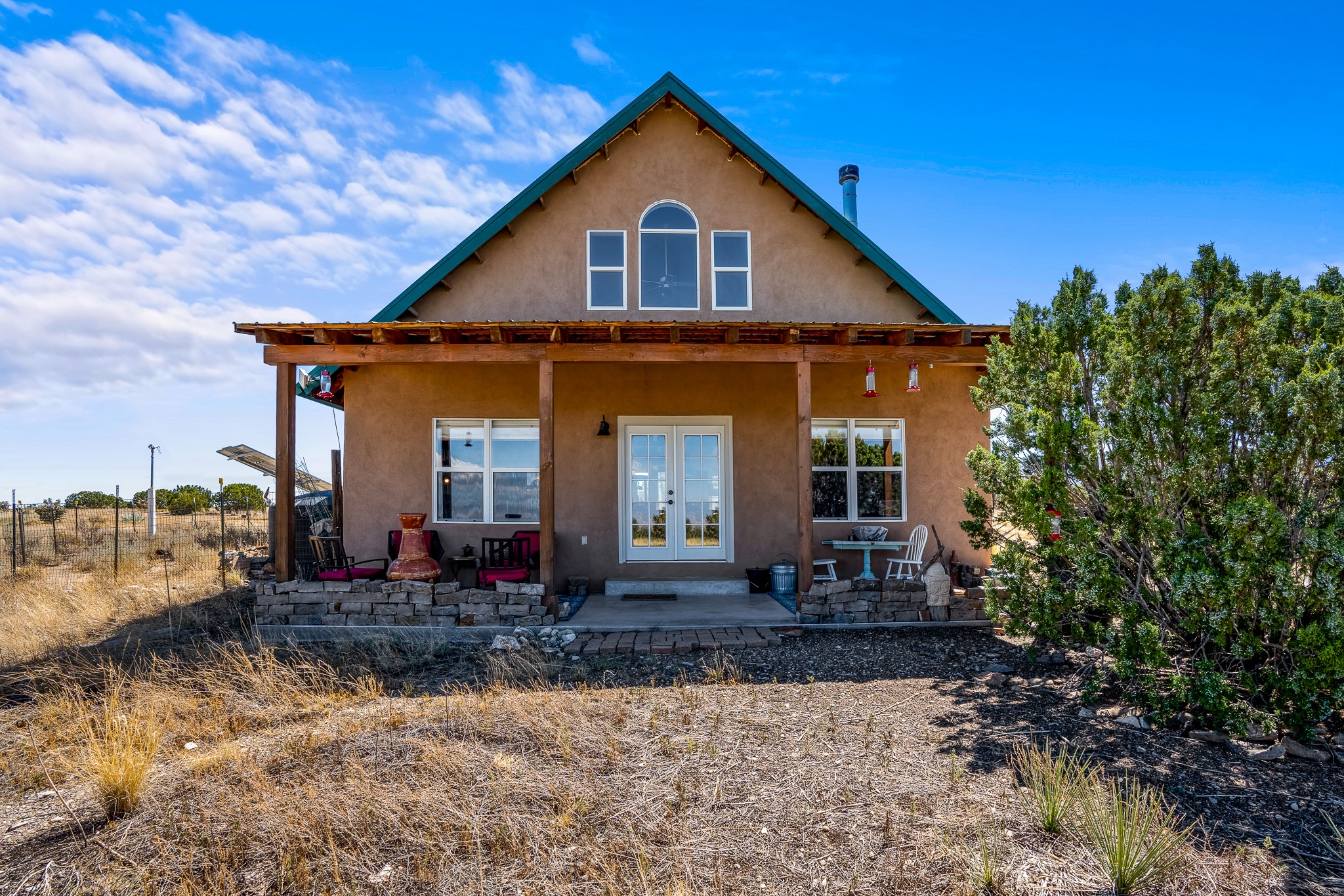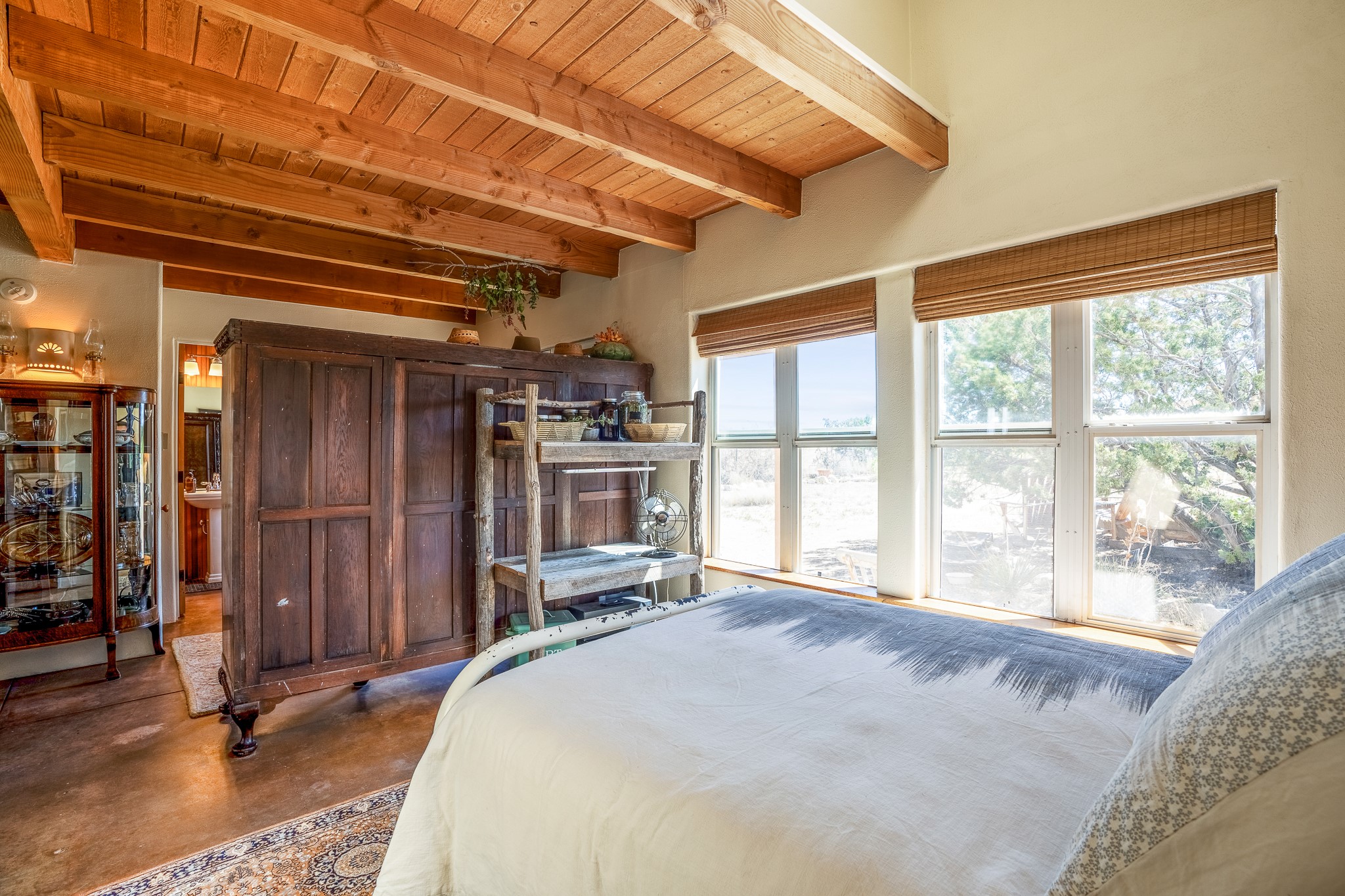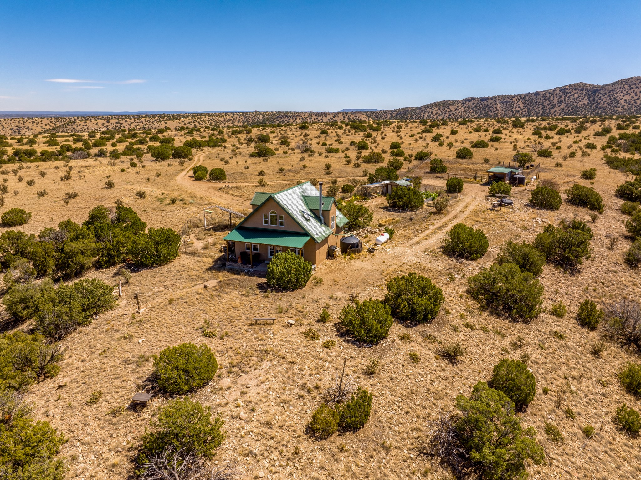 You'll find this high-desert homestead perched on a mesa's edge, with jaw-dropping views in every direction. A high-ceilinged, 1259 square foot home, with one bedroom and one bathroom, sits on 40 acres. This open floor plan home gives many configuration options- a roomy yet cozy space. Property has abundant, thriving gardens, a shed and chicken coop, as well as a corral and space for horses. Water is supplied by a private well, and electricity by the sun. Sellers have recently invested nearly $50,000 in the property, including new solar panels, charge controller, inverters, and batteries, 5600 gallons of water storage (in addition to 3100 gallons of rain catchment), new well pump, booster pump and whole house water filtration system. 3.5 miles from highway 14. Come experience the profound privacy, and quiet this property provides while only being a short hop to the thriving artist community of Madrid and a 45 min drive to Santa Fe. Excellent off the grid property with expansive vistas of the Cerrillos Hills and the Jemez, Sangre de Cristo, Ortiz, and Sandia Mountains.