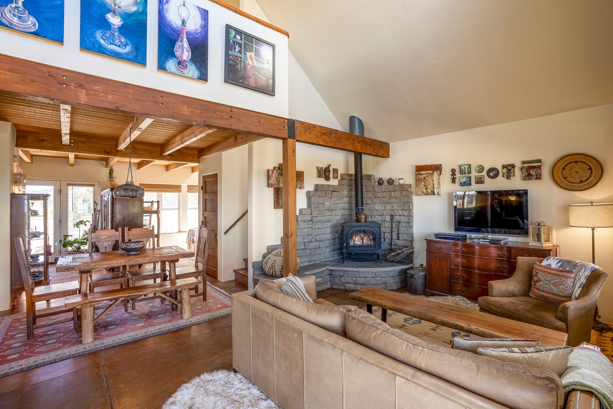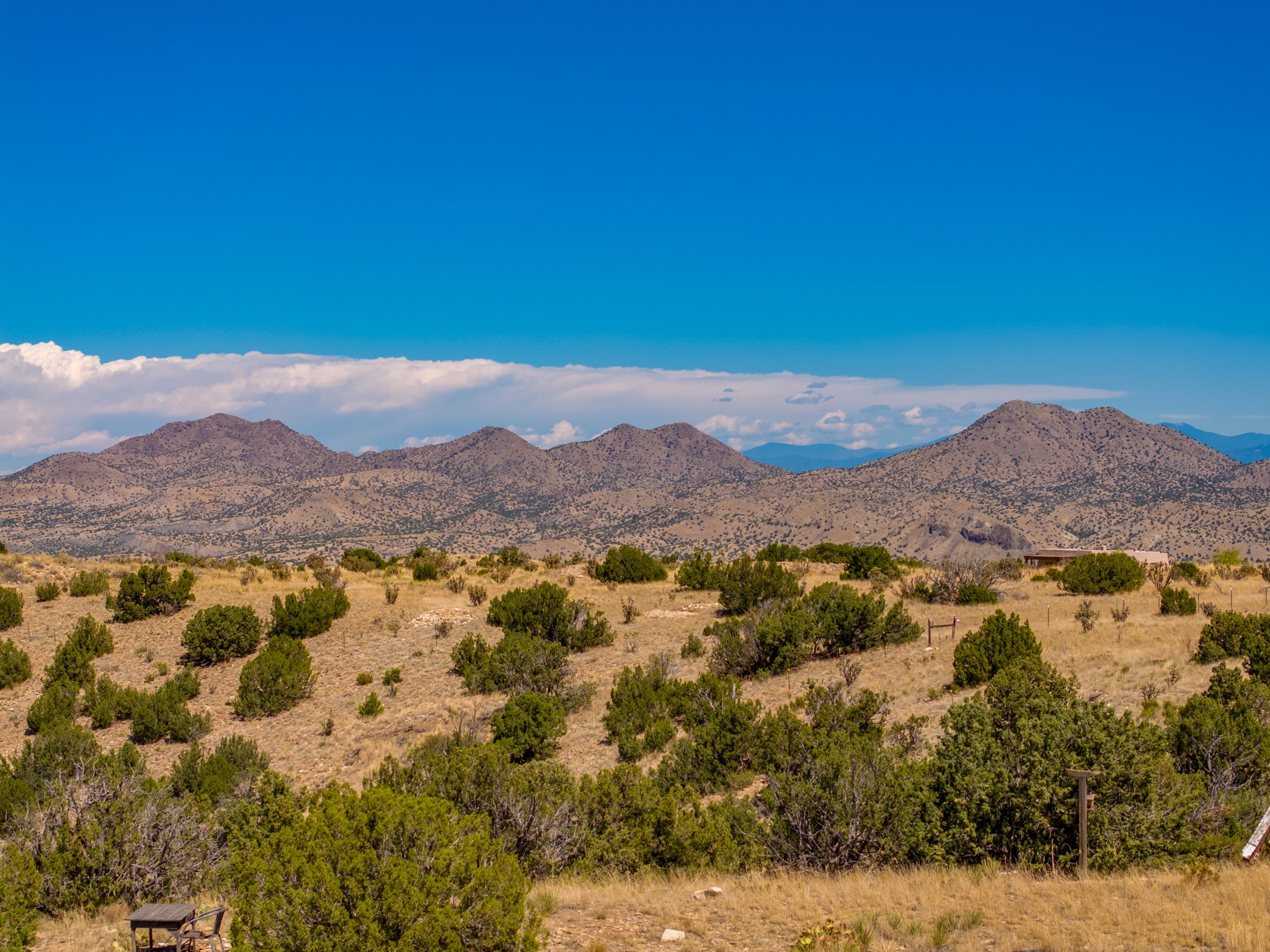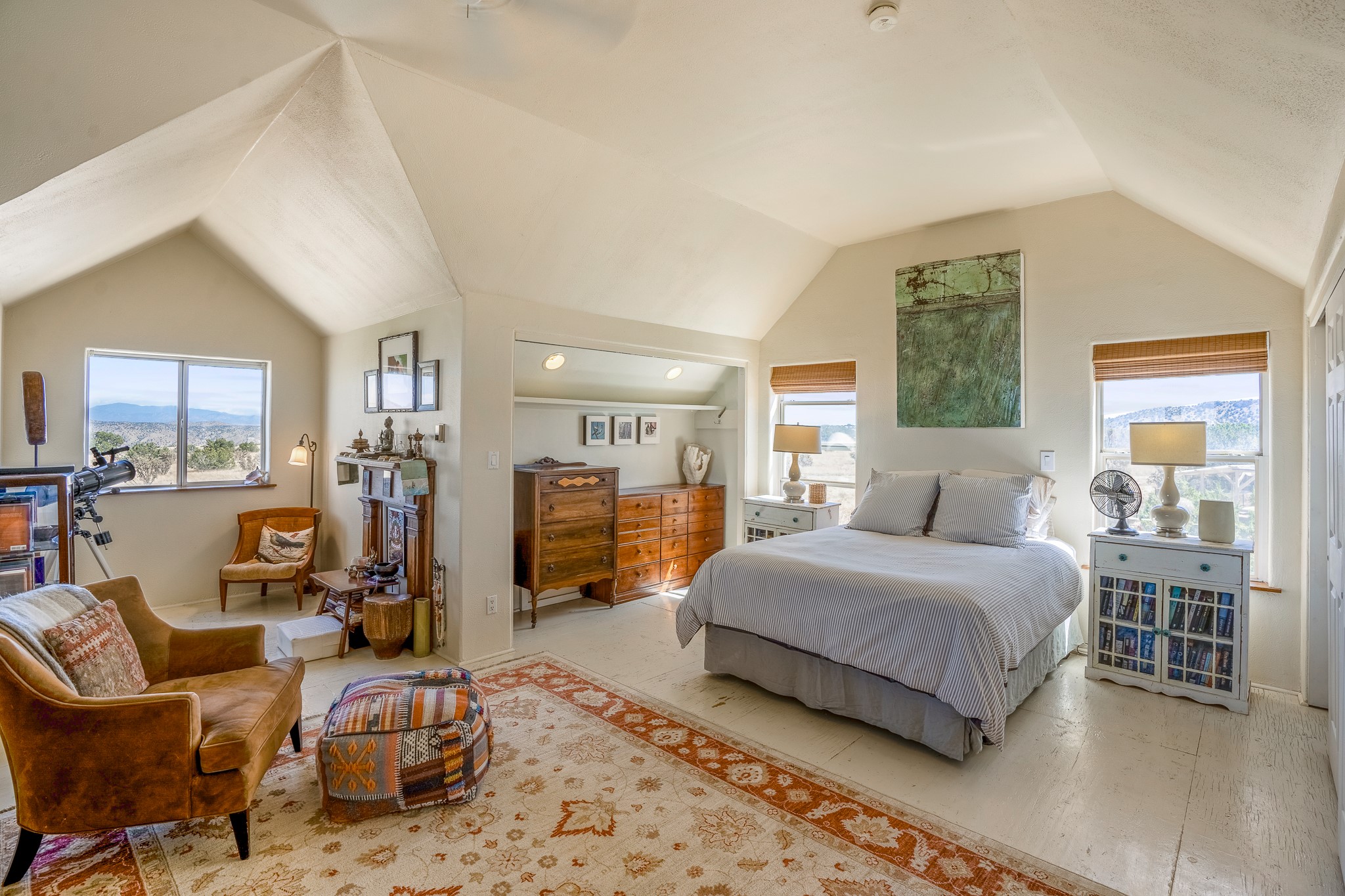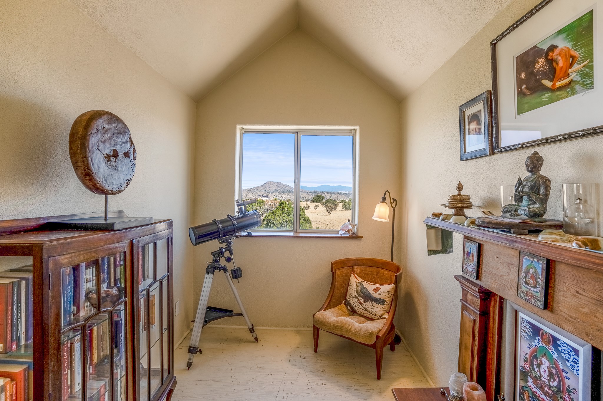You'll find this high-desert homestead perched on a mesa's edge, with jaw-dropping views in every direction. A high-ceilinged, 1259 square foot home, with one bedroom and one bathroom, sits on 40 acres. This open floor plan home gives many configuration options- a roomy yet cozy space. Property has abundant, thriving gardens, a shed and chicken coop, as well as a corral and space for horses. Water is supplied by a private well, and electricity by the sun. Sellers have recently invested nearly $50,000 in the property, including new solar panels, charge controller, inverters, and batteries, 5600 gallons of water storage (in addition to 3100 gallons of rain catchment), new well pump, booster pump and whole house water filtration system. 3.5 miles from highway 14. Come experience the profound privacy, and quiet this property provides while only being a short hop to the thriving artist community of Madrid and a 45 min drive to Santa Fe. Excellent off the grid property with expansive vistas of the Cerrillos Hills and the Jemez, Sangre de Cristo, Ortiz, and Sandia Mountains.