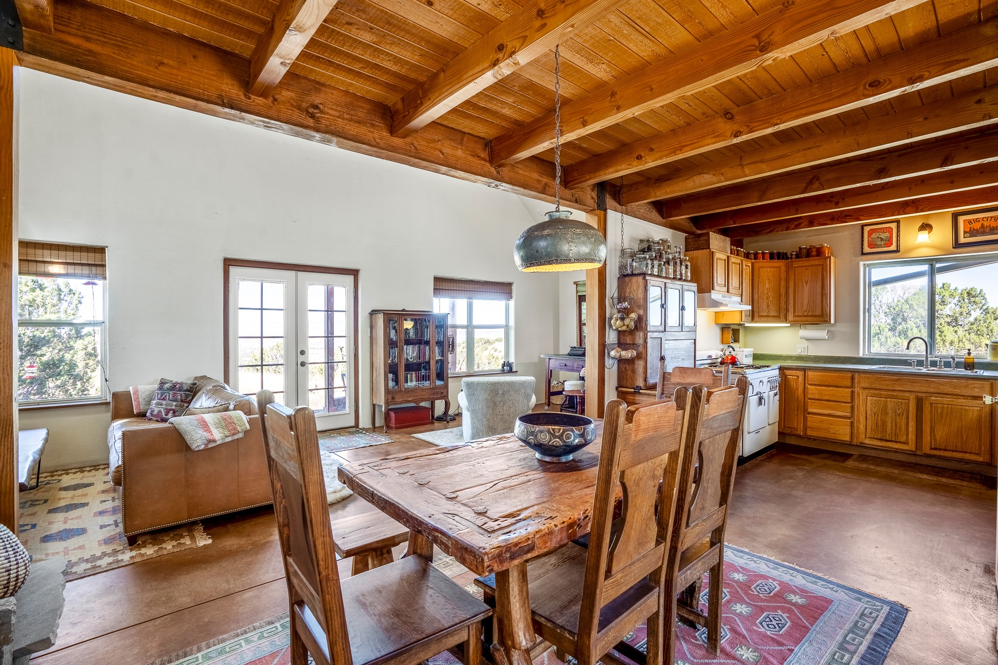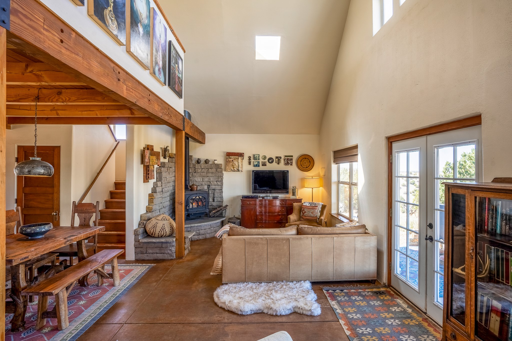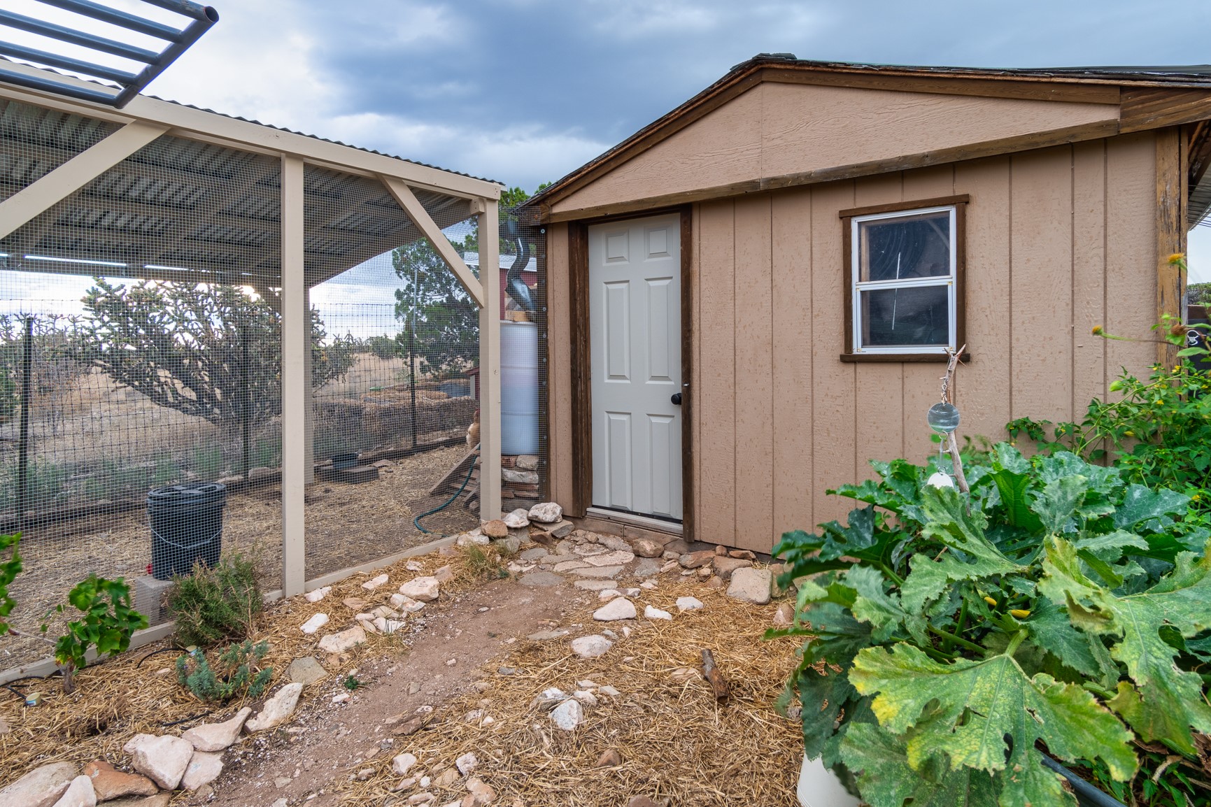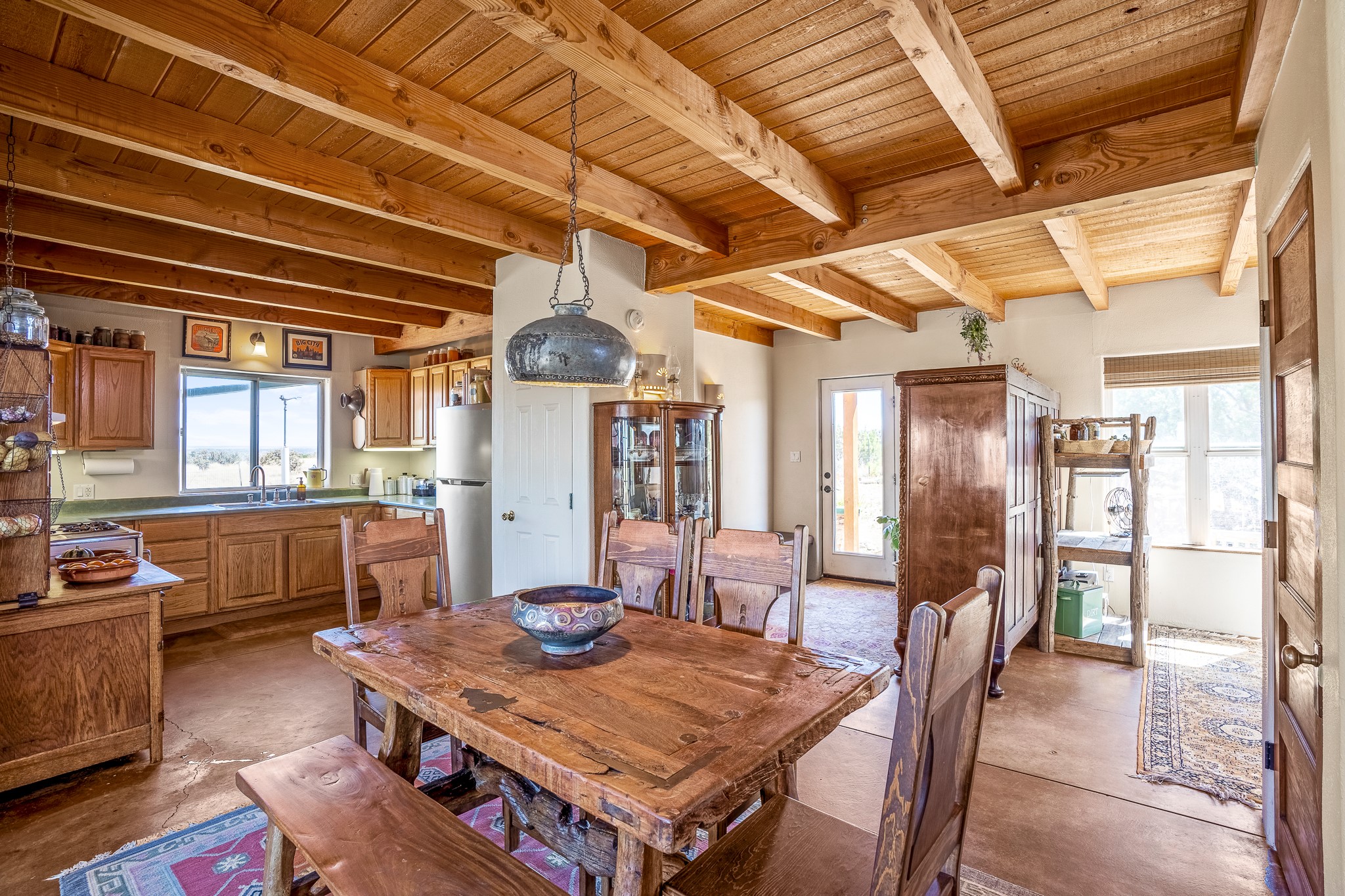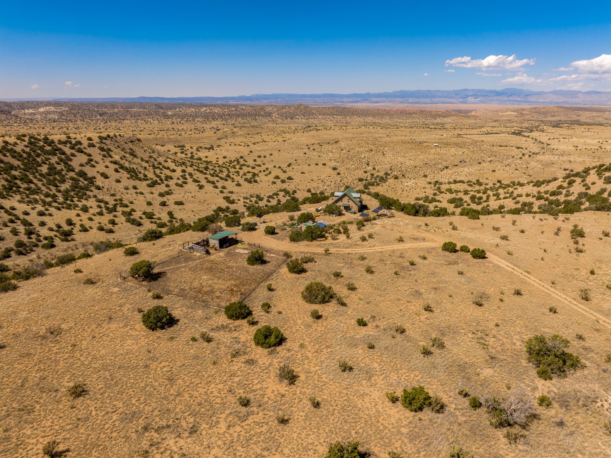 You'll find this high-desert homestead perched on a mesa's edge, with jaw-dropping views in every direction. A high-ceilinged, 1259 square foot home, with one bedroom and one bathroom, sits on 40 acres. This open floor plan home gives many configuration options- a roomy yet cozy space. Property has abundant, thriving gardens, a shed and chicken coop, as well as a corral and space for horses. Water is supplied by a private well, and electricity by the sun. Sellers have recently invested nearly $50,000 in the property, including new solar panels, charge controller, inverters, and batteries, 5600 gallons of water storage (in addition to 3100 gallons of rain catchment), new well pump, booster pump and whole house water filtration system. 3.5 miles from highway 14. Come experience the profound privacy, and quiet this property provides while only being a short hop to the thriving artist community of Madrid and a 45 min drive to Santa Fe. Excellent off the grid property with expansive vistas of the Cerrillos Hills and the Jemez, Sangre de Cristo, Ortiz, and Sandia Mountains.