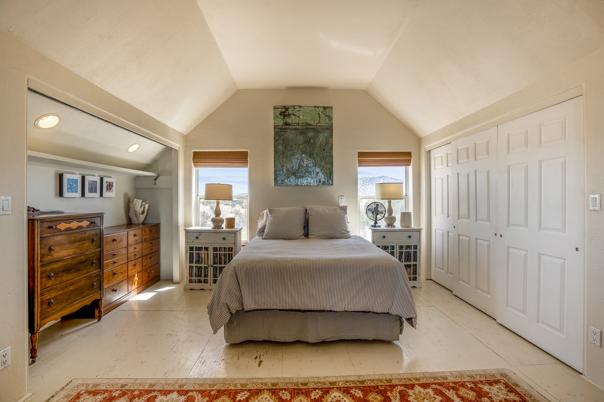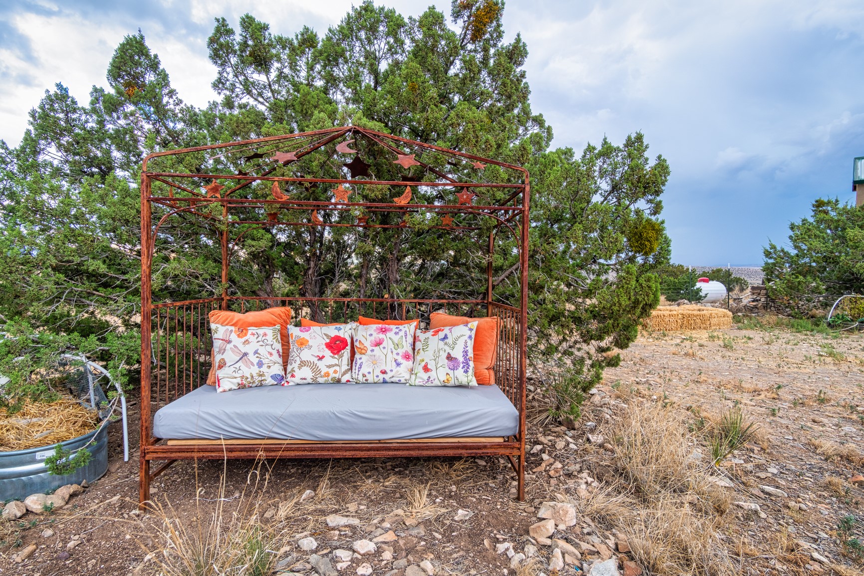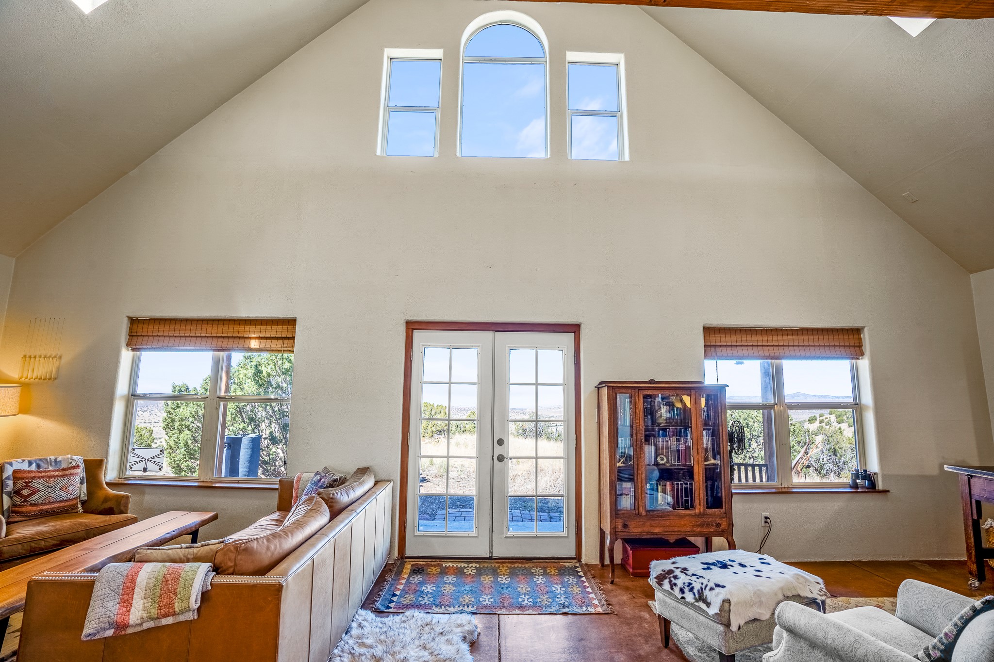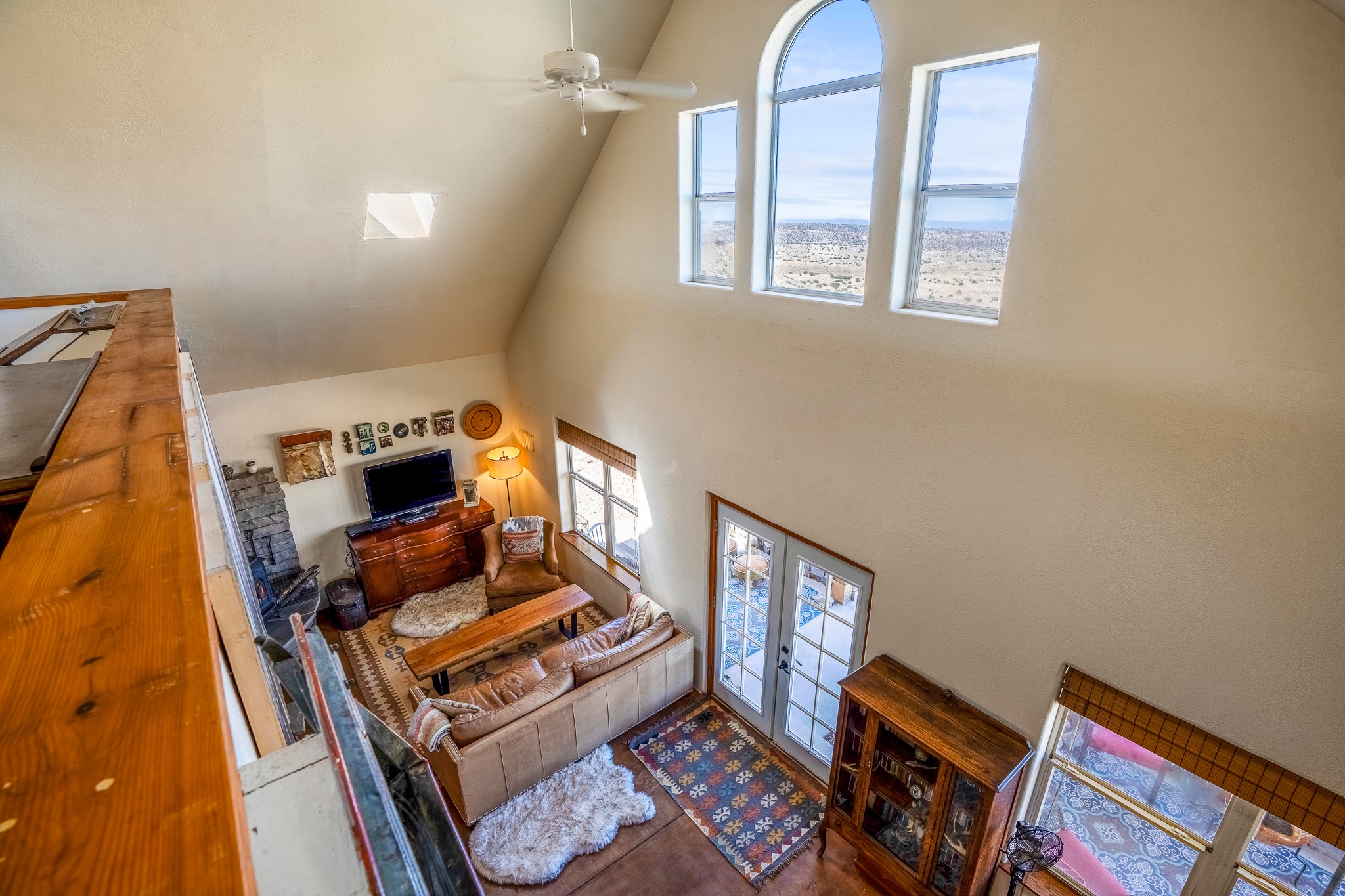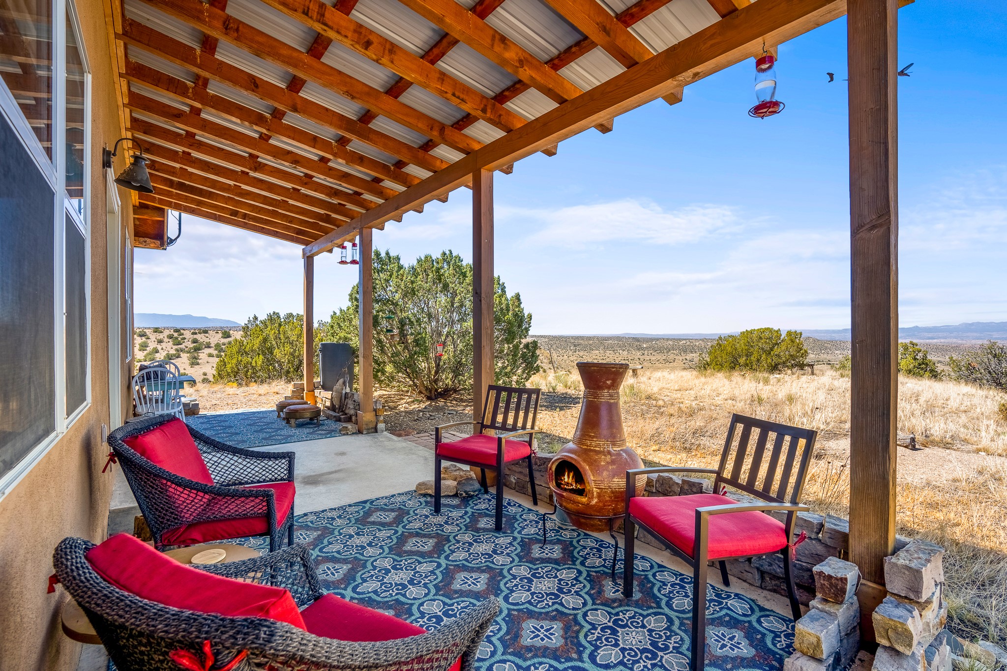 You'll find this high-desert homestead perched on a mesa's edge, with jaw-dropping views in every direction. A high-ceilinged, 1259 square foot home, with one bedroom and one bathroom, sits on 40 acres. This open floor plan home gives many configuration options- a roomy yet cozy space. Property has abundant, thriving gardens, a shed and chicken coop, as well as a corral and space for horses. Water is supplied by a private well, and electricity by the sun. Sellers have recently invested nearly $50,000 in the property, including new solar panels, charge controller, inverters, and batteries, 5600 gallons of water storage (in addition to 3100 gallons of rain catchment), new well pump, booster pump and whole house water filtration system. 3.5 miles from highway 14. Come experience the profound privacy, and quiet this property provides while only being a short hop to the thriving artist community of Madrid and a 45 min drive to Santa Fe. Excellent off the grid property with expansive vistas of the Cerrillos Hills and the Jemez, Sangre de Cristo, Ortiz, and Sandia Mountains.
